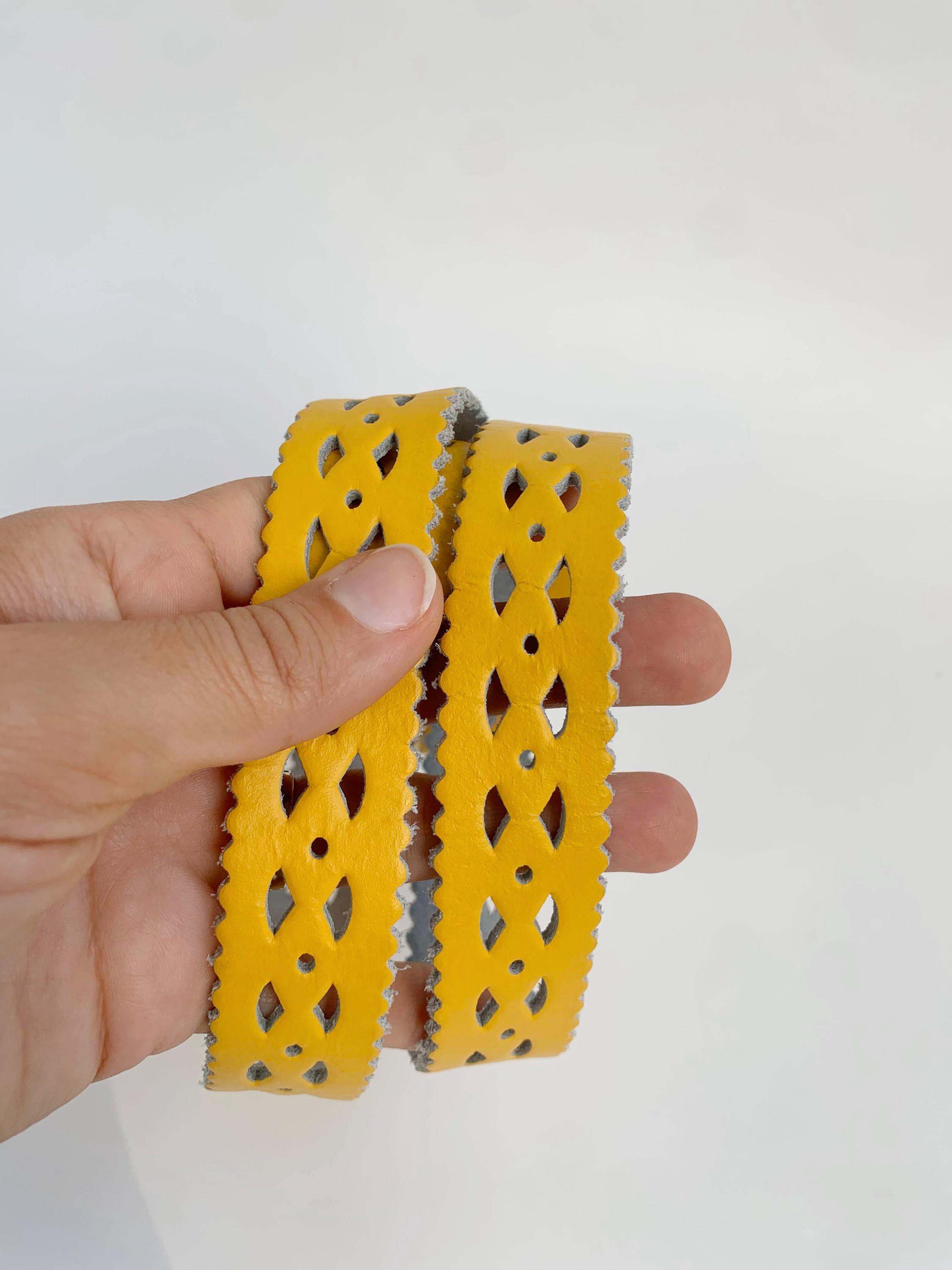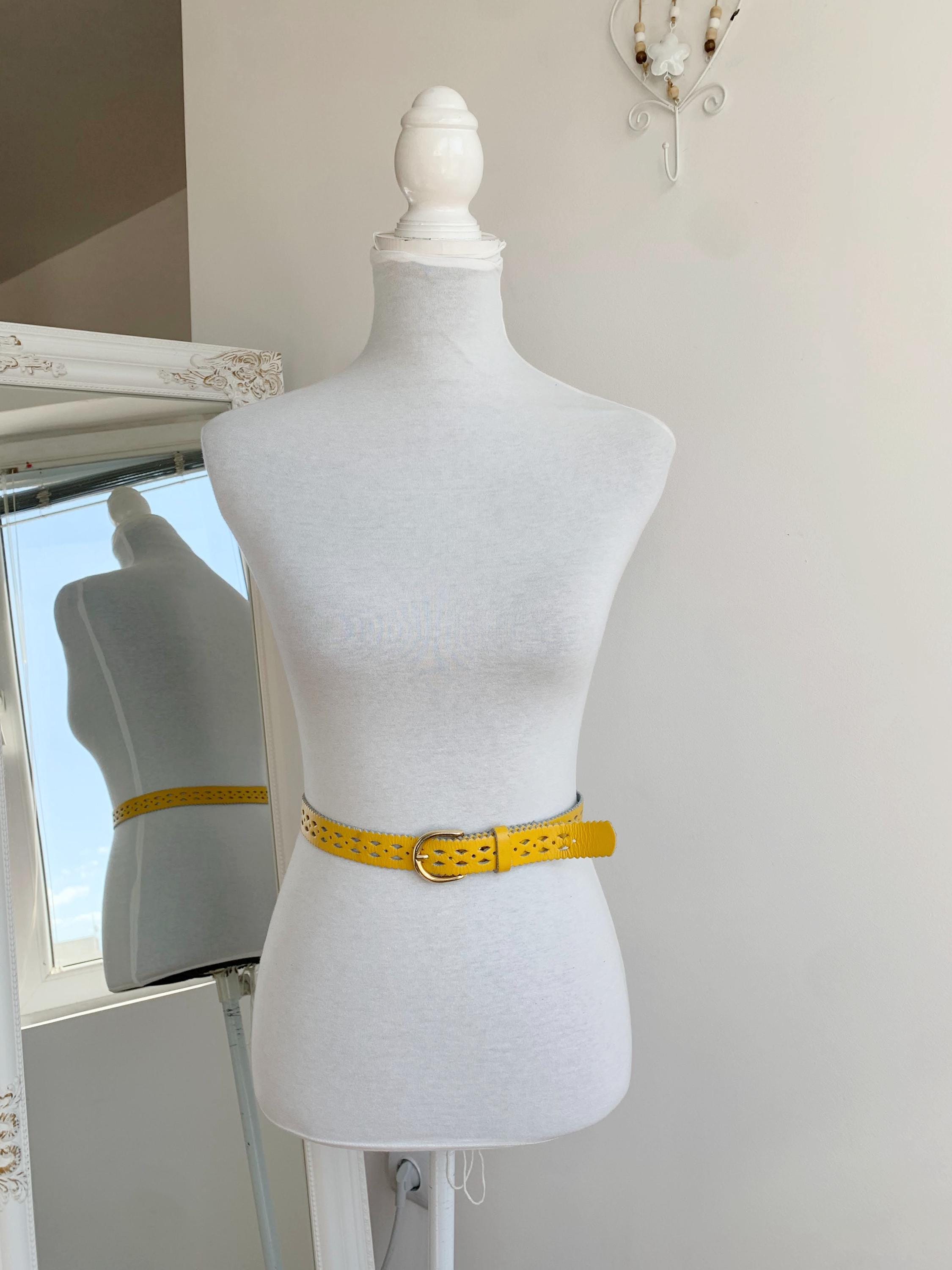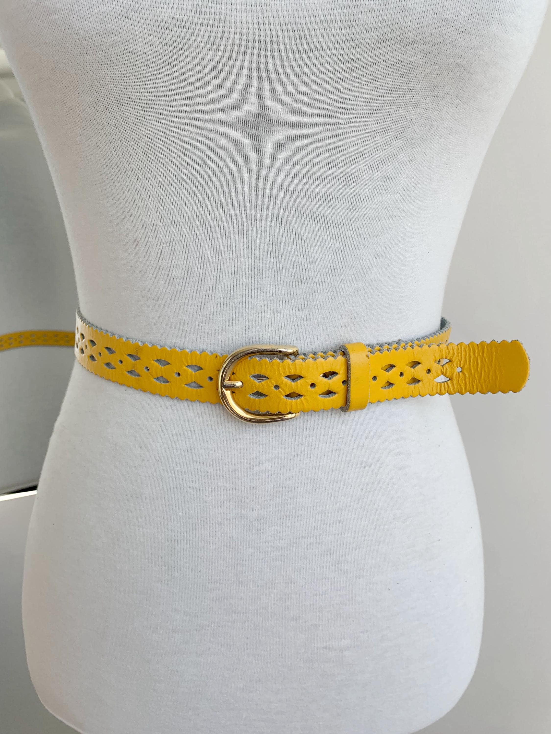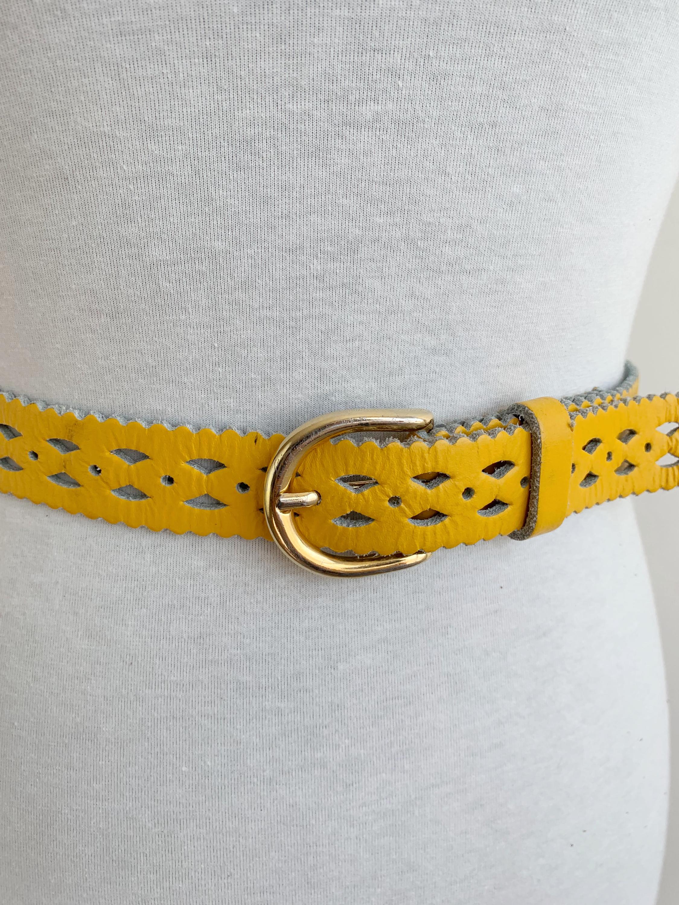 Add a pop of vibrant color and unique style to your outfit with this stunning vintage 80s yellow leather belt for women in size 65 cm / 25.5" . Crafted from genuine leather, this eye-catching accessory features intricate cut out designs and playful scalloped edges, giving it a distinct bohemian flair. The eye catching yellow shade is perfect for adding a sunny, cheerful touch to dresses, skirts, or high-waisted jeans. The gold-tone buckle is a classic touch, and the craftsmanship of this piece truly shows its quality and durability. Whether you’re looking to cinch a flowy dress or complete a retro-inspired look, this yellow leather belt is a chic and sustainable choice.
