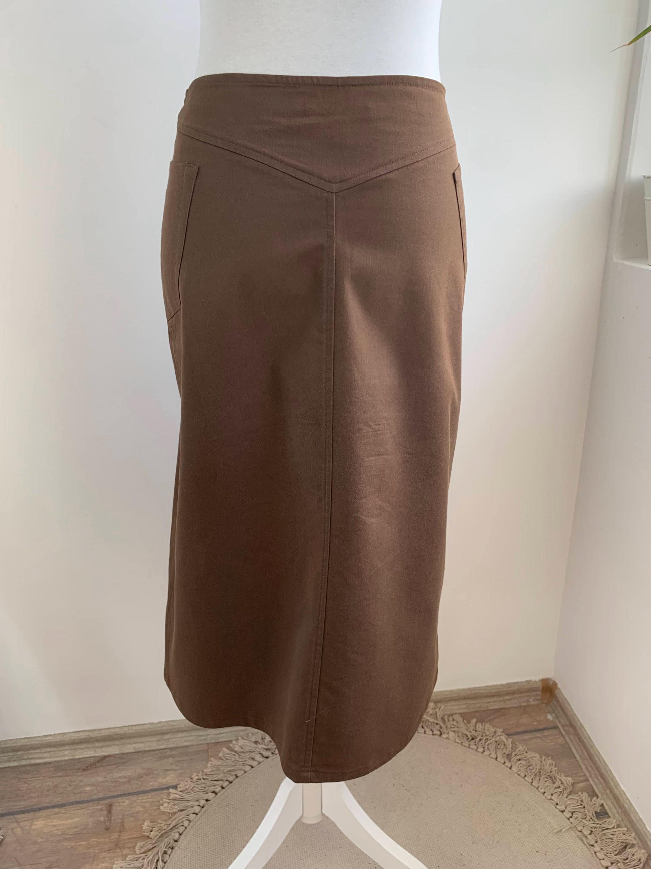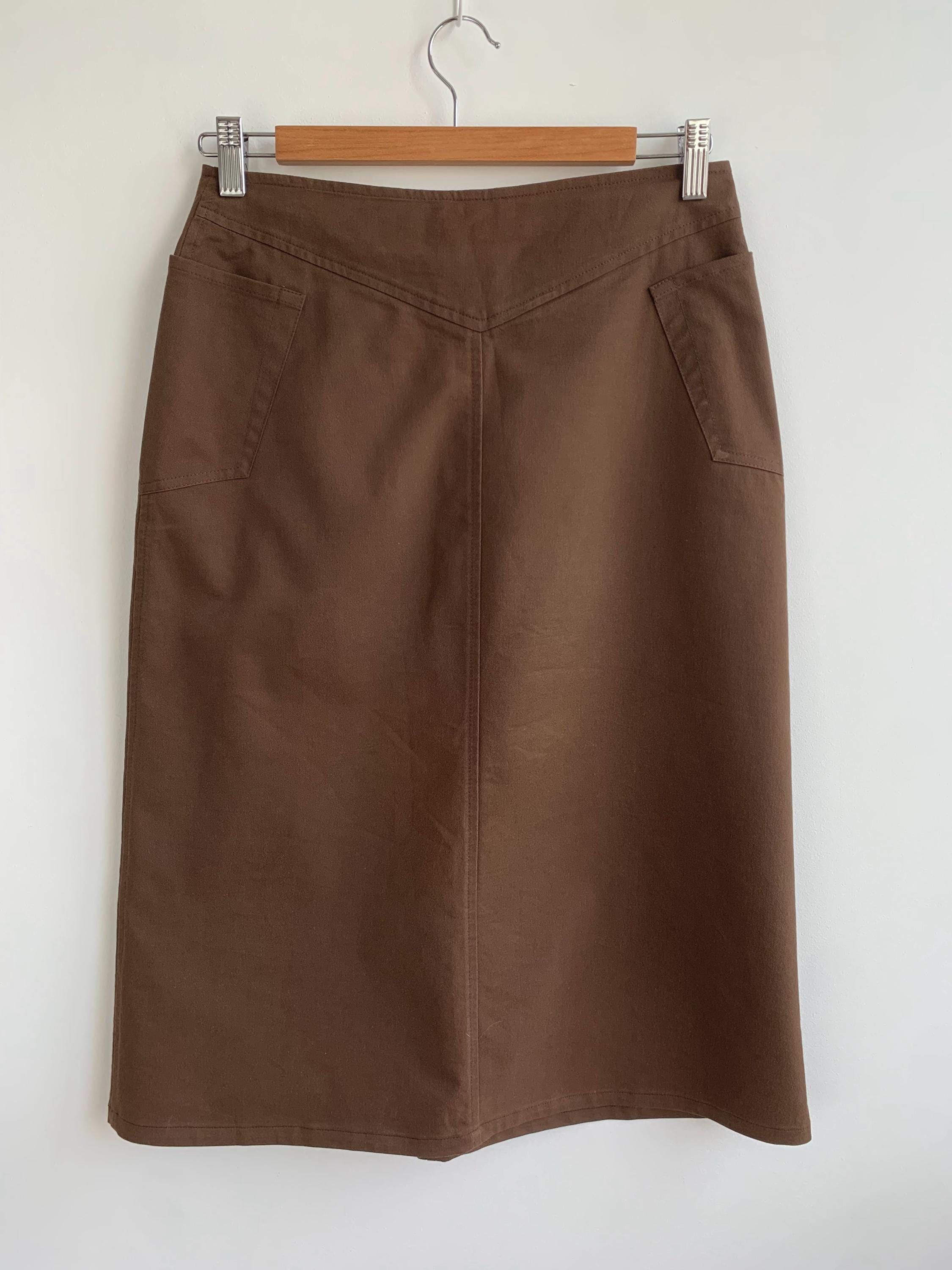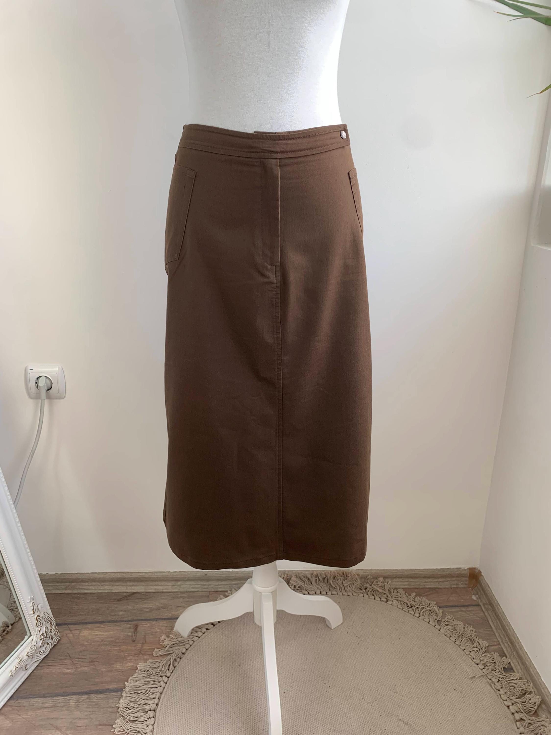 A beautiful and versatile vintage Italian brown midi skirt from the 90s in size small, perfect for creating a chic and minimalist look. This high-waisted skirt, crafted in Italy by Cristina Rej, features a subtle A-line silhouette that flatters any figure with front zip closure and a snap button. The classic design and neutral brown color make it a timeless addition to your wardrobe, easily paired with a variety of tops for an elegant office outfit or a sophisticated casual look. The material has a slight stretch for comfort and a perfect fit.