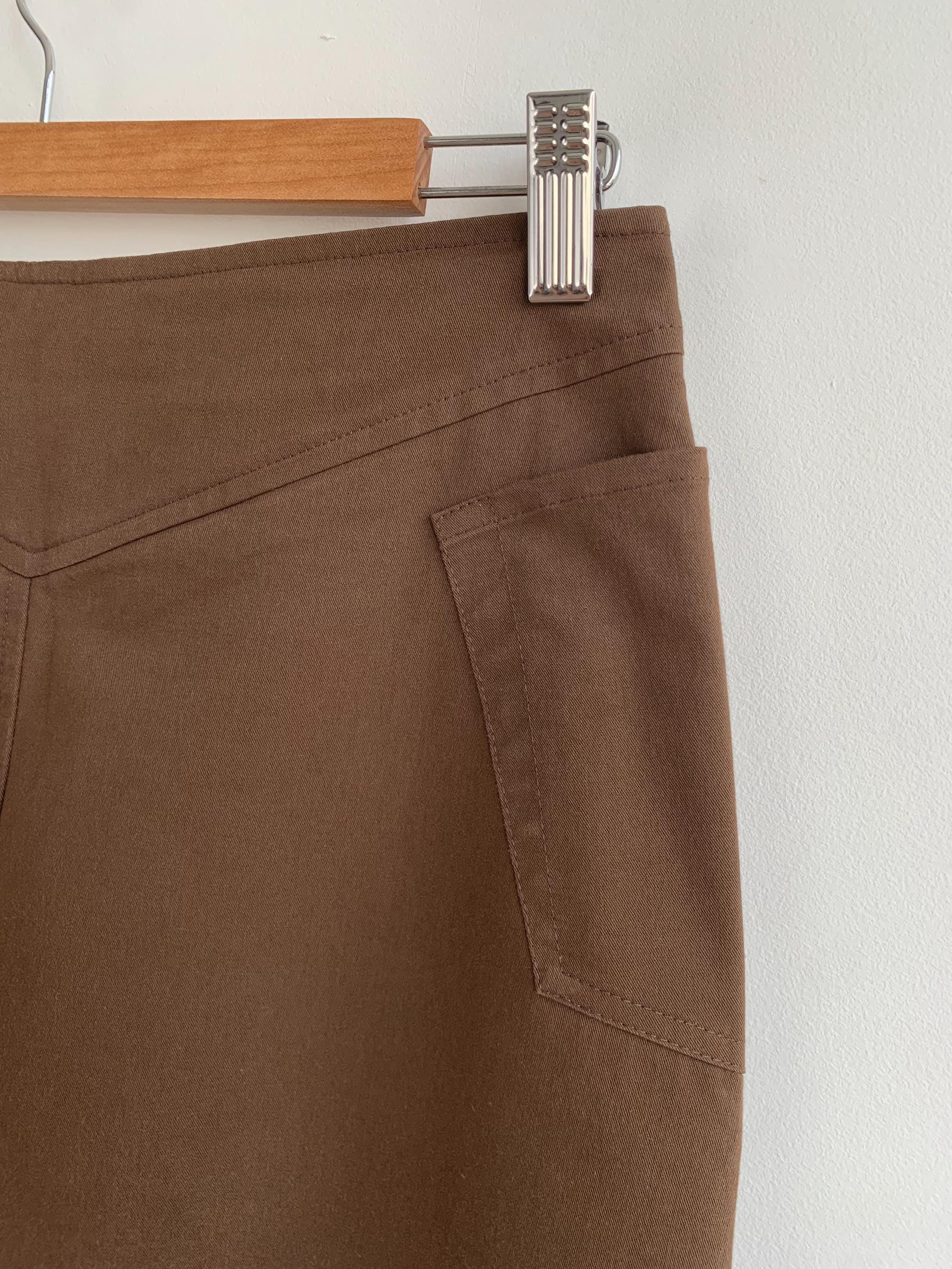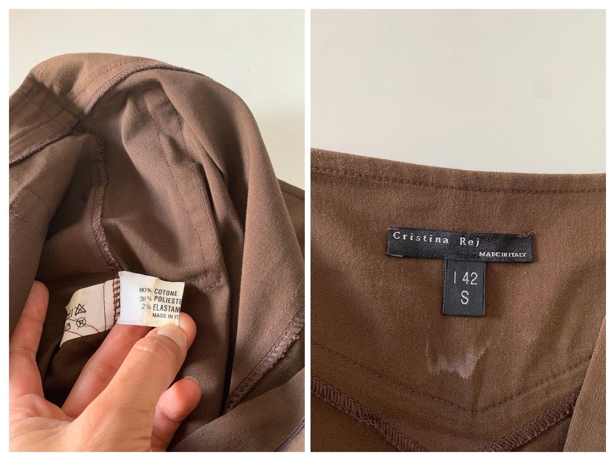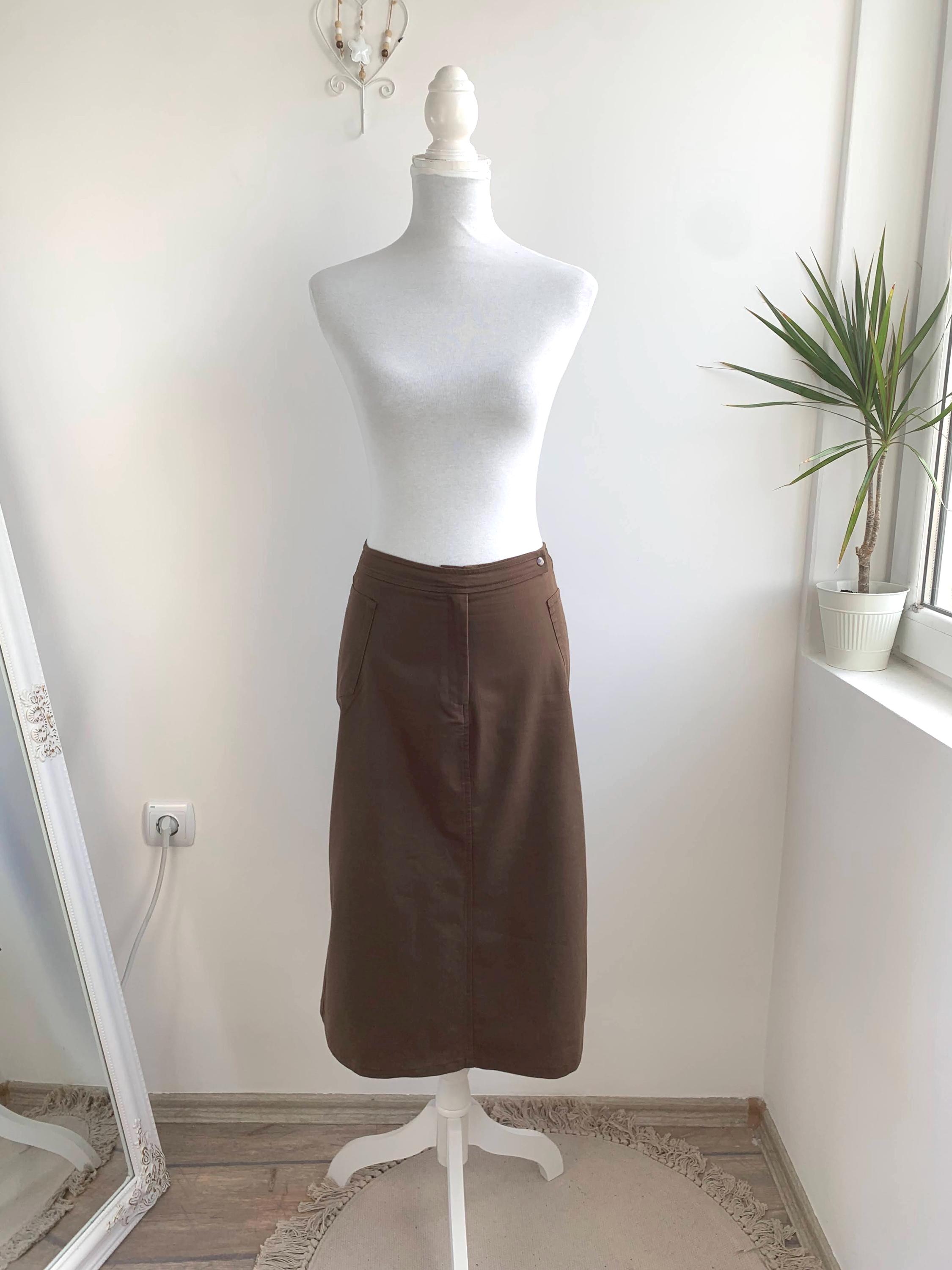 A beautiful and versatile vintage Italian brown midi skirt from the 90s in size small, perfect for creating a chic and minimalist look. This high-waisted skirt, crafted in Italy by Cristina Rej, features a subtle A-line silhouette that flatters any figure with front zip closure and a snap button. The classic design and neutral brown color make it a timeless addition to your wardrobe, easily paired with a variety of tops for an elegant office outfit or a sophisticated casual look. The material has a slight stretch for comfort and a perfect fit.