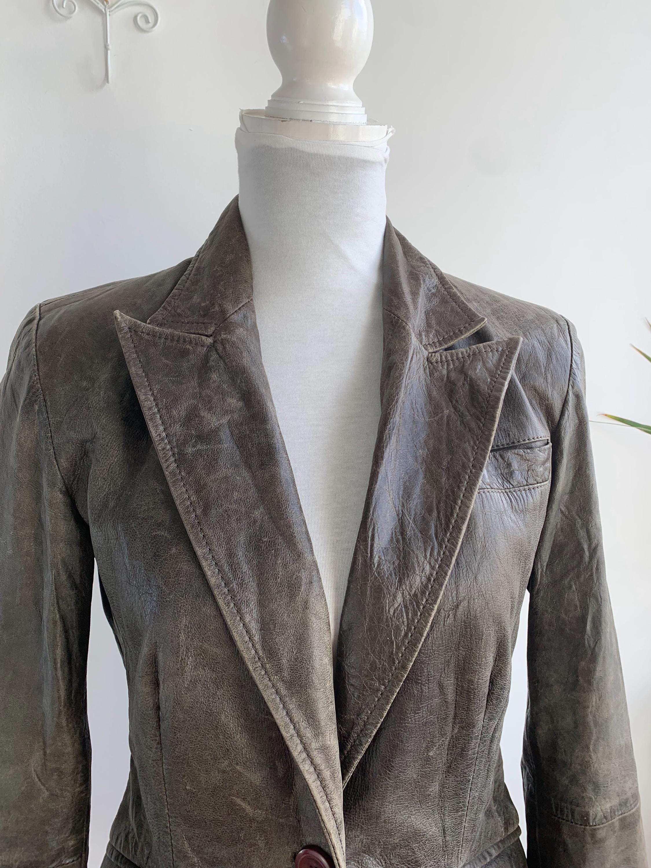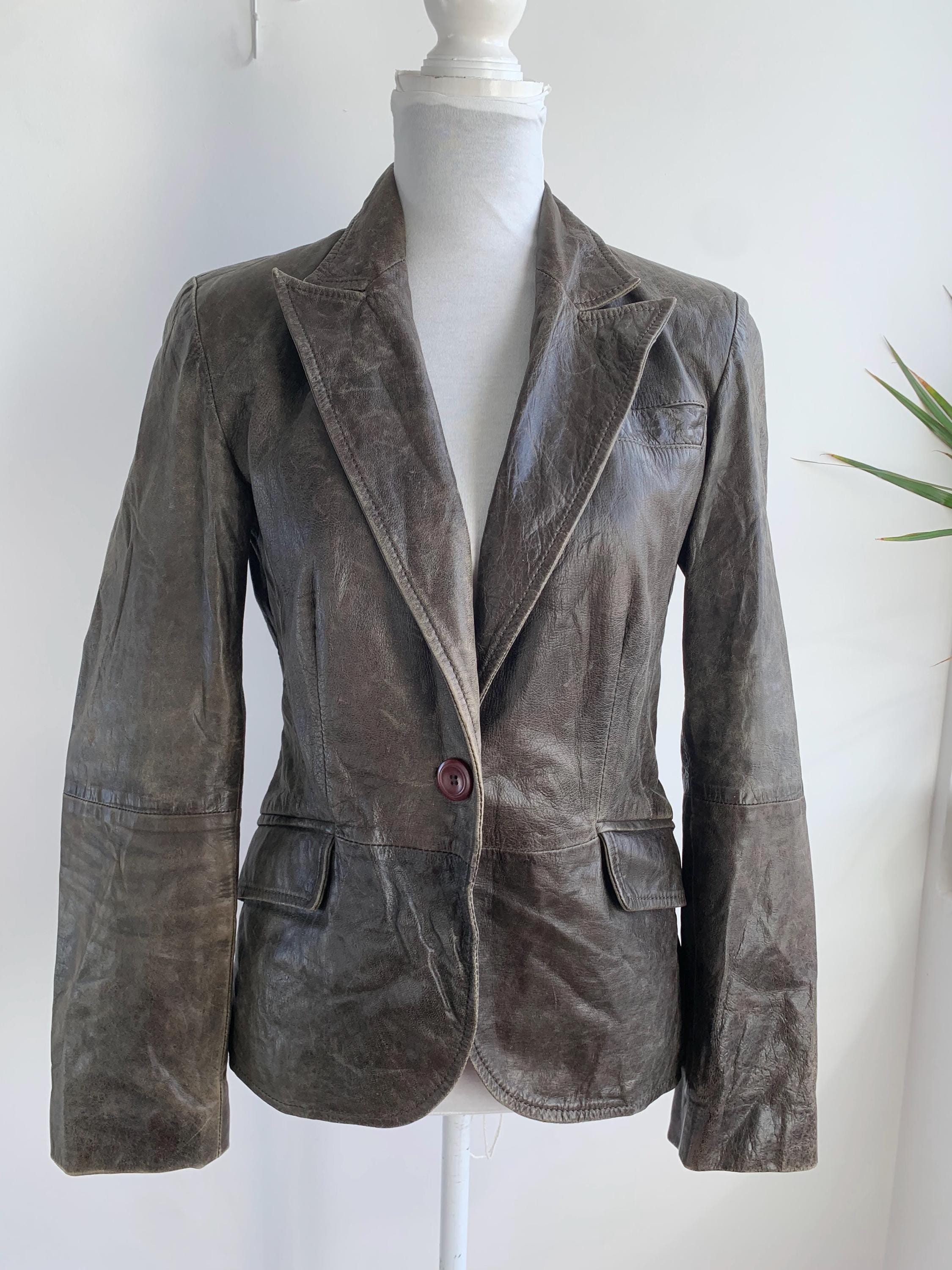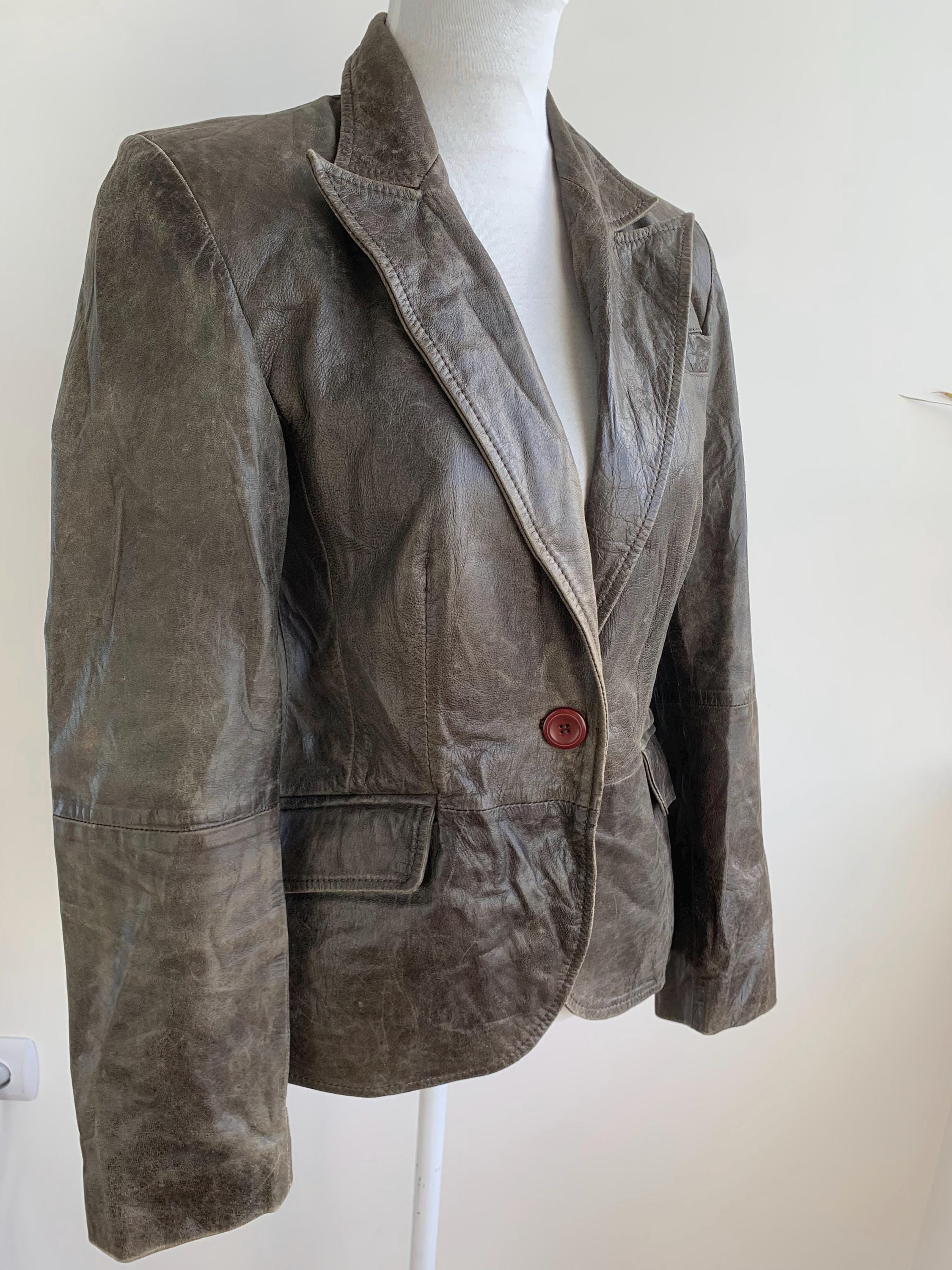 This is a vintage 90s taupe grey brown leather blazer for women by the brand B.Young in size S/M (M is marked on the tag). This grey brown leather blazer has single button closure and fitted silhouette. It is made of heavily distressed genuine leather which has a aged look with decent amount of makrs, scratches and creasing due to the wear. This grunge leather jacket has two flap over front pockets and polyester lining. This real leather blazer is the perfect outerwear for any season - fall, spring, summer and even in the winter if you like in warmer climate. The size marked on this leather jacket for women is M, it fits like size S/M medium. Please check the measurements below.