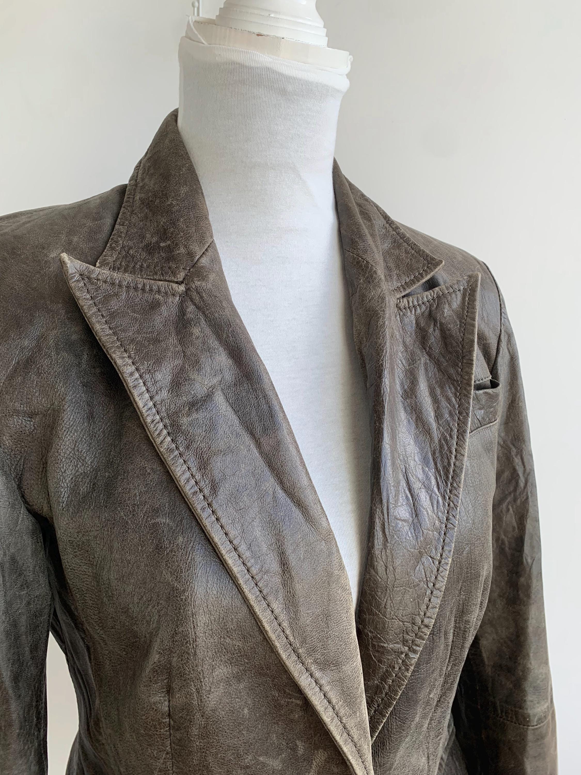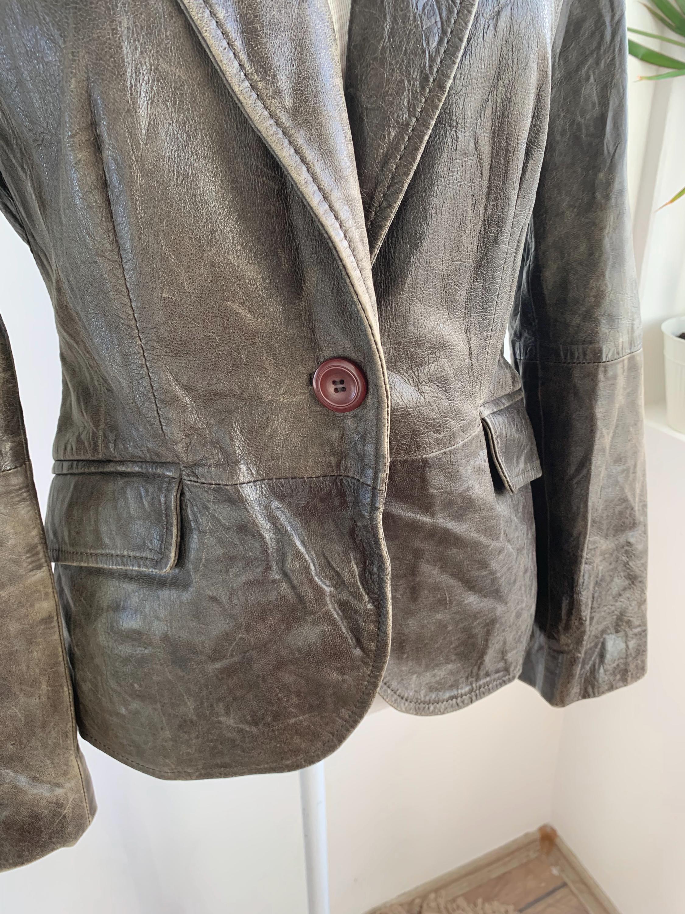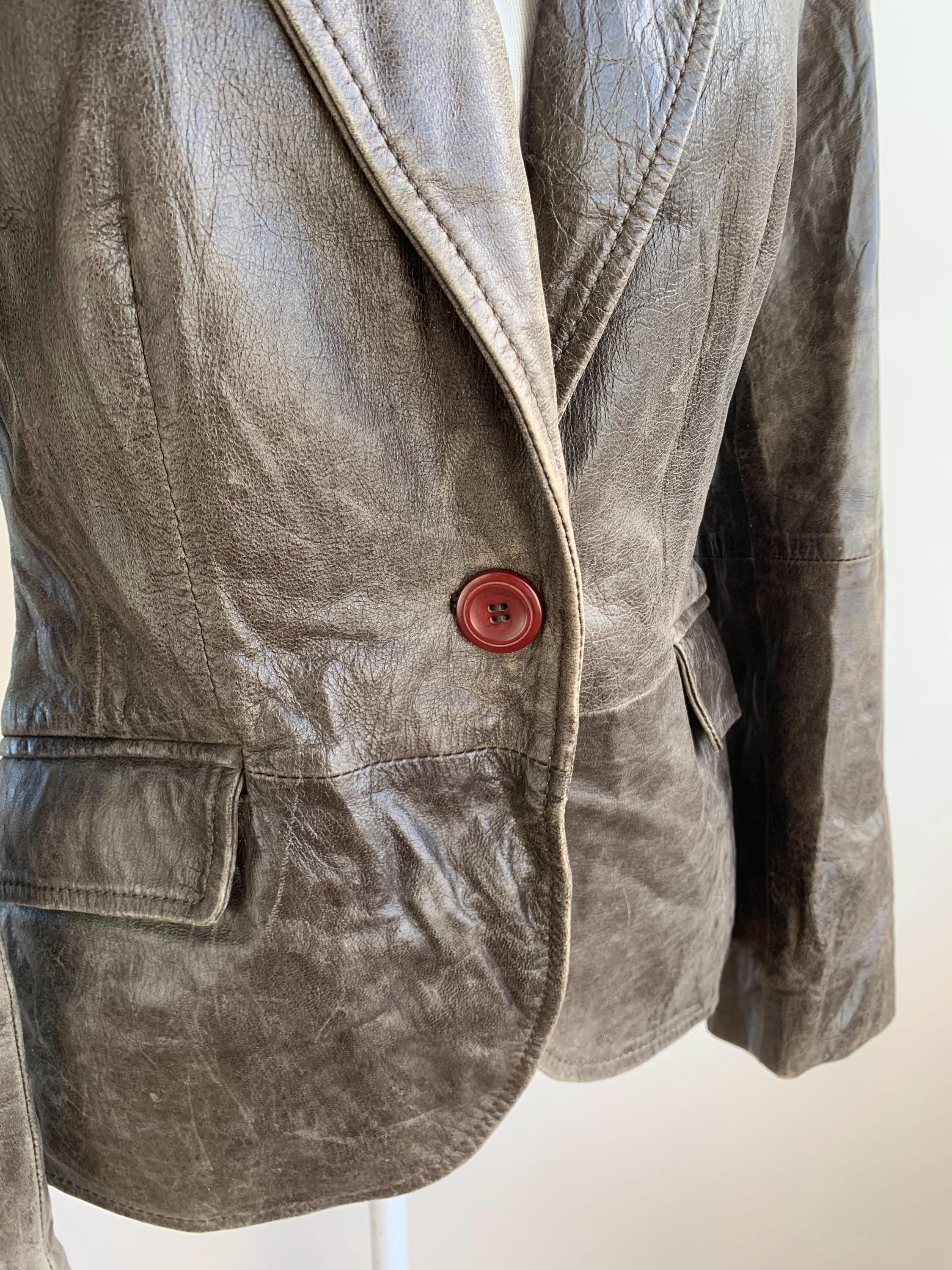 This is a vintage 90s taupe grey brown leather blazer for women by the brand B.Young in size S/M (M is marked on the tag). This grey brown leather blazer has single button closure and fitted silhouette. It is made of heavily distressed genuine leather which has a aged look with decent amount of makrs, scratches and creasing due to the wear. This grunge leather jacket has two flap over front pockets and polyester lining. This real leather blazer is the perfect outerwear for any season - fall, spring, summer and even in the winter if you like in warmer climate. The size marked on this leather jacket for women is M, it fits like size S/M medium. Please check the measurements below.