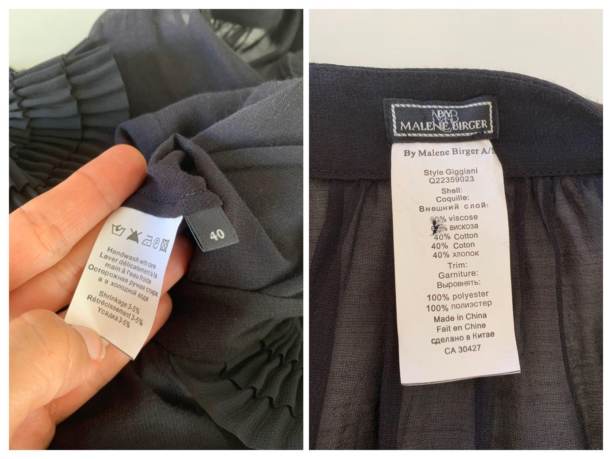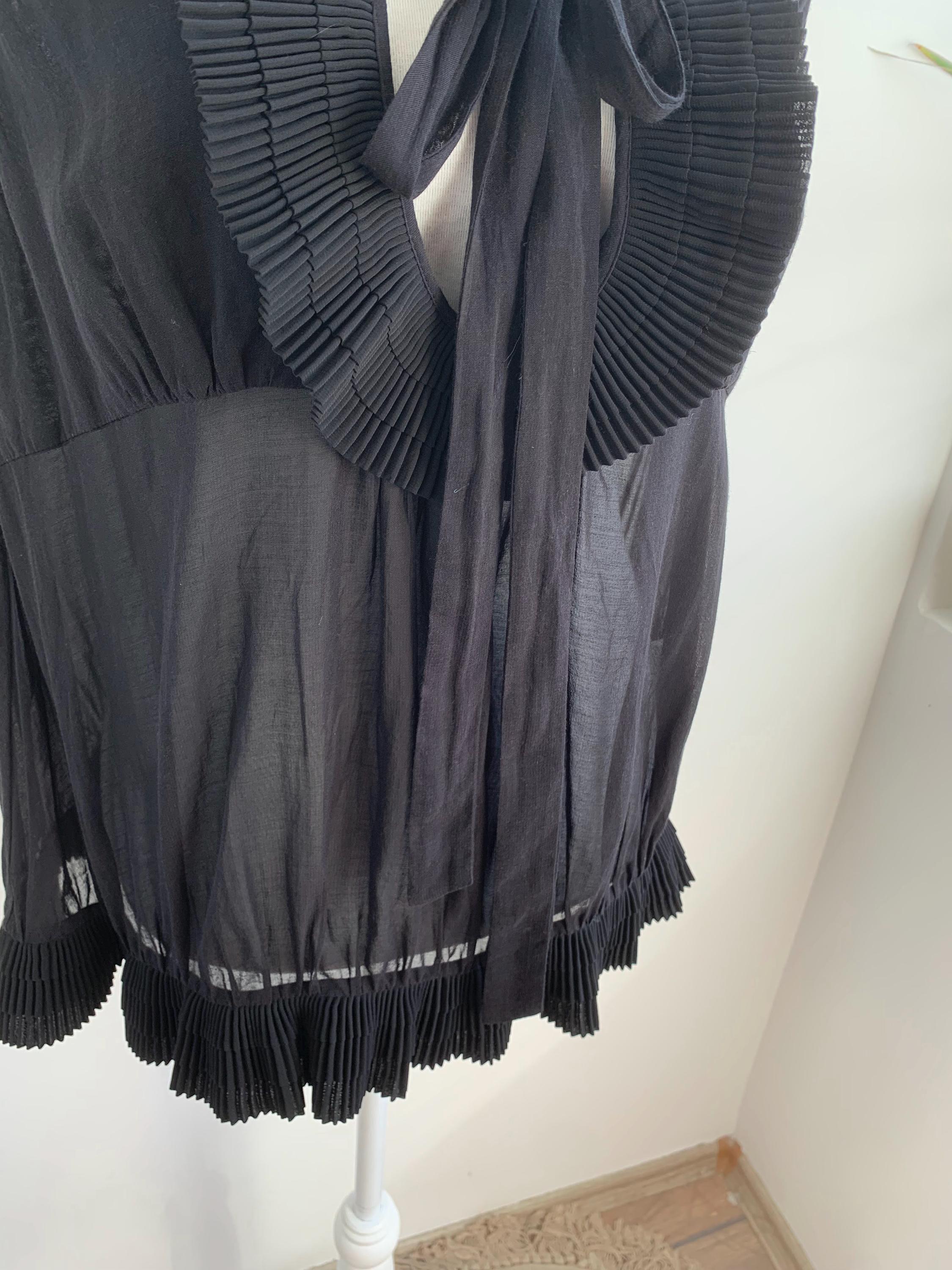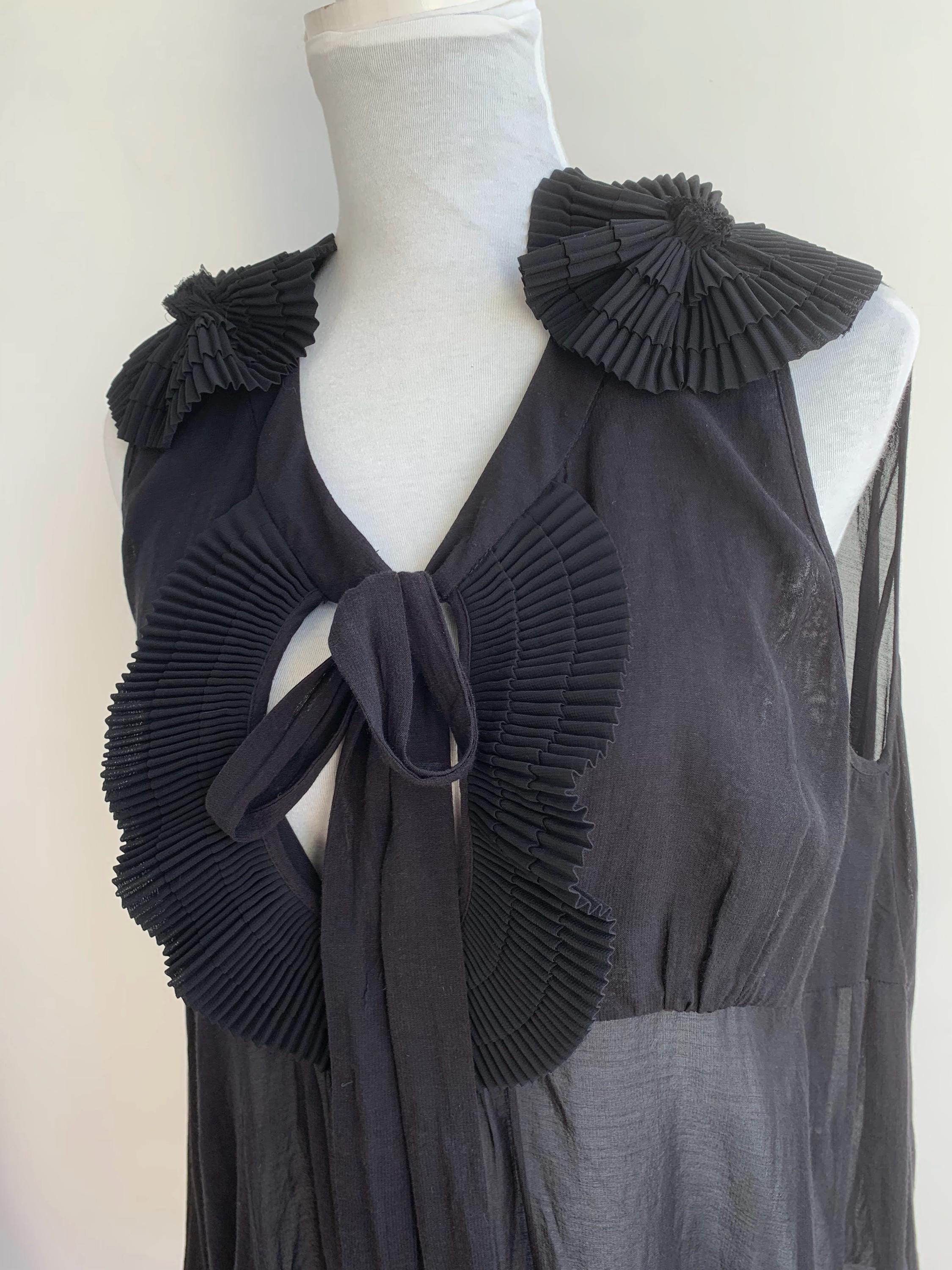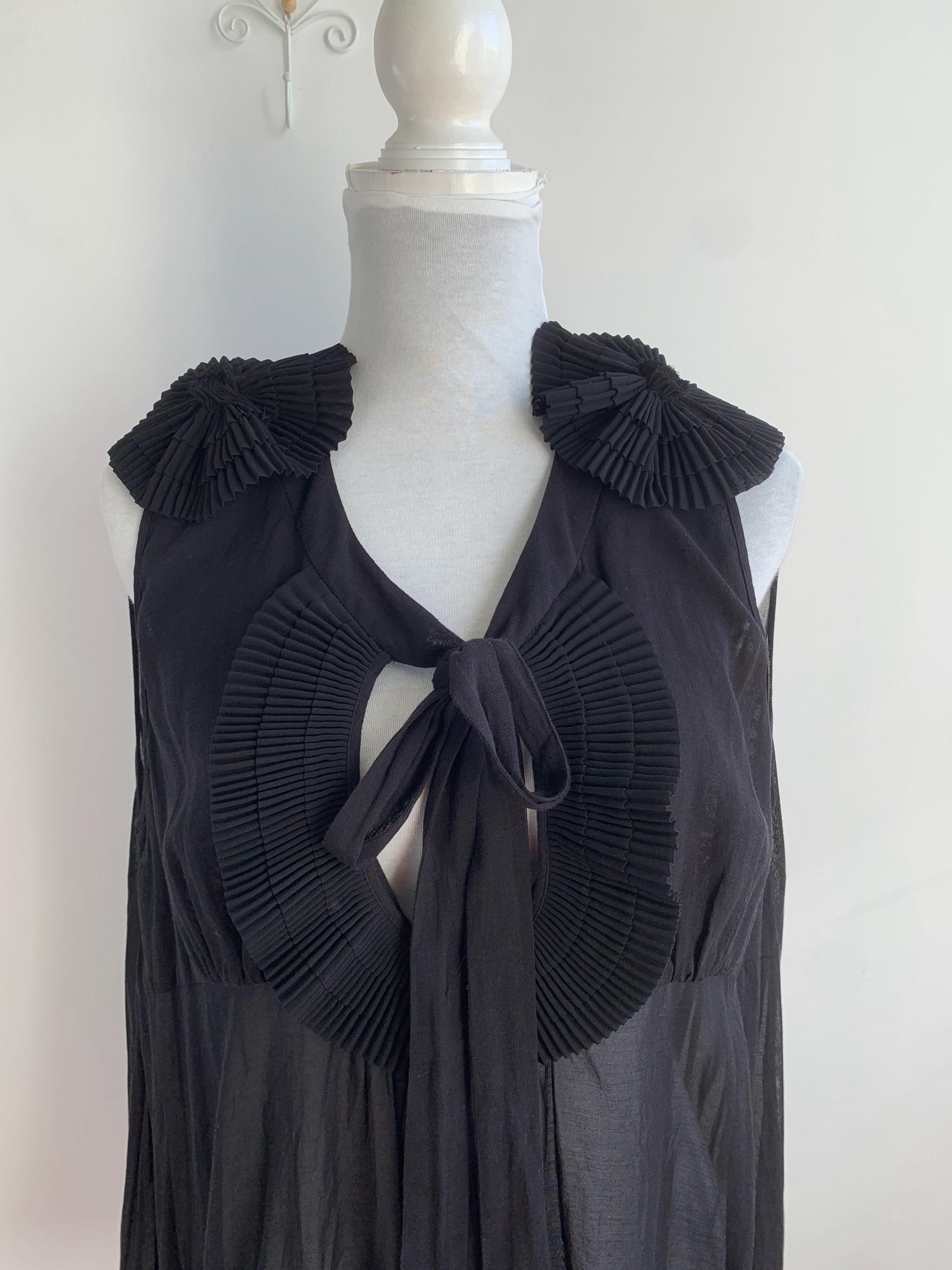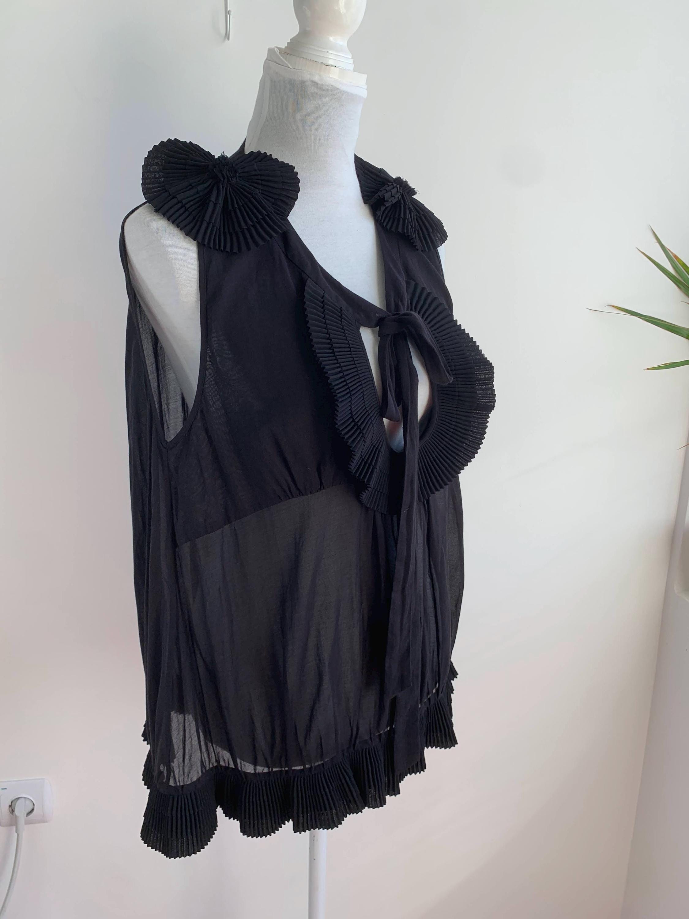 This stunning vintage black goth blouse by Danish designer By Malene Birger in size L is a true statement piece. The blouse features intricate pleat details, with a unique pleated ruffle collar that ties at the front and two pleated rosettes on the shoulders. The lightweight, semi-sheer fabric gives it an airy, ethereal feel, perfect for a chic and edgy look. The loose, relaxed fit makes it comfortable for all-day wear. This piece would be an amazing addition to a modern wardrobe, pairing beautifully with high-waisted trousers, a sleek pencil skirt, or your favorite denim. Its timeless black color and unique design make it a versatile piece for a variety of styles, from gothic and grunge to sophisticated coquette and classic chic.