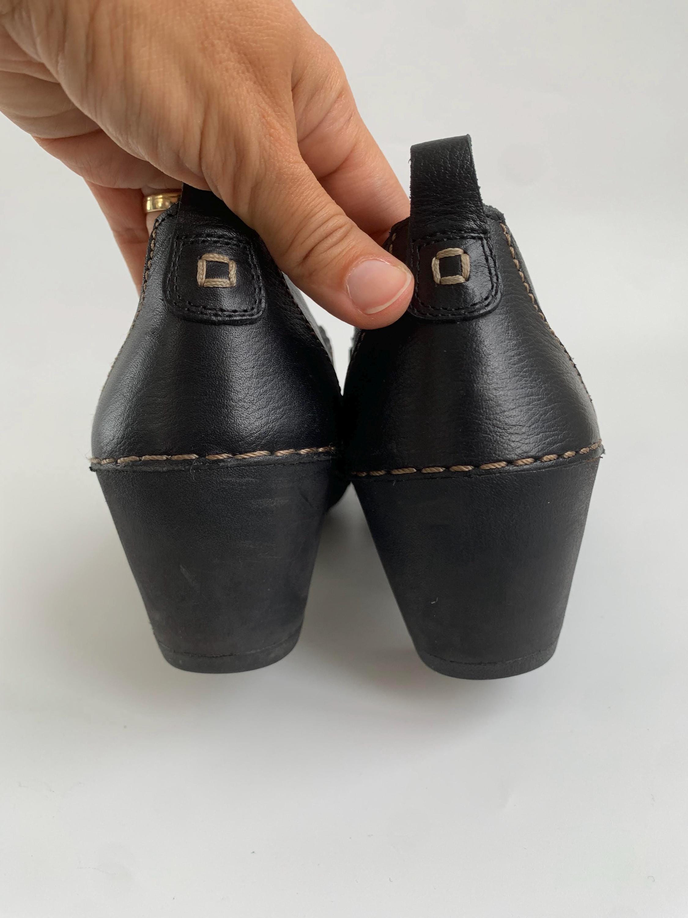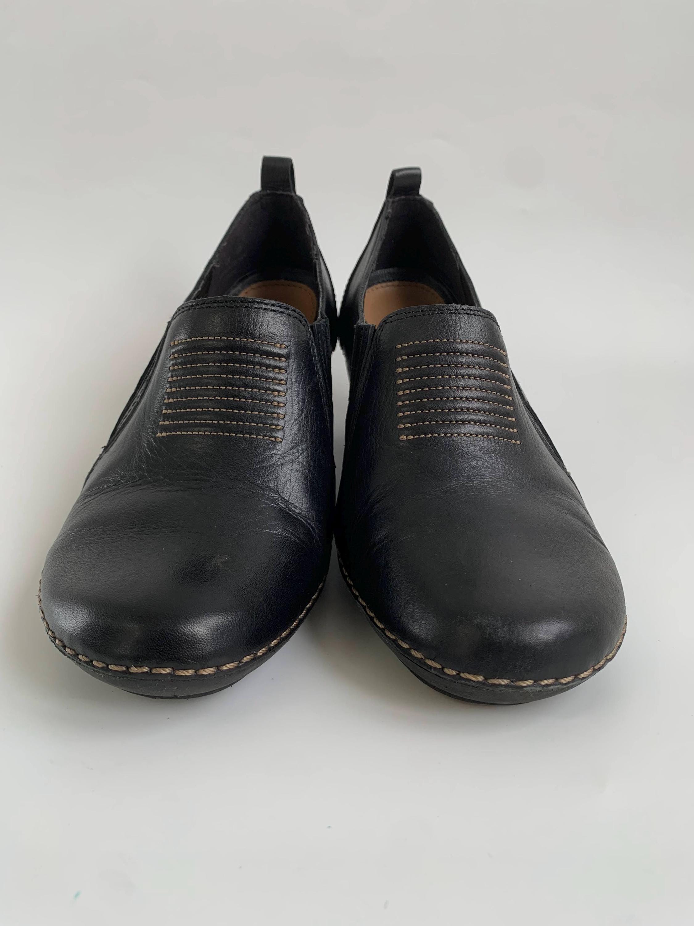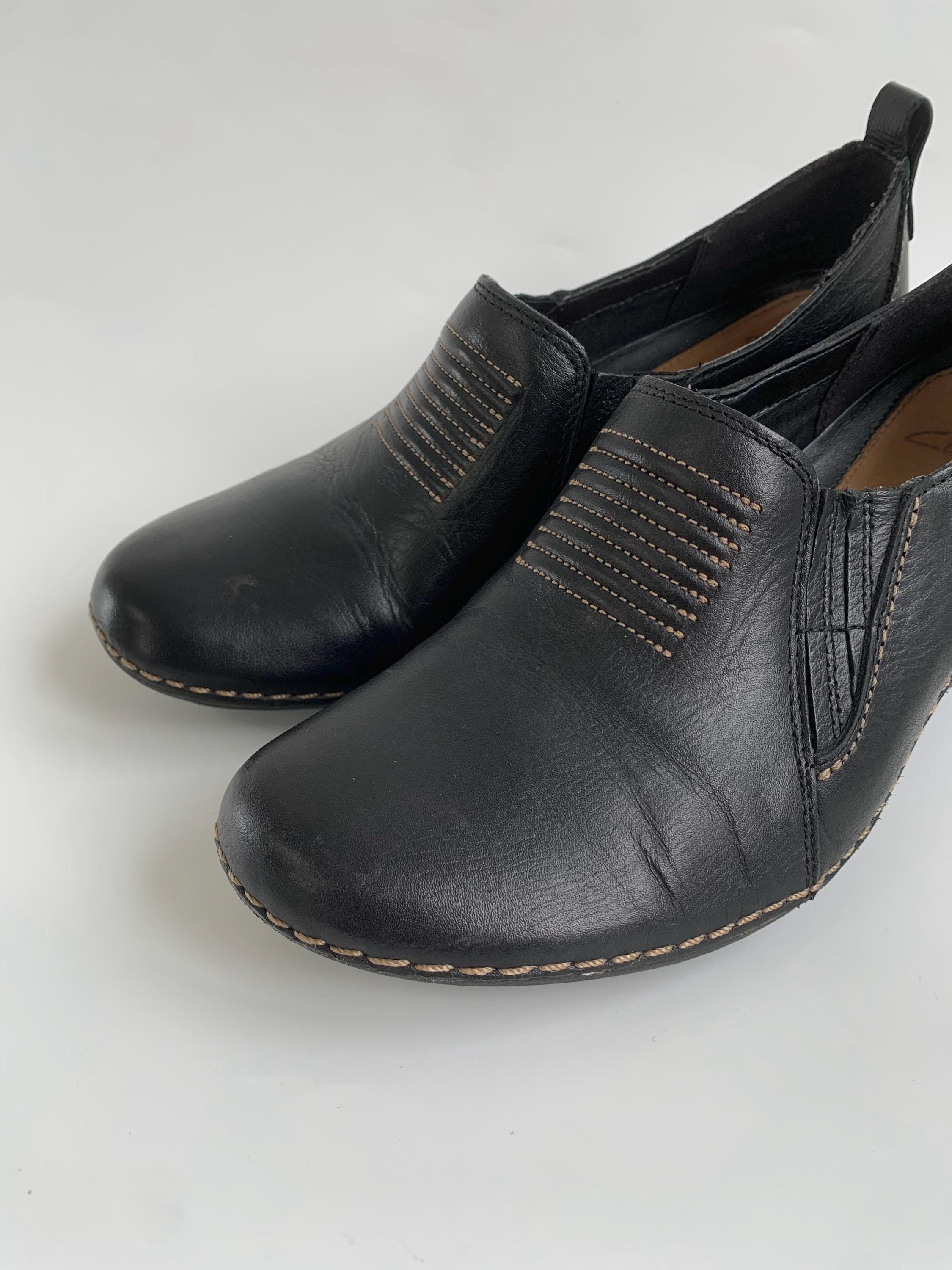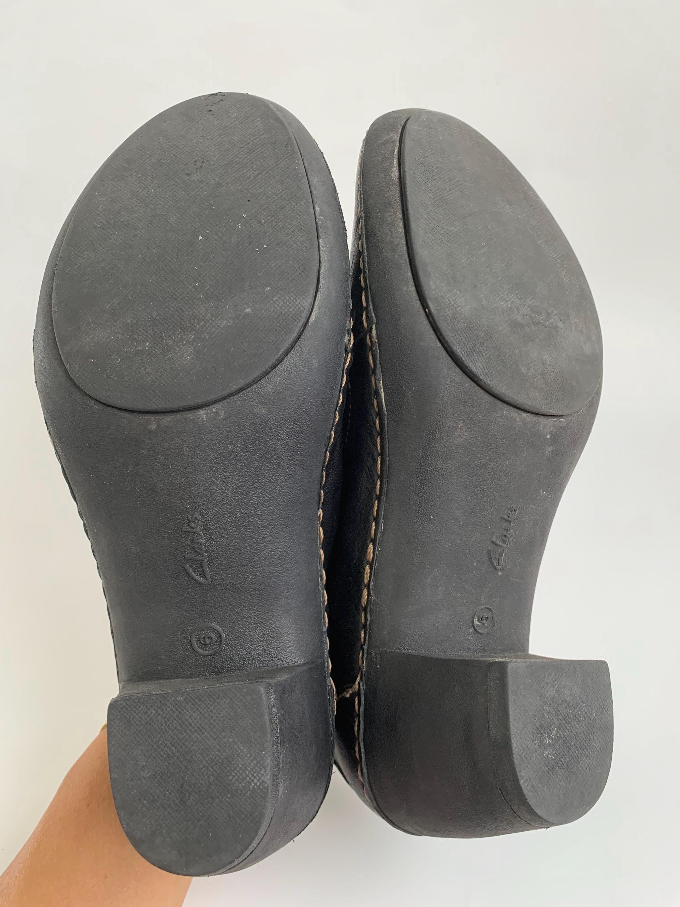 Step out in timeless style with these chic vintage Clarks Plus loafers for women. Crafted from genuine black leather, these slip-on shoes feature a unique, comfortable block heel and classic stitched detailing, adding a touch of rustic charm. The "Plus" line by Clarks is renowned for its cushioned and supportive design, making these a comfortable and durable choice for everyday wear. The minimalist yet elegant design makes them versatile enough for both casual and professional settings. Whether you're heading to the office or a casual outing, these high-quality vintage loafers are a sustainable and stylish addition to your wardrobe.