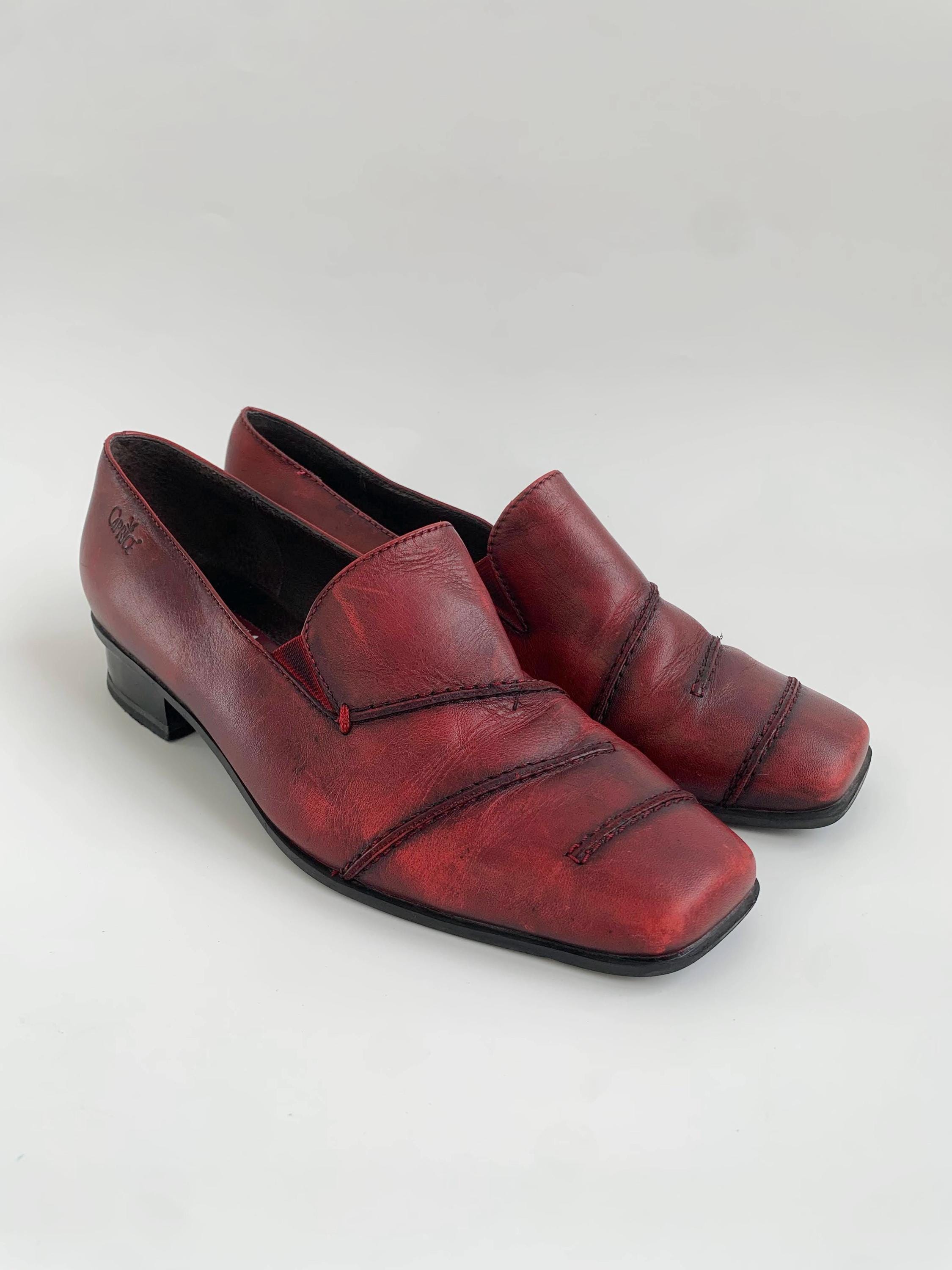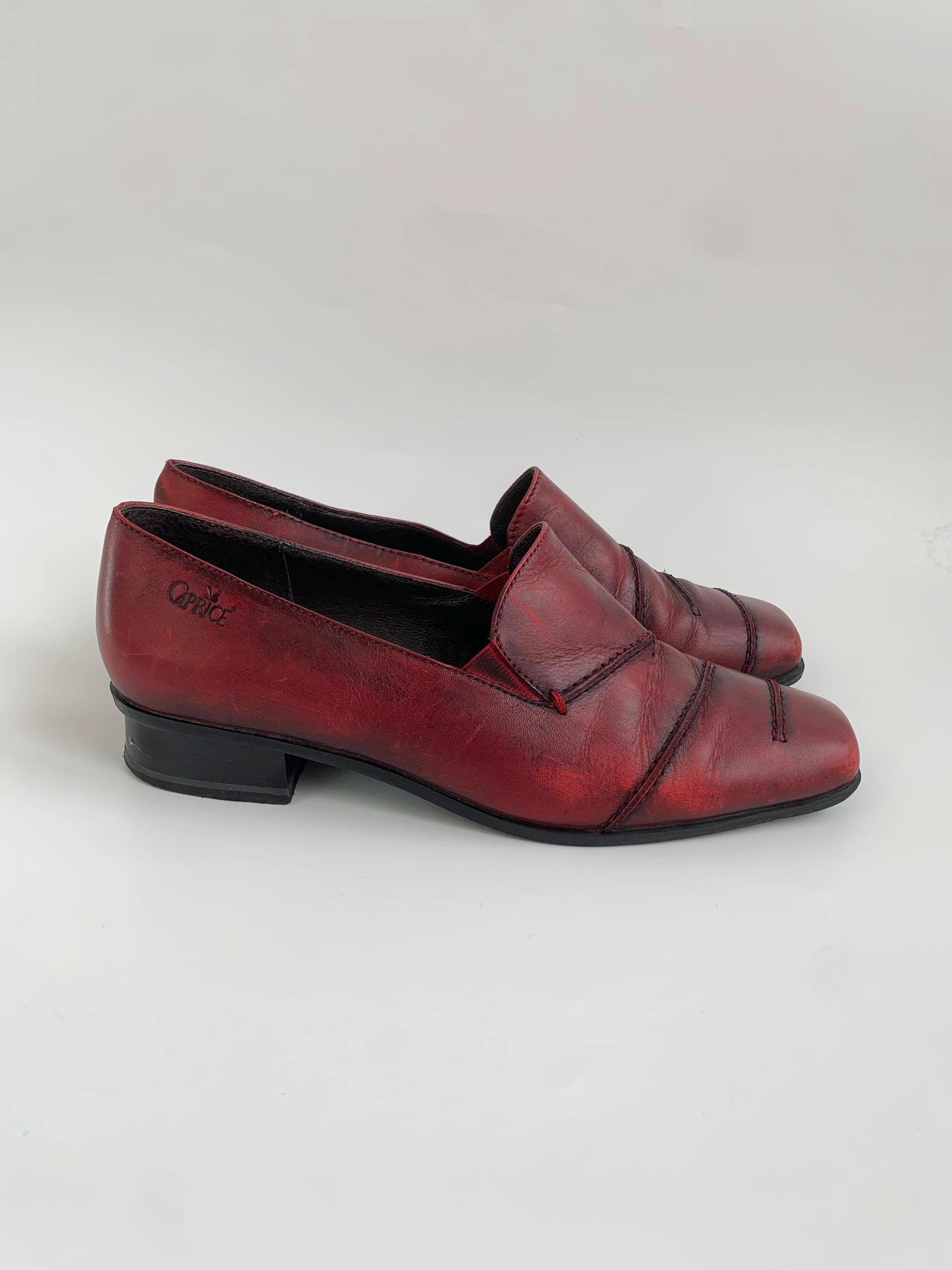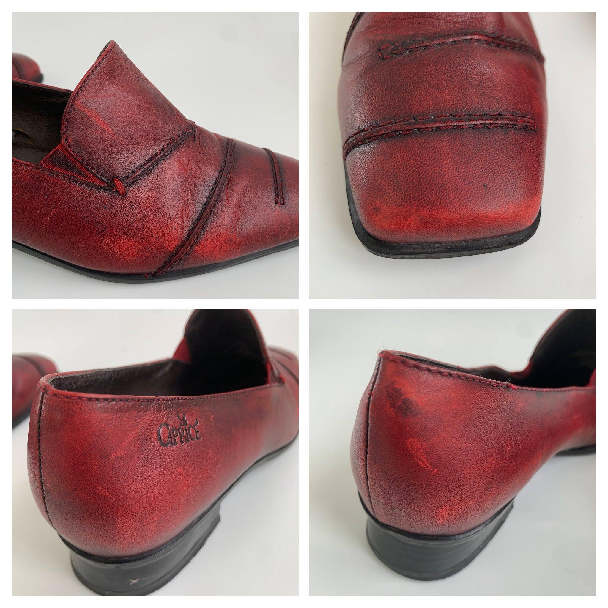 These are not just a pair of shoes, they are a statement piece and a focal point of your outfit. This pair of vintage loafer shoes by the brand Caprice perfectly captures the minimalist grunge aesthetic of the 90s with a modern twist. Made from genuine leather in a beautiful, wine red color, they feature a chic square toe and a low, chunky block heel that is both comfortable and on-trend. The simple design is elevated by a decorative stittches at the toes, adding just a touch of character. The anti shock sole provides extra comfort so you can run errands all day long without your feet getting tired. Their timeless style makes them the perfect addition to a dark academia, fairy grunge, or minimalist capsule wardrobe, pairing effortlessly with everything from jeans to a flowy skirt.