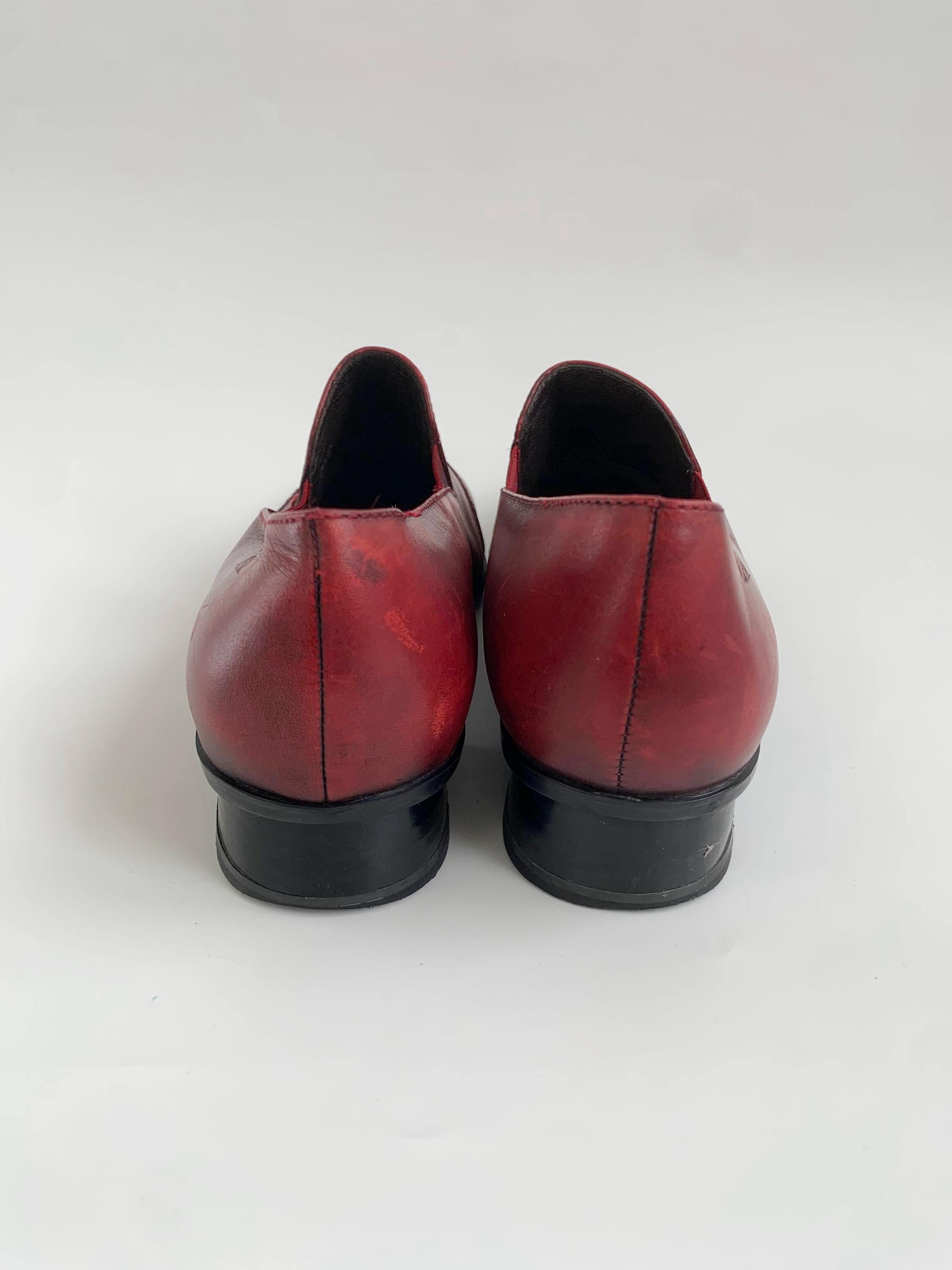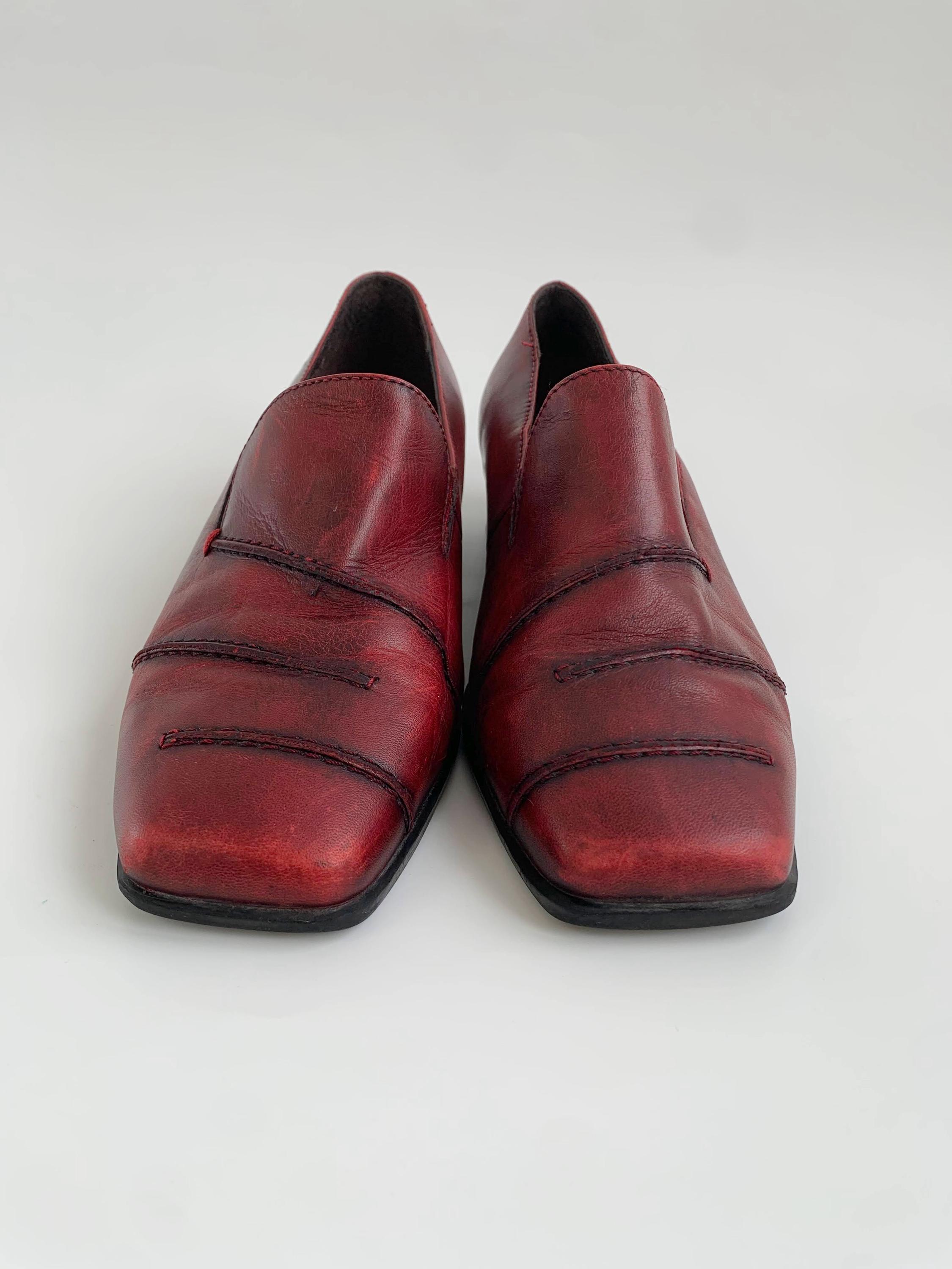 These square toe burgundy red leather loafers are the shoes you've been searching for. Step back into the late 90s and early 2000s with this perfect pair of vintage leather slip on shoes that are as stylish today as they were then.