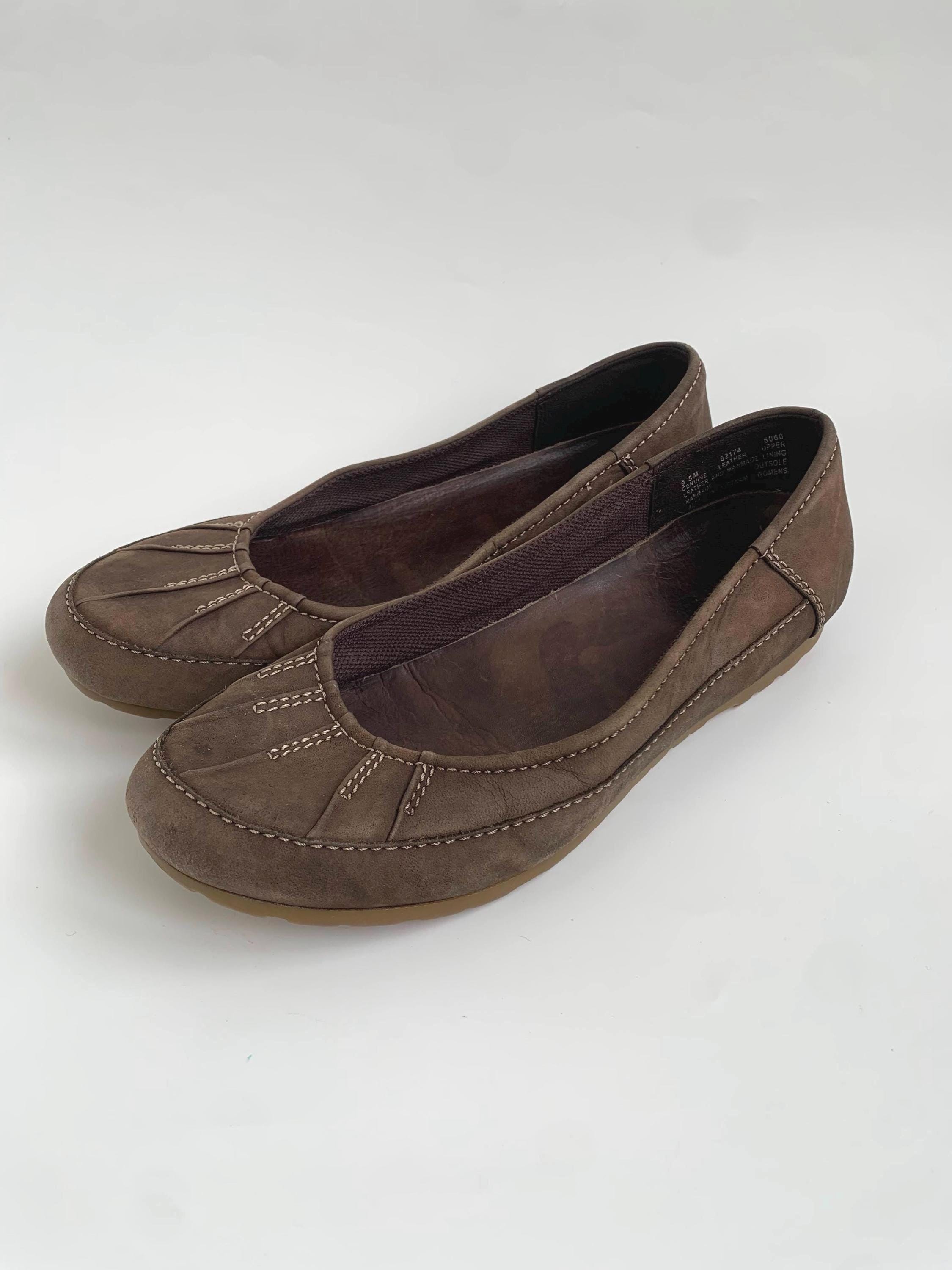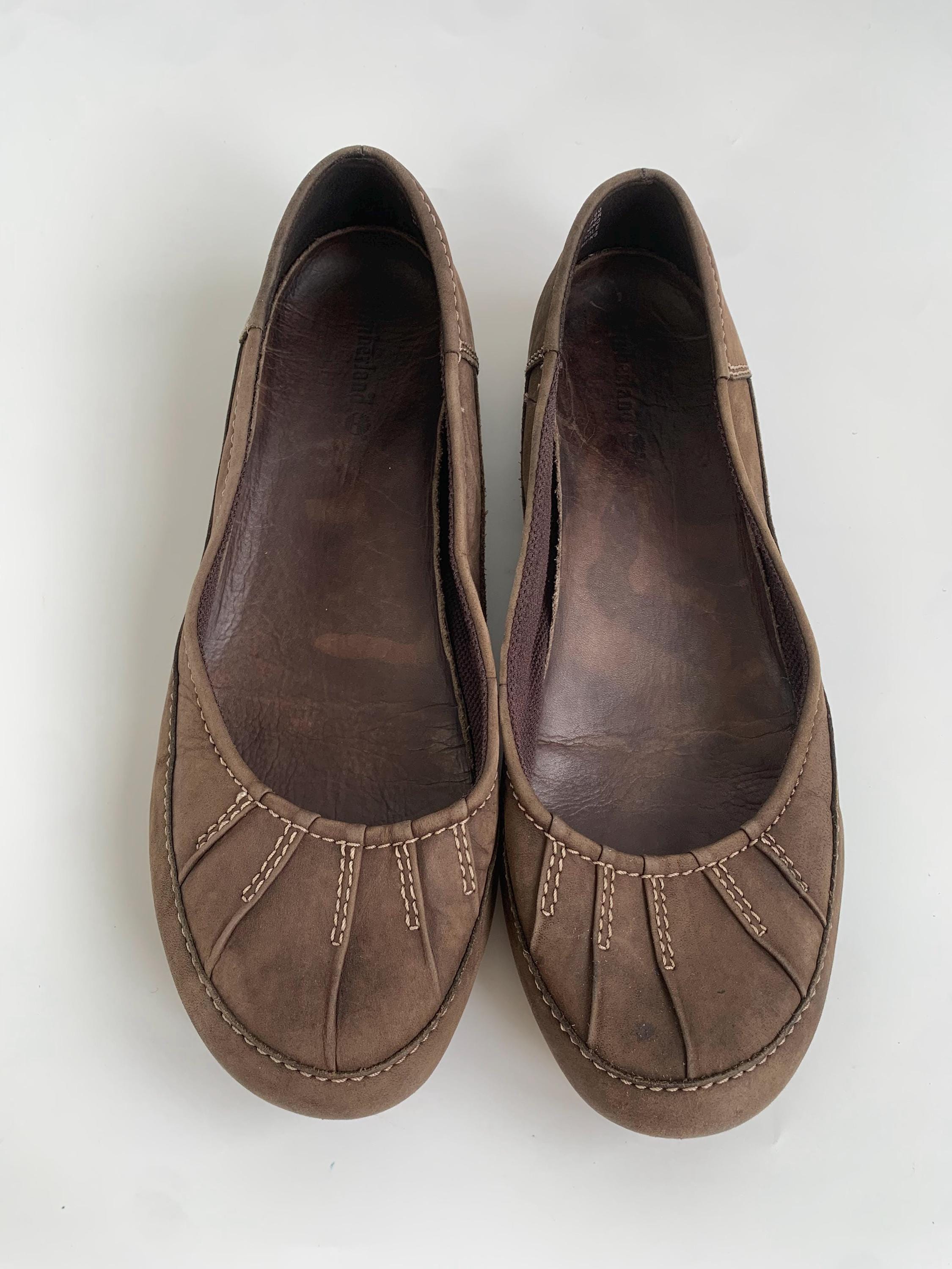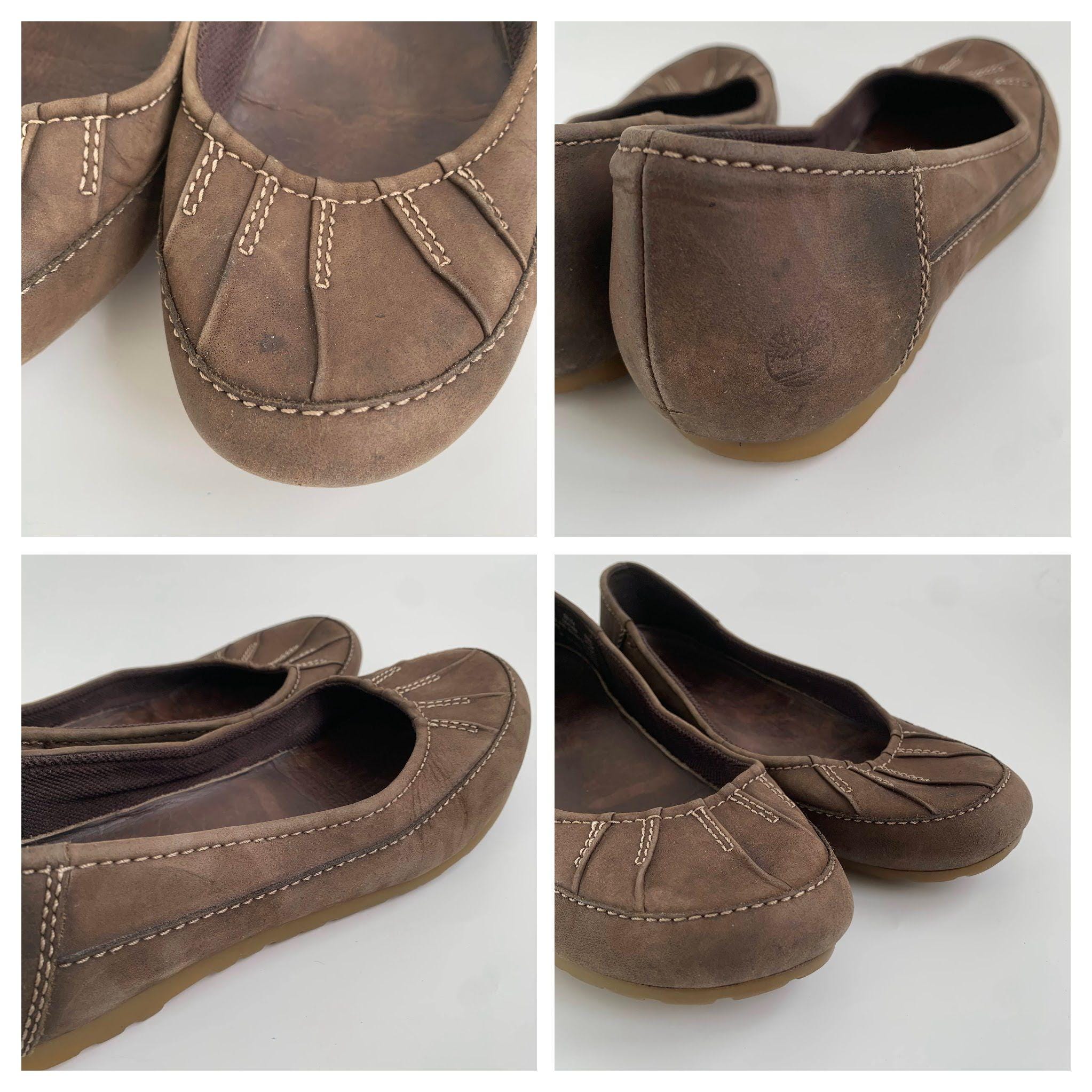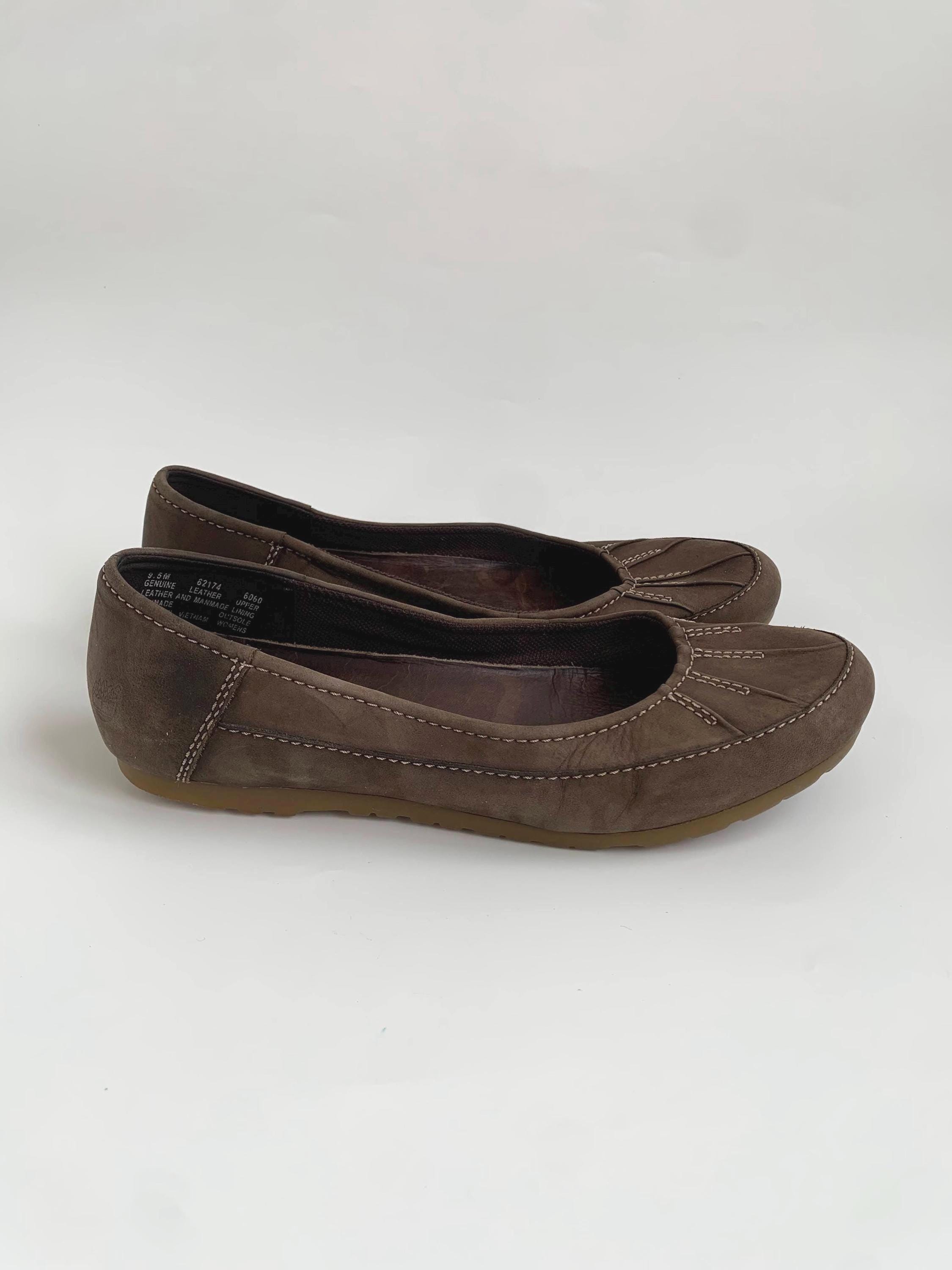 Step back into the effortlessly comfortable style of the Y2Ks with these beautiful vintage Timberland leather flats. These classic brown slip-on shoes are a timeless staple, offering the exceptional quality and comfort the Timberland brand is known for. The design features a gently gathered pleated toe detail, giving them the relaxed look of a sophisticated ballet flat combined with a practical driving shoe or moccasin.