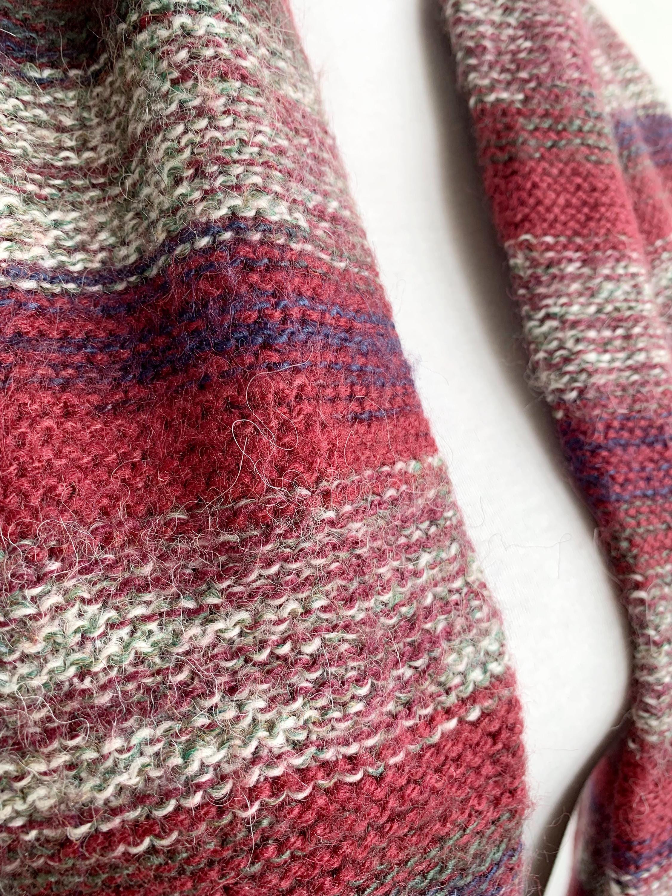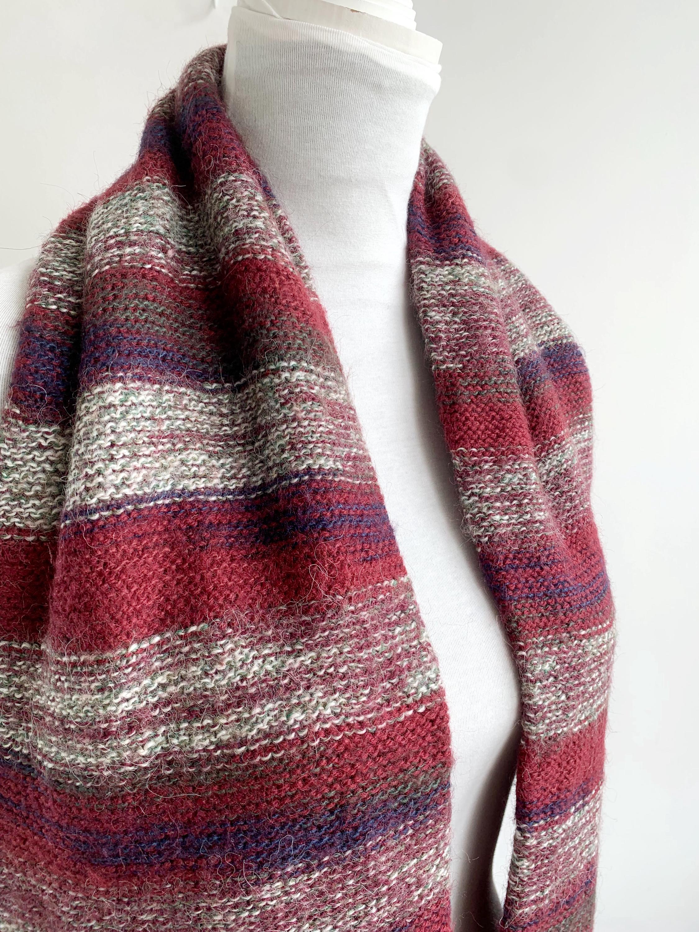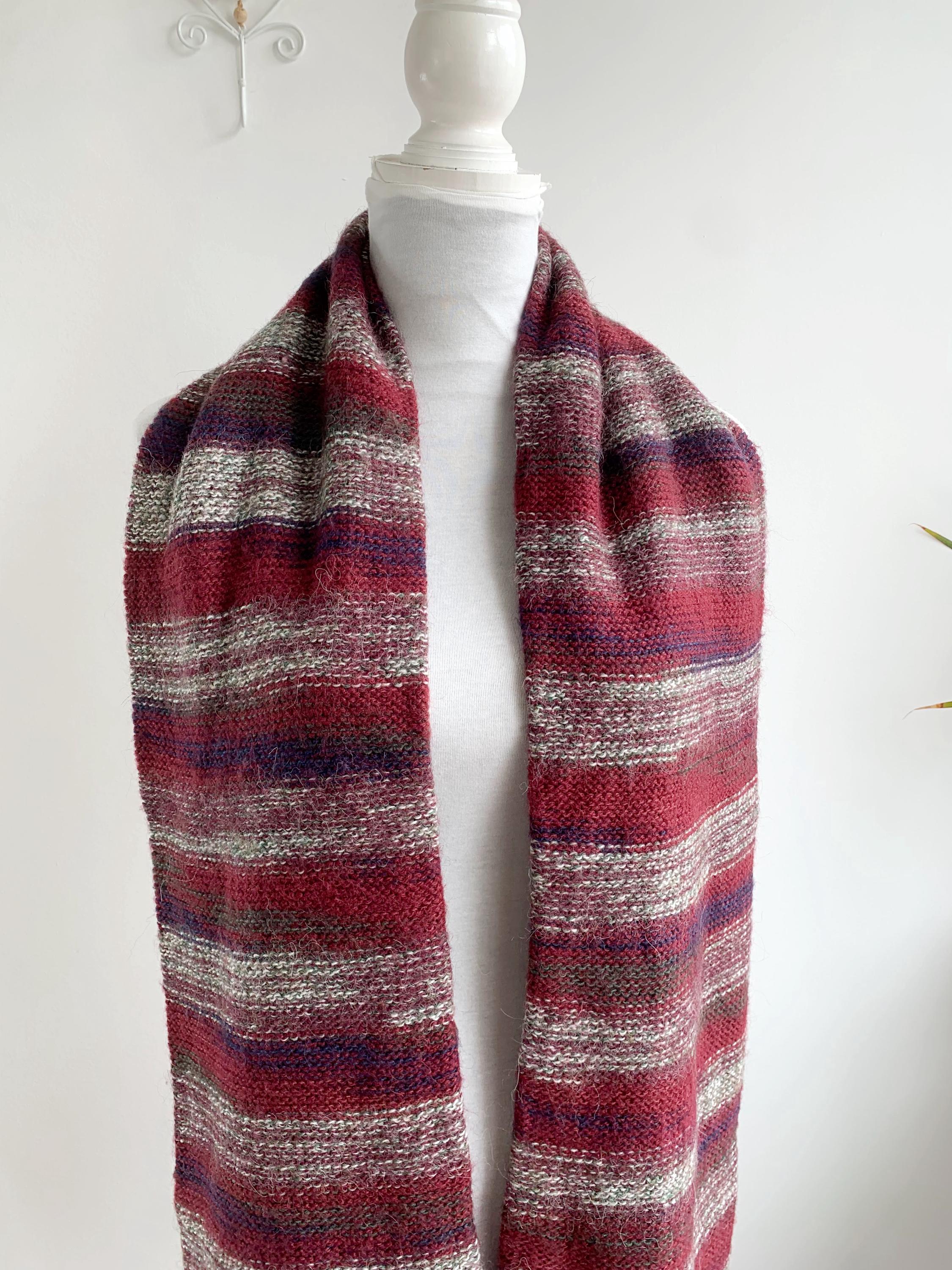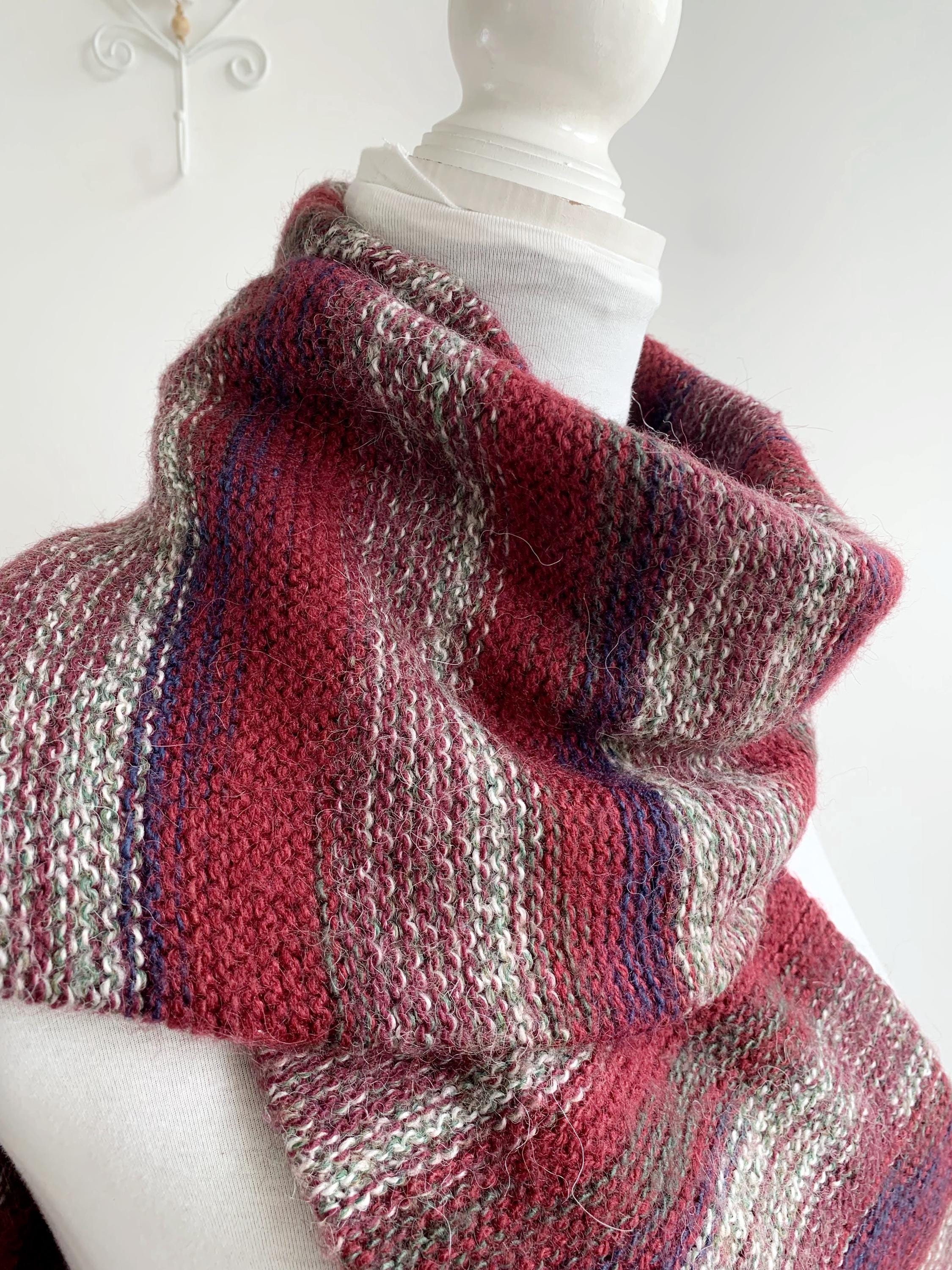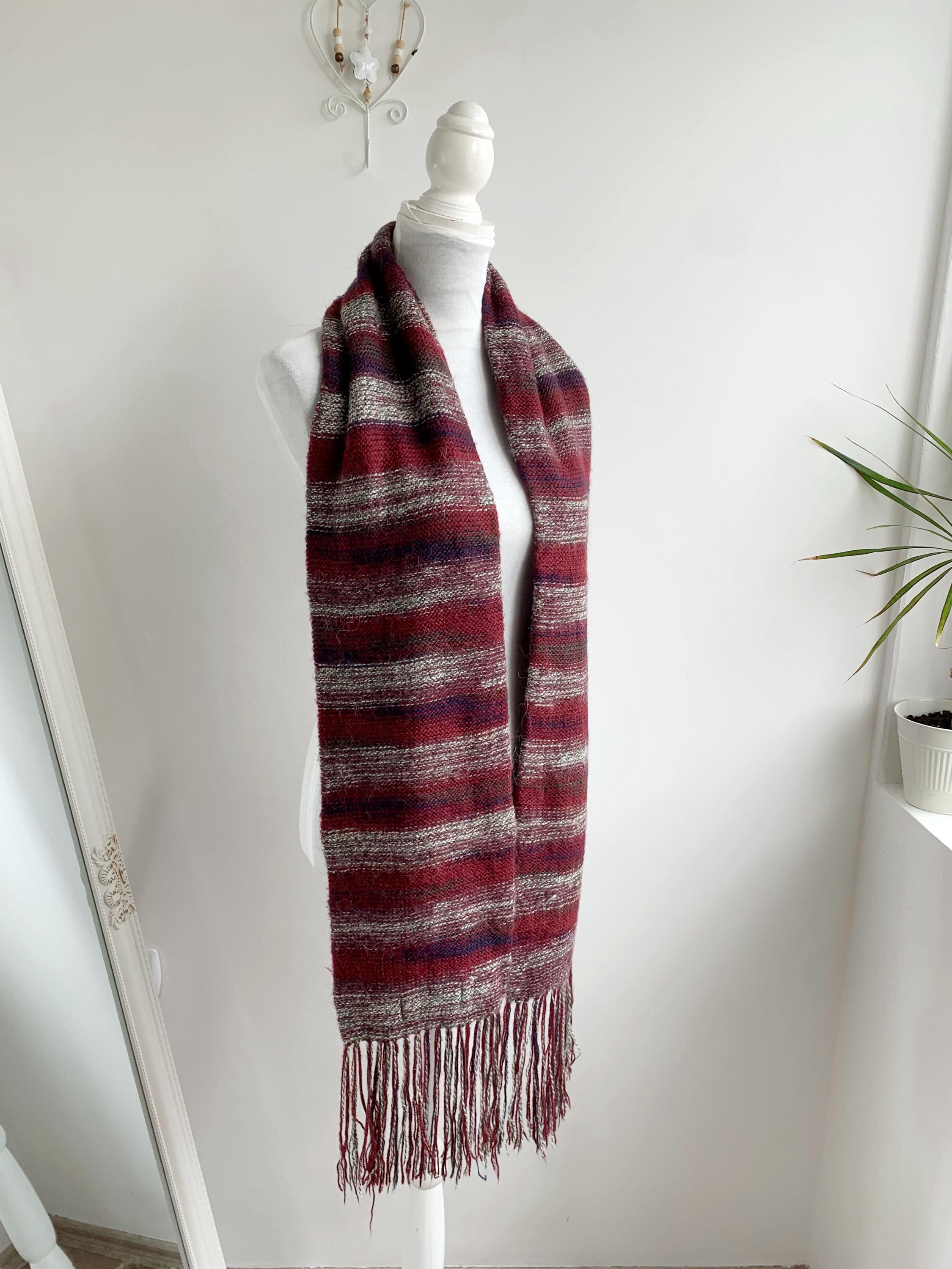 This is a beautiful vintage natural alpaca wool scarf in rich burgindy red color with delicate shades of soft beige, mint and cobalt blue brown color. This Peruvian aplaca scarf is soper soft and cozy and feels amazing on the skin. This cozy neck scarf is made of fluffy pure alpaca wool yarn which will keep you nice and warm during the cold winter days. This long neck warmer is in beautiful fall shades which is the perfect addition to your minimalist wardrobe. This thick thermal winter scarf has cute fringe detailing at the ends.