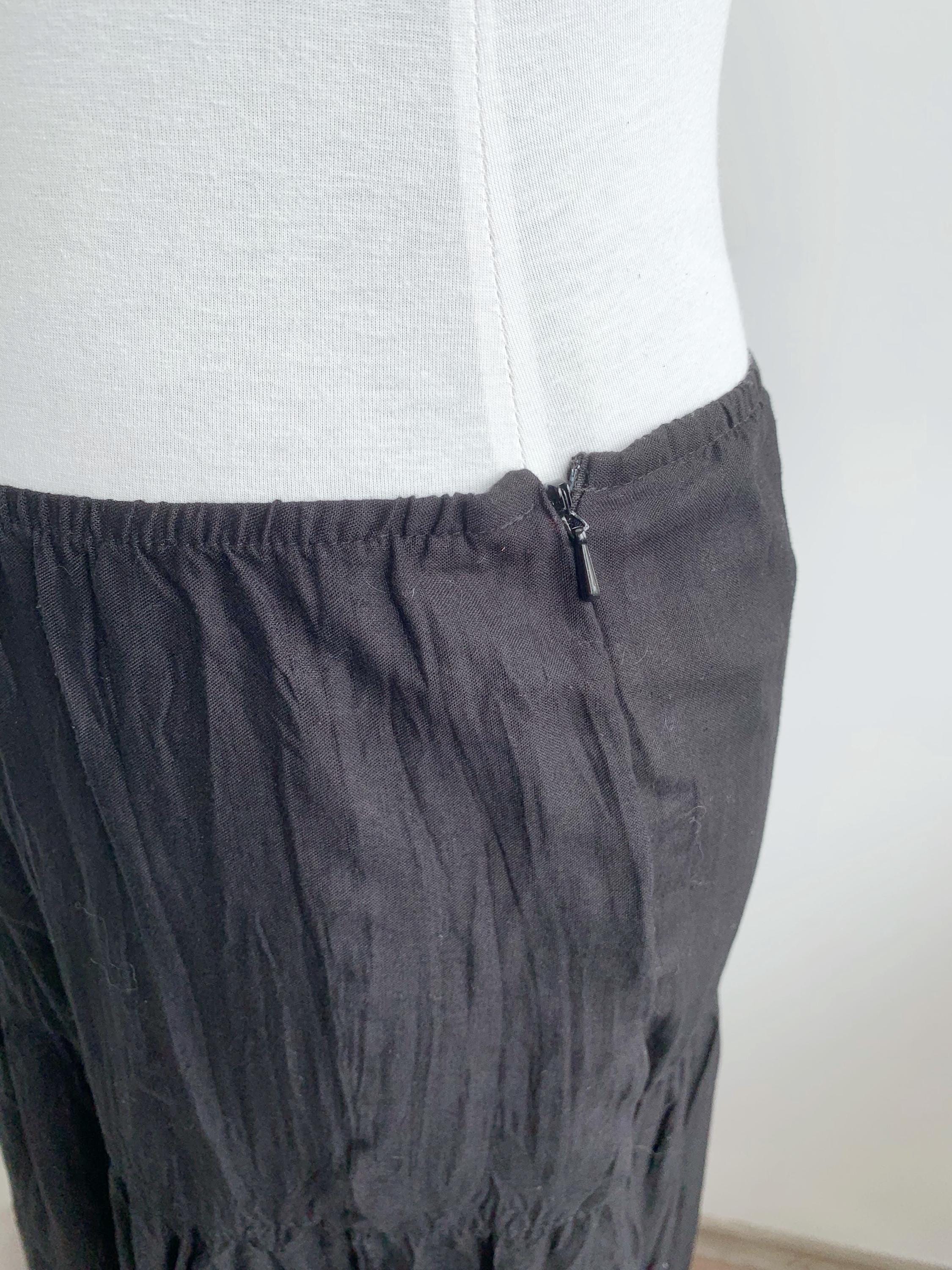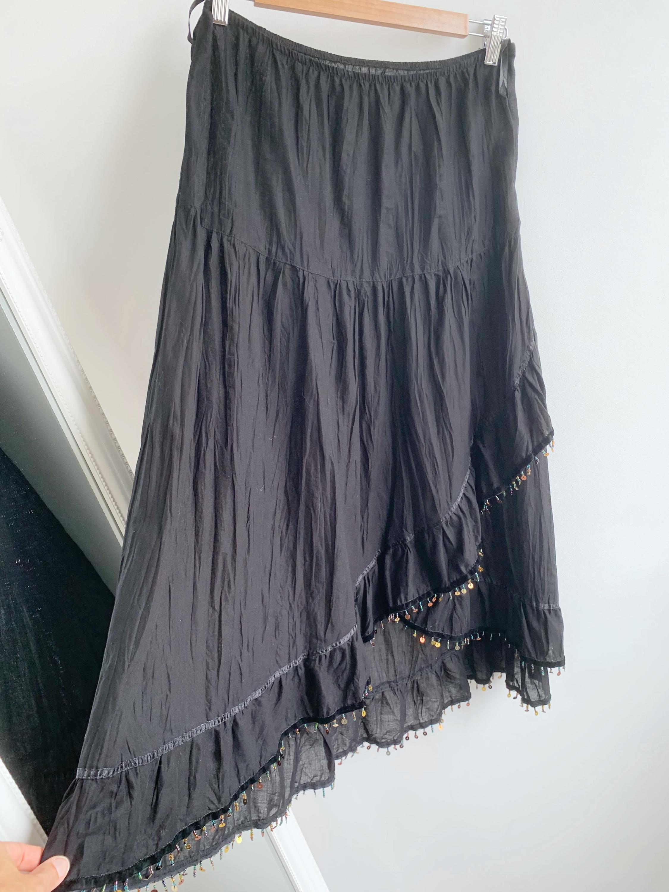 Step out in this stunning vintage black tiered skirt, a true statement piece with fantastic movement and sparkle. This is the ultimate boho-glam skirt, perfect for festivals, parties, or adding a unique, romantic touch to your everyday wardrobe. The skirt features a comfortable elasticated high-waist with side zip closure and falls into beautiful, flowing tiers, all delicately embellished with intricate sequins and seedbeads trim along the hemline that catch the light beautifully. The volume and draping create a dramatic, flattering silhouette. Whether you're aiming for a bohemian, romantic gothic, or an elevated retro party look, this unique maxi skirt is a versatile, one-of-a-kind find that brings a touch of vintage luxury.