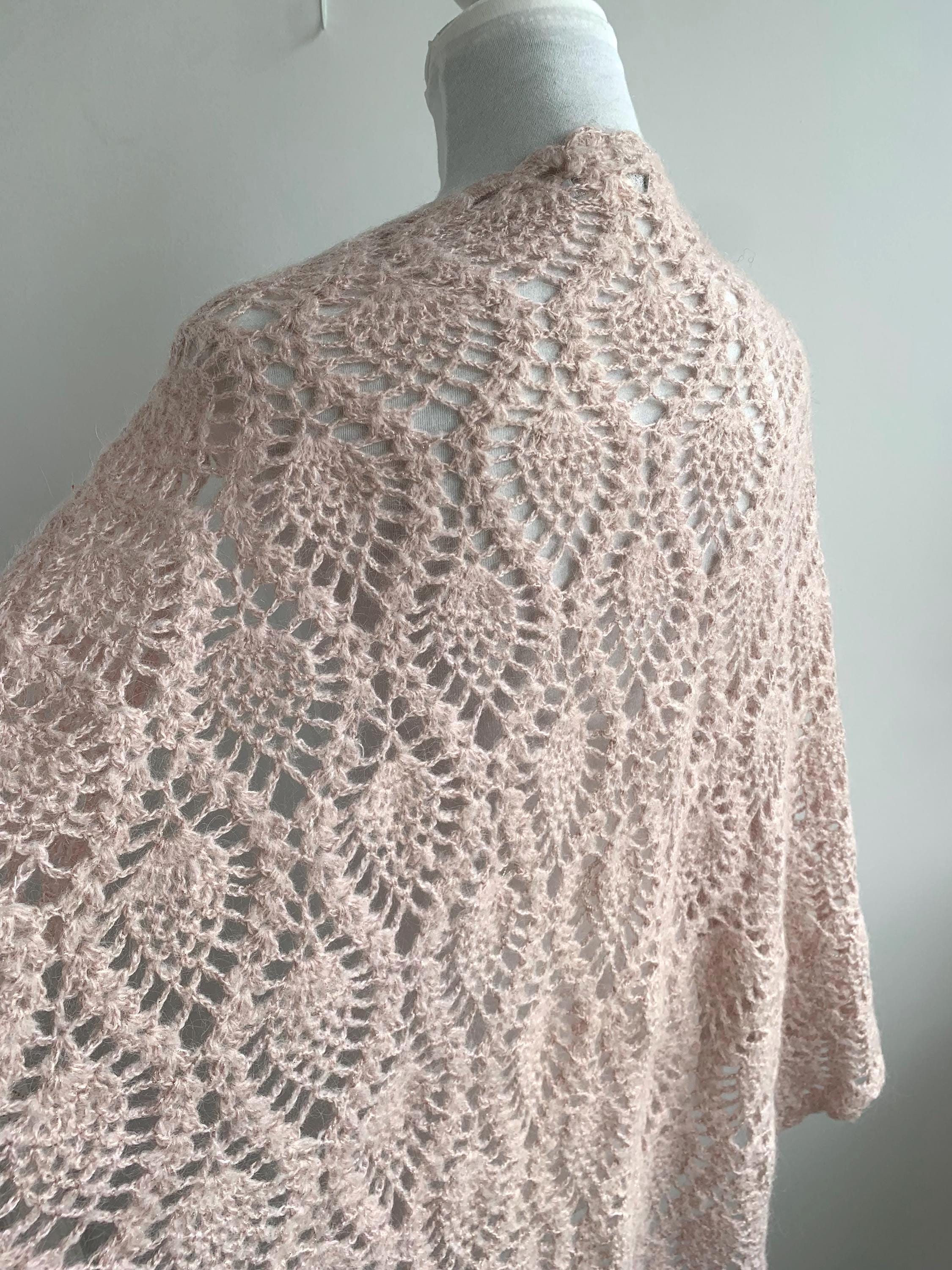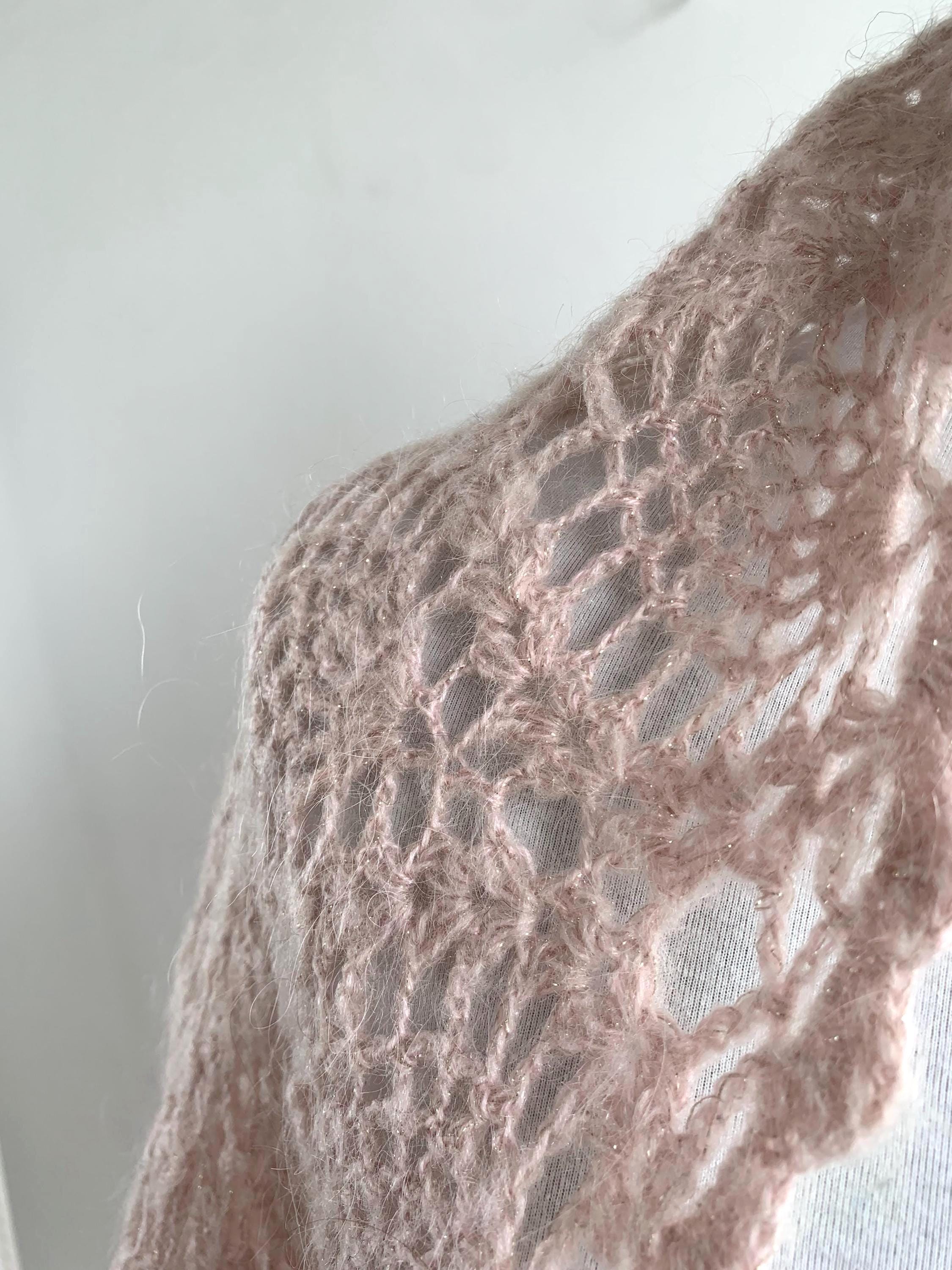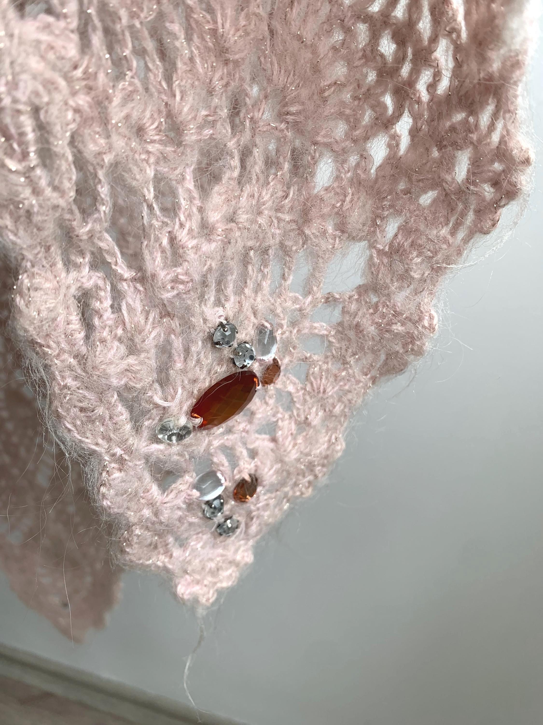 The pale pink yarn is accented with a delicate silver lamé sparkle woven throughout, allowing it to catch the light beautifully—perfect for evening wear or a special occasion. Adding to its charm, the edges are embellished with subtle rhinestones at the edges, making this a true statement piece with a lovely '70s glam or romantic feel.