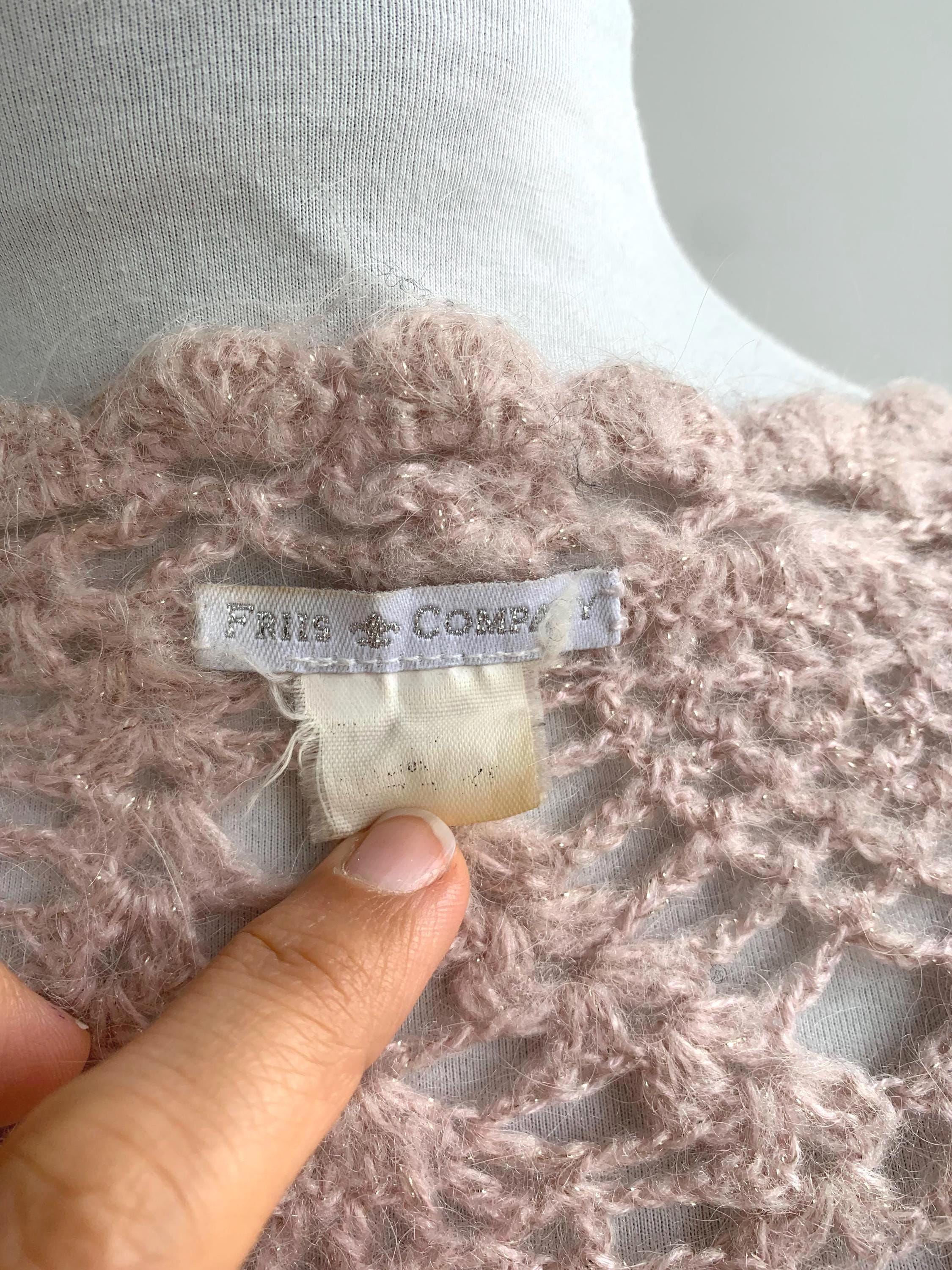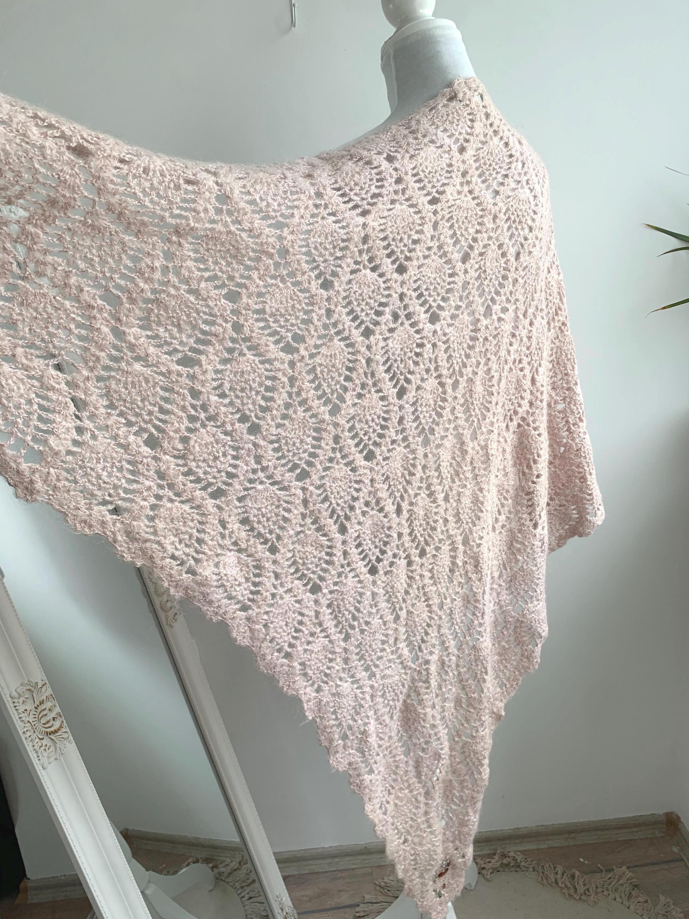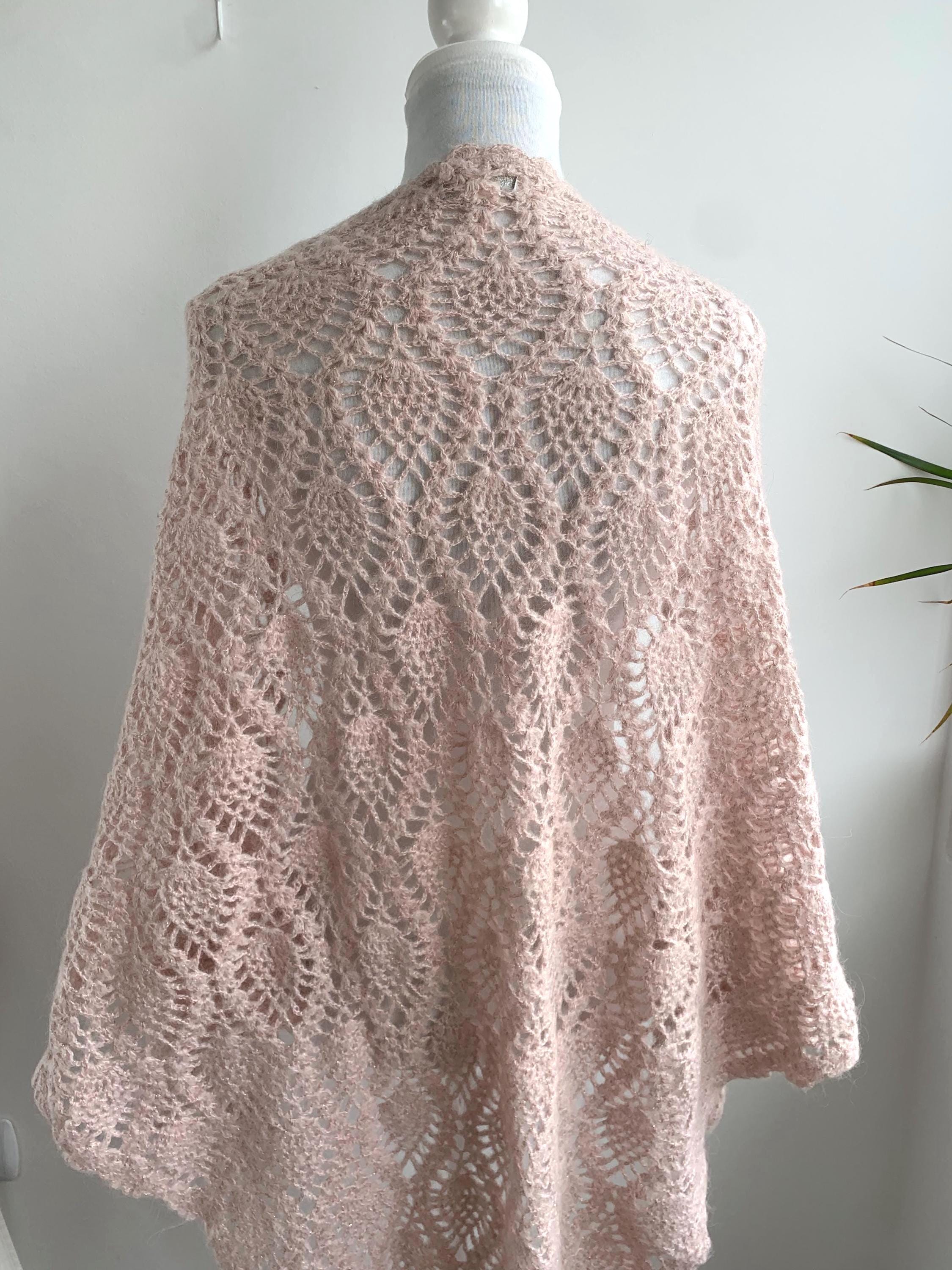 The pale pink yarn is accented with a delicate silver lamé sparkle woven throughout, allowing it to catch the light beautifully—perfect for evening wear or a special occasion. Adding to its charm, the edges are embellished with subtle rhinestones at the edges, making this a true statement piece with a lovely '70s glam or romantic feel.