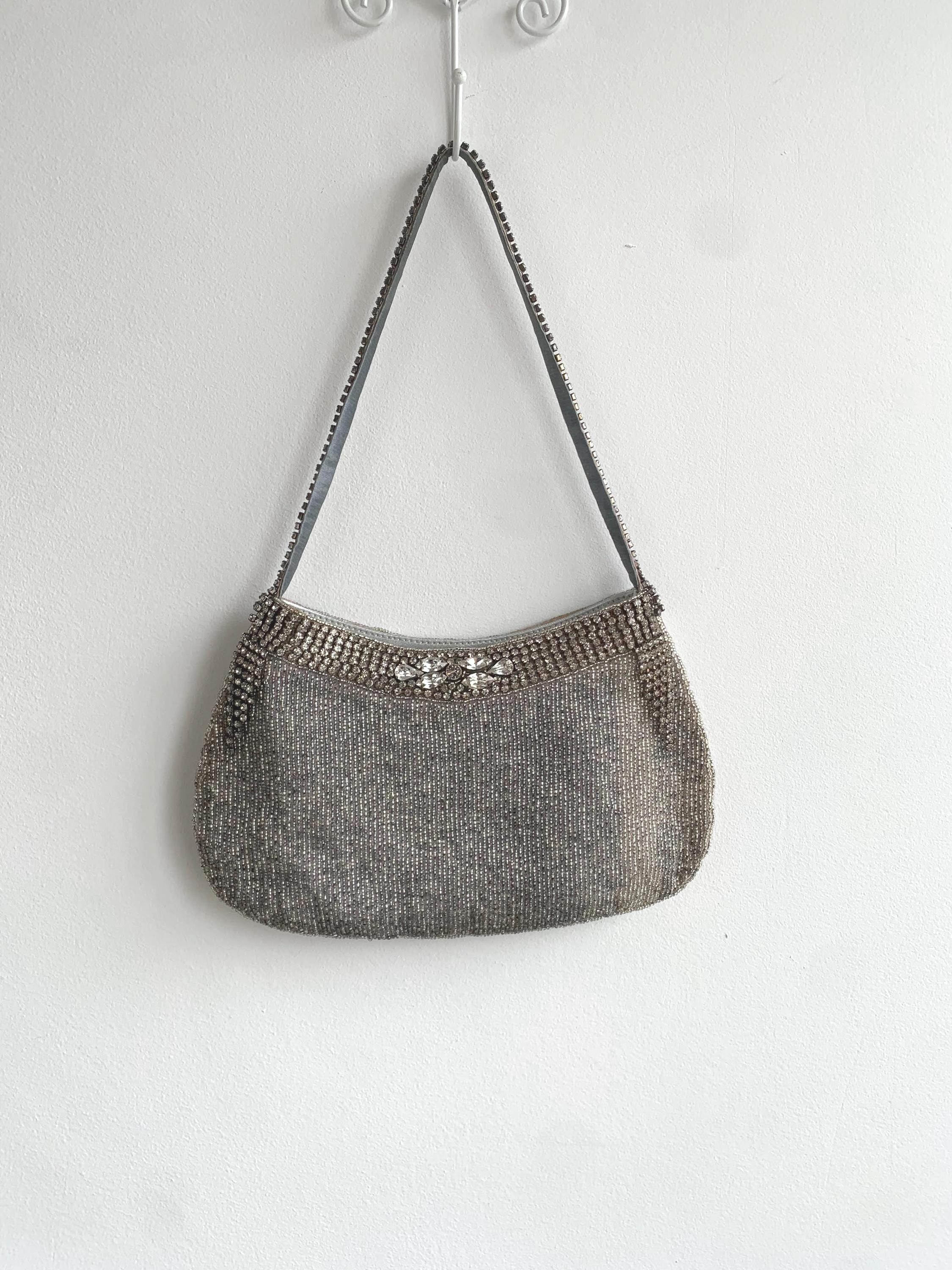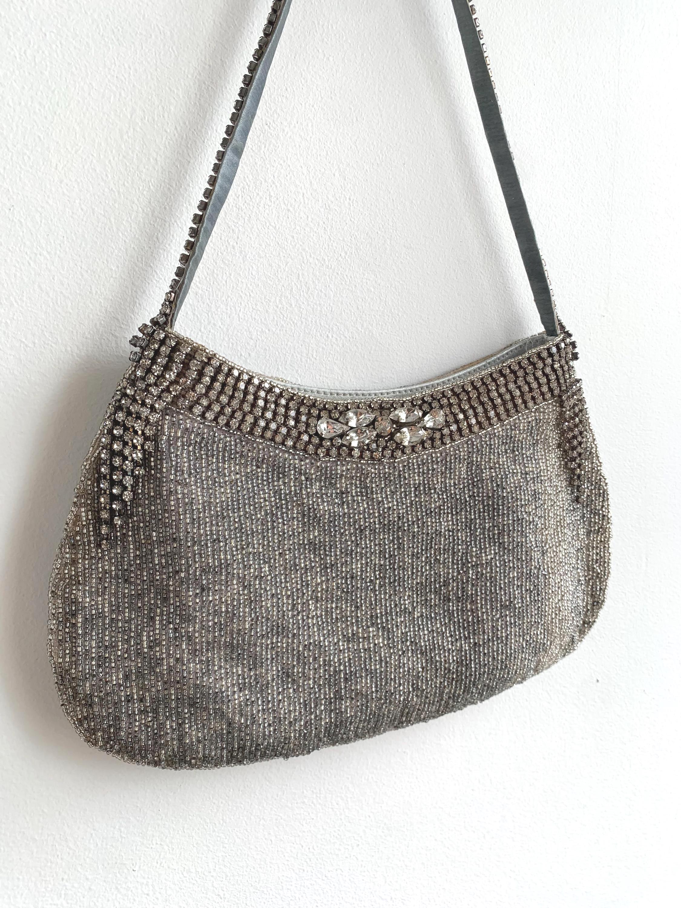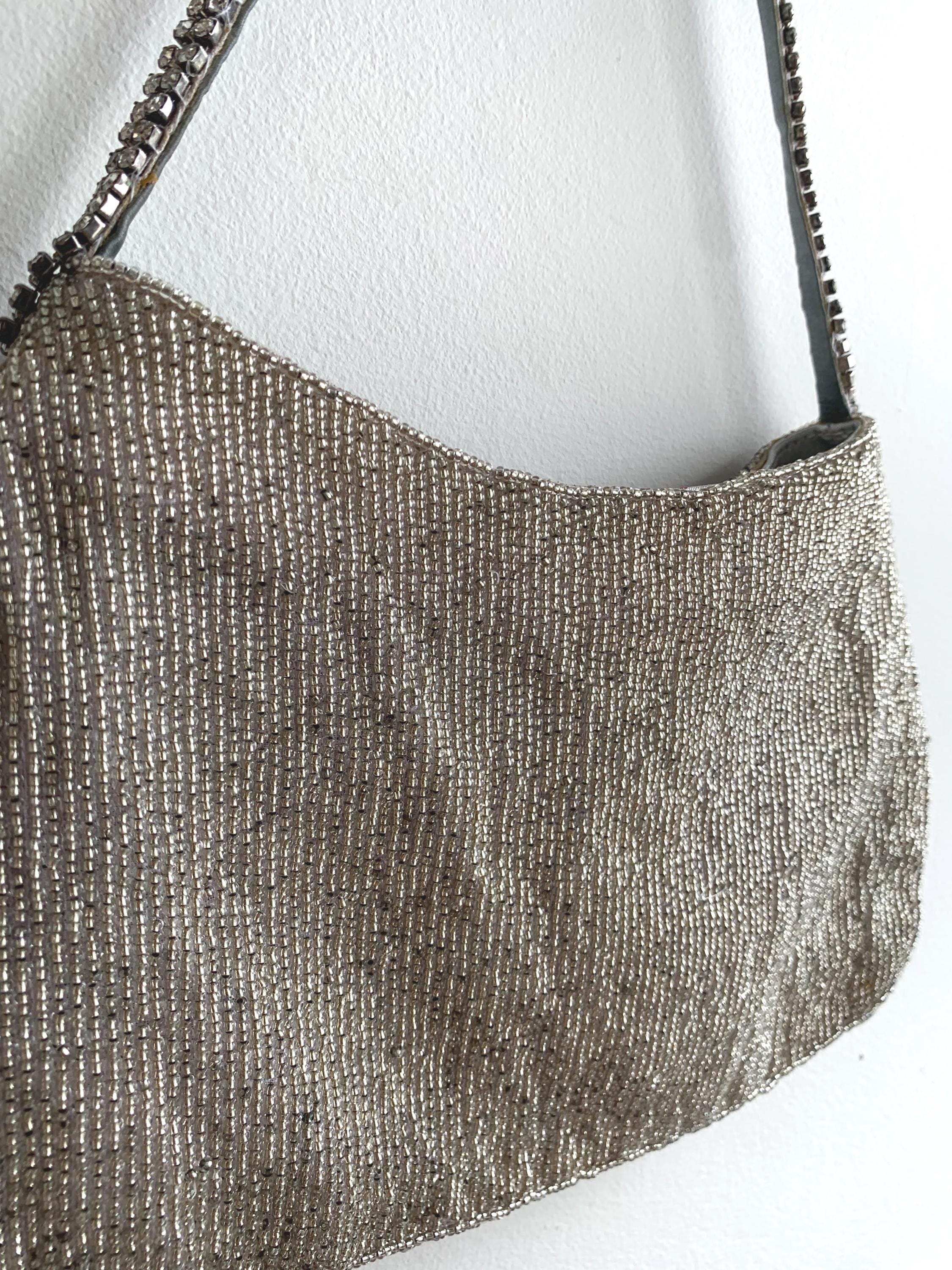 Make a dazzling entrance with this gorgeous vintage evening bag! This purse is completely covered in tiny, luminous silver seed beads that shimmer beautifully under the light. Adding to the glamour, it features exquisite accents of sparkling rhinestones along the top zipper closure and the short shoulder strap.