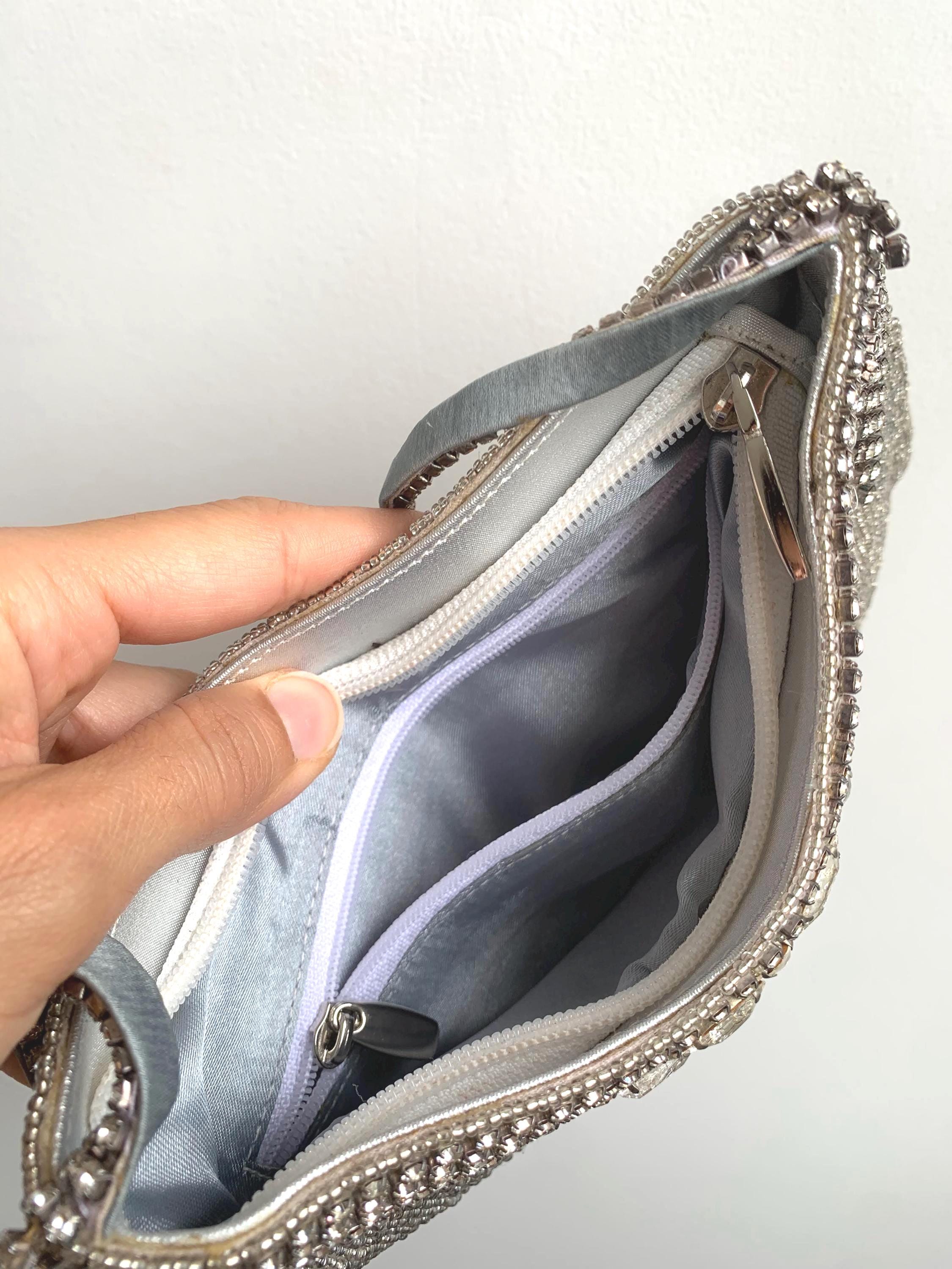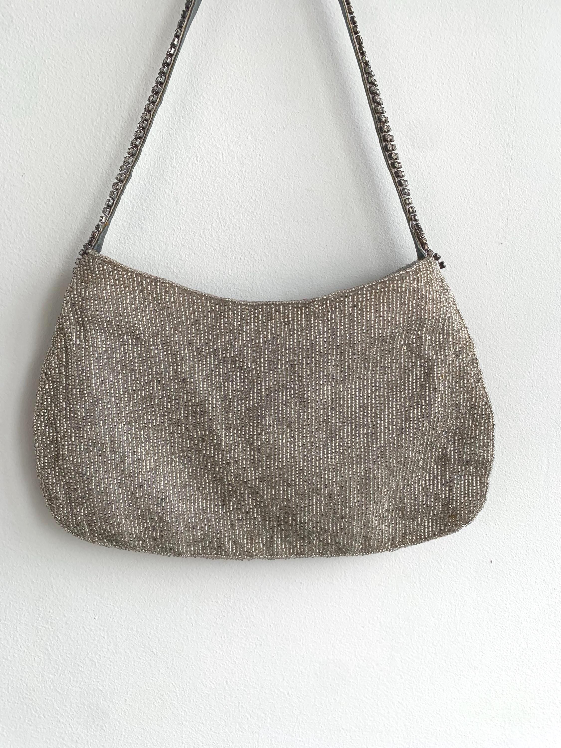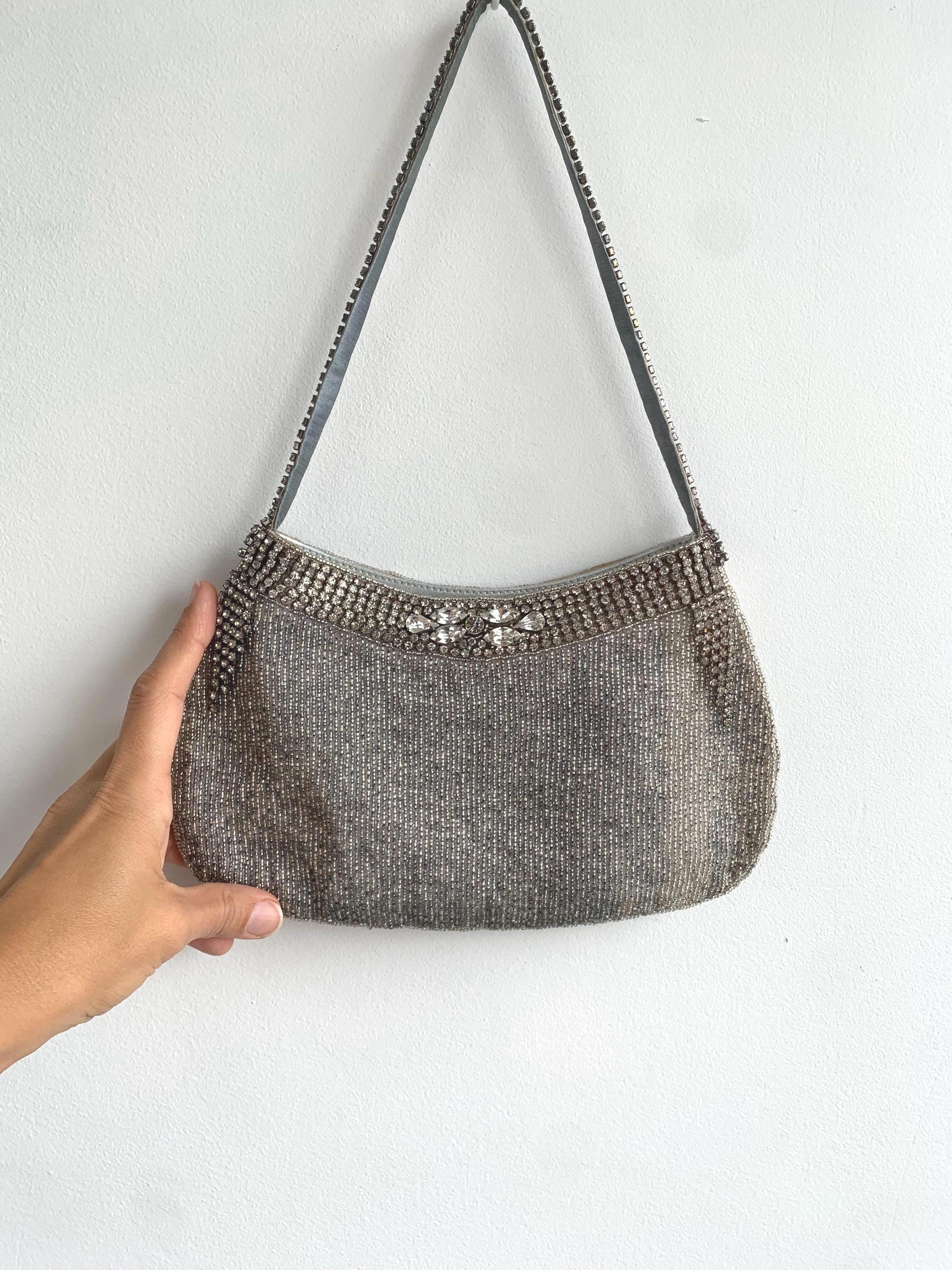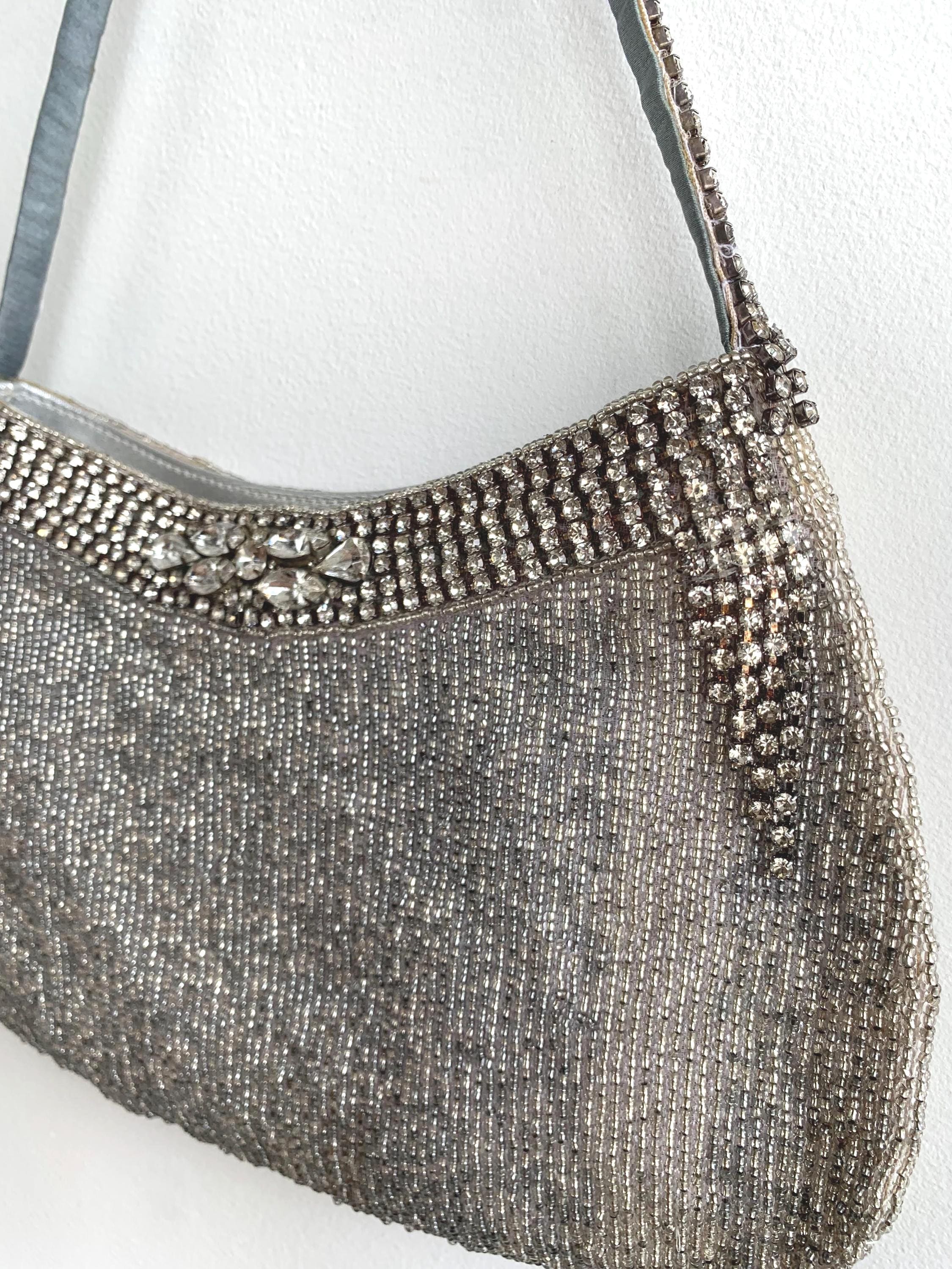 Make a dazzling entrance with this gorgeous vintage evening bag! This purse is completely covered in tiny, luminous silver seed beads that shimmer beautifully under the light. Adding to the glamour, it features exquisite accents of sparkling rhinestones along the top zipper closure and the short shoulder strap.
