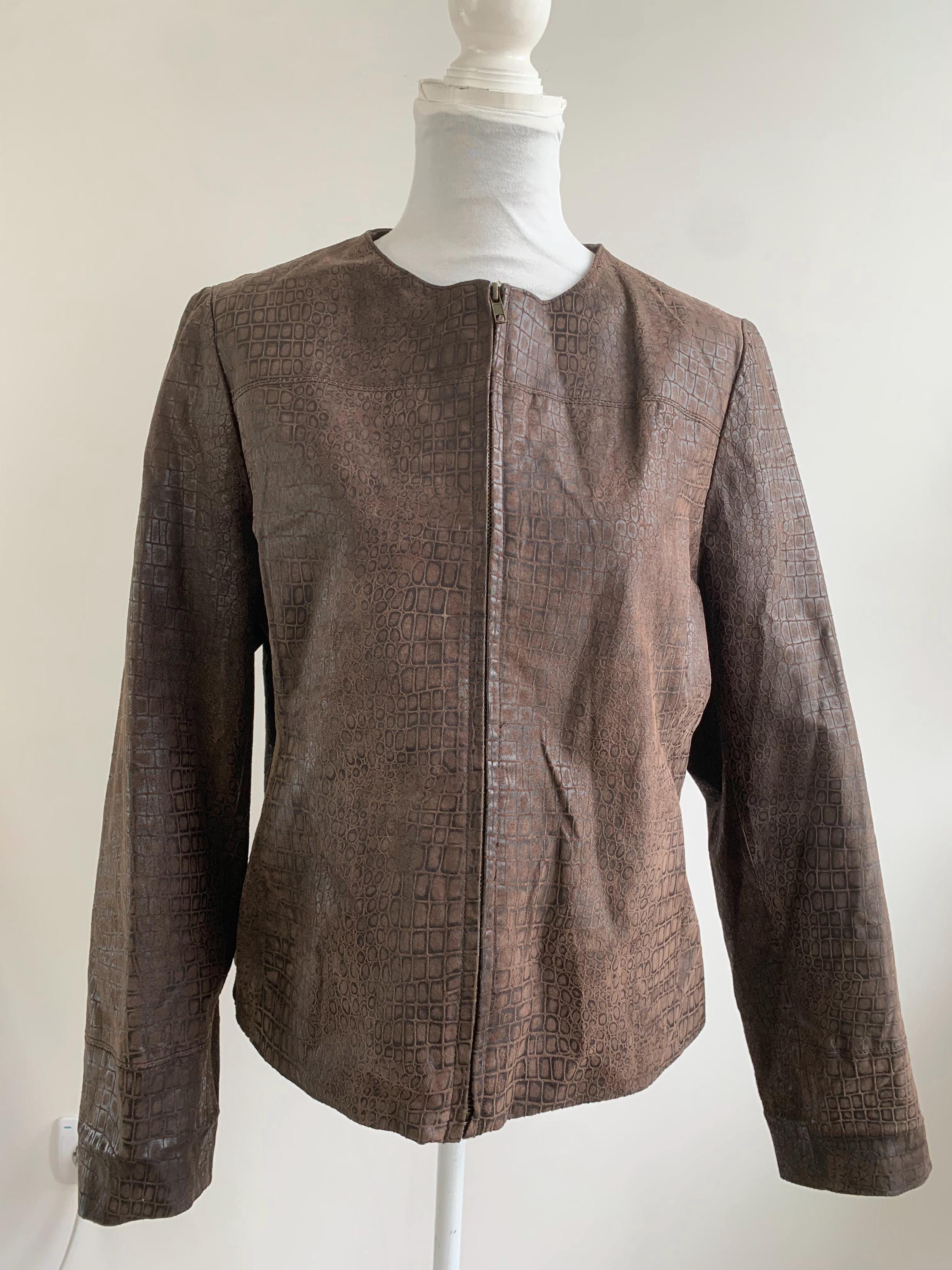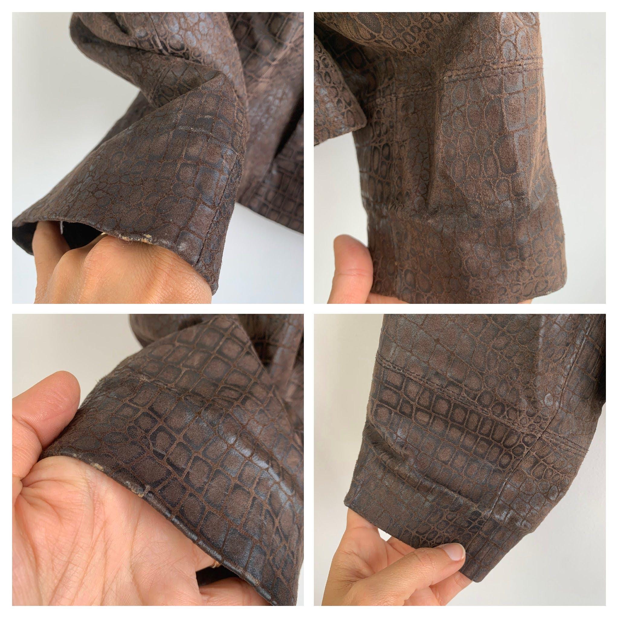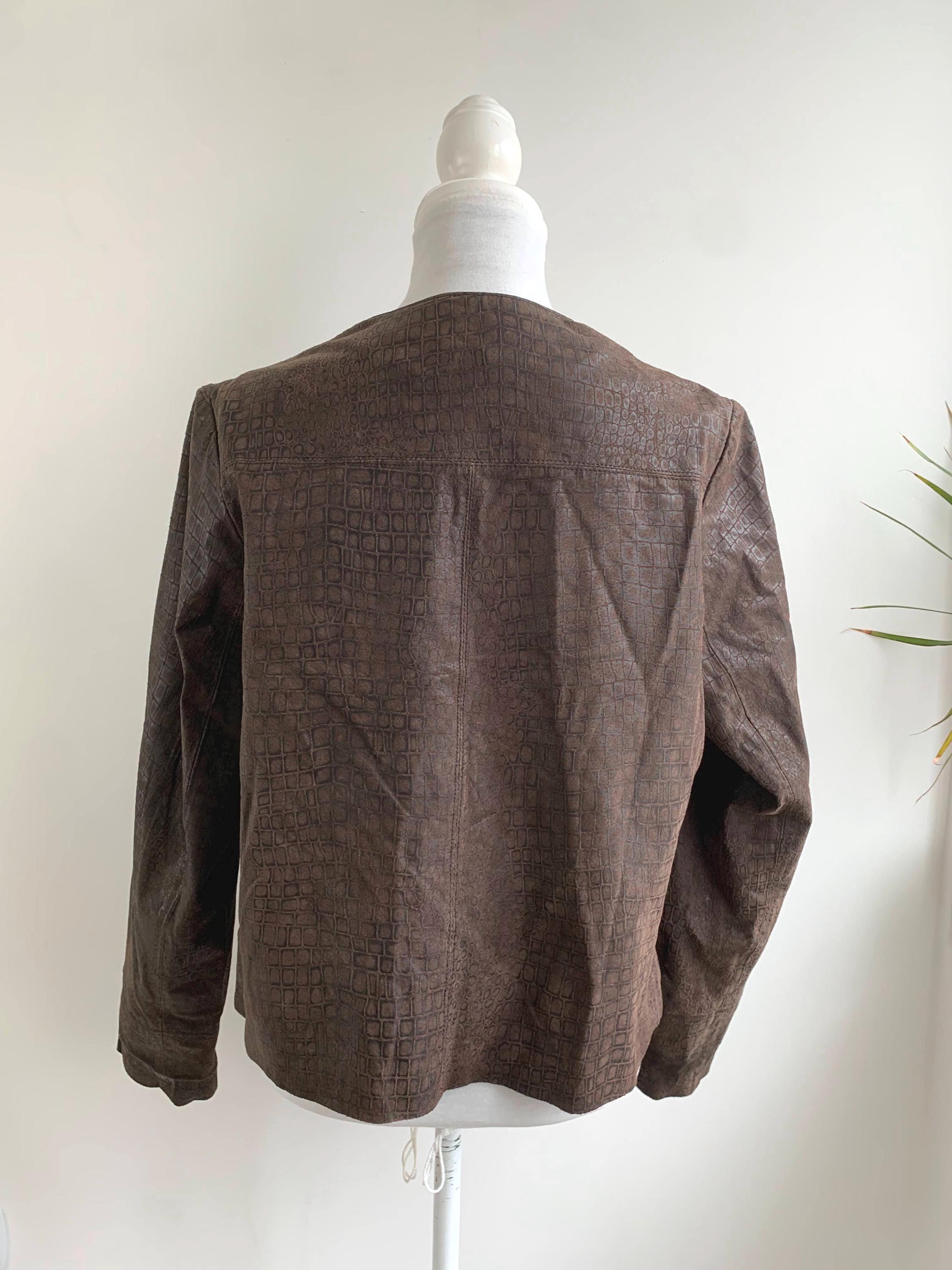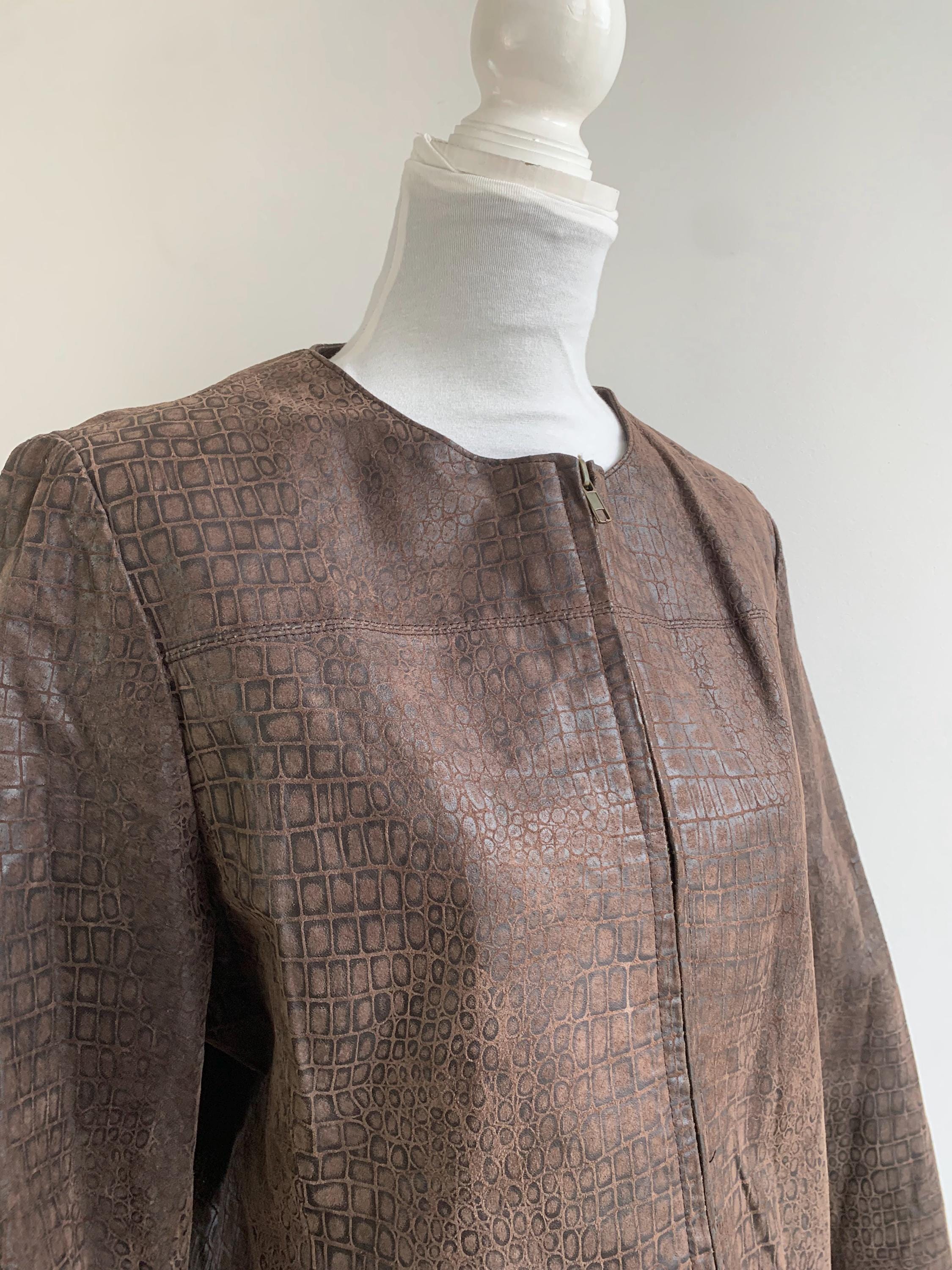 Add a touch of exotic flair to your wardrobe with this stylish vintage croc embossed leather jacket by Estelle in size XL. This eye-catching piece features a distinct crocodile embossed texture in a rich shade of brown, offering the luxurious look of reptile skin. It's a fantastic choice for those seeking unique, statement outerwear.