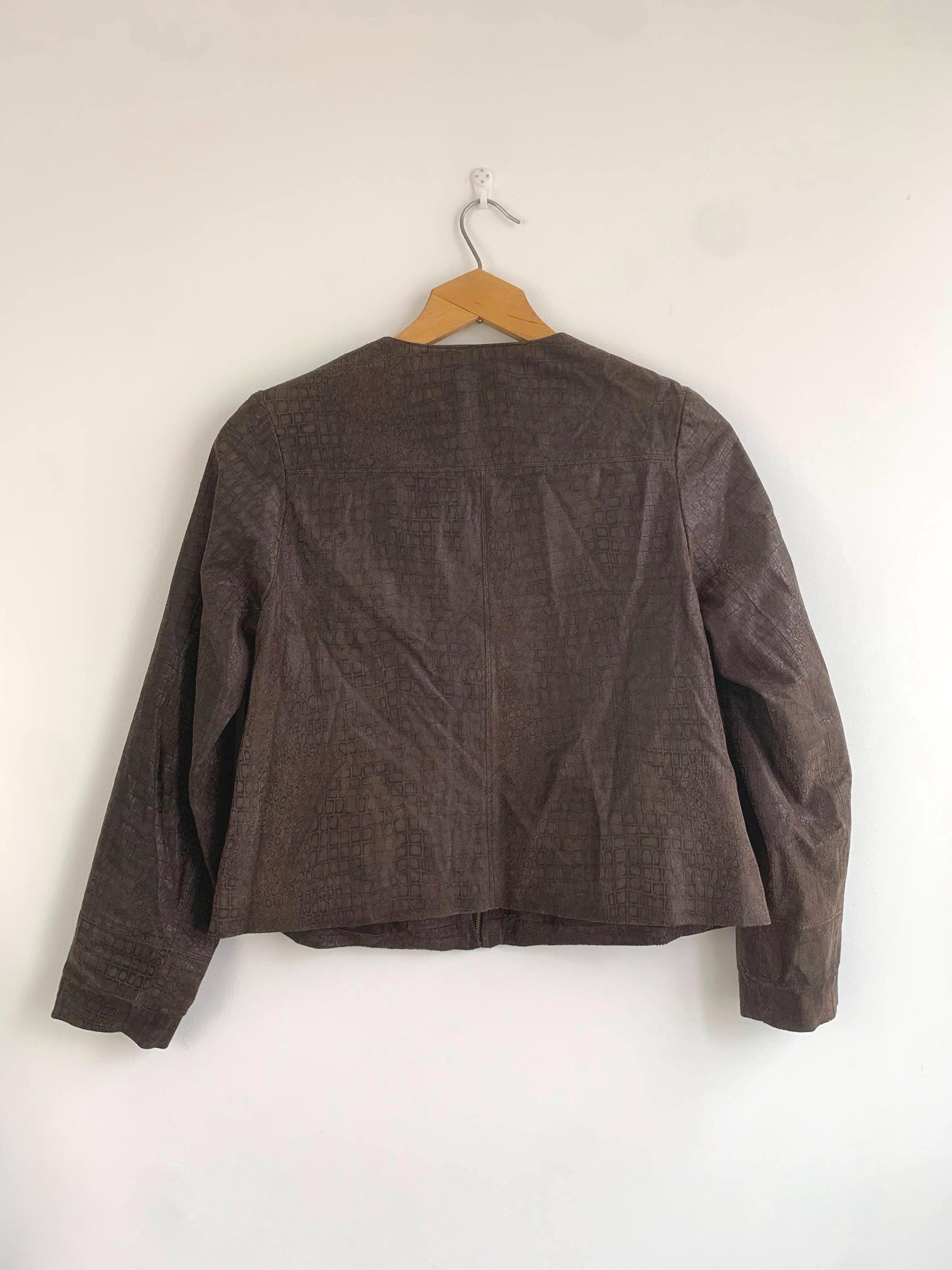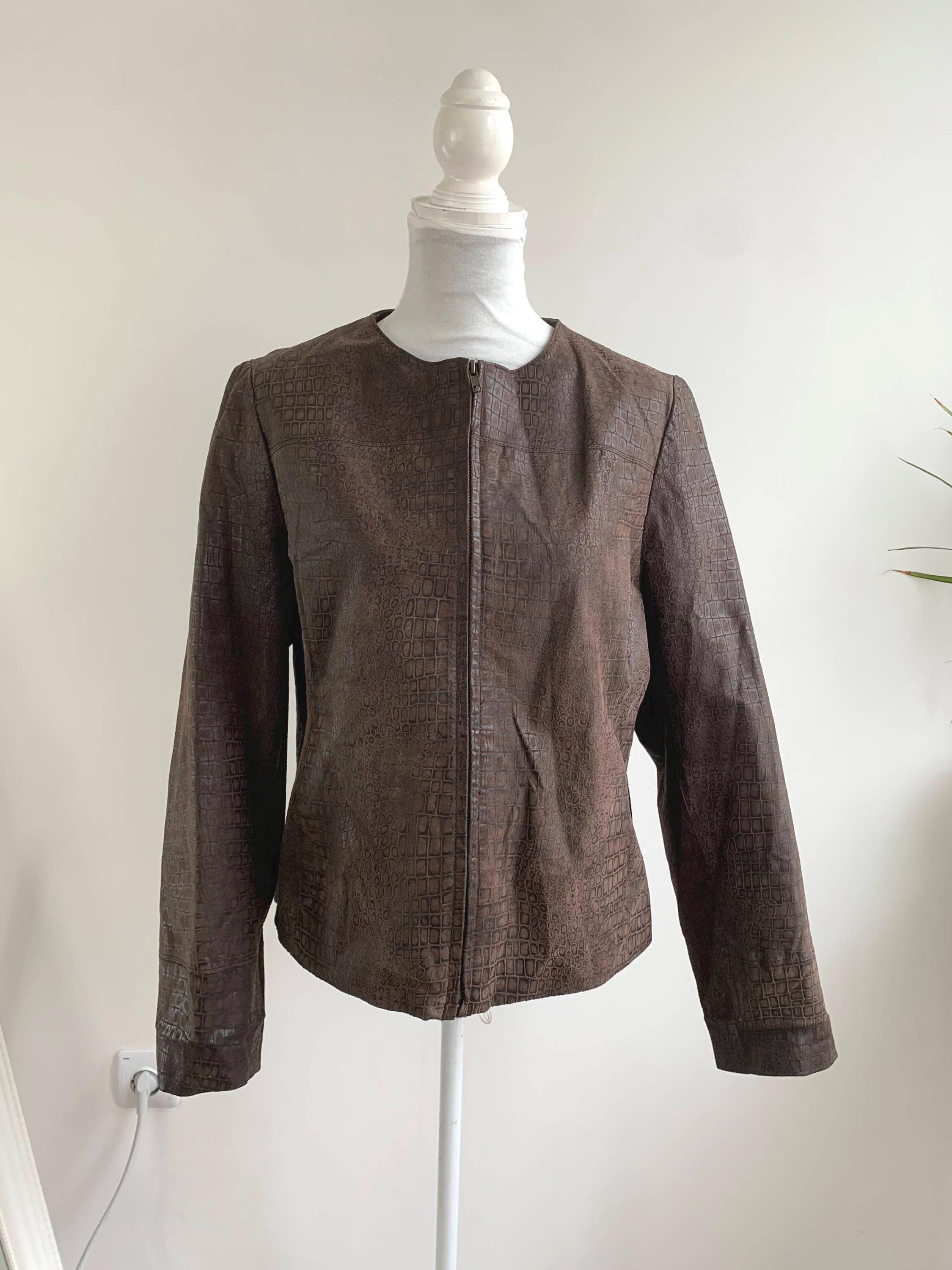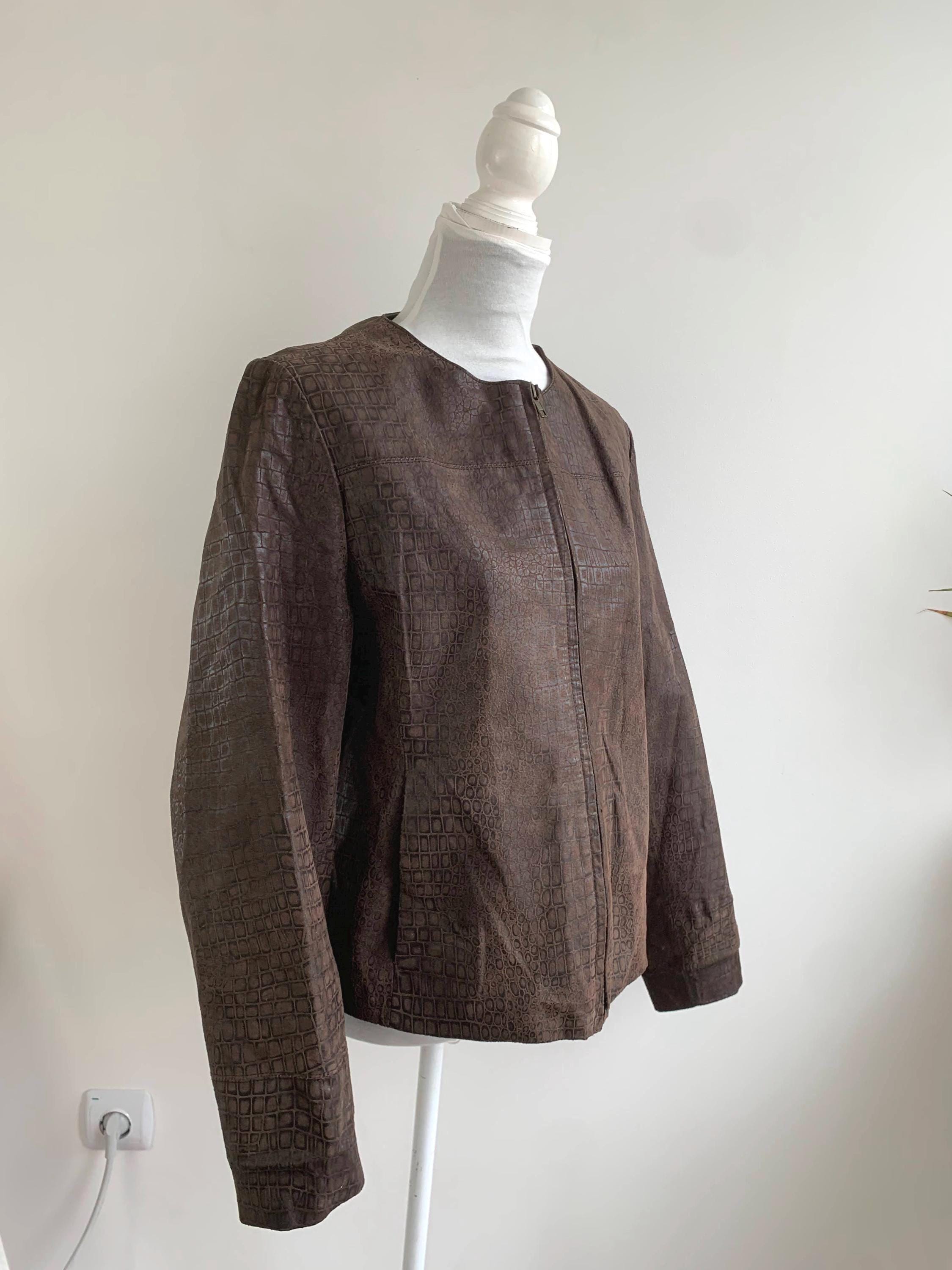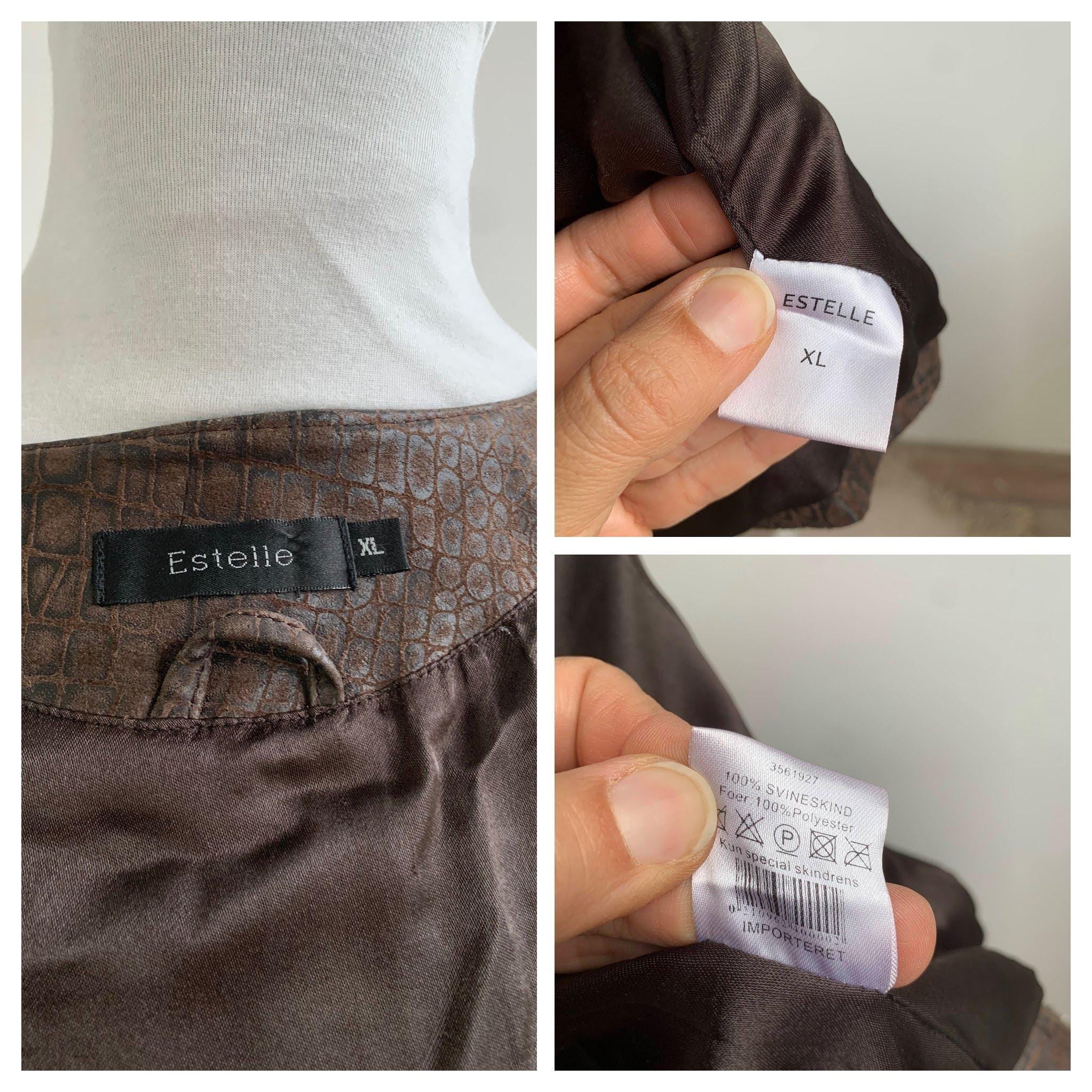 Add a touch of exotic flair to your wardrobe with this stylish vintage croc embossed leather jacket by Estelle in size XL. This eye-catching piece features a distinct crocodile embossed texture in a rich shade of brown, offering the luxurious look of reptile skin. It's a fantastic choice for those seeking unique, statement outerwear.