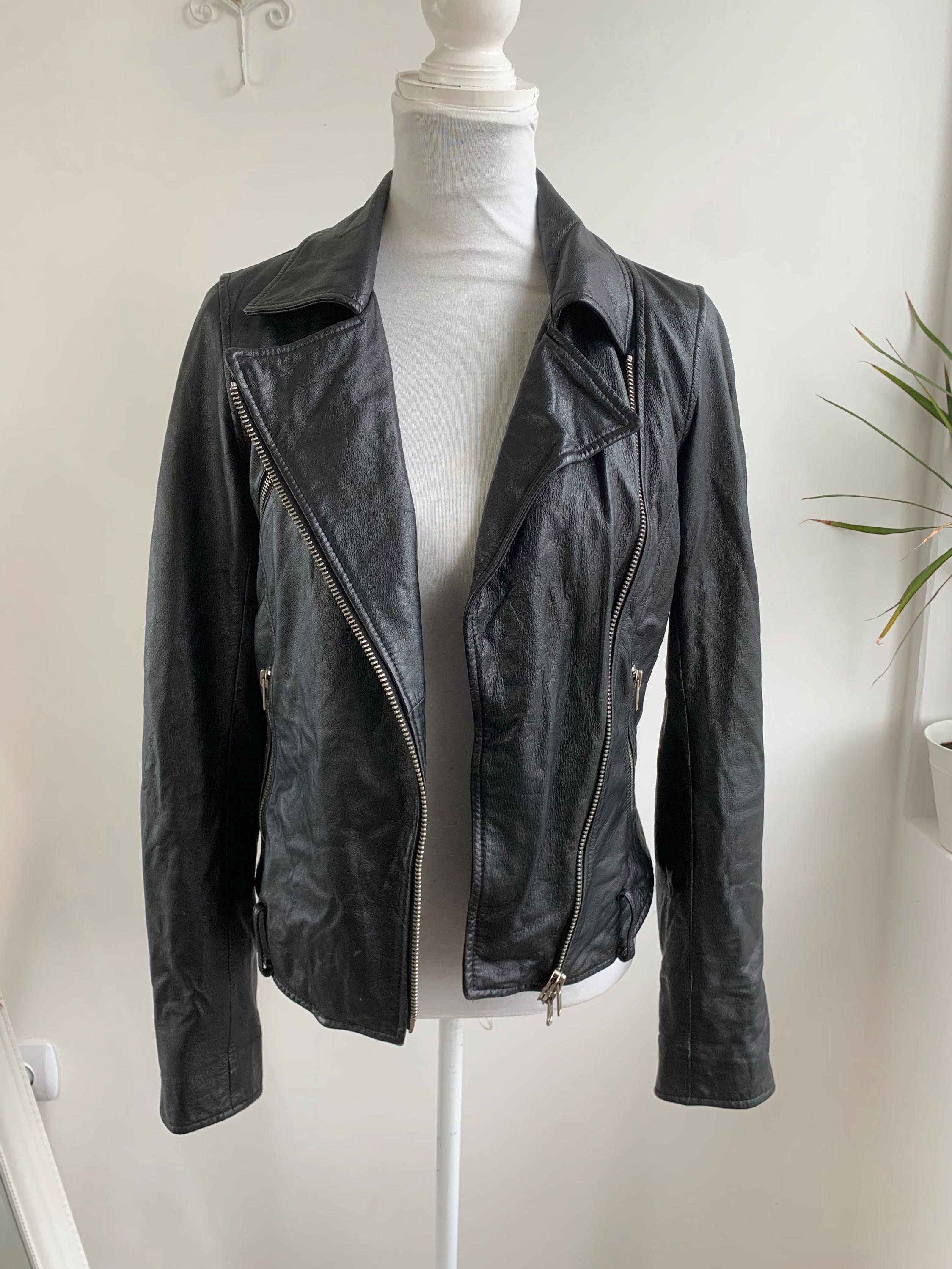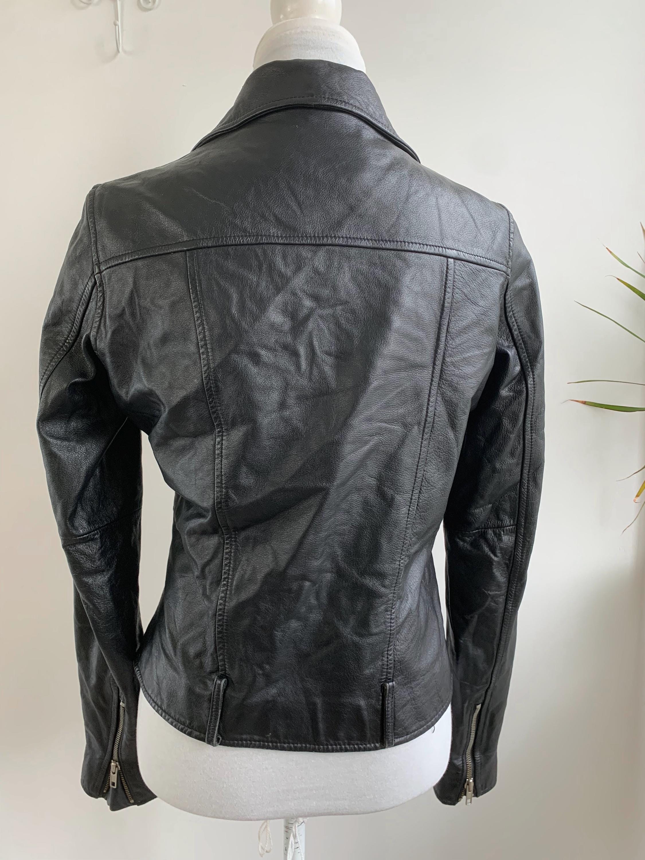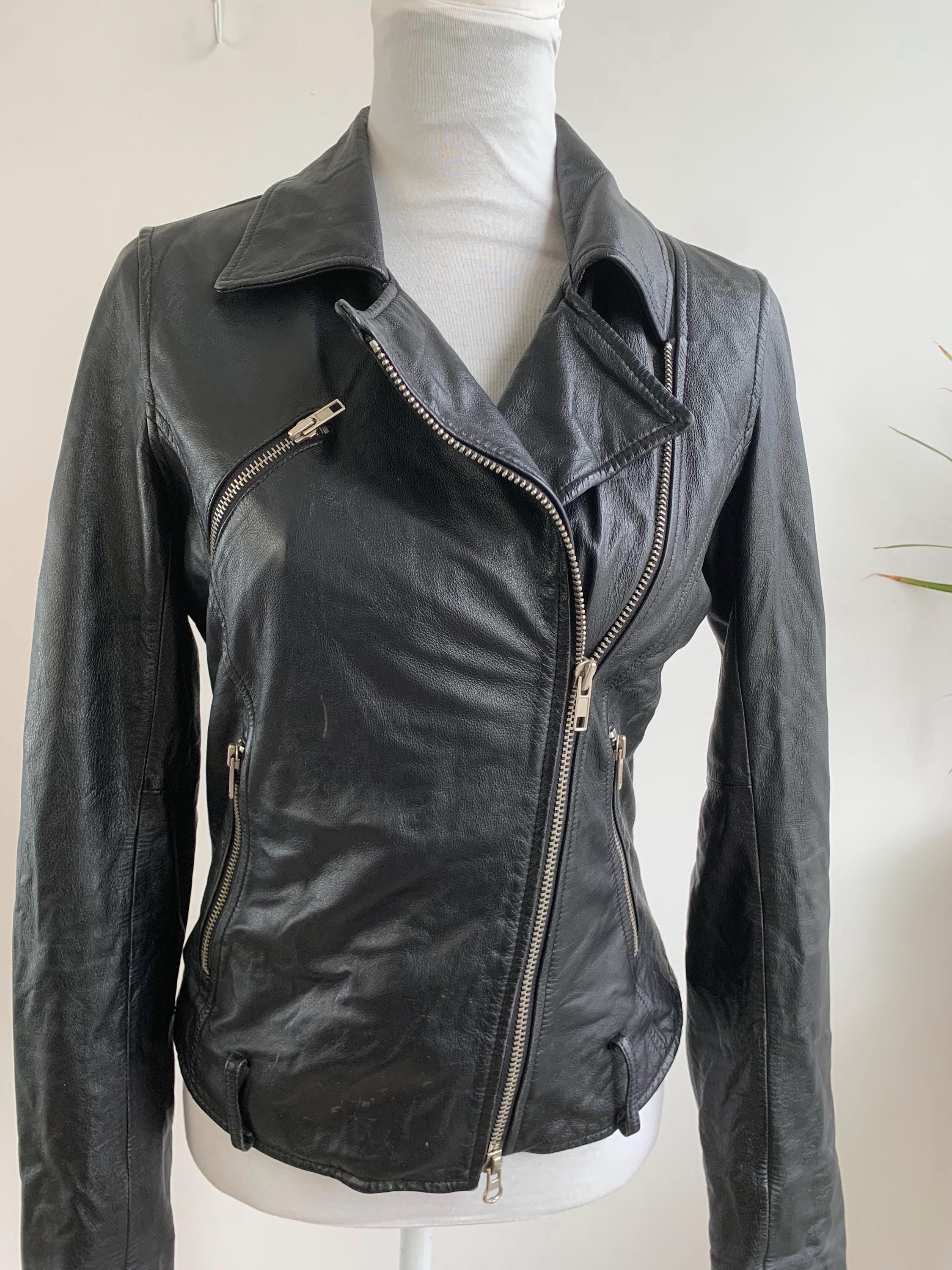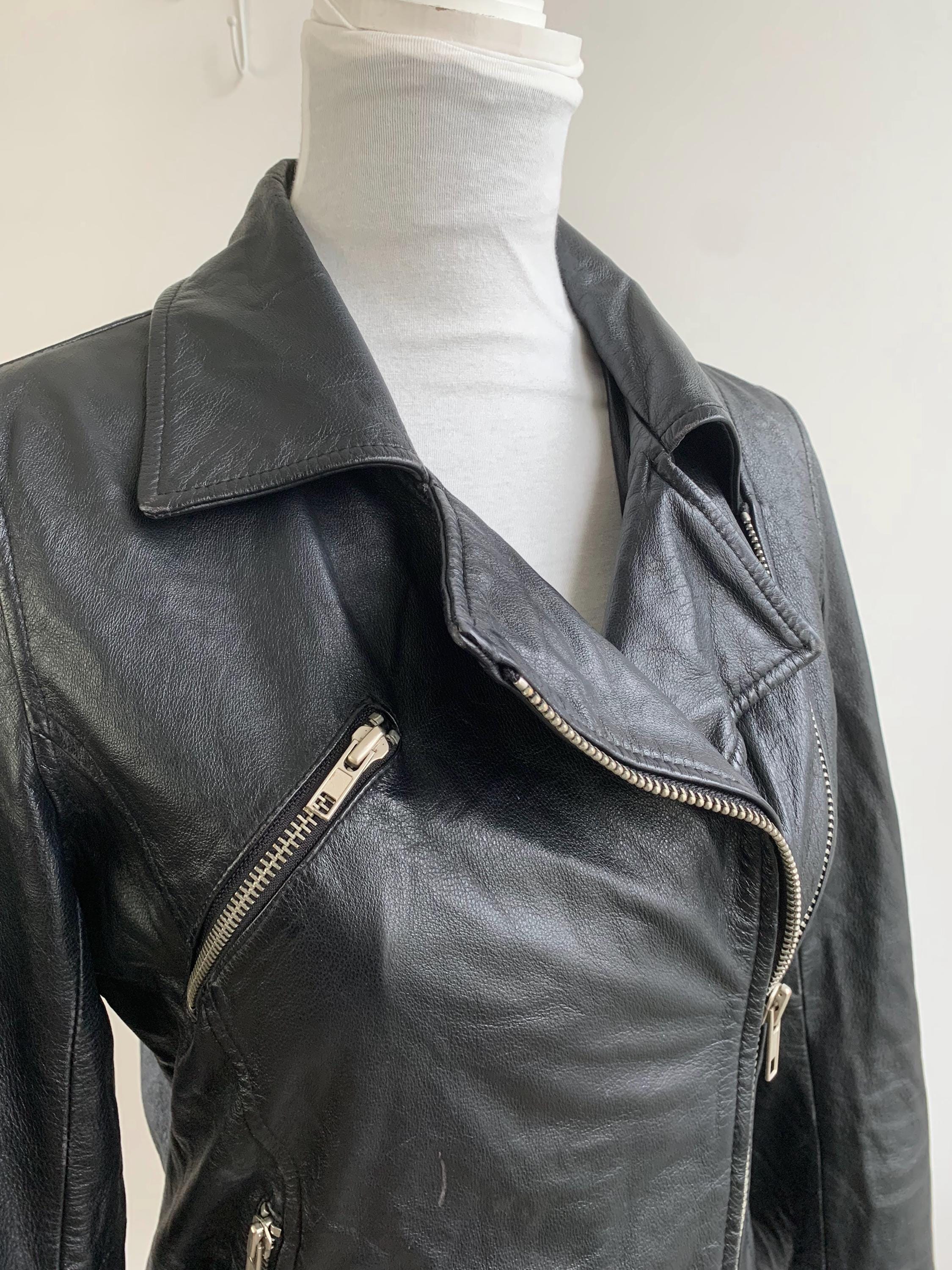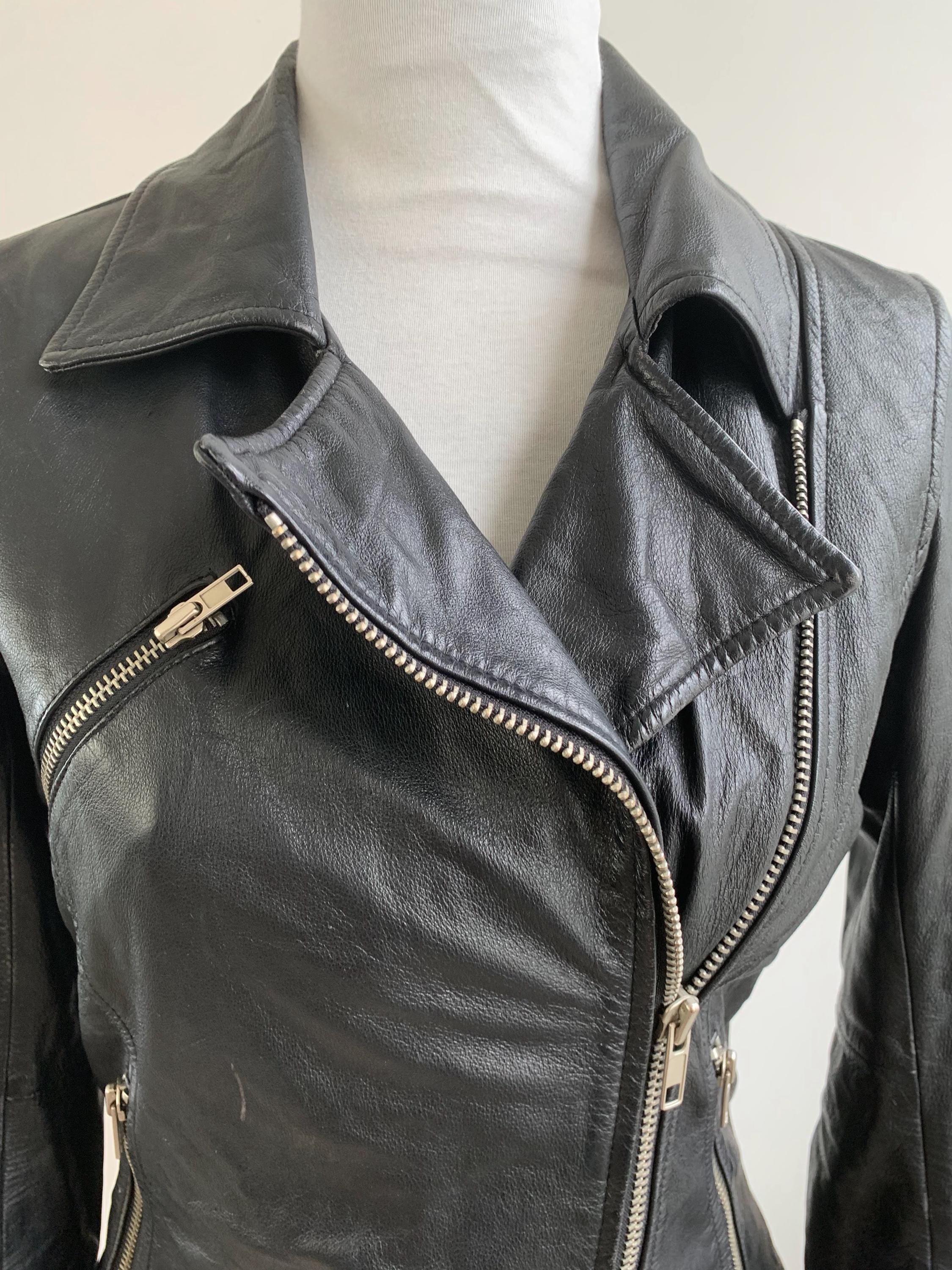It features the classic asymmetrical front zipper closure that defines the biker style, alongside a stylish notched lapel collar. Silver-tone hardware, including multiple functional zippers on the pockets and cuffs, adds to its authentic, edgy appeal. The fitted silhouette with thoughtful seam detailing ensures a flattering look that never goes out of style.