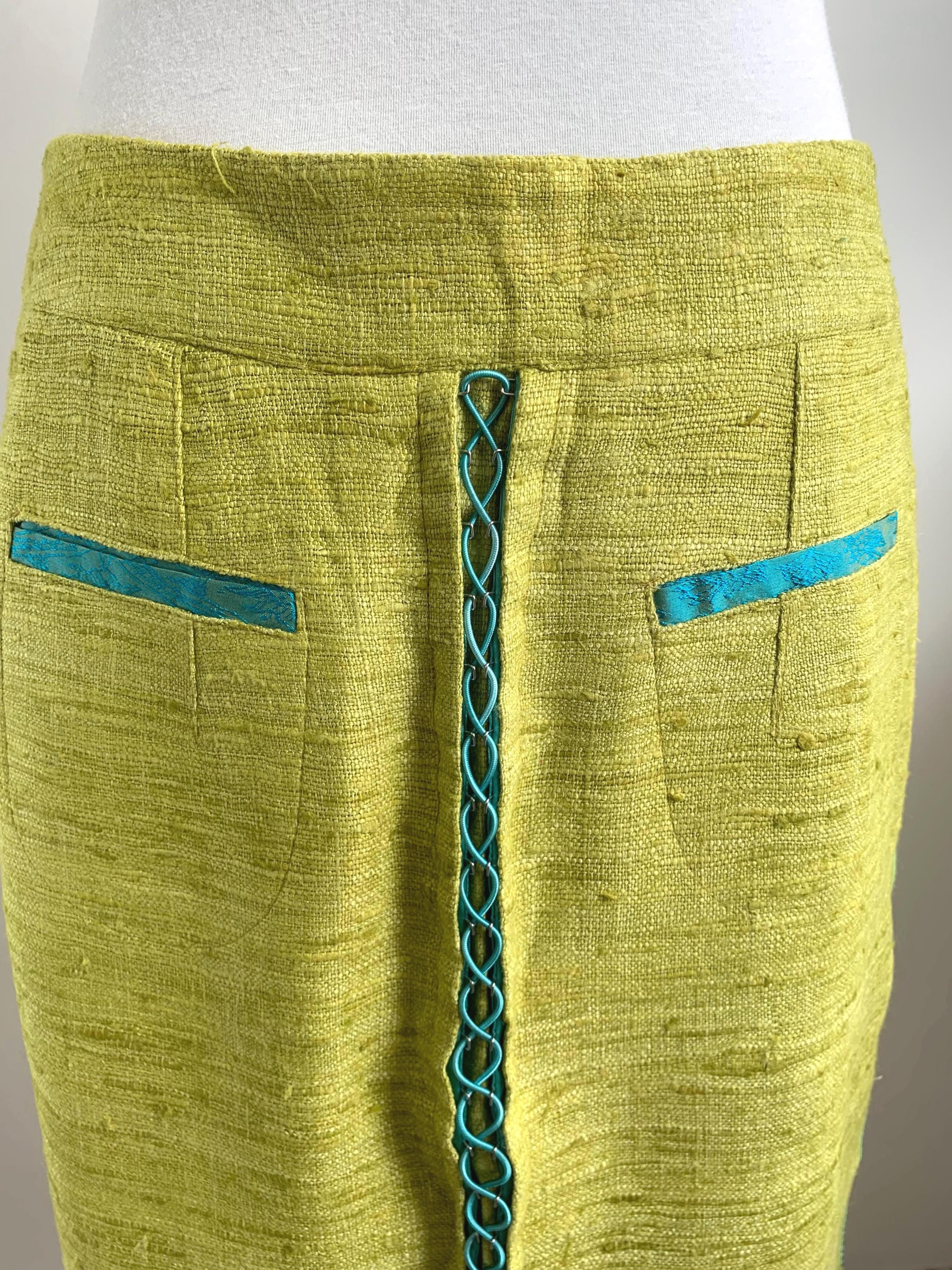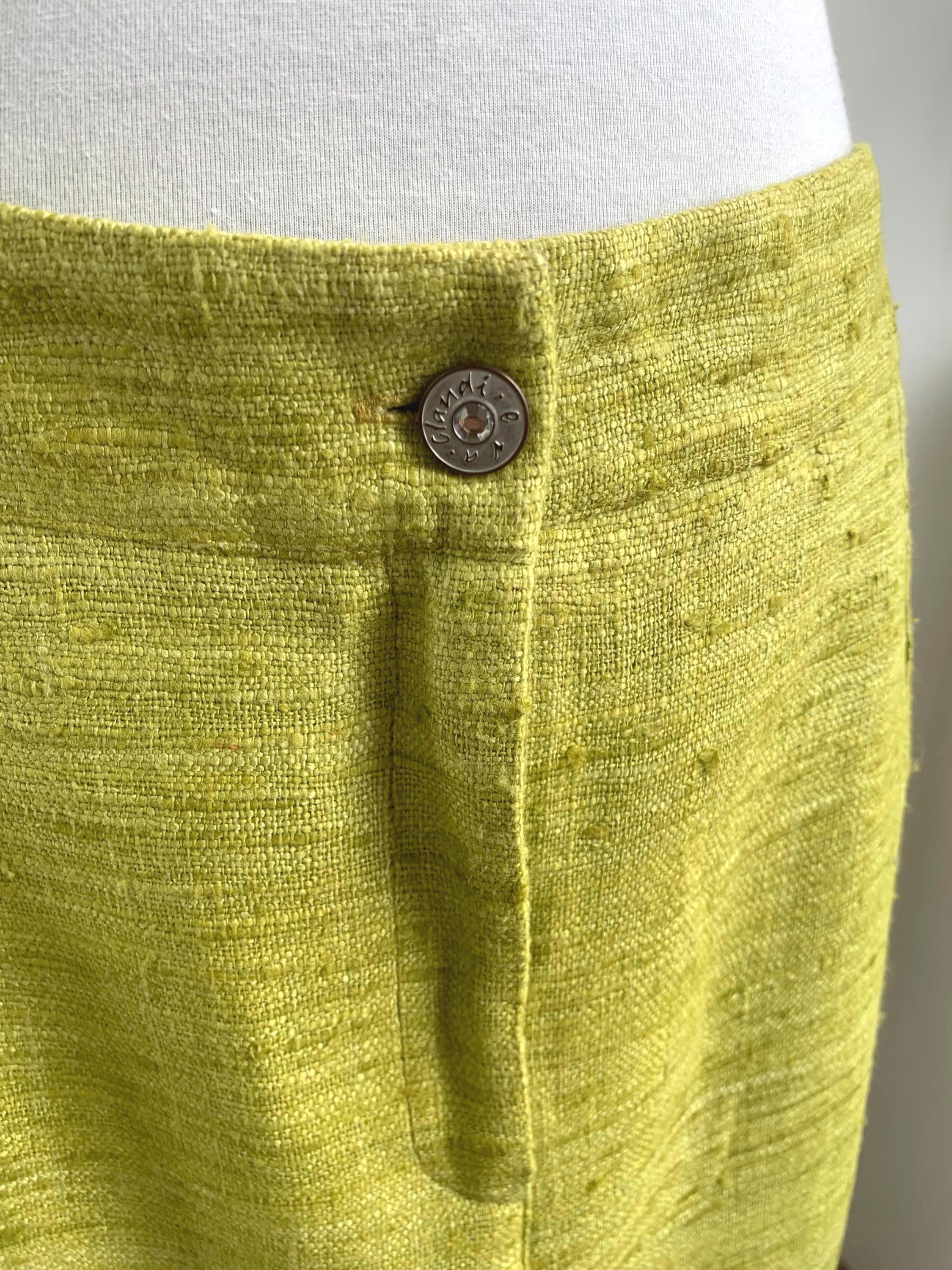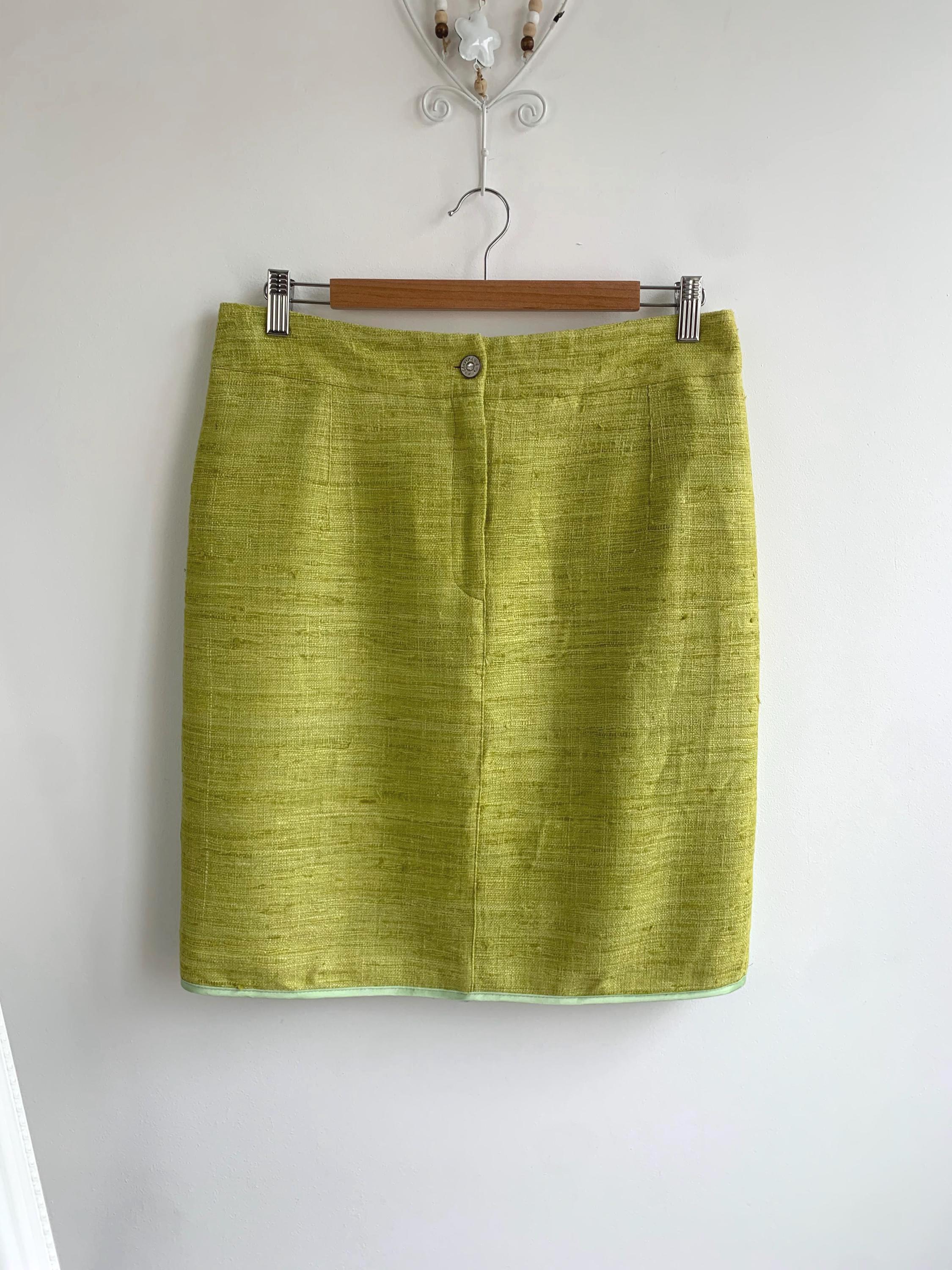 Make a vibrant statement with this incredible vintage skirt by Eva & Claudi! This unique piece boasts a stunning lime green hue in a textured silk blend tweed fabric, offering both luxury and a playful retro vibe. The fabric's subtle shimmer and tactile quality ensure you'll stand out from the crowd.