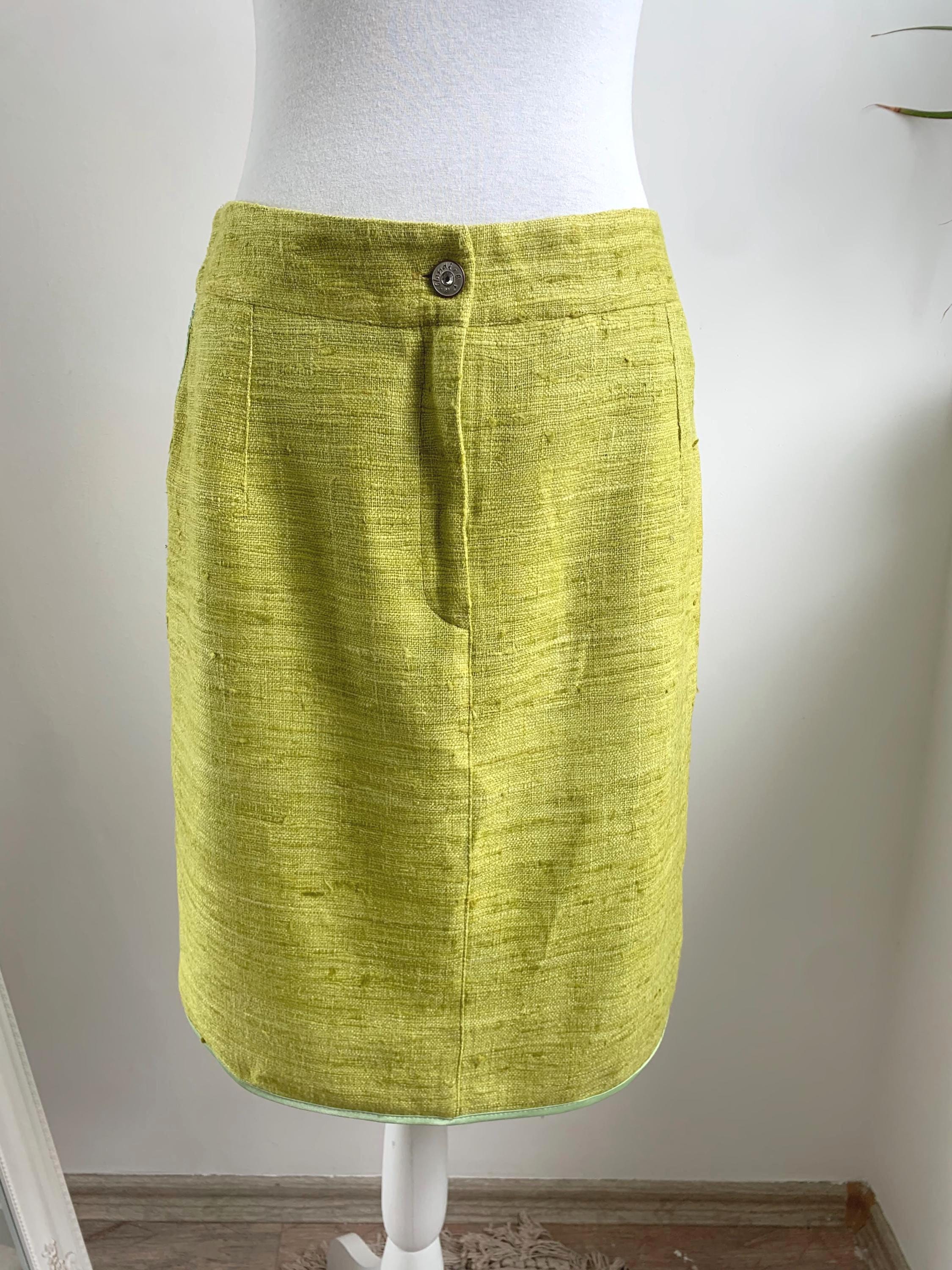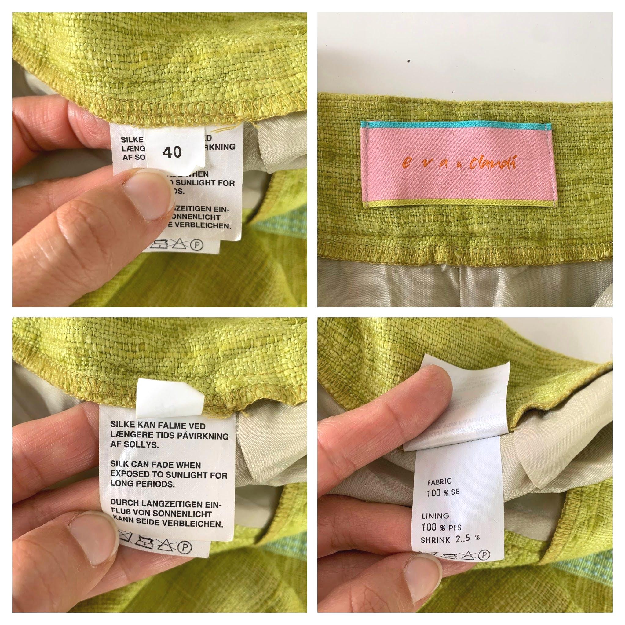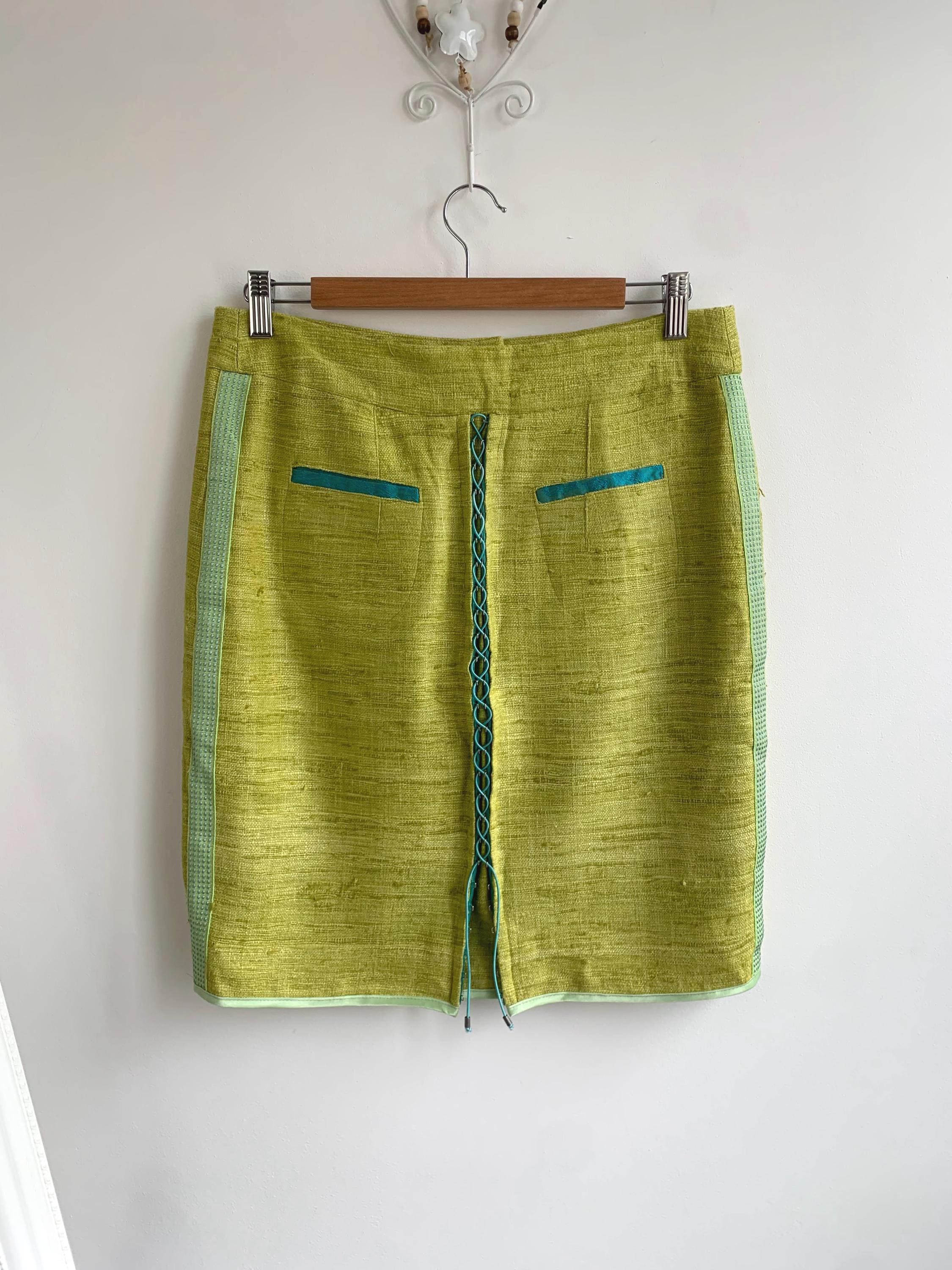 Make a vibrant statement with this incredible vintage skirt by Eva & Claudi! This unique piece boasts a stunning lime green hue in a textured silk blend tweed fabric, offering both luxury and a playful retro vibe. The fabric's subtle shimmer and tactile quality ensure you'll stand out from the crowd.