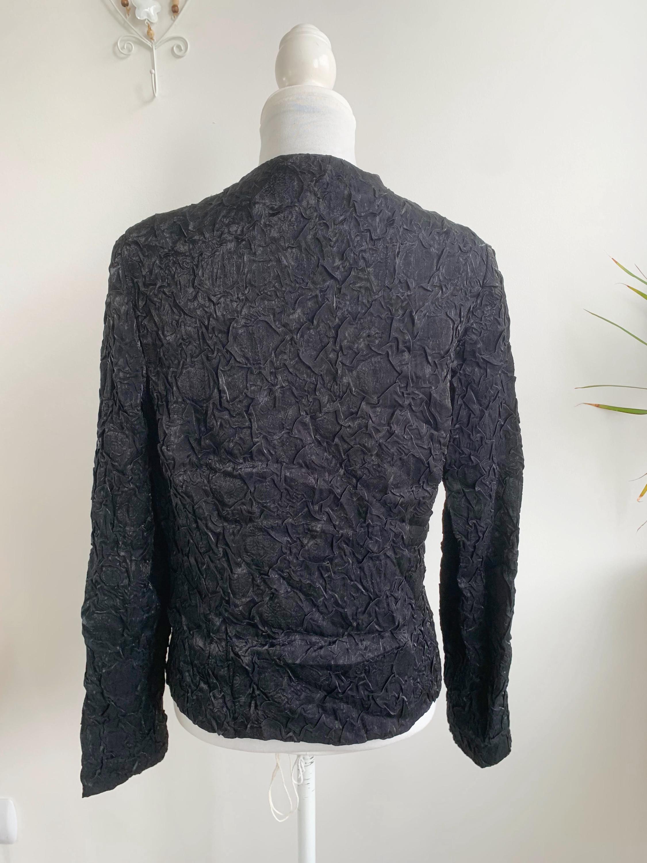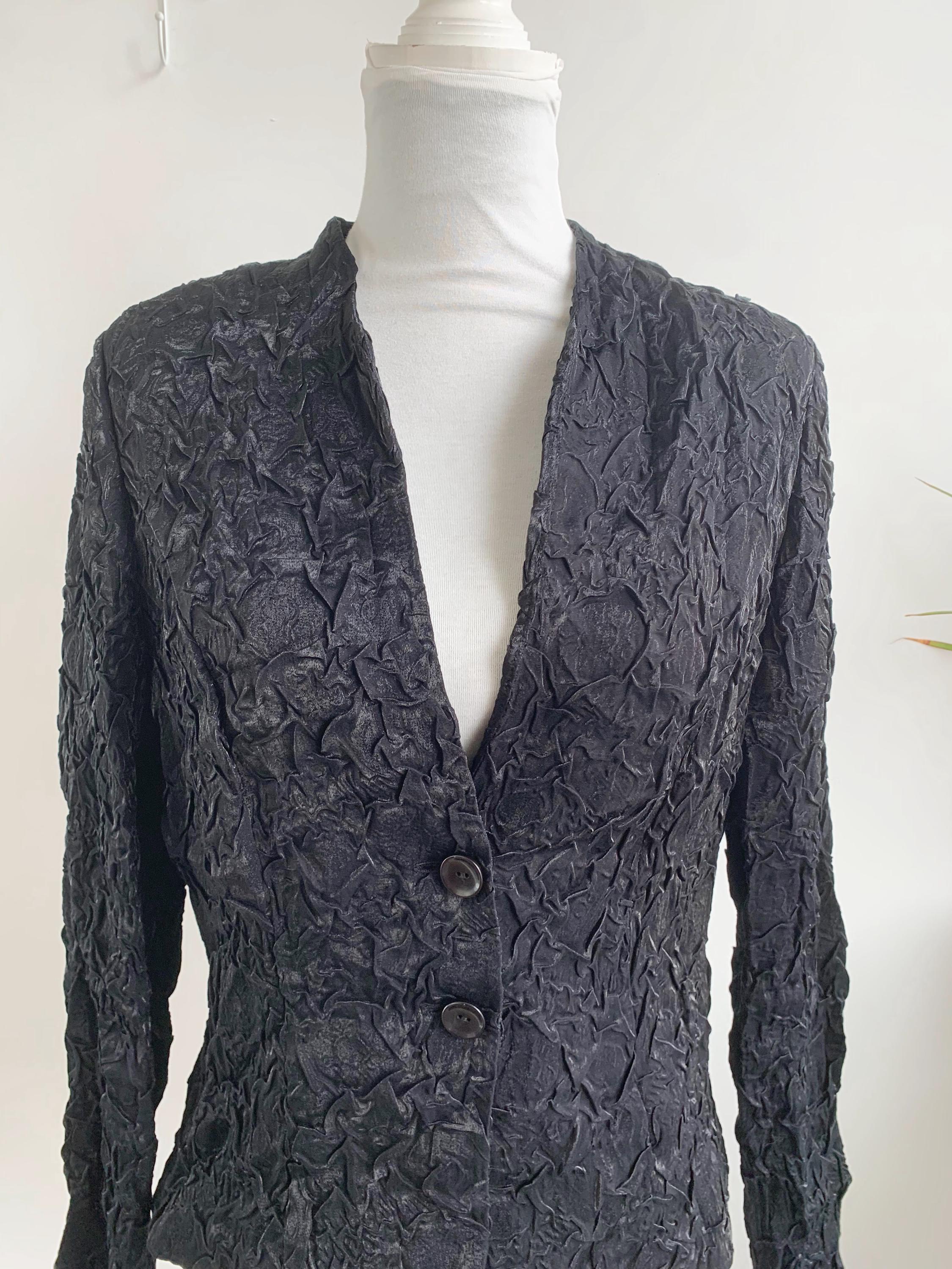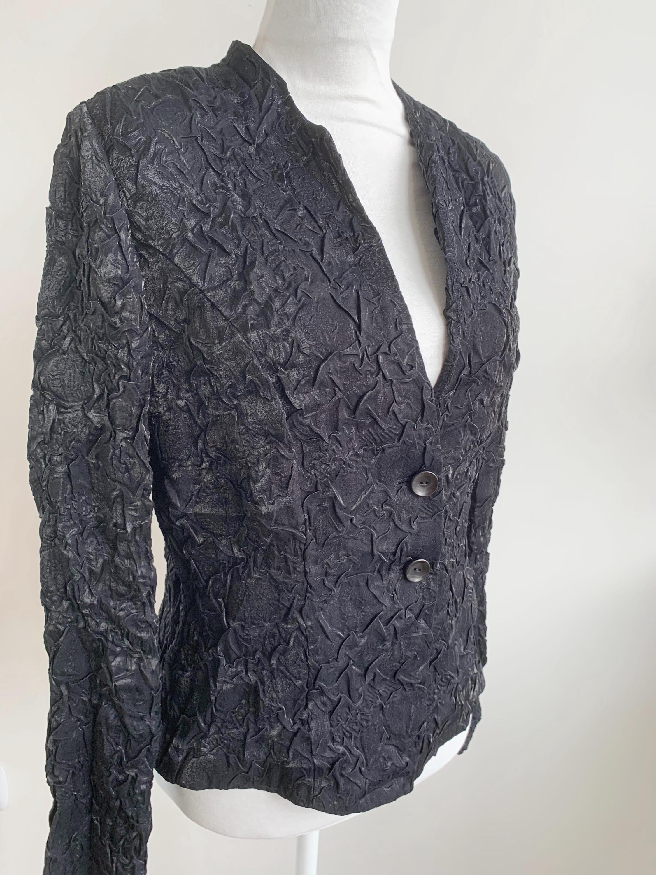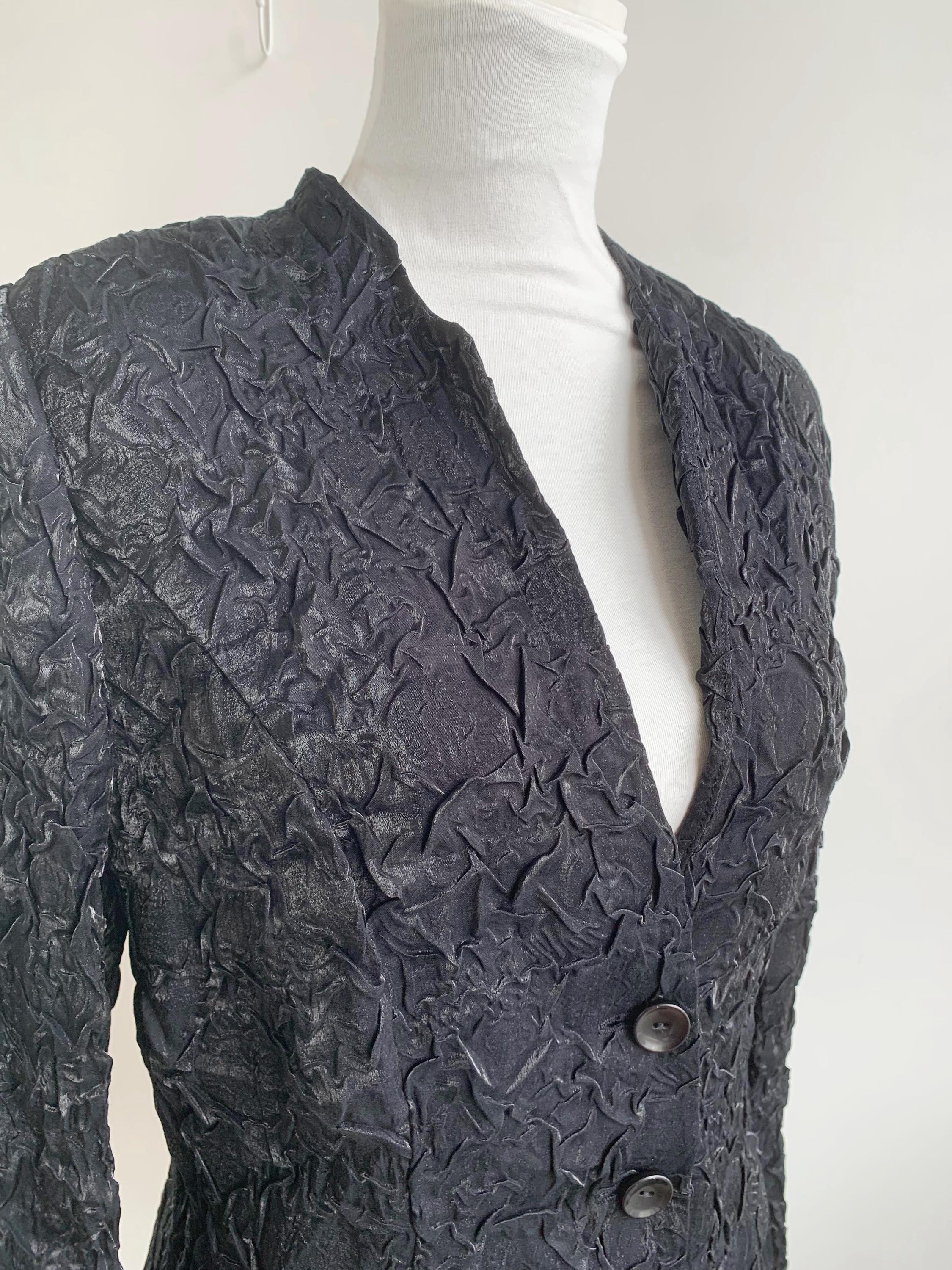 The entire garment is crafted from a unique, permanently crinkled or textured fabric, which gives it a sculptural, almost bark-like finish. This texture provides a subtle sheen that catches the light beautifully, making it an excellent choice for evening wear or a cocktail jacket.