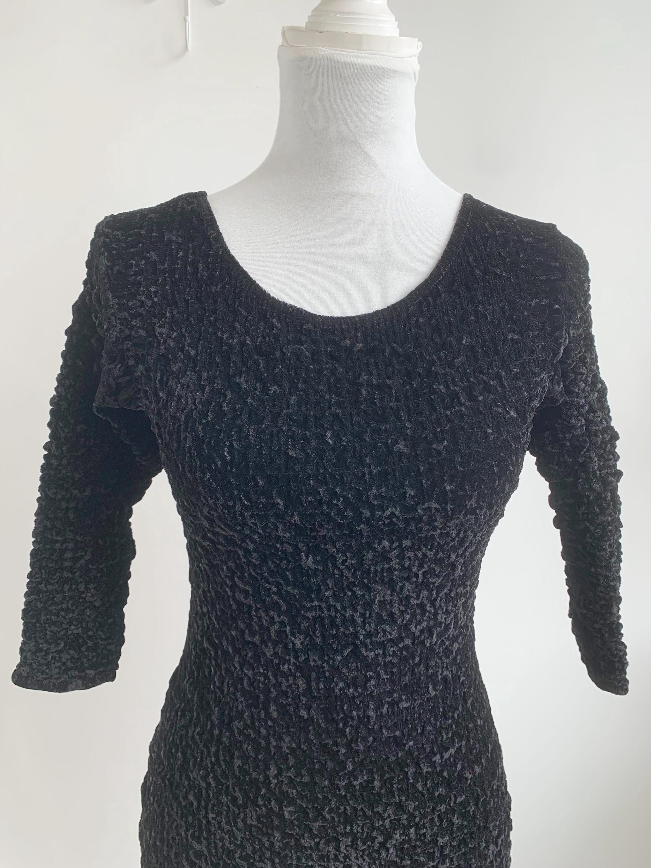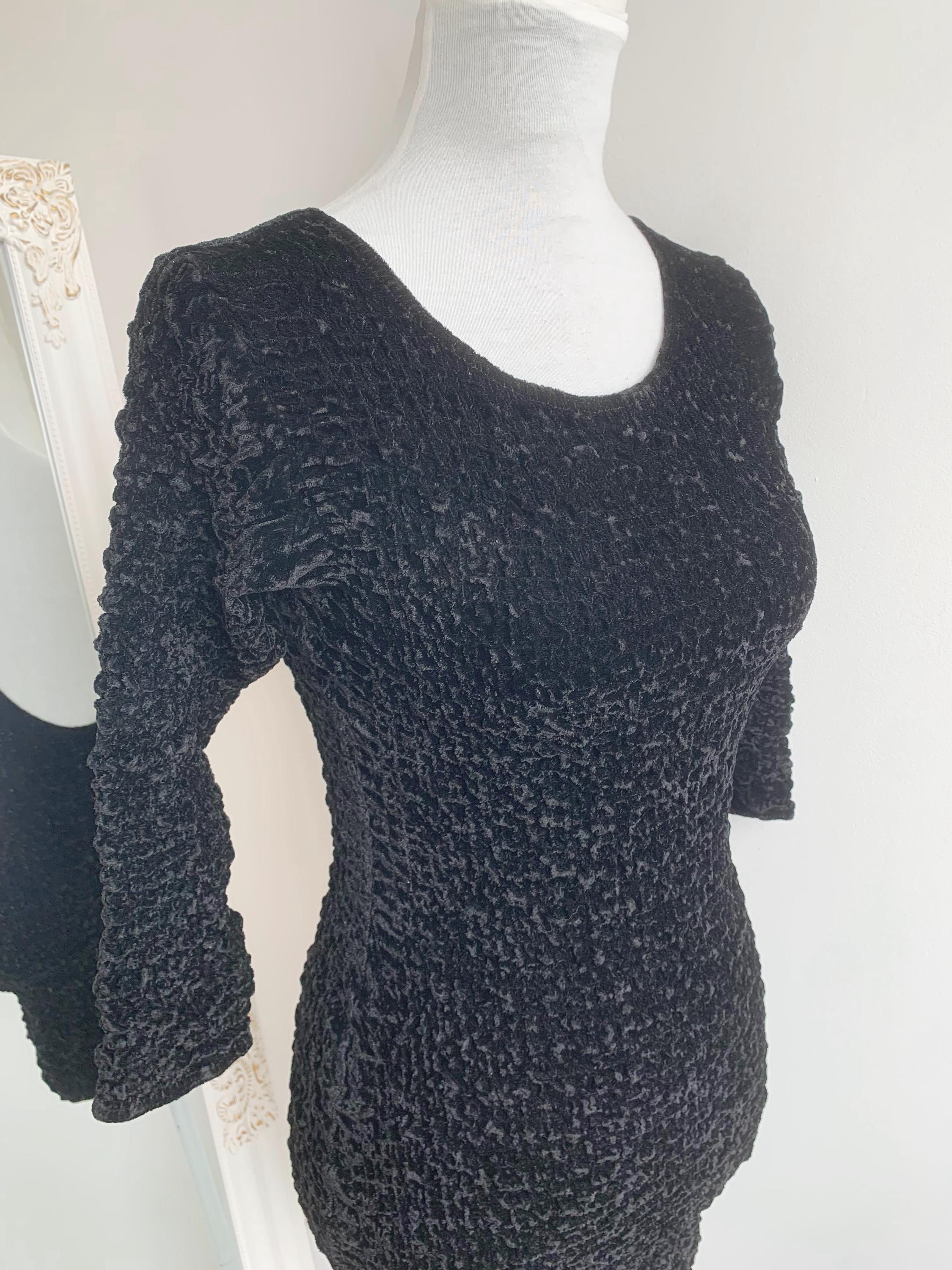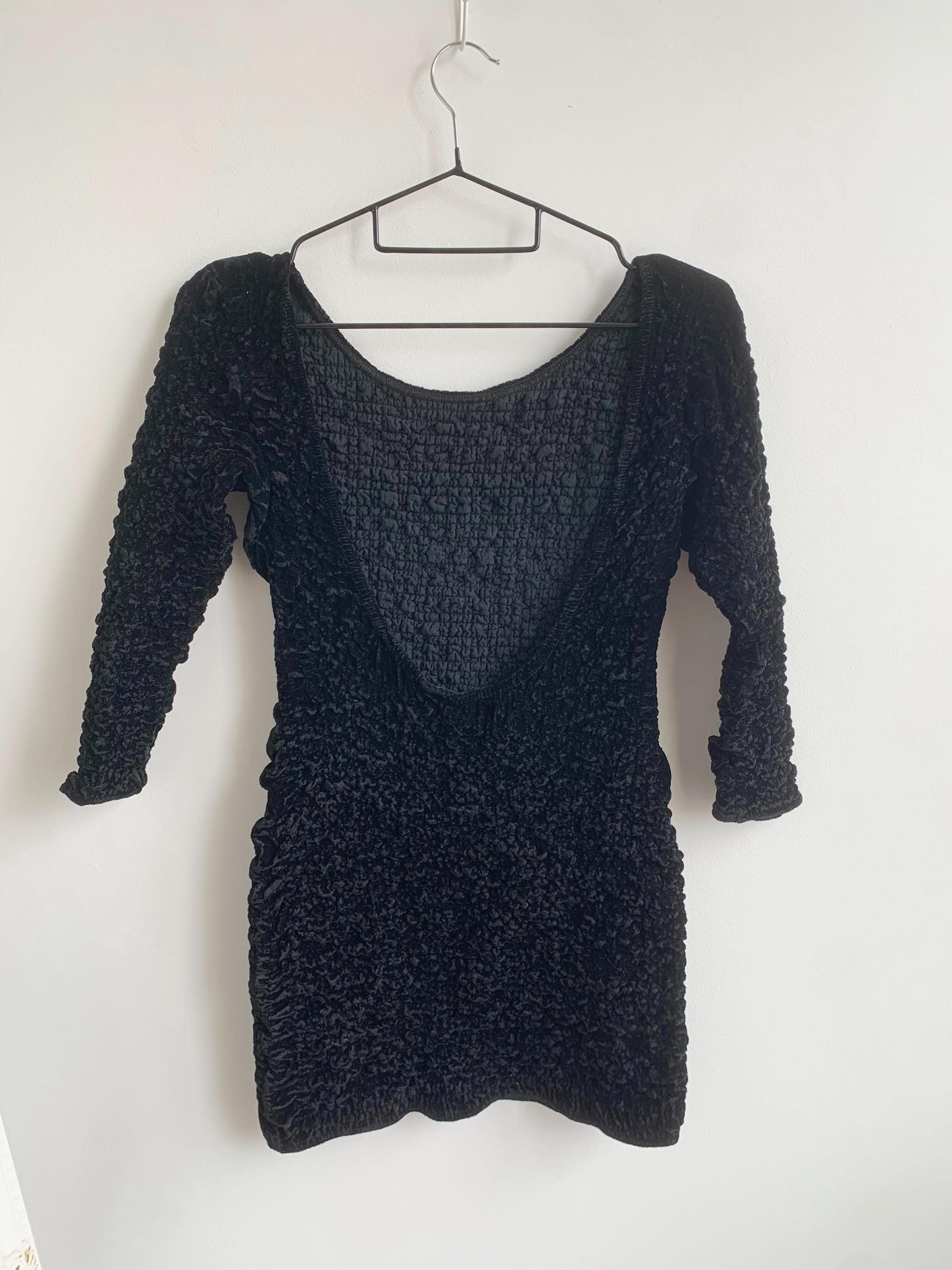 Step out in this stunning vintage black velvet mini dress by Isabel Martin Paris, an iconic piece that perfectly captures the bold glamour of the late 80s and early 90s fashion. This unique stretch texture dress features an all-over crinkle velvet (or "popcorn") texture that is incredibly tactile and flattering. The classic scoop neck and three-quarter sleeves give it a chic silhouette, while the dramatic open back adds a provocative, yet elegant, twist —making it an ideal party dress or a perfect choice for a night out. Its remarkable stretch fabric allows this versatile piece to fit a range of sizes beautifully. A true head-turner and a testament to high-quality vintage apparel.