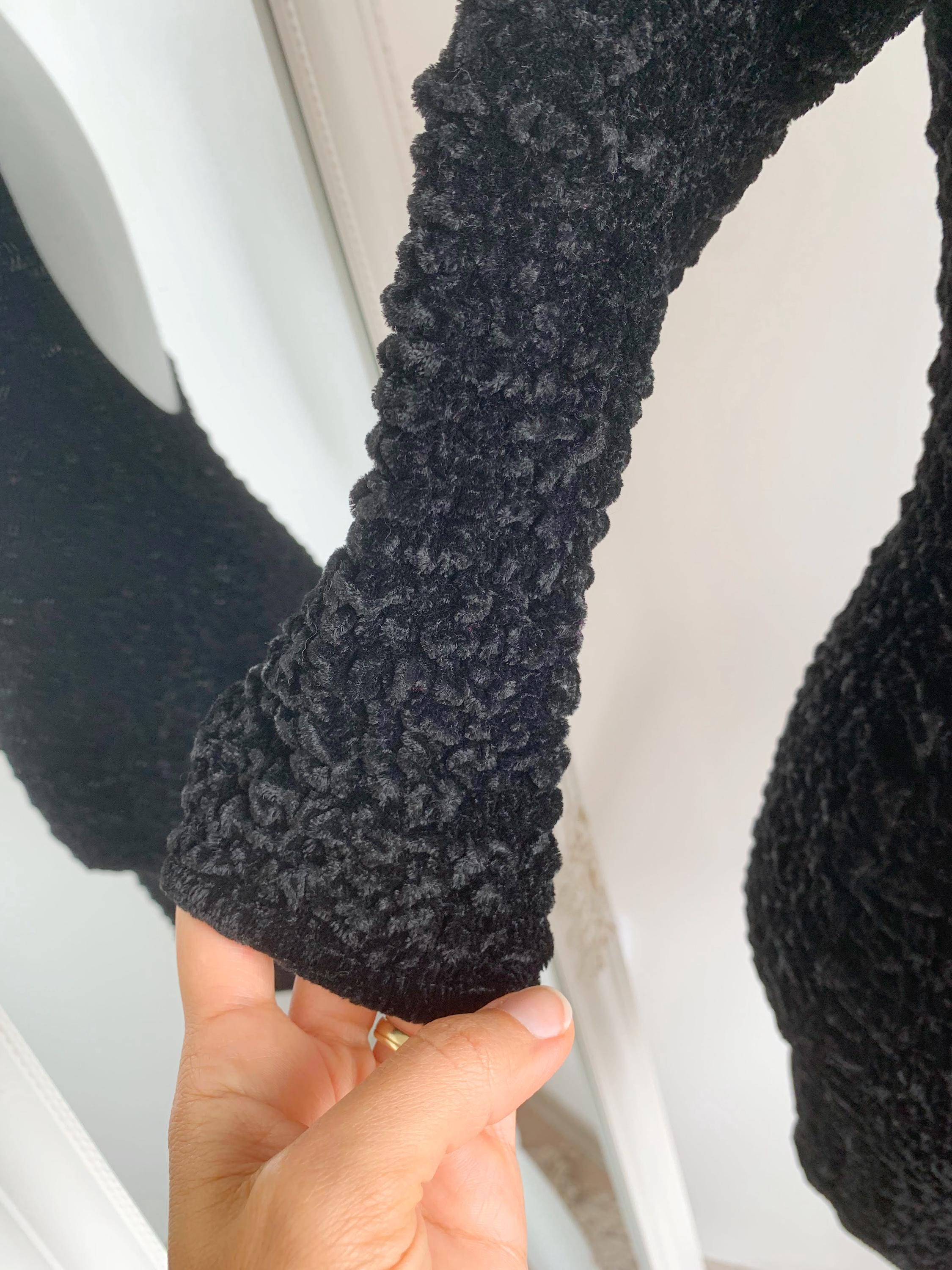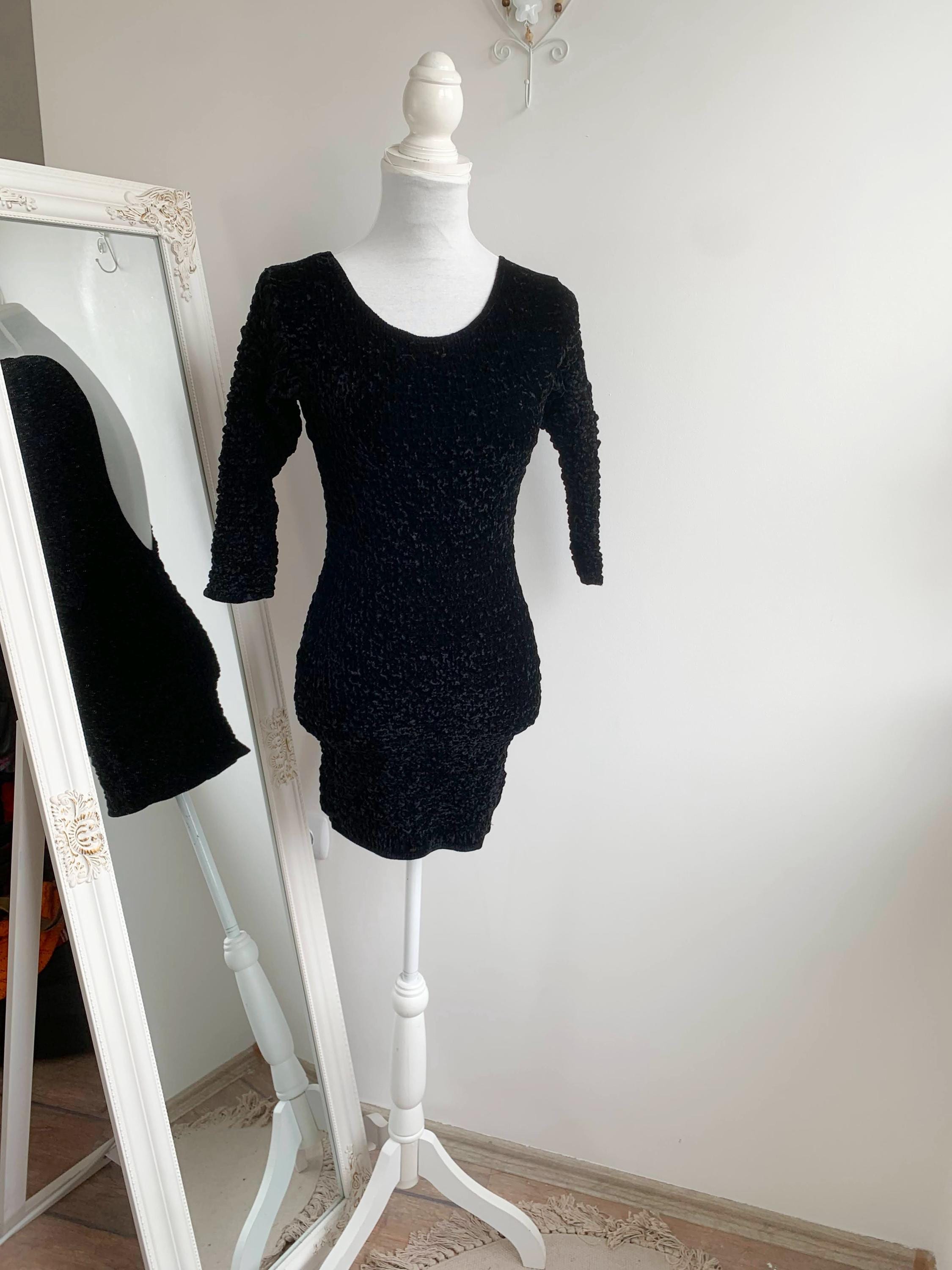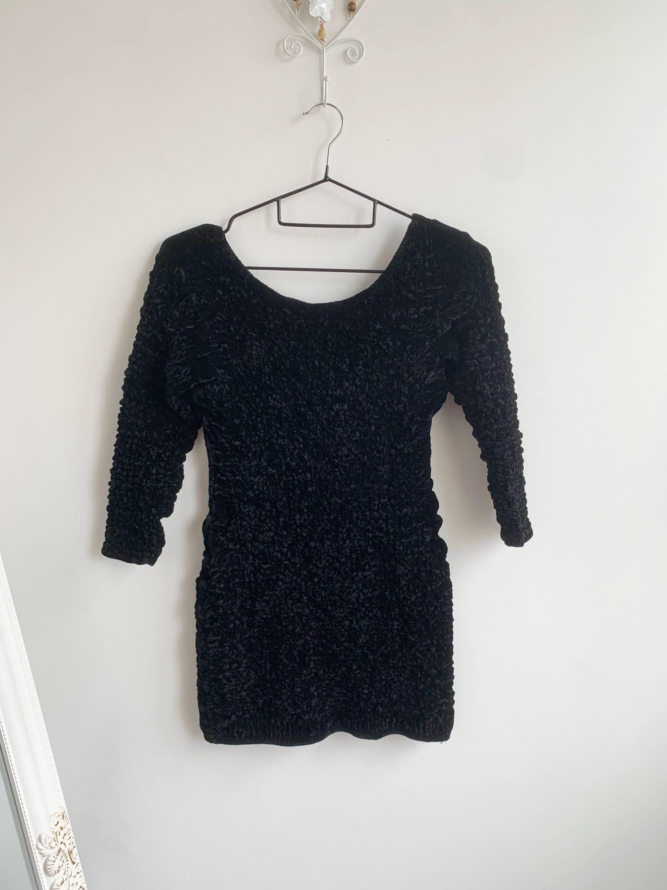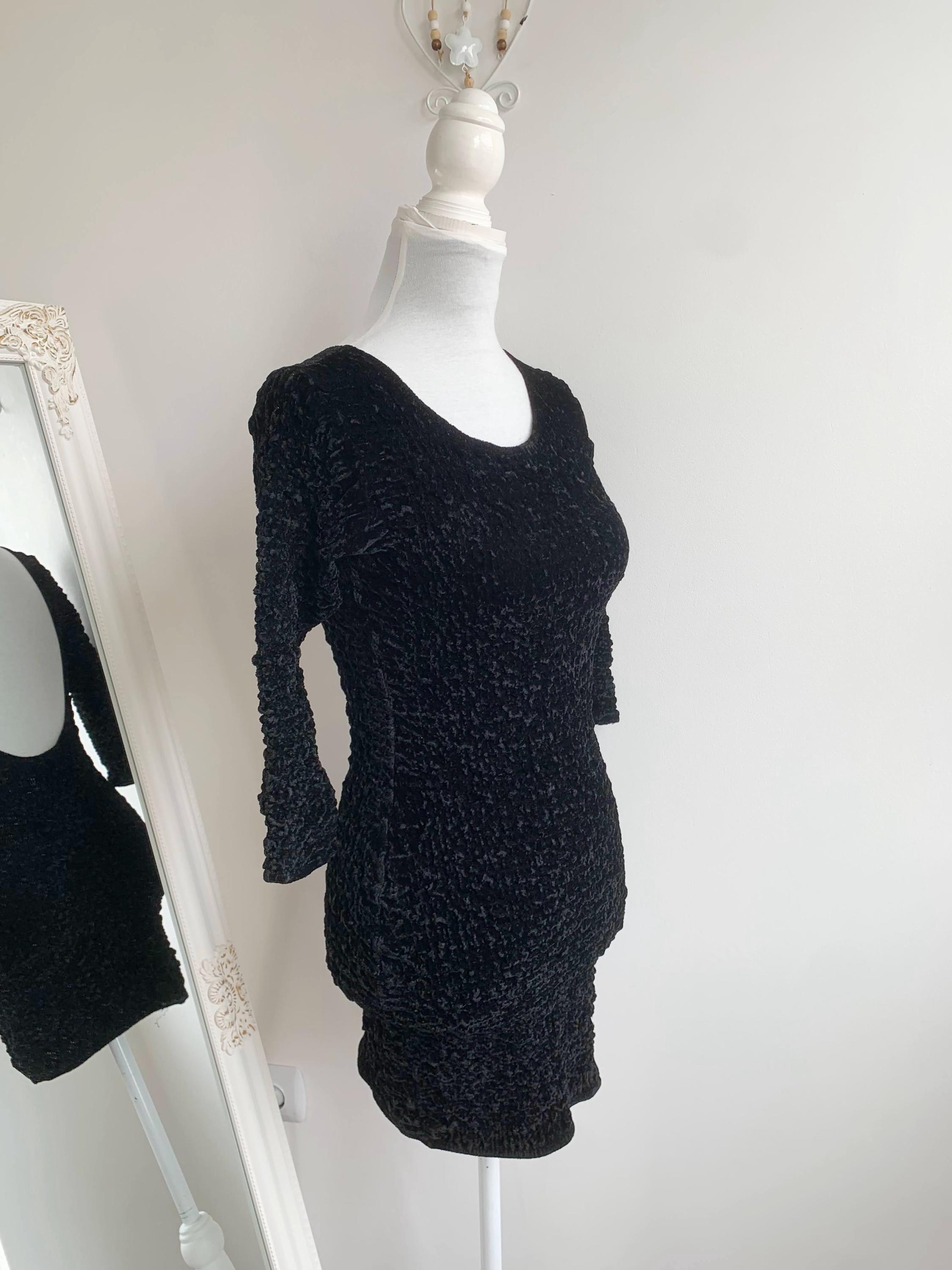 Step out in this stunning vintage black velvet mini dress by Isabel Martin Paris, an iconic piece that perfectly captures the bold glamour of the late 80s and early 90s fashion. This unique stretch texture dress features an all-over crinkle velvet (or "popcorn") texture that is incredibly tactile and flattering. The classic scoop neck and three-quarter sleeves give it a chic silhouette, while the dramatic open back adds a provocative, yet elegant, twist —making it an ideal party dress or a perfect choice for a night out. Its remarkable stretch fabric allows this versatile piece to fit a range of sizes beautifully. A true head-turner and a testament to high-quality vintage apparel.