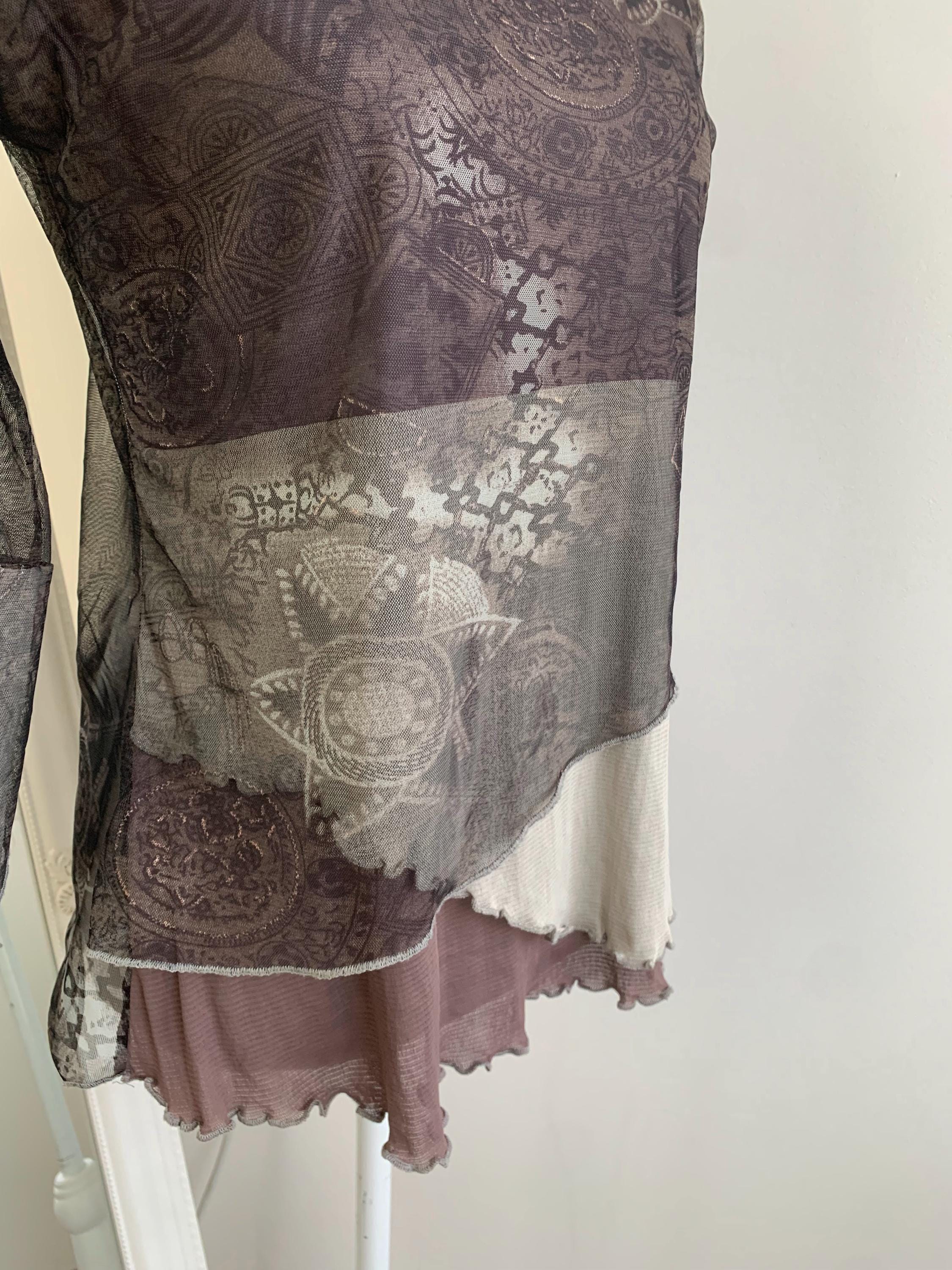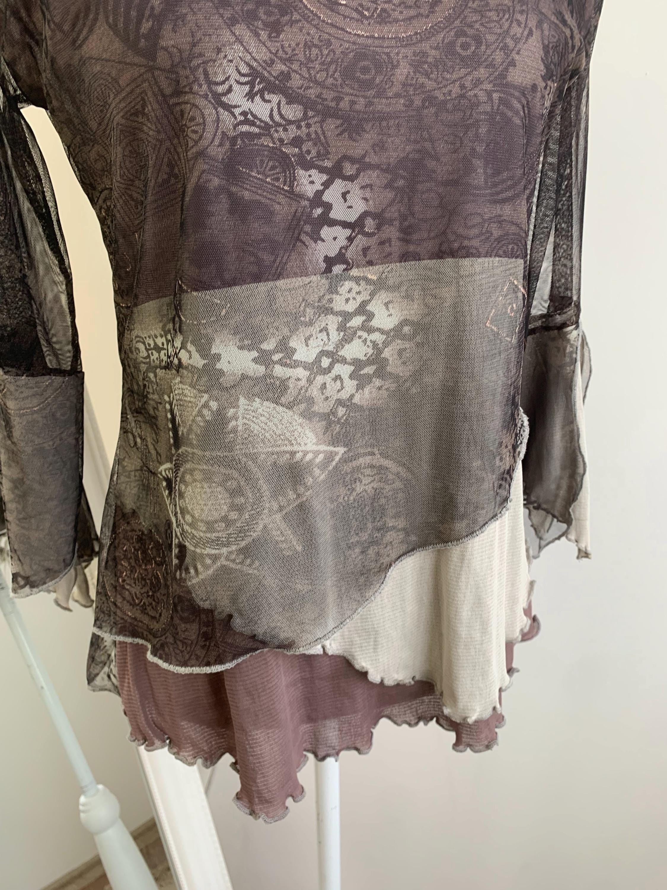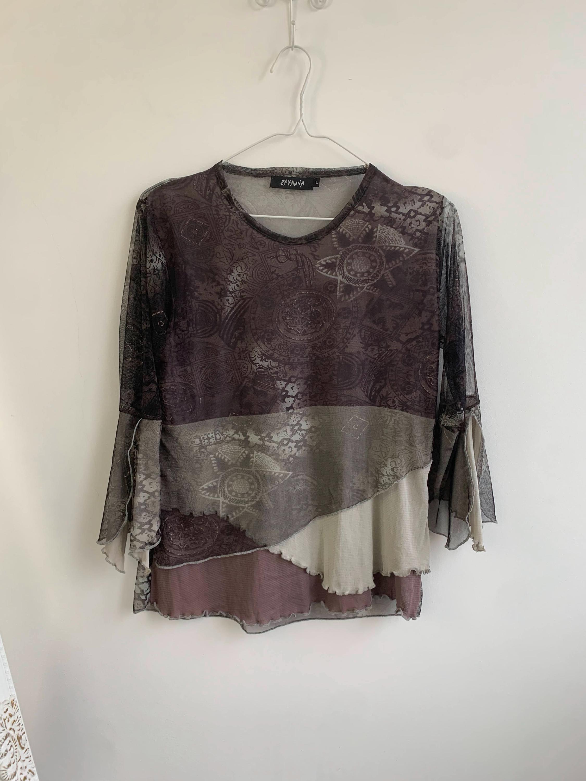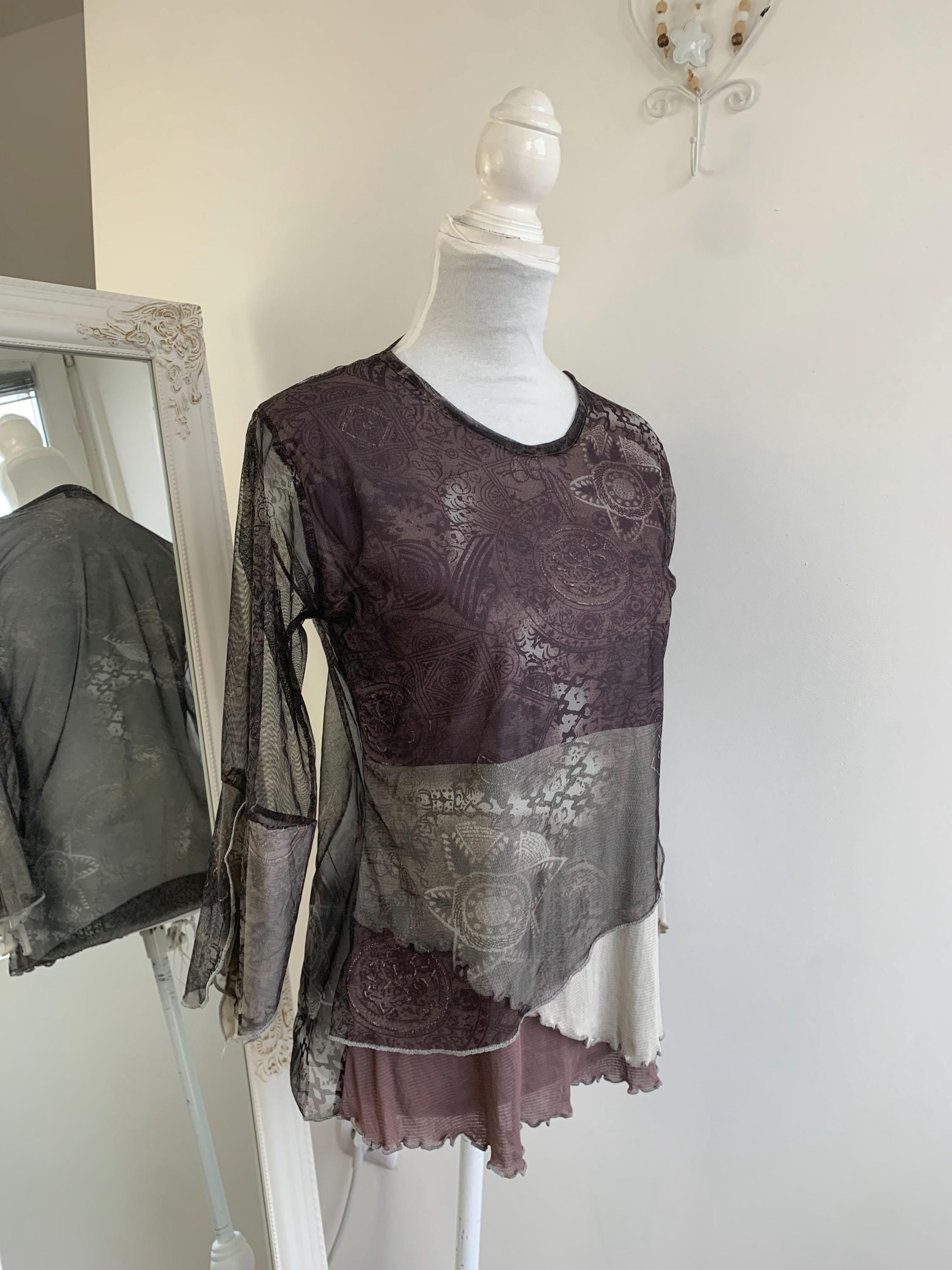 Capture the coveted Grunge Fairycore or Bohemian Y2K aesthetic with this unique sheer mesh top by Zavanna in size L. This piece features a striking all-over print with mandala-like and intricate patterns in versatile earth tones—shades of brown, gray, taupe, and off-white. The magic is in the construction: it's a patchwork blouse design with raw, lettuce-edge hems, and layered fabric panels that give it a beautifully deconstructed, fluid look.
