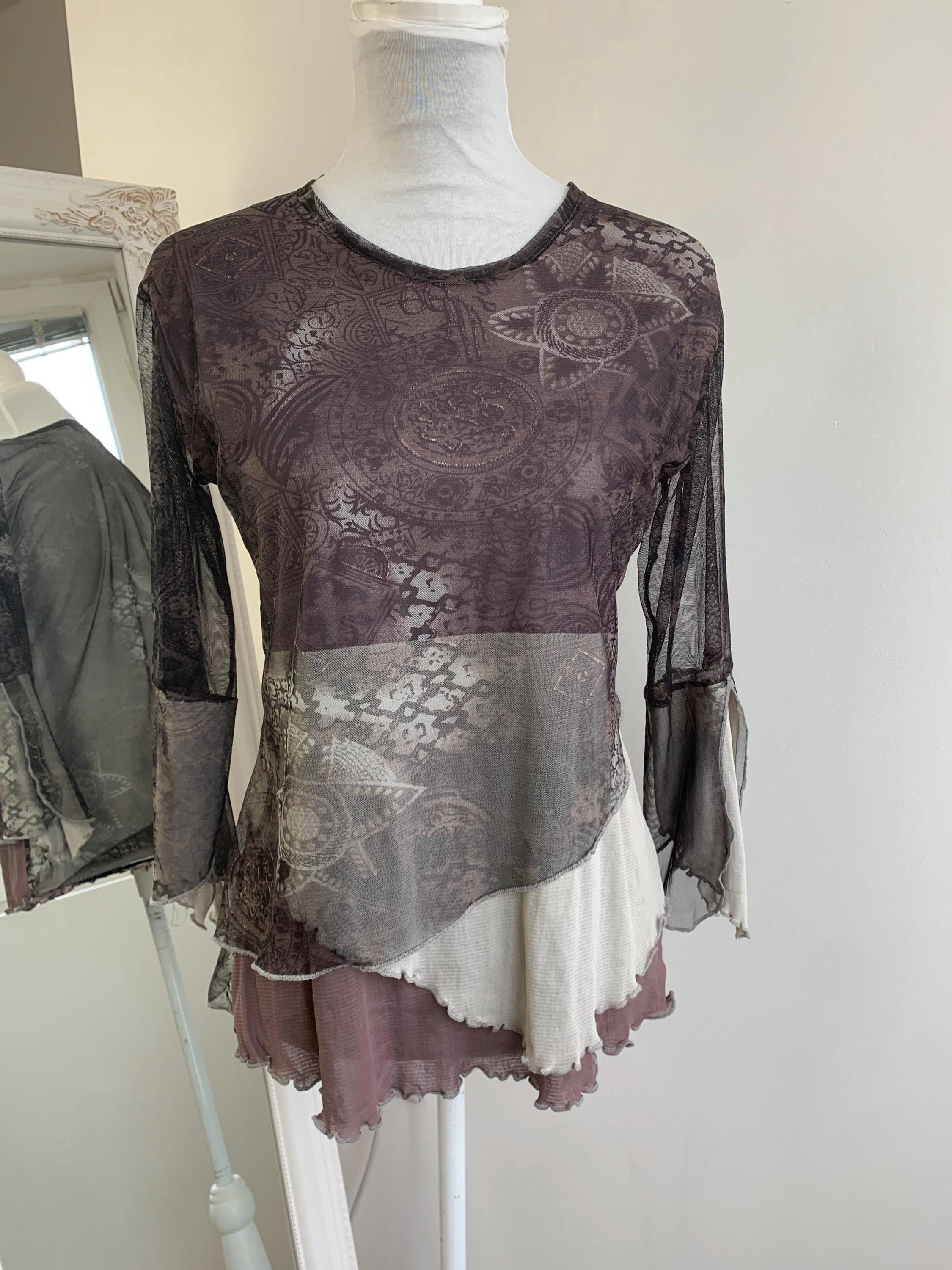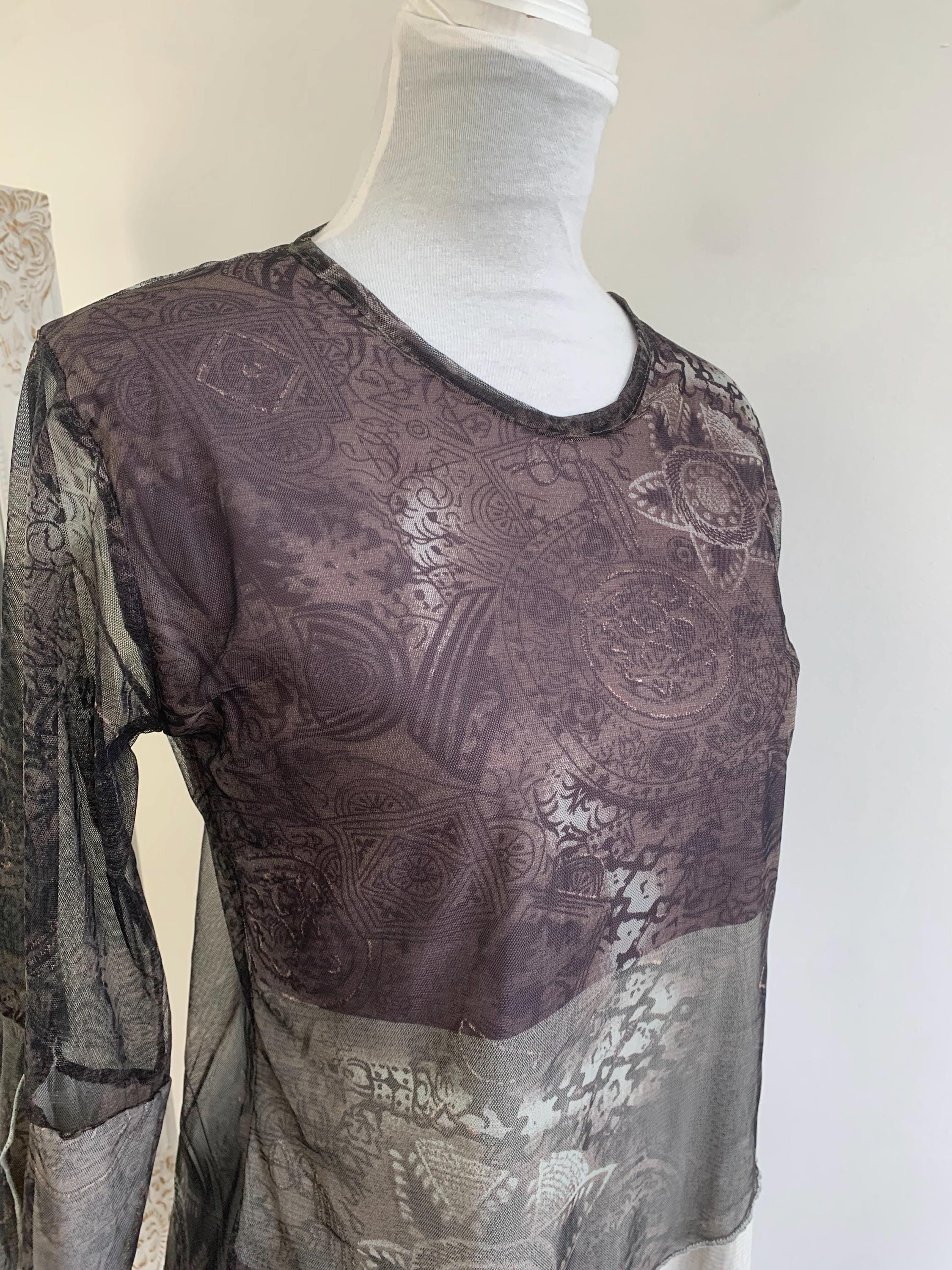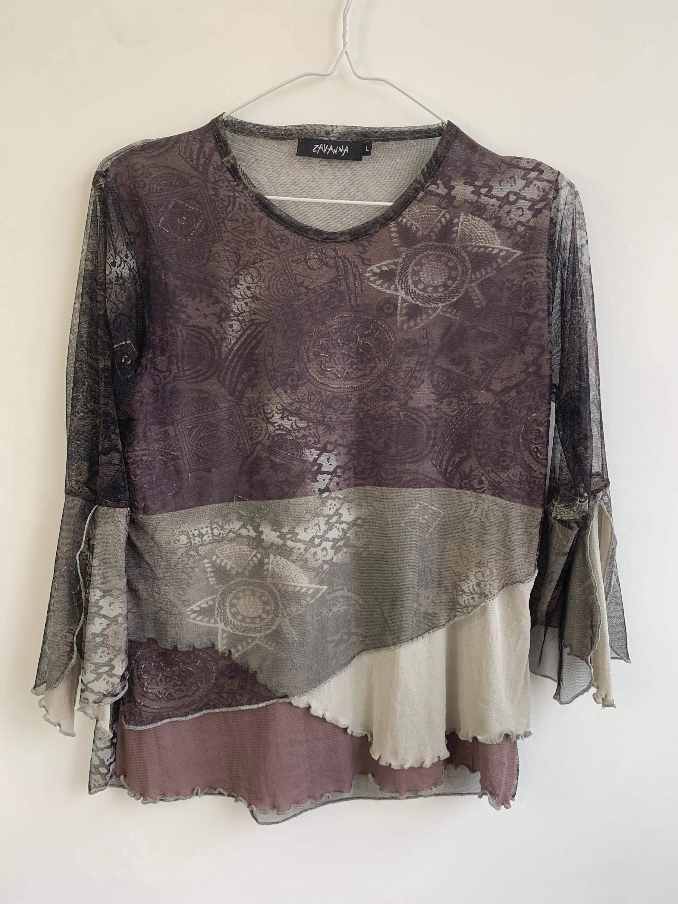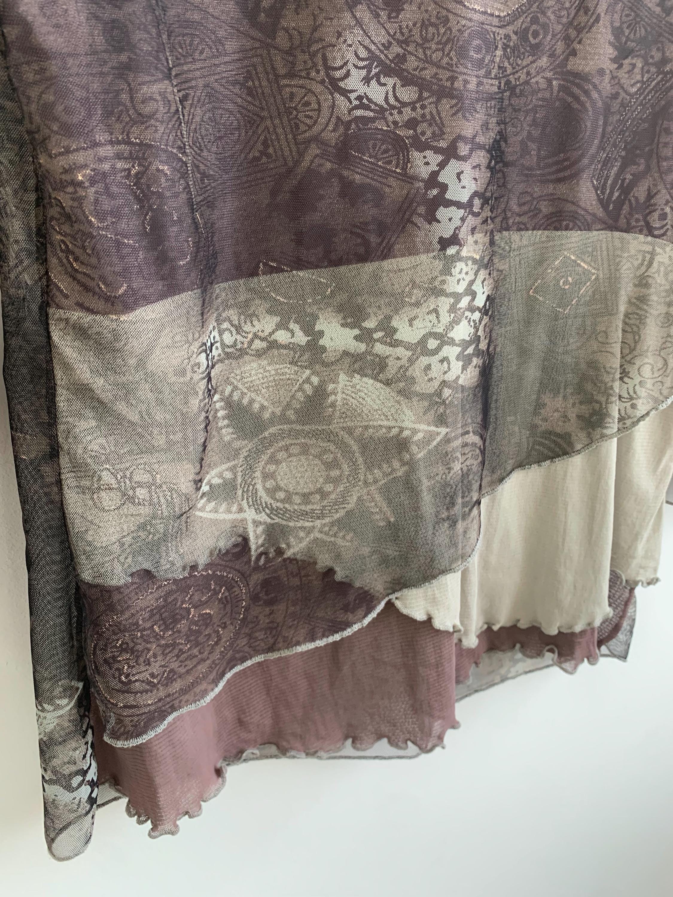 Capture the coveted Grunge Fairycore or Bohemian Y2K aesthetic with this unique sheer mesh top by Zavanna in size L. This piece features a striking all-over print with mandala-like and intricate patterns in versatile earth tones—shades of brown, gray, taupe, and off-white. The magic is in the construction: it's a patchwork blouse design with raw, lettuce-edge hems, and layered fabric panels that give it a beautifully deconstructed, fluid look.