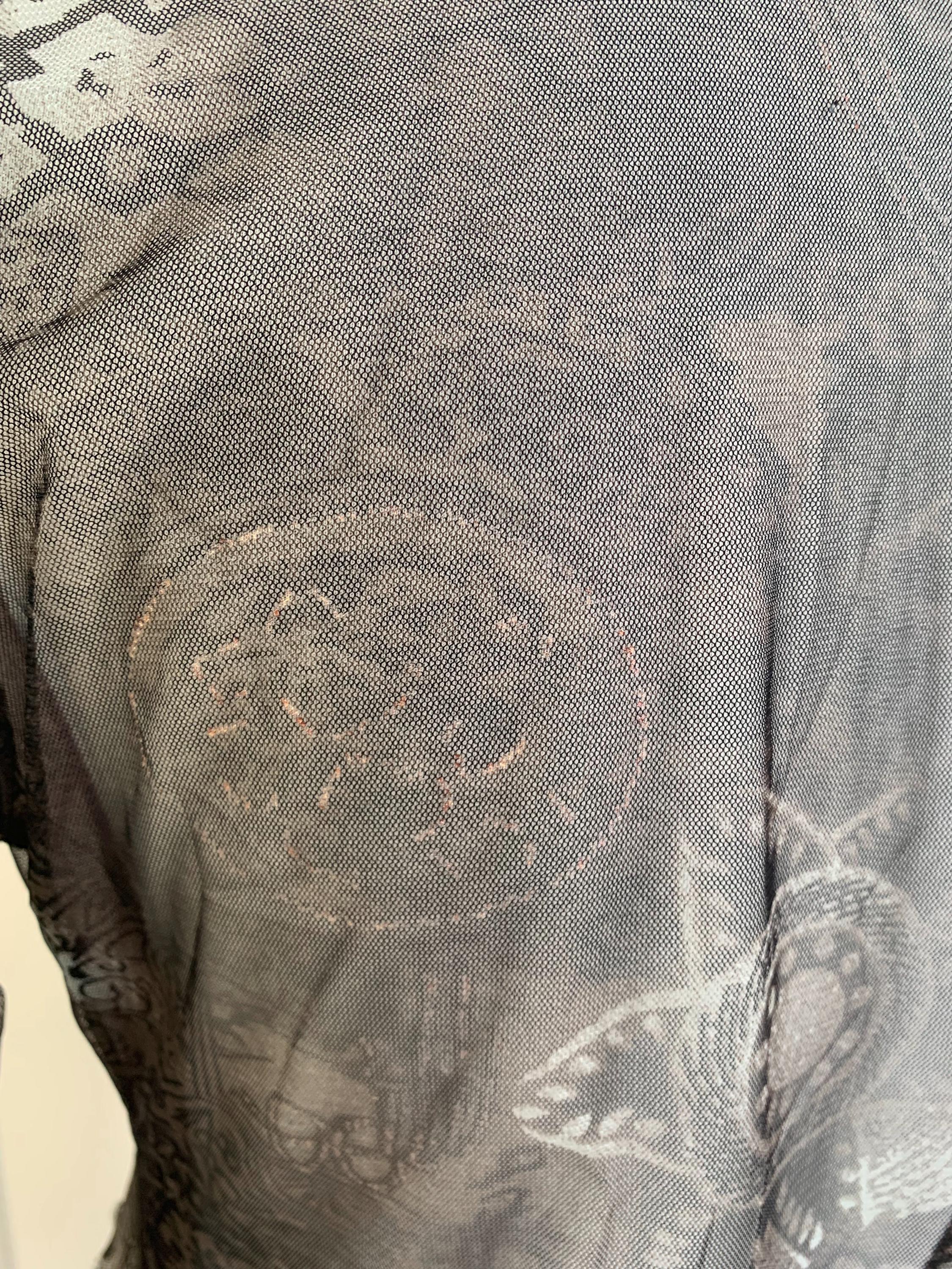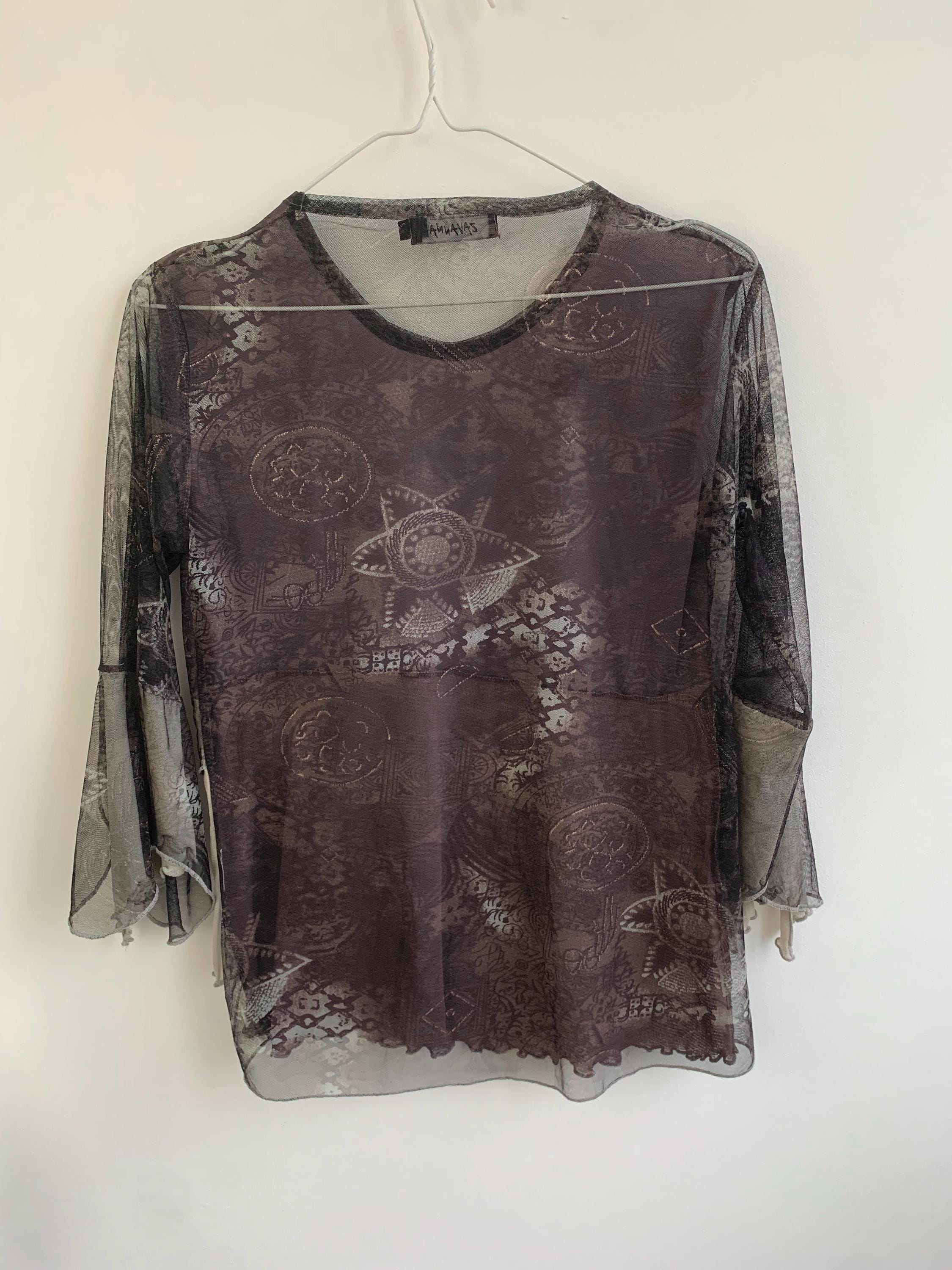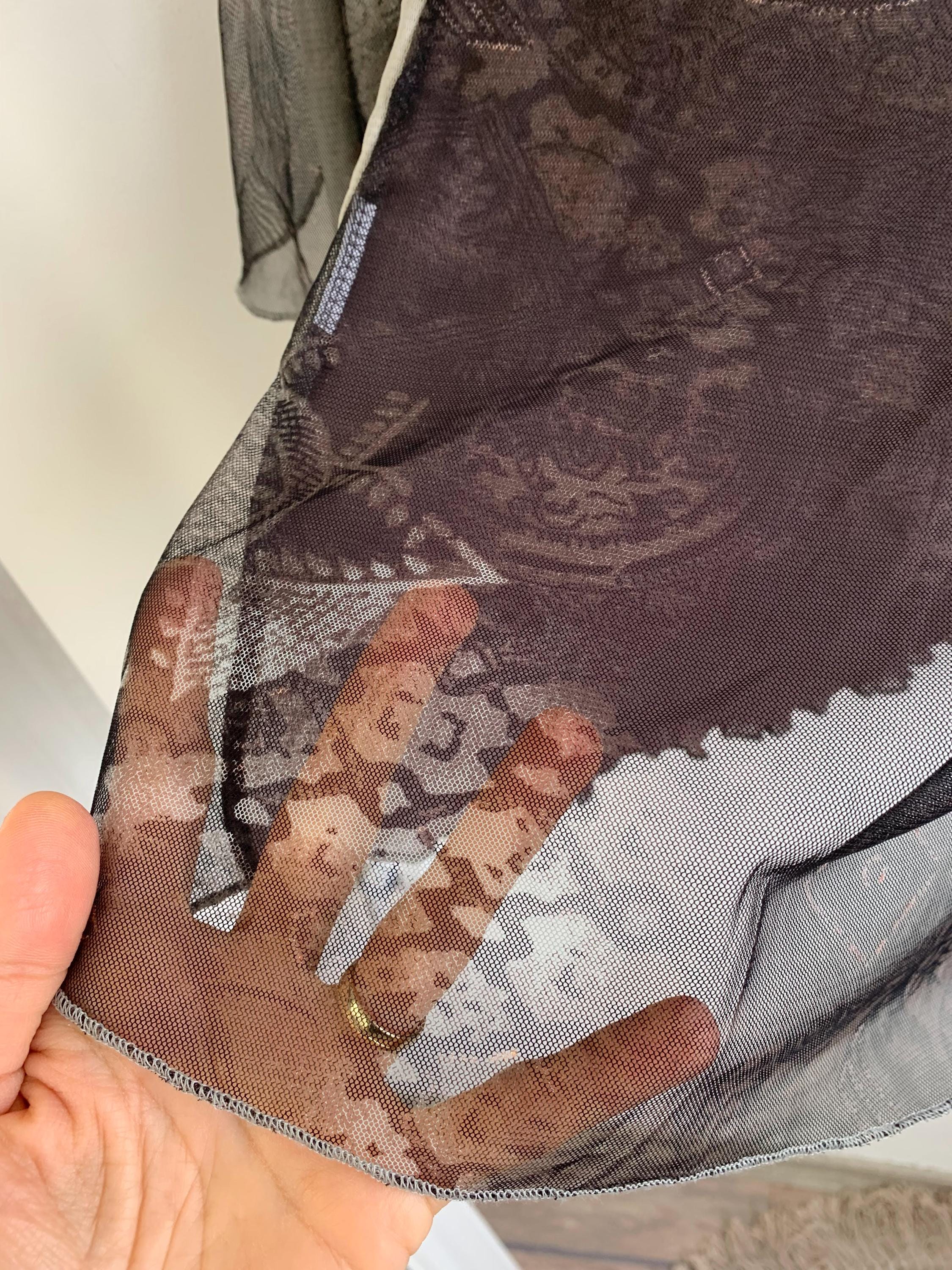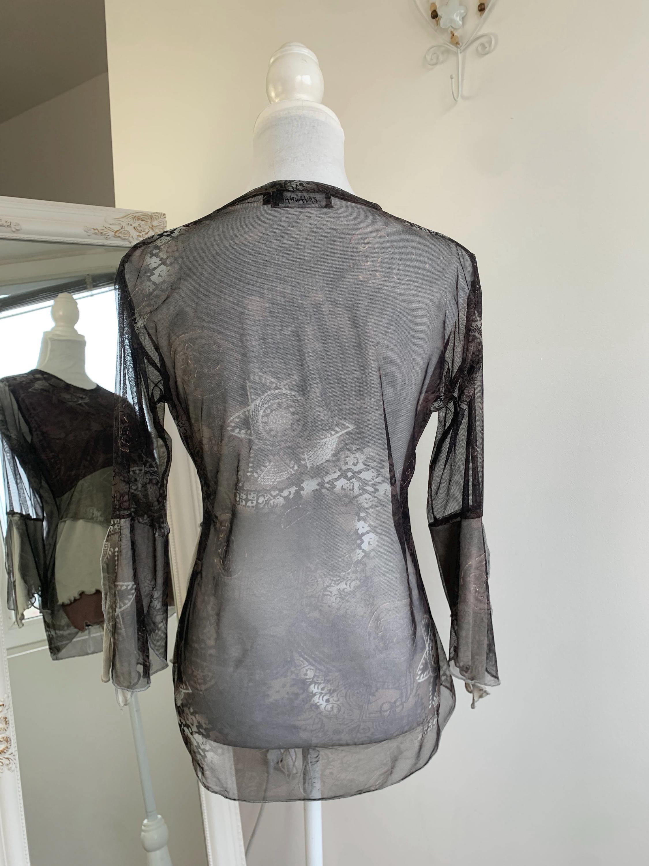 Capture the coveted Grunge Fairycore or Bohemian Y2K aesthetic with this unique sheer mesh top by Zavanna in size L. This piece features a striking all-over print with mandala-like and intricate patterns in versatile earth tones—shades of brown, gray, taupe, and off-white. The magic is in the construction: it's a patchwork blouse design with raw, lettuce-edge hems, and layered fabric panels that give it a beautifully deconstructed, fluid look.