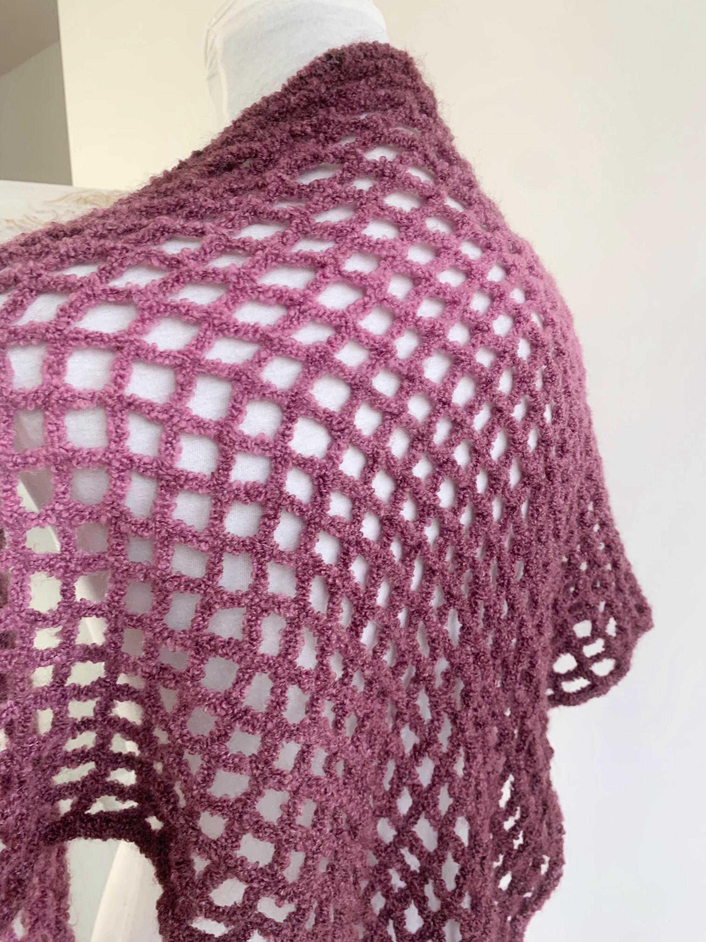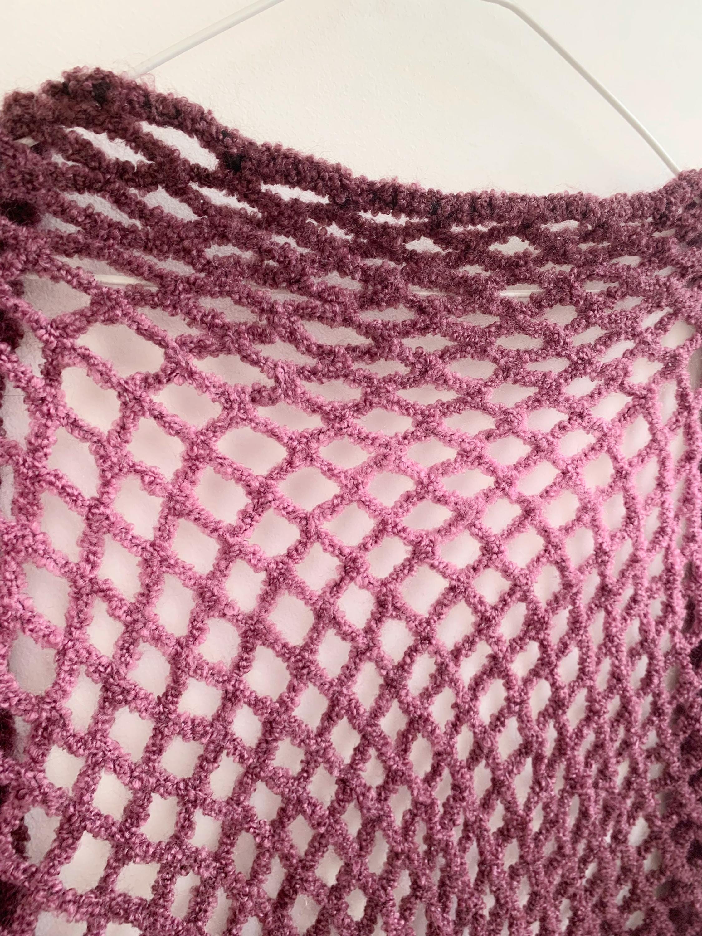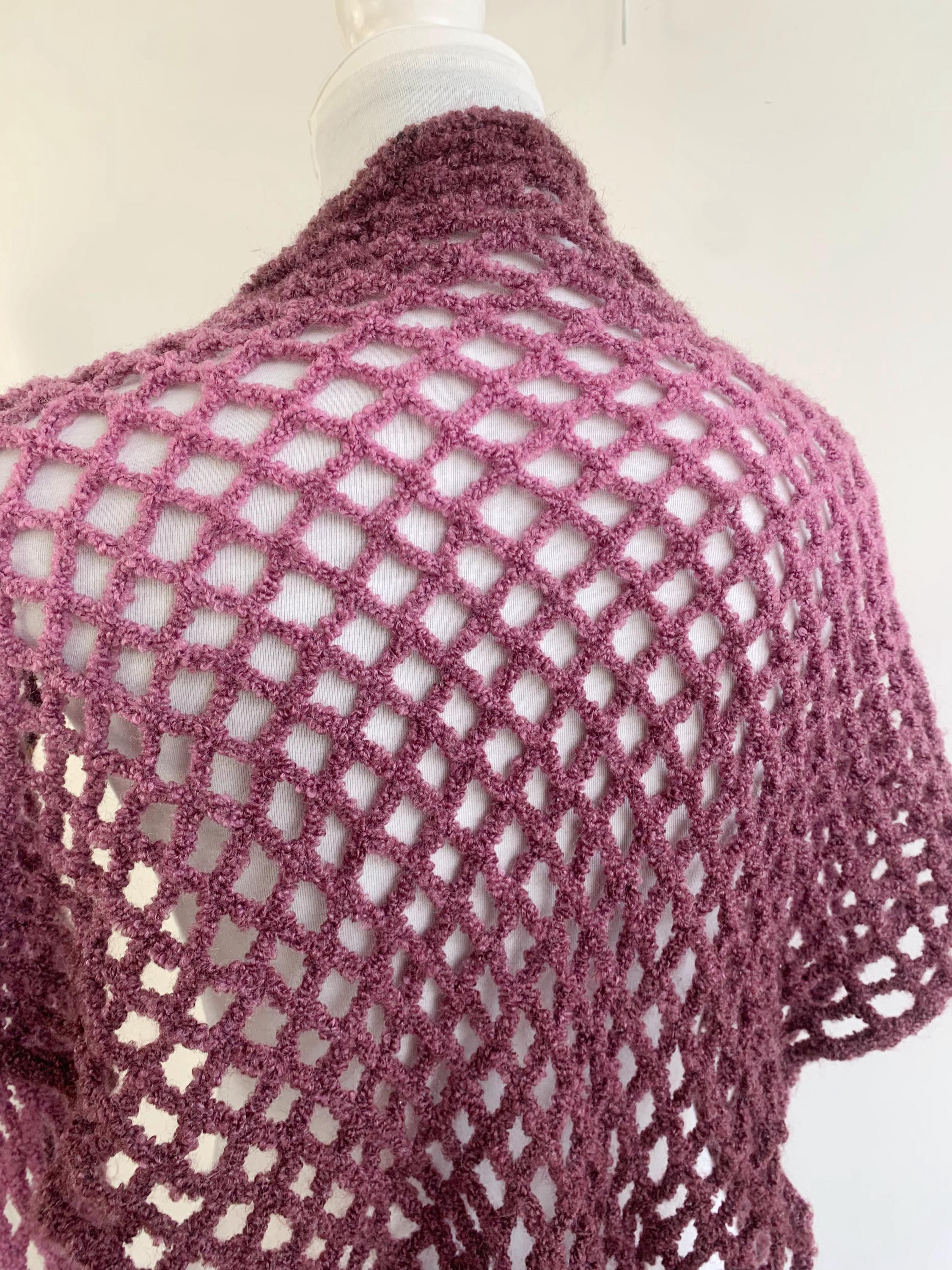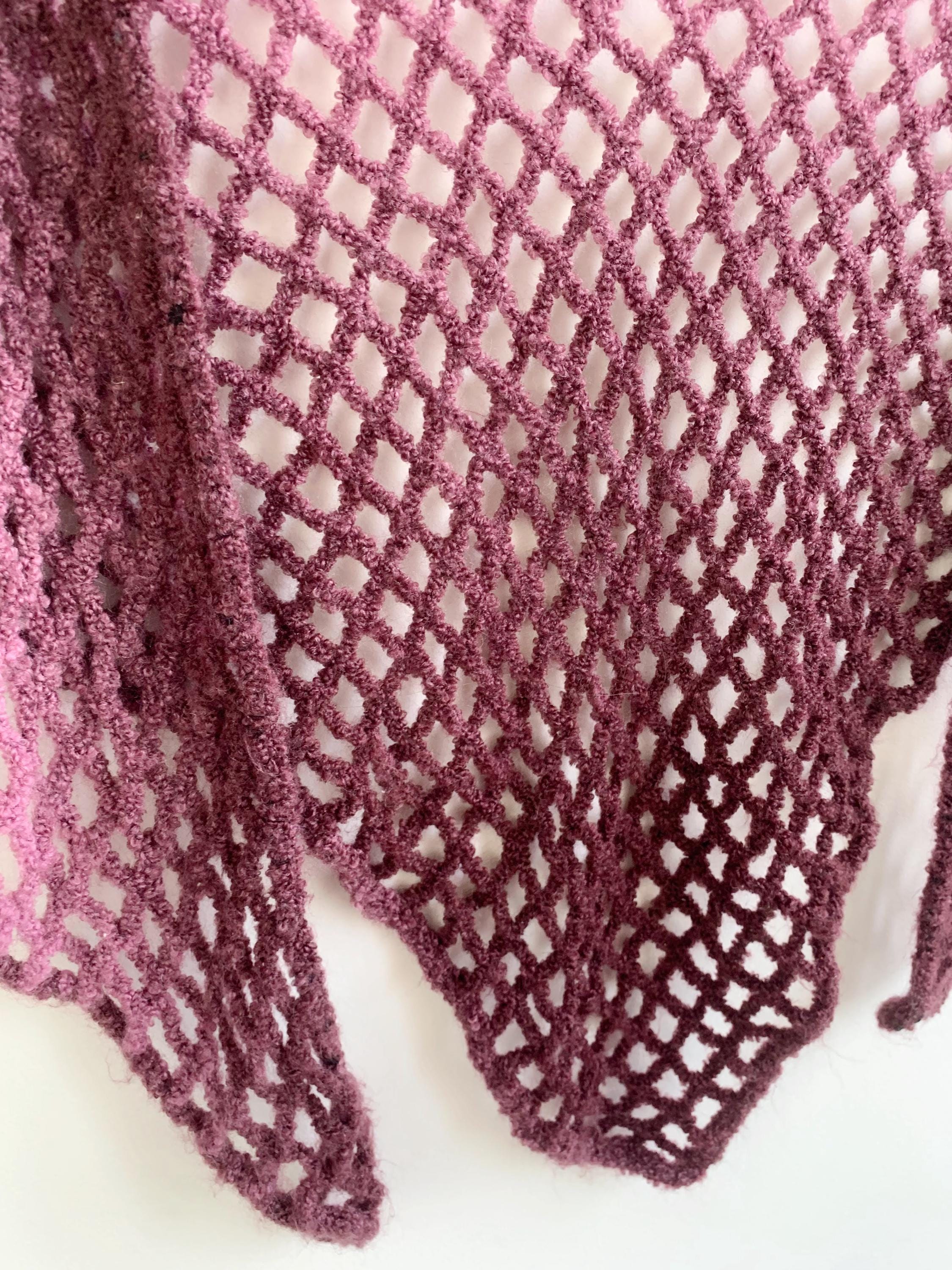 Wrap yourself in cozy elegance with this stunning vintage hadnmade deep plum mauve pink open-knit shawl. Its rich burgundy-plum color and super soft texture make it the perfect statement accessory for the cooler months. The large, diamond-shaped open weave gives it a delicate, bohemian feel while providing beautiful texture. Layer it over a simple turtleneck or dress for a pop of color and texture. Pair it with leather or denim for a relaxed, boho-chic look. Use it as a cozy, lightweight evening wrap for special occasions.