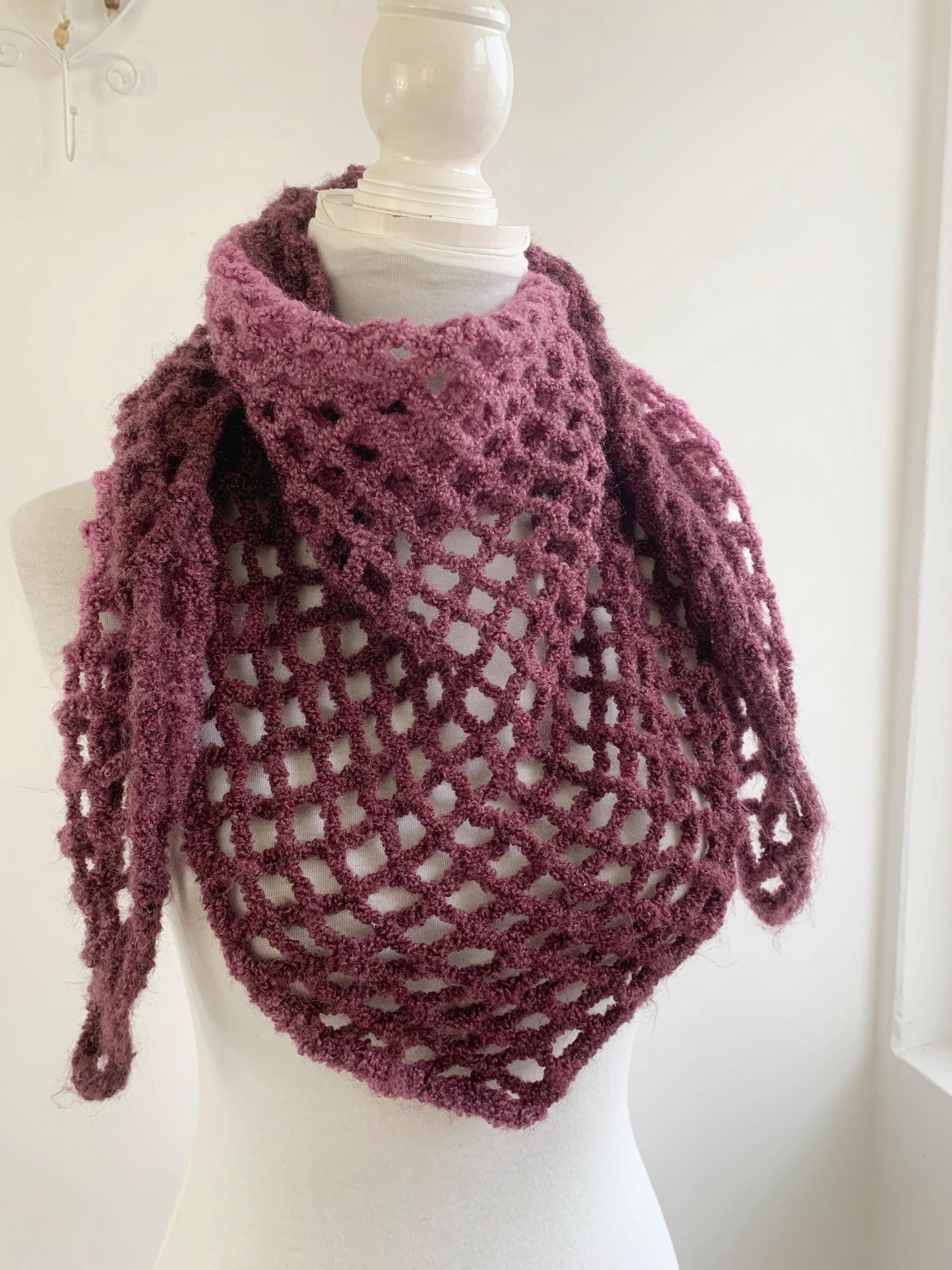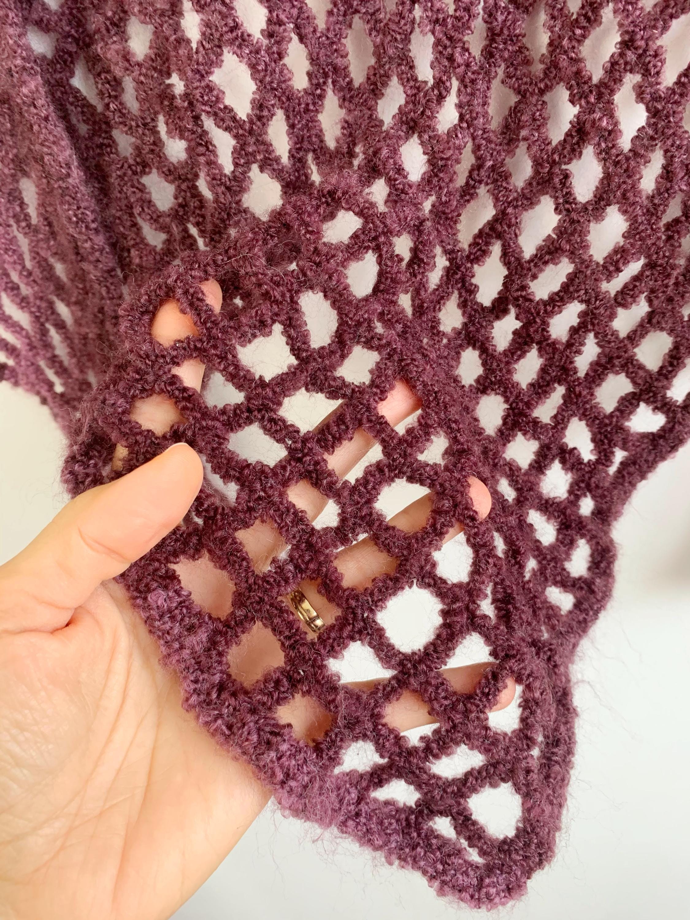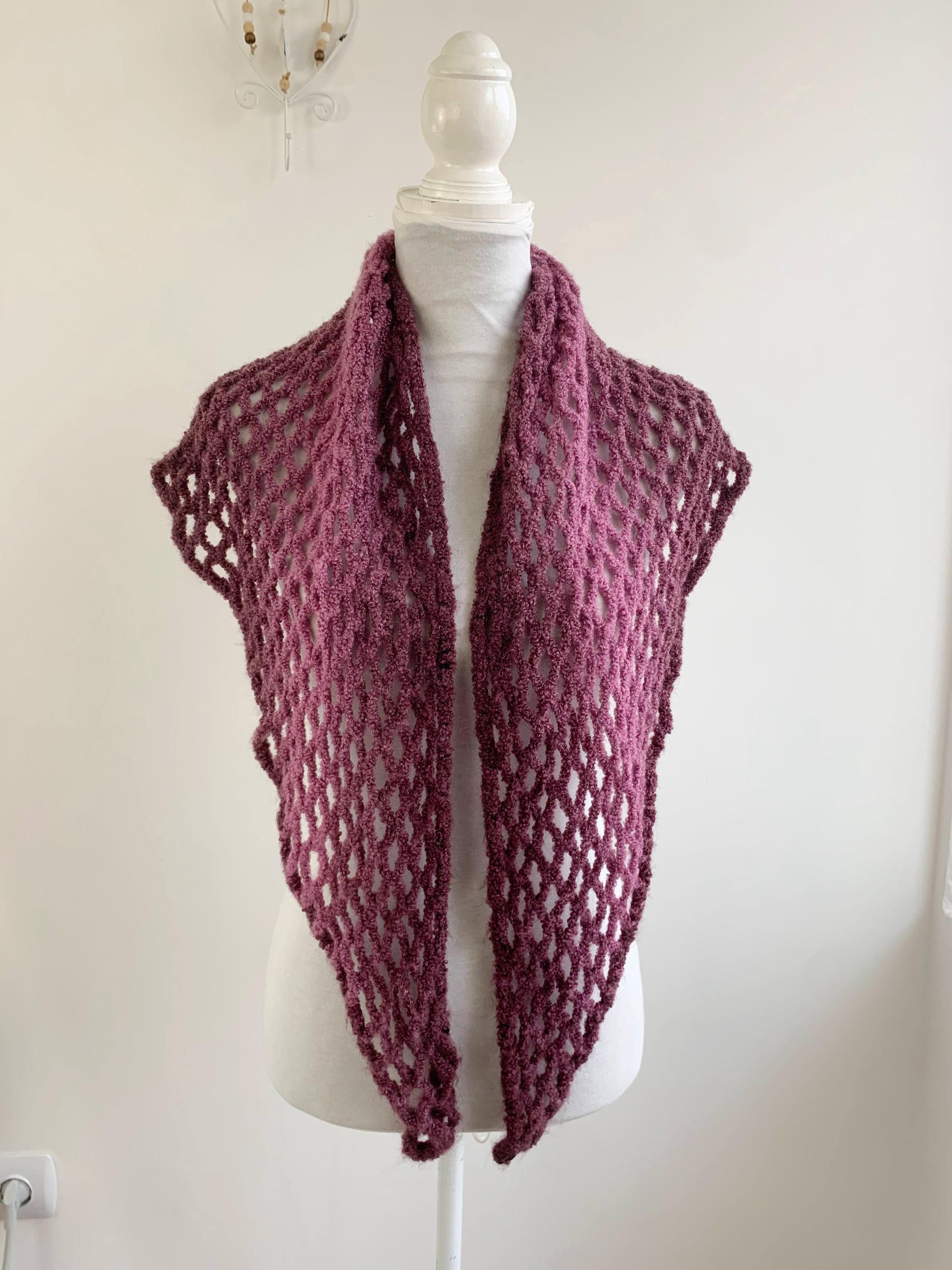Wrap yourself in cozy elegance with this stunning vintage hadnmade deep plum mauve pink open-knit shawl. Its rich burgundy-plum color and super soft texture make it the perfect statement accessory for the cooler months. The large, diamond-shaped open weave gives it a delicate, bohemian feel while providing beautiful texture. Layer it over a simple turtleneck or dress for a pop of color and texture. Pair it with leather or denim for a relaxed, boho-chic look. Use it as a cozy, lightweight evening wrap for special occasions.
