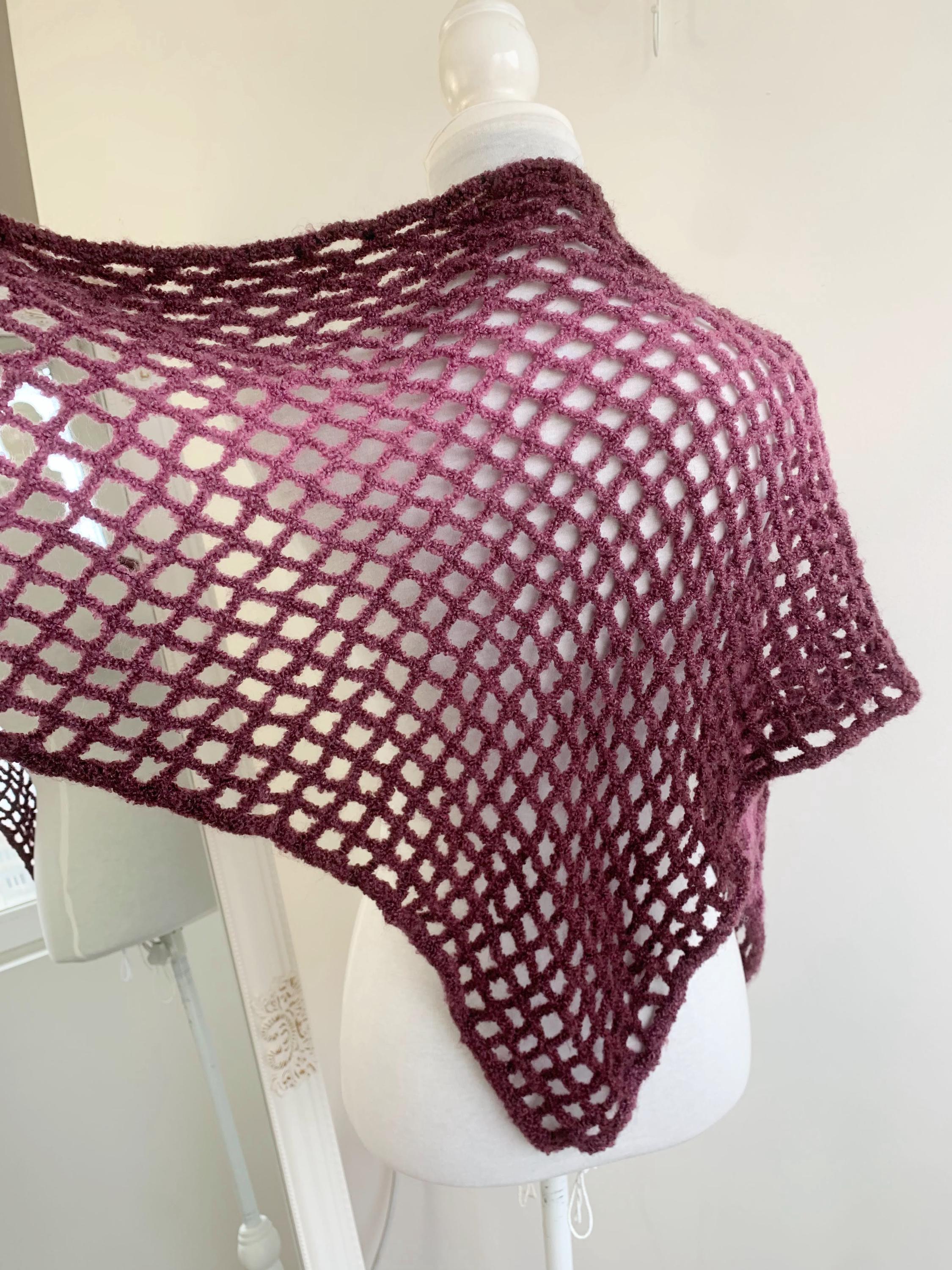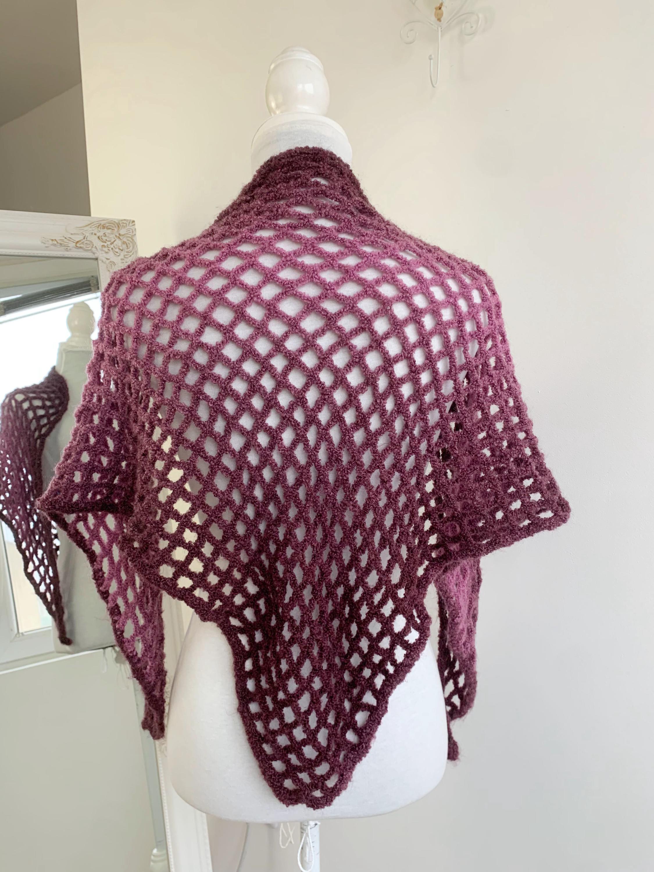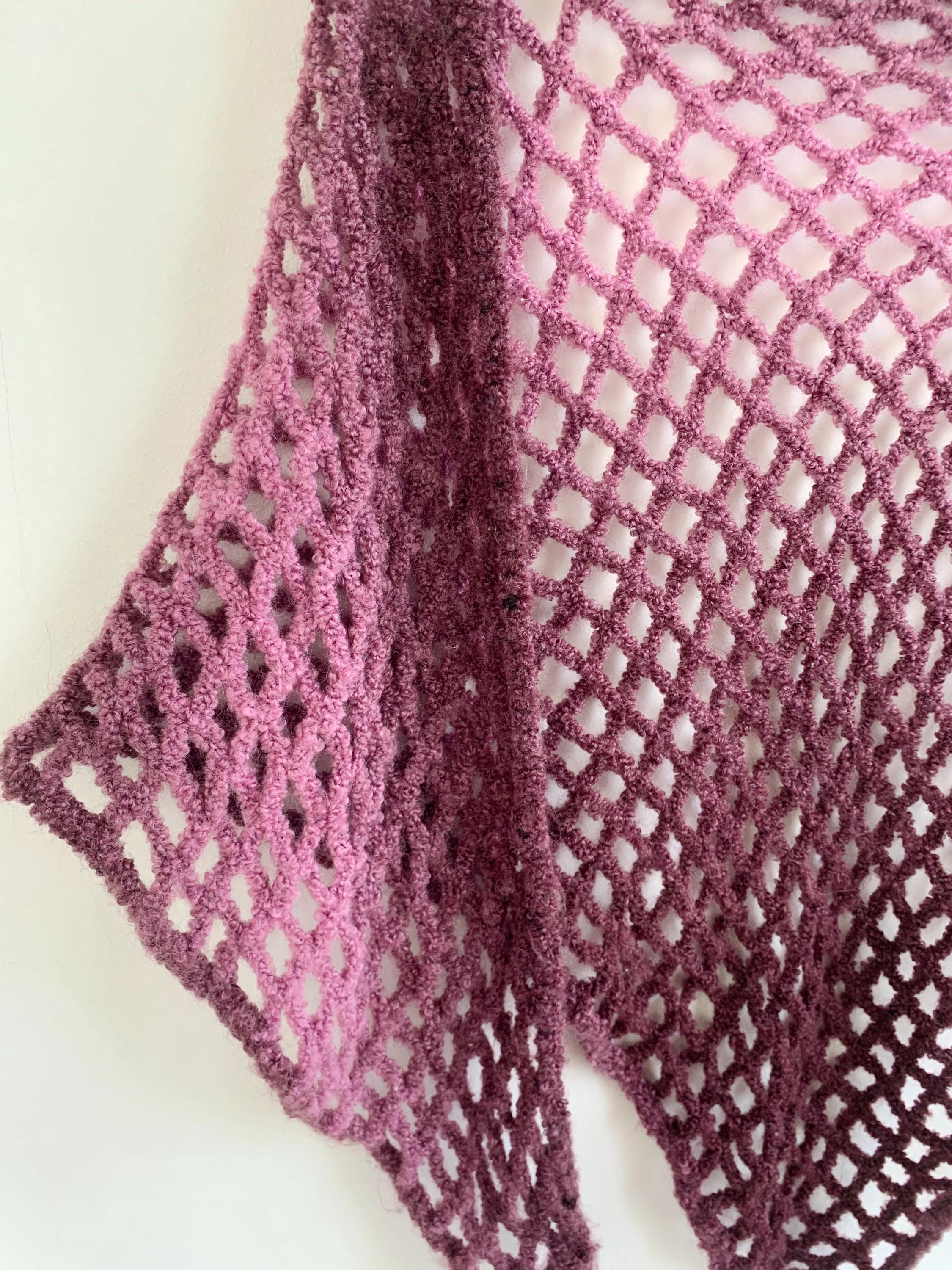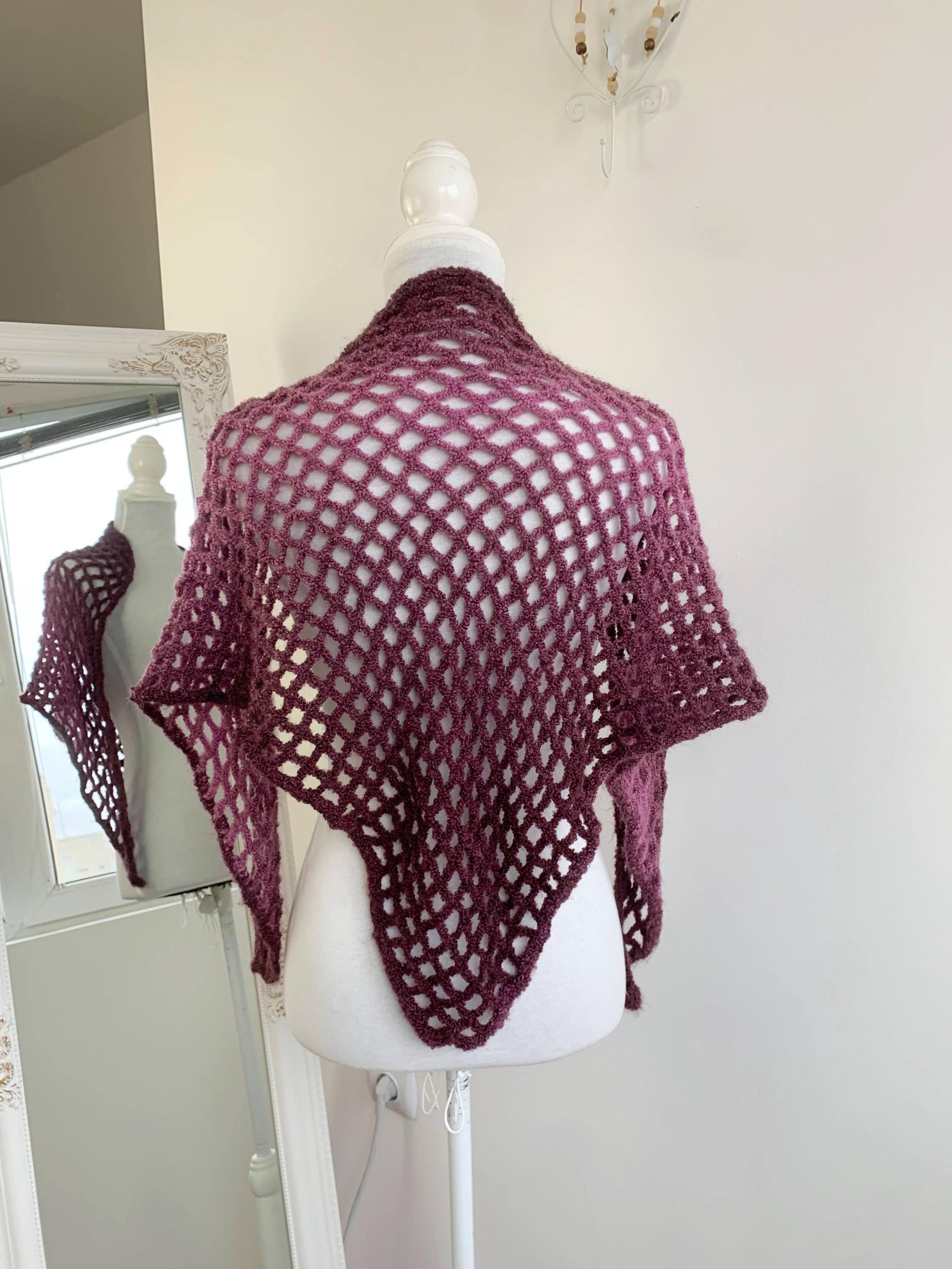 Wrap yourself in cozy elegance with this stunning vintage hadnmade deep plum mauve pink open-knit shawl. Its rich burgundy-plum color and super soft texture make it the perfect statement accessory for the cooler months. The large, diamond-shaped open weave gives it a delicate, bohemian feel while providing beautiful texture. Layer it over a simple turtleneck or dress for a pop of color and texture. Pair it with leather or denim for a relaxed, boho-chic look. Use it as a cozy, lightweight evening wrap for special occasions.