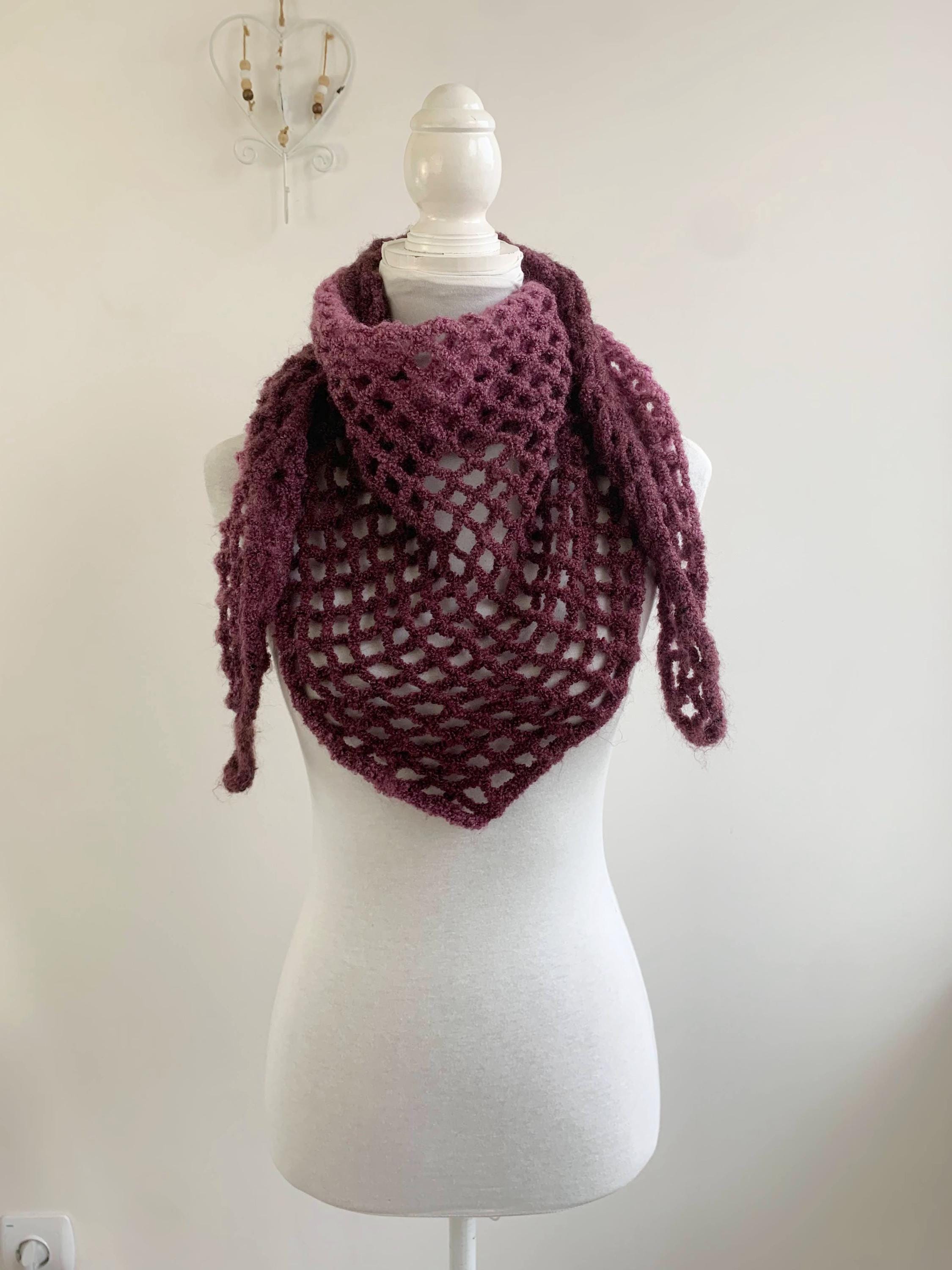 This small triangle shawl can be styled in multiple ways: draped over the shoulders as a wrap, tied as a scarf, or worn as a sophisticated neck cowl for extra warmth and flair.
