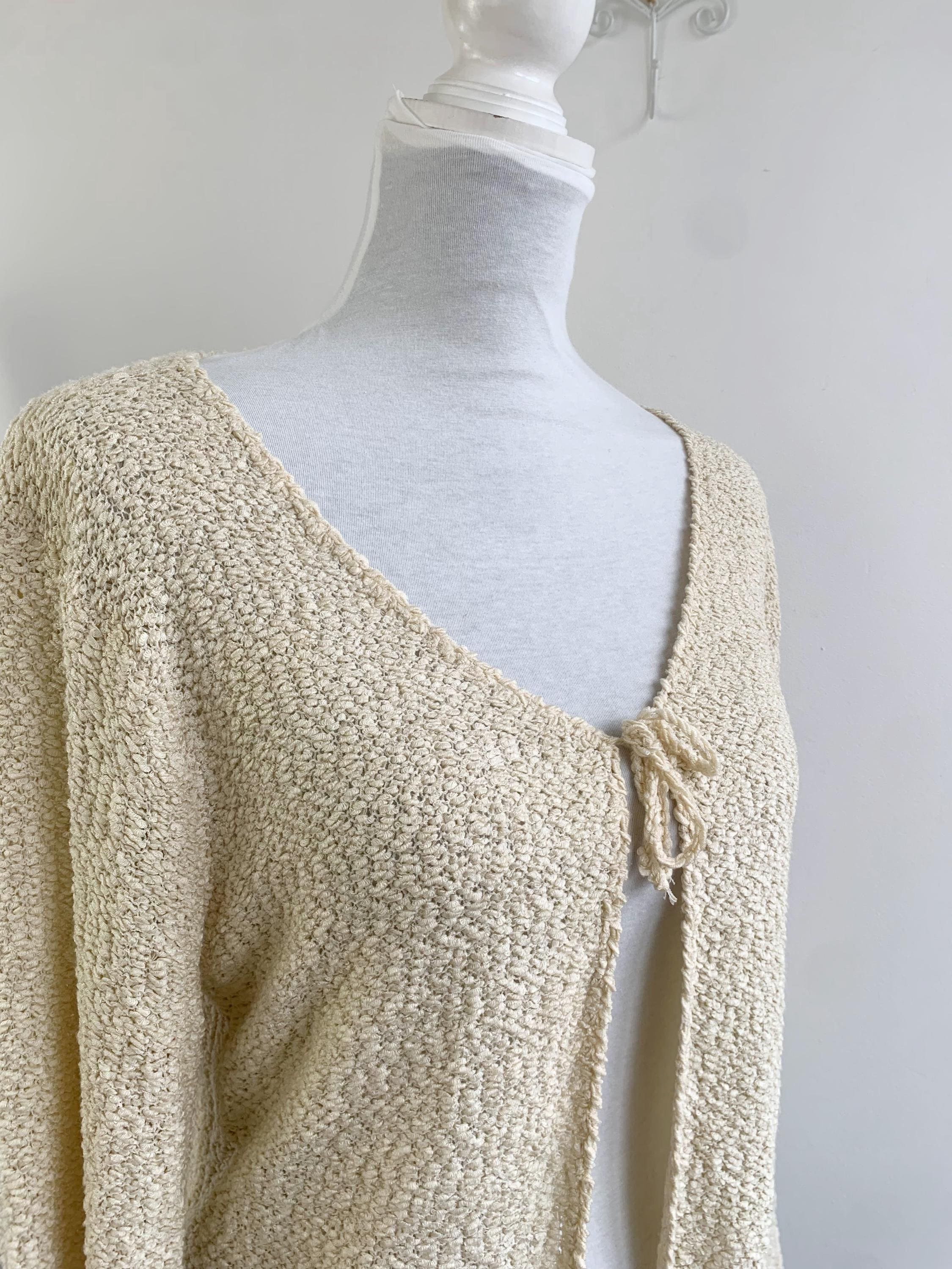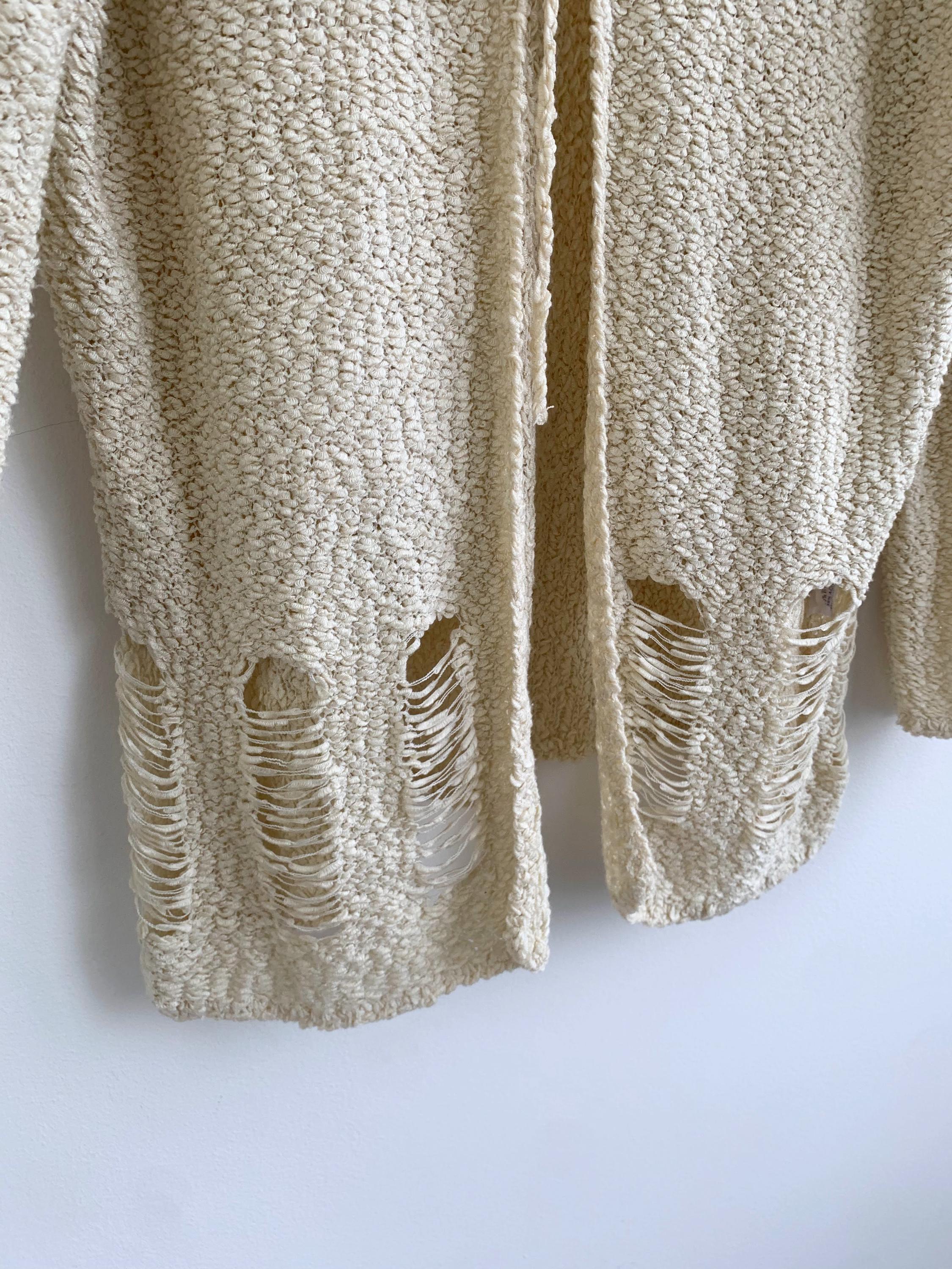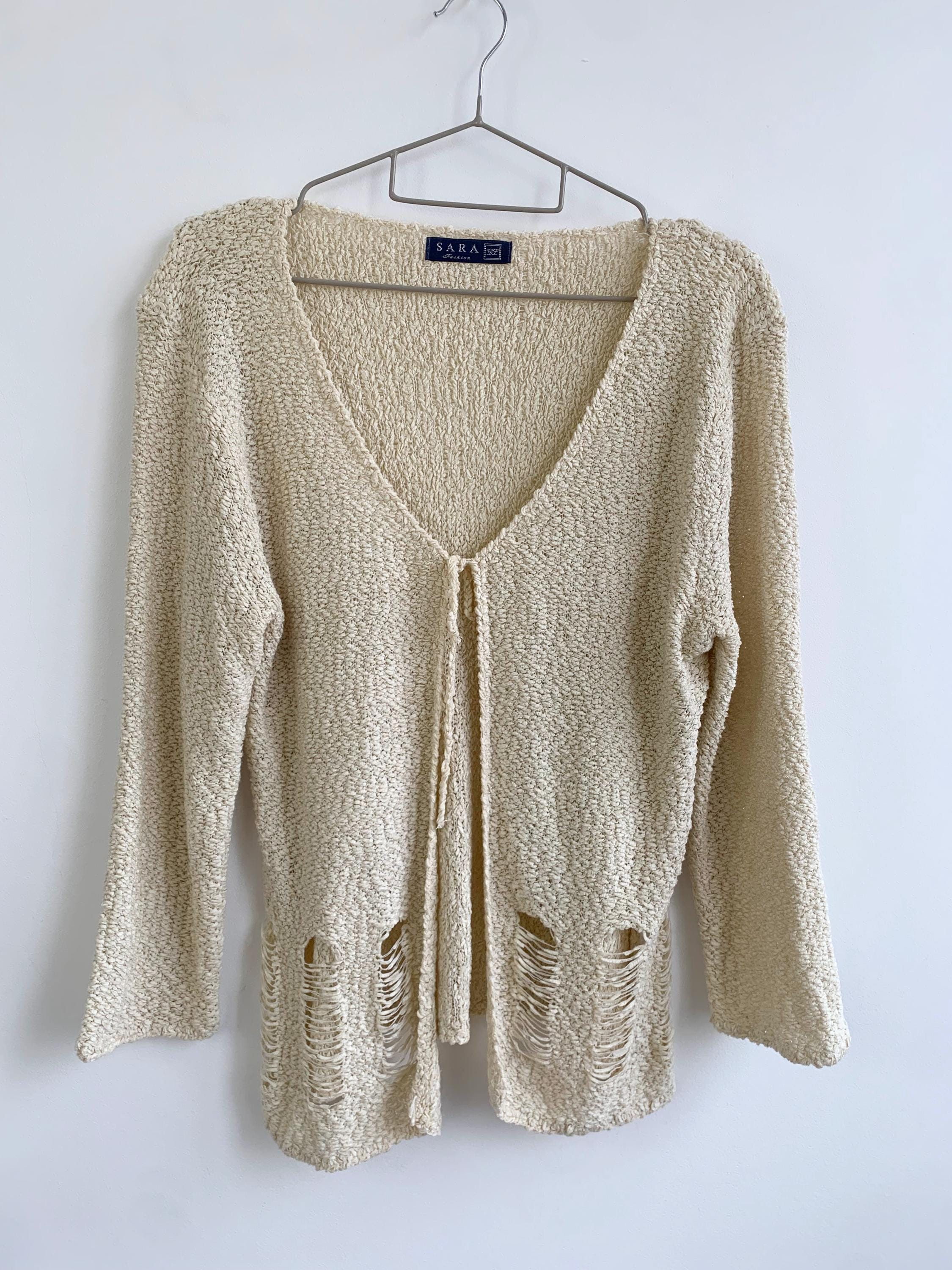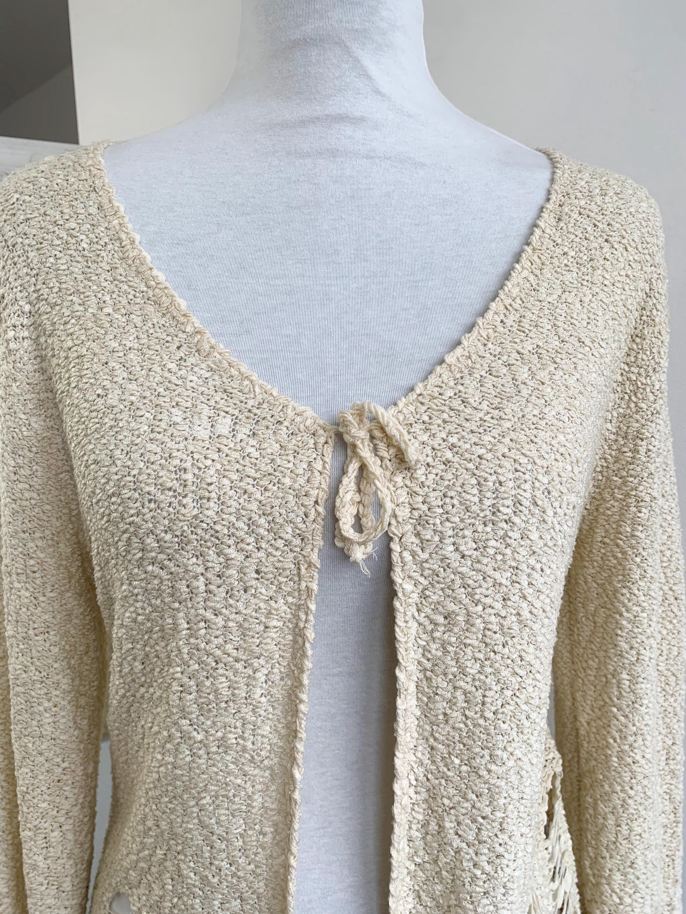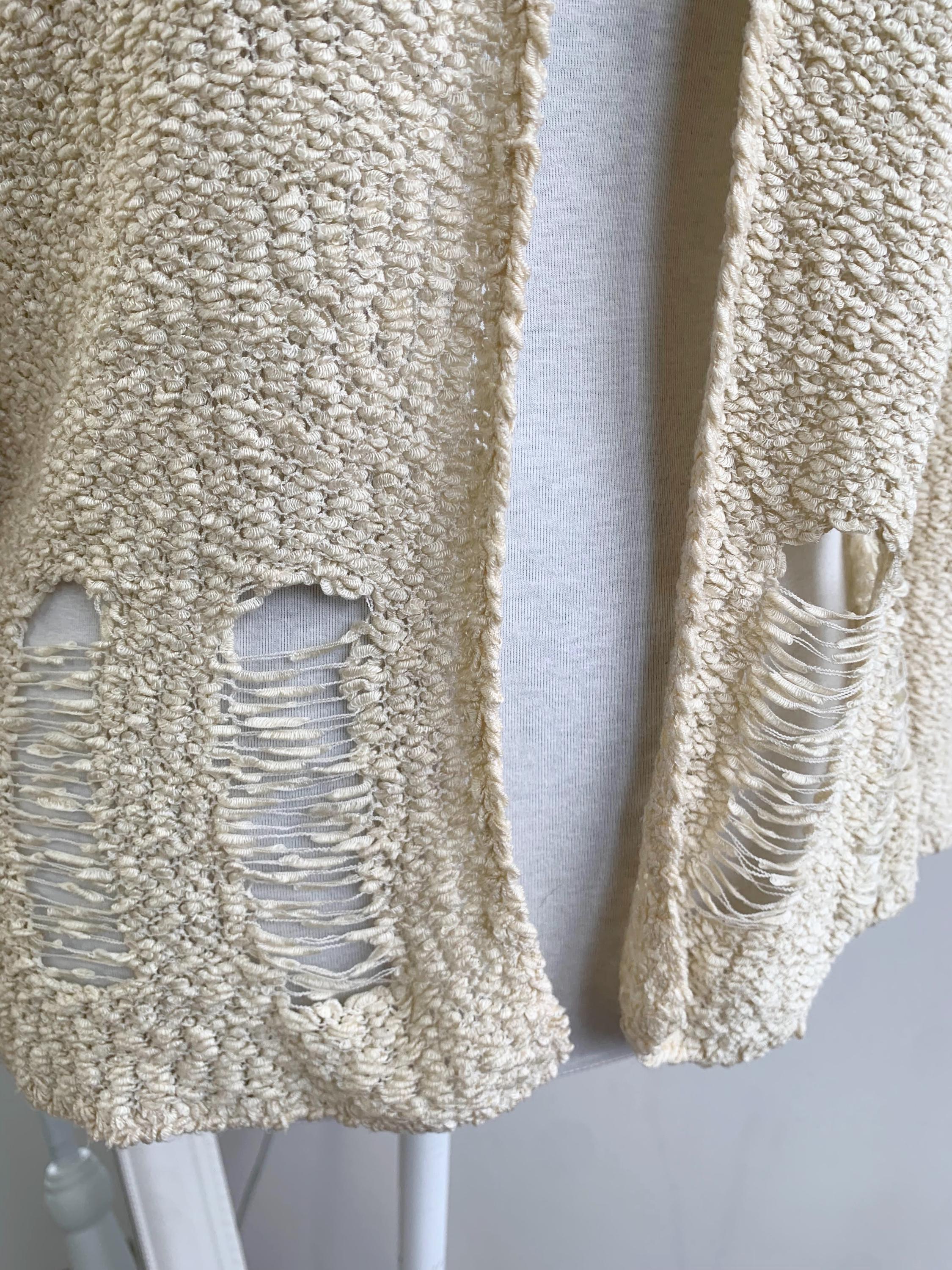 Step out in effortless bohemian style with this unique vintage distressed knit cardigan sweater in size S/M. Perfect for layering, this cream-colored open-front cardigan features a soft, textured wool-acrylic blend and a subtly grunge aesthetic thanks to its distressed and ripped accents near the hem. The tie-front closure adds a charming, relaxed detail, making it an ideal boho beach cover-up or a cozy shrug for a casual night out. Its versatile neutral shade and intricate coarse knitted texture make it a standout piece for any season. Whether you're dressing for a festival or looking for a lightweight layer, this beige open crochet cardigan adds a touch of retro chic to your wardrobe.