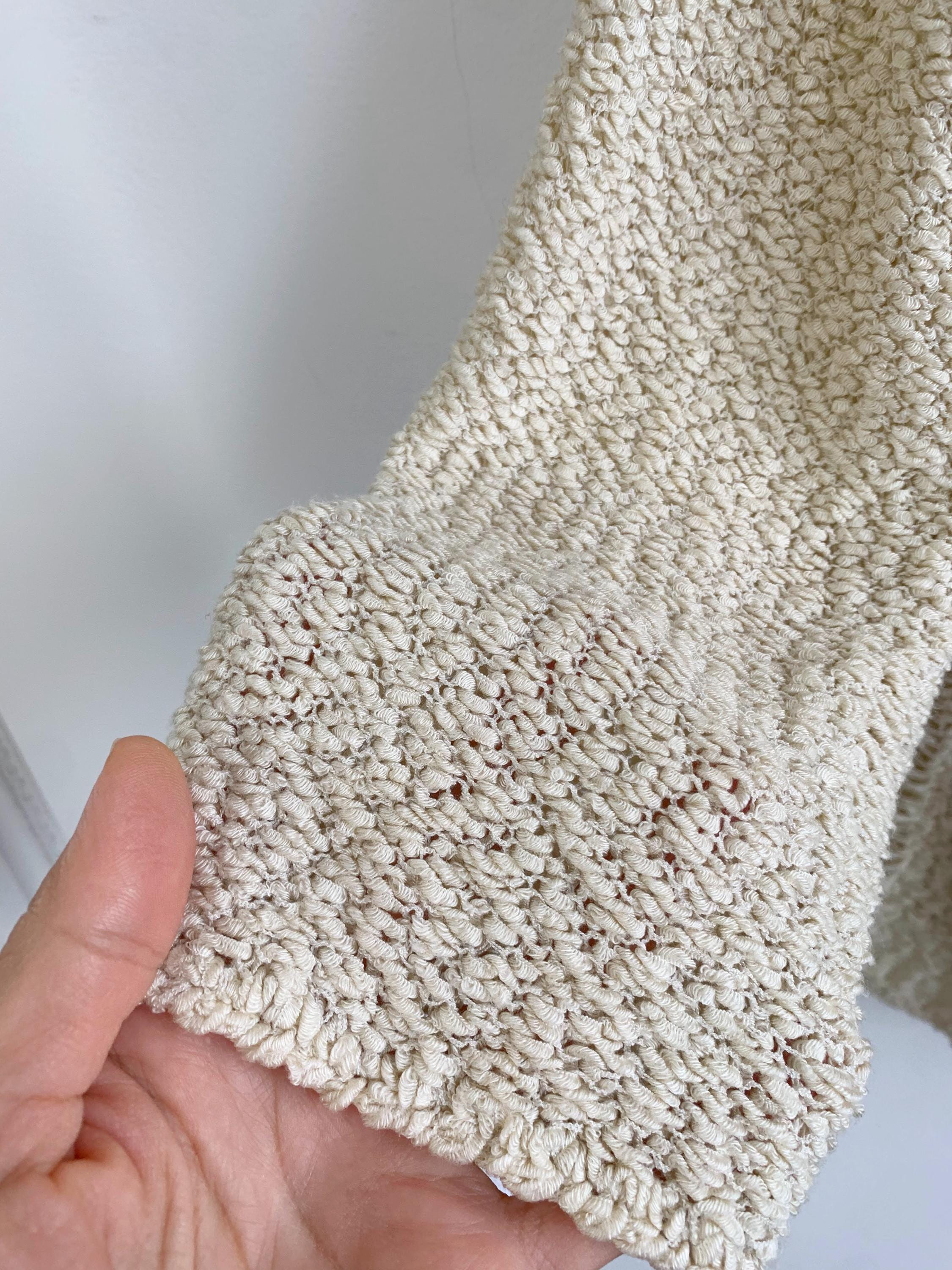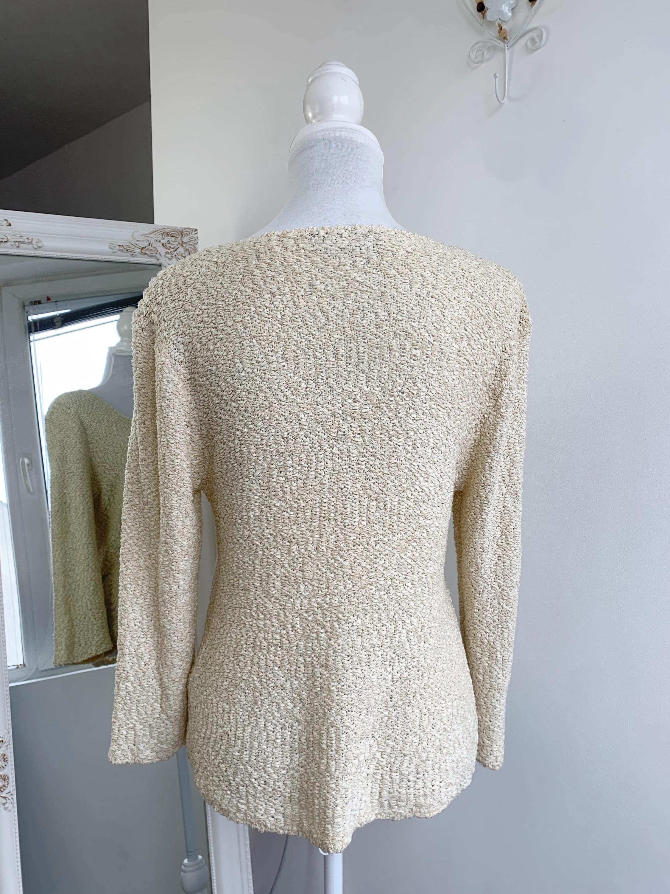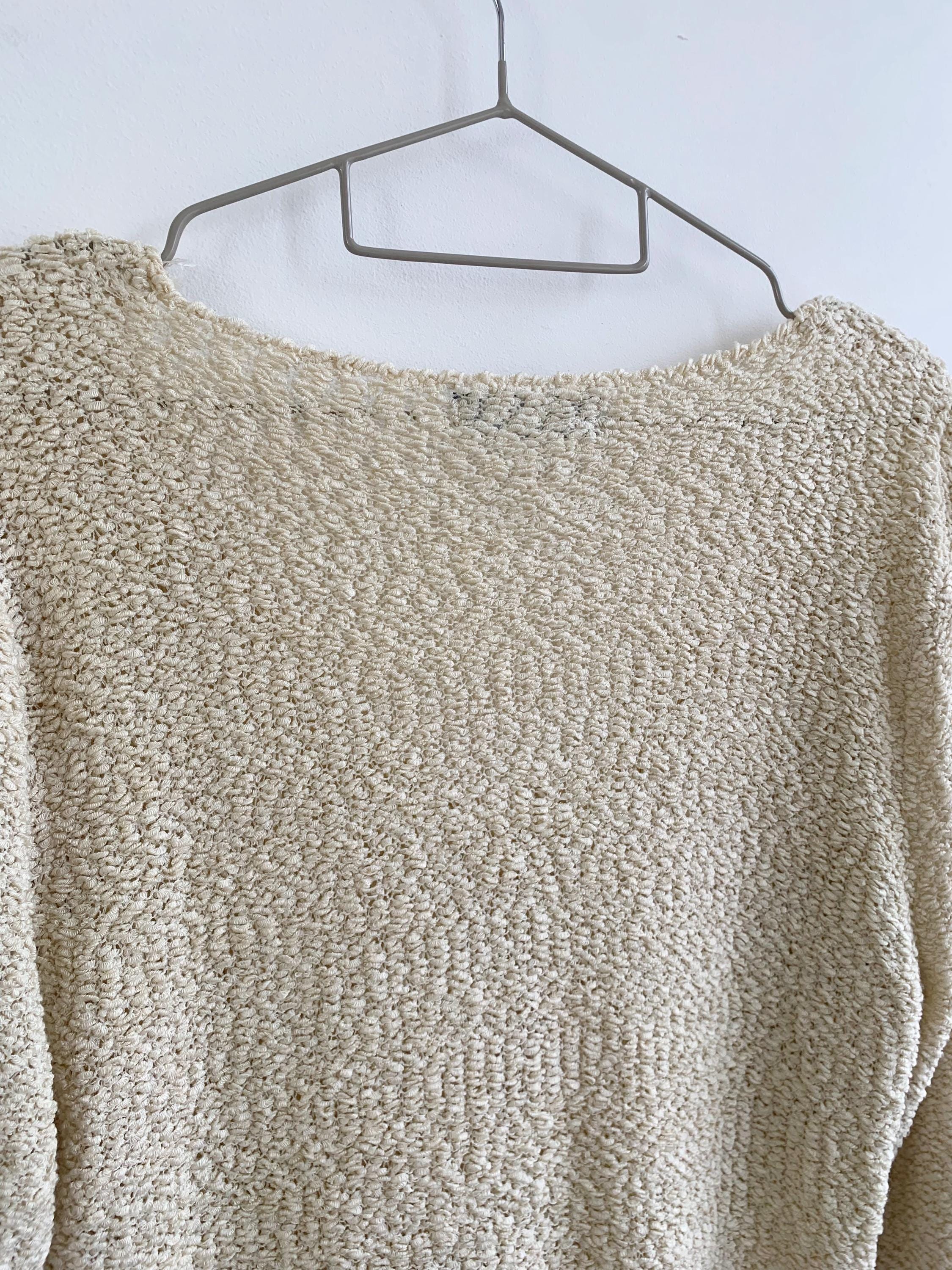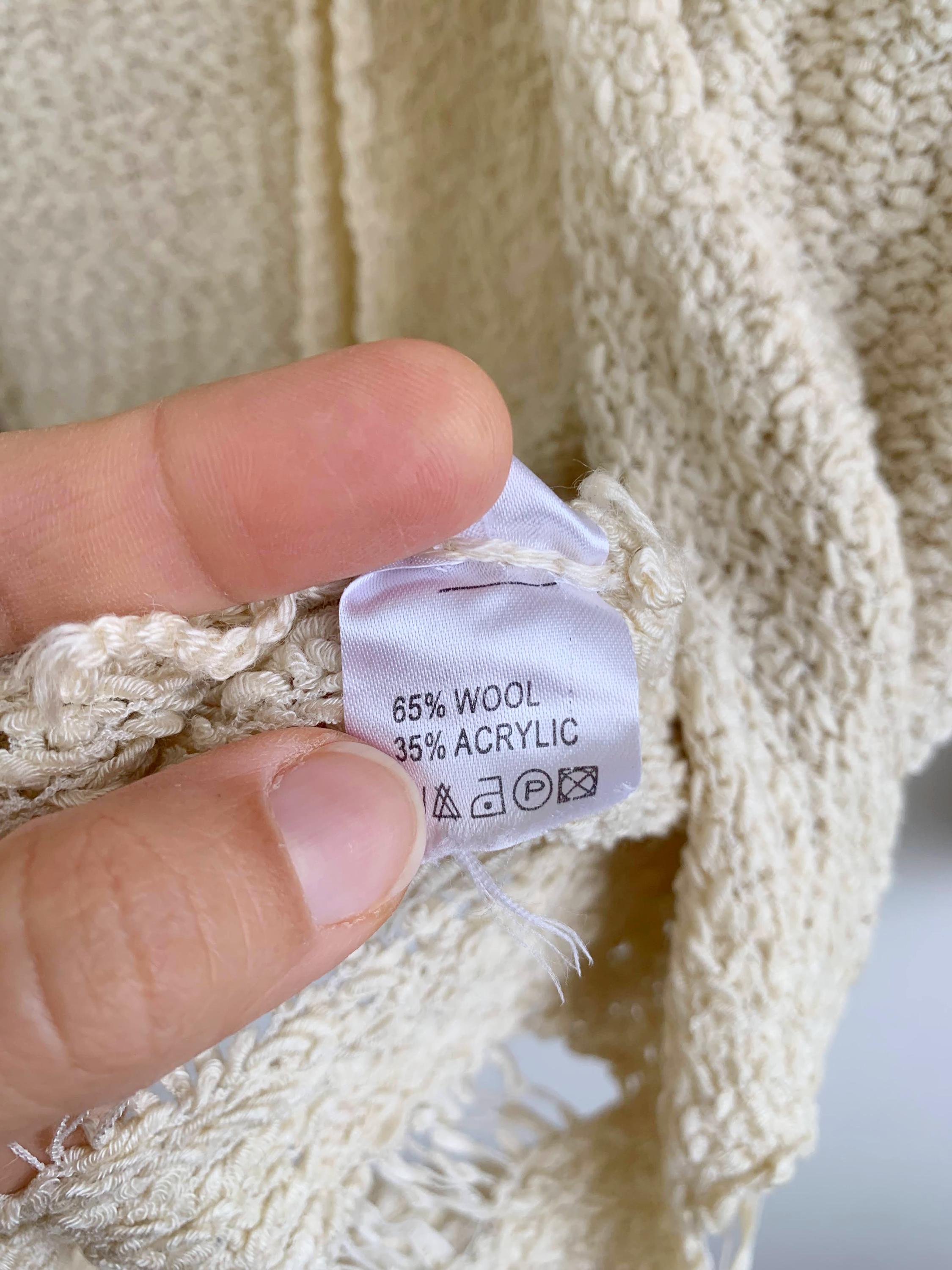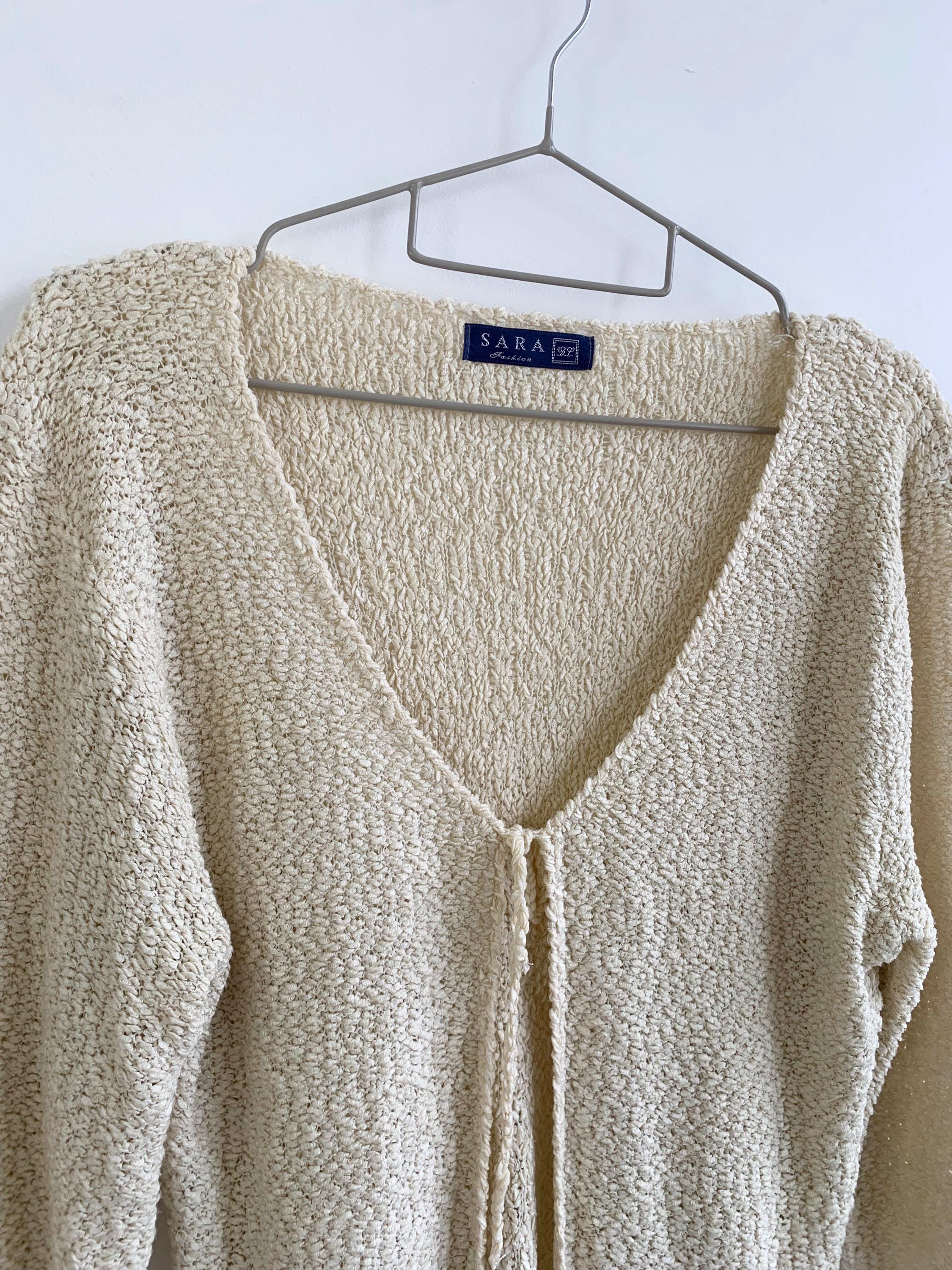 Step out in effortless bohemian style with this unique vintage distressed knit cardigan sweater in size S/M. Perfect for layering, this cream-colored open-front cardigan features a soft, textured wool-acrylic blend and a subtly grunge aesthetic thanks to its distressed and ripped accents near the hem. The tie-front closure adds a charming, relaxed detail, making it an ideal boho beach cover-up or a cozy shrug for a casual night out. Its versatile neutral shade and intricate coarse knitted texture make it a standout piece for any season. Whether you're dressing for a festival or looking for a lightweight layer, this beige open crochet cardigan adds a touch of retro chic to your wardrobe.