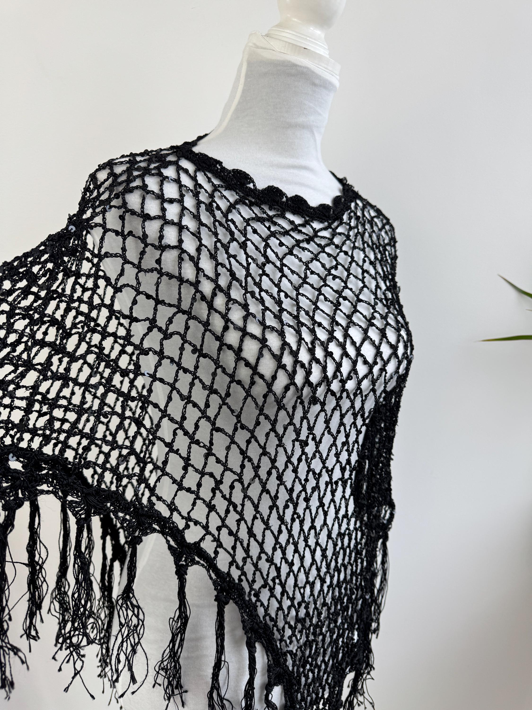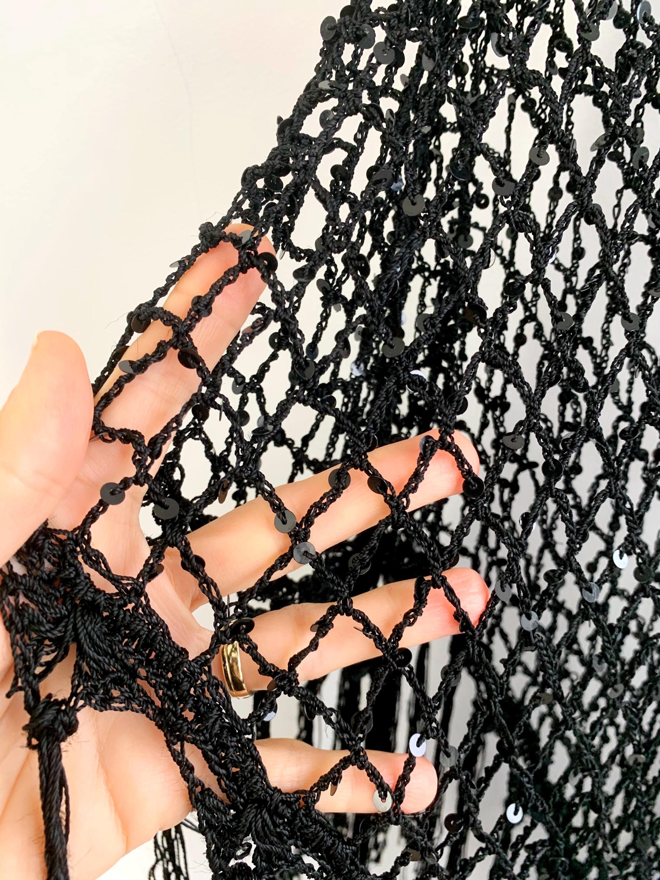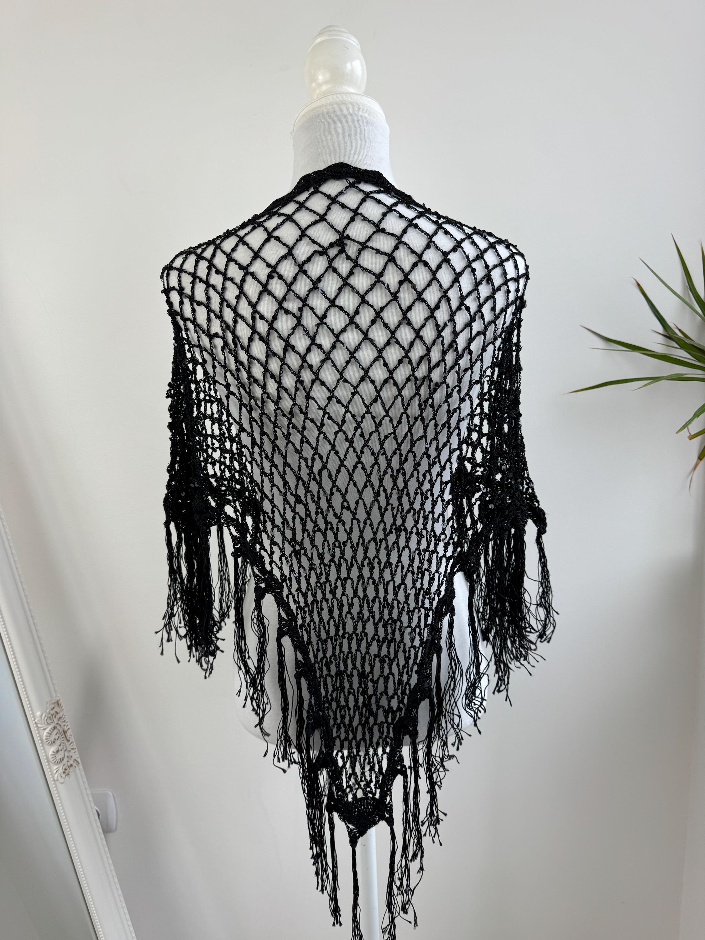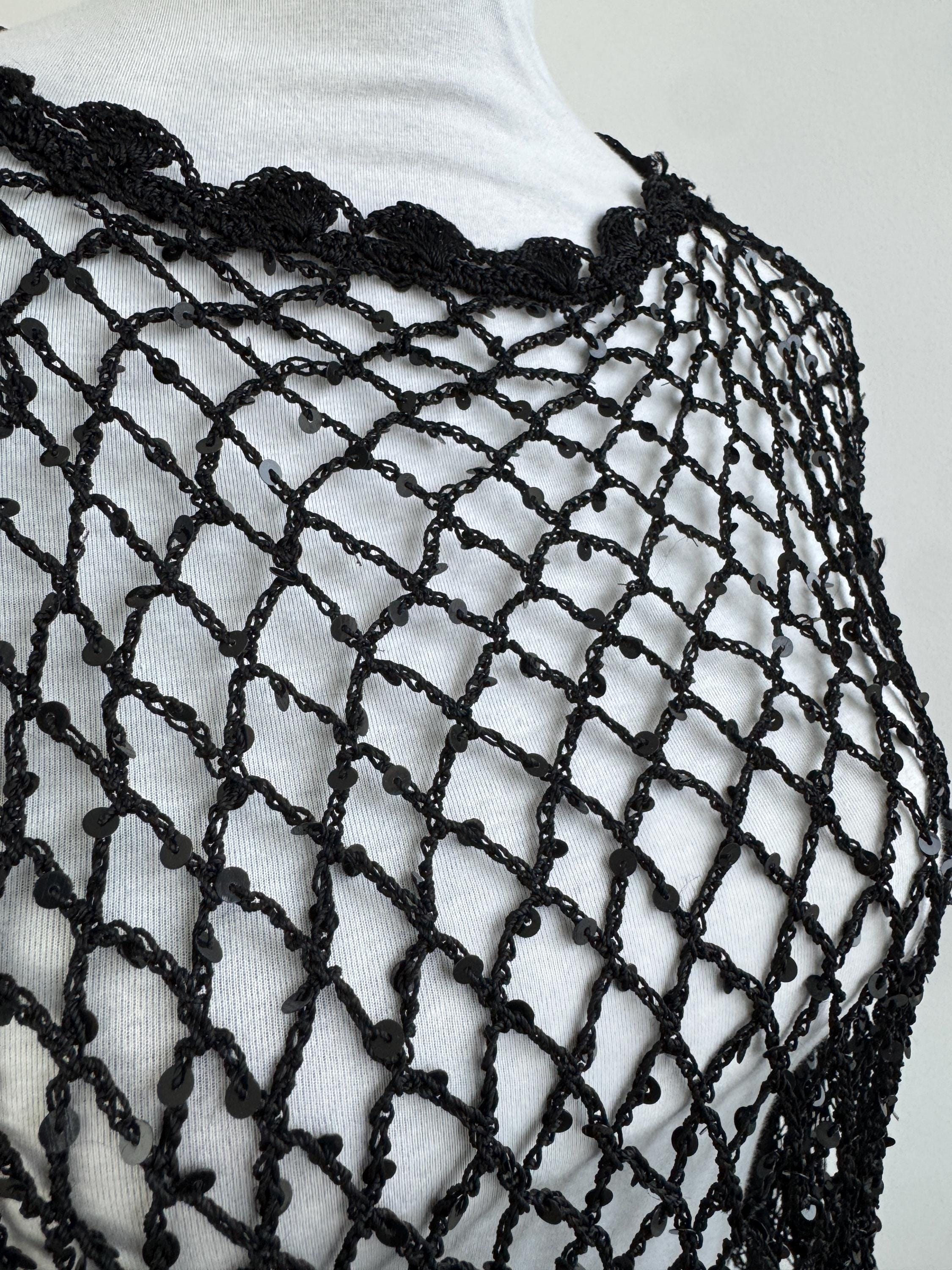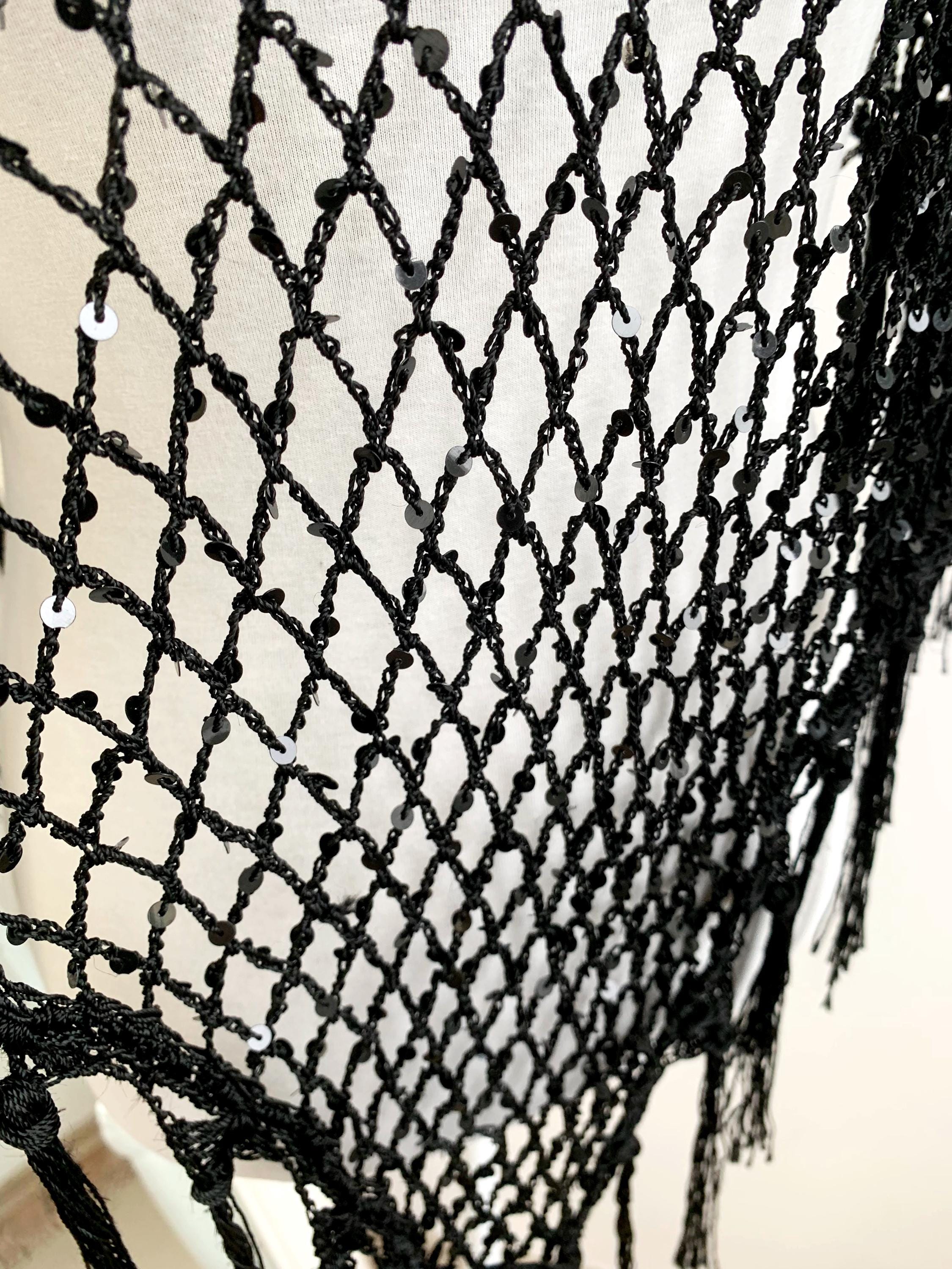 Make a dazzling entrance with this striking vintage sequin crochet poncho shawl. This dramatic black fishnet top is crocheted in a classic diamond pattern and liberally embellished with small shimmering black sequins, catching the light with every movement. Complete with a playful fringe hem, this piece screams 1920s flapper glamour mixed with 90s and Y2K party style. It’s the perfect disco club cover-up or a sensational accessory for festival and rave wear. Drape it over a slip dress for an elegant evening look, or layer it over a bikini for a chic beach/poolside vibe. This unique shawl is designed to fit most and instantly adds a touch of bold, vintage sparkle to any outfit.