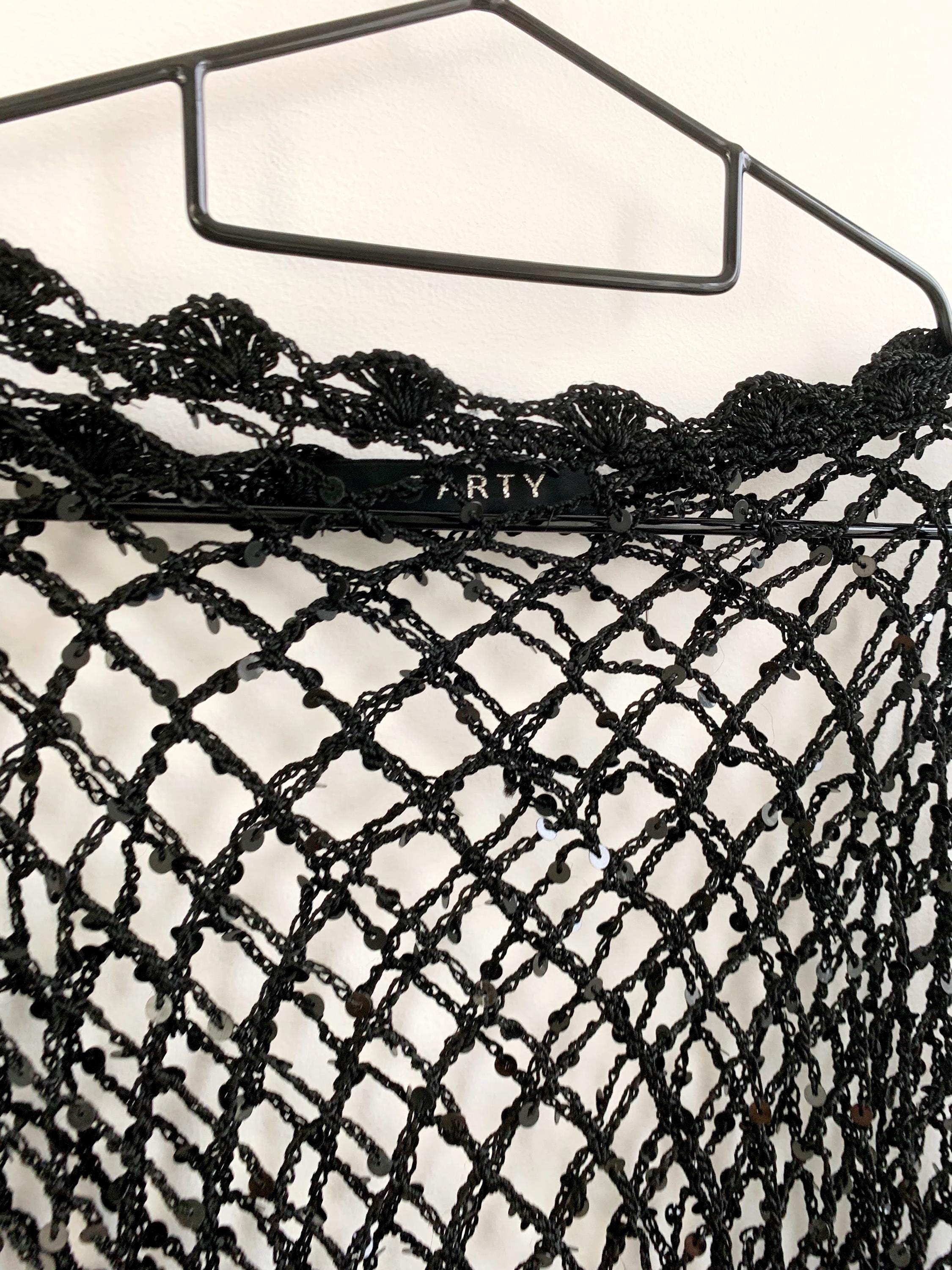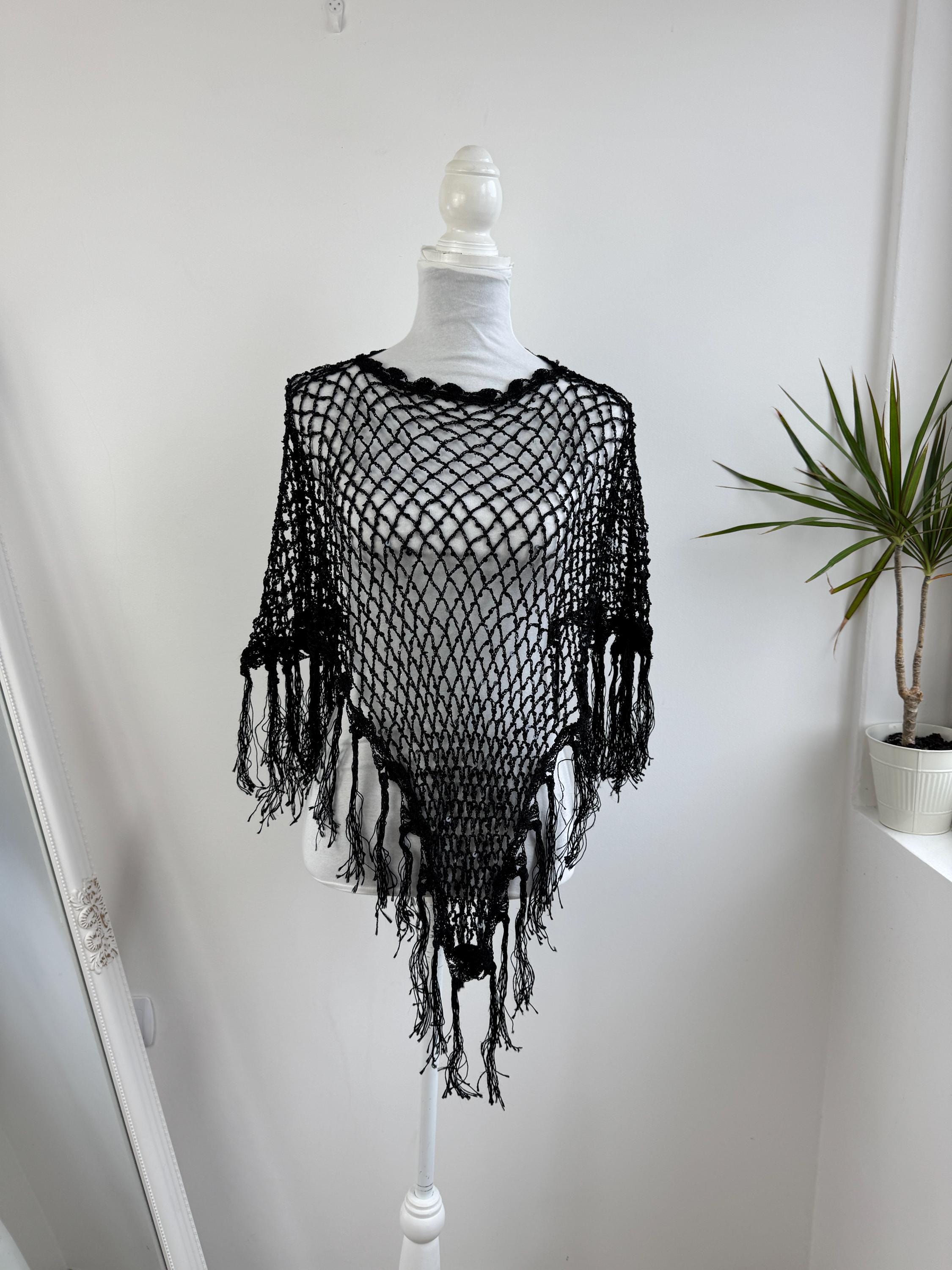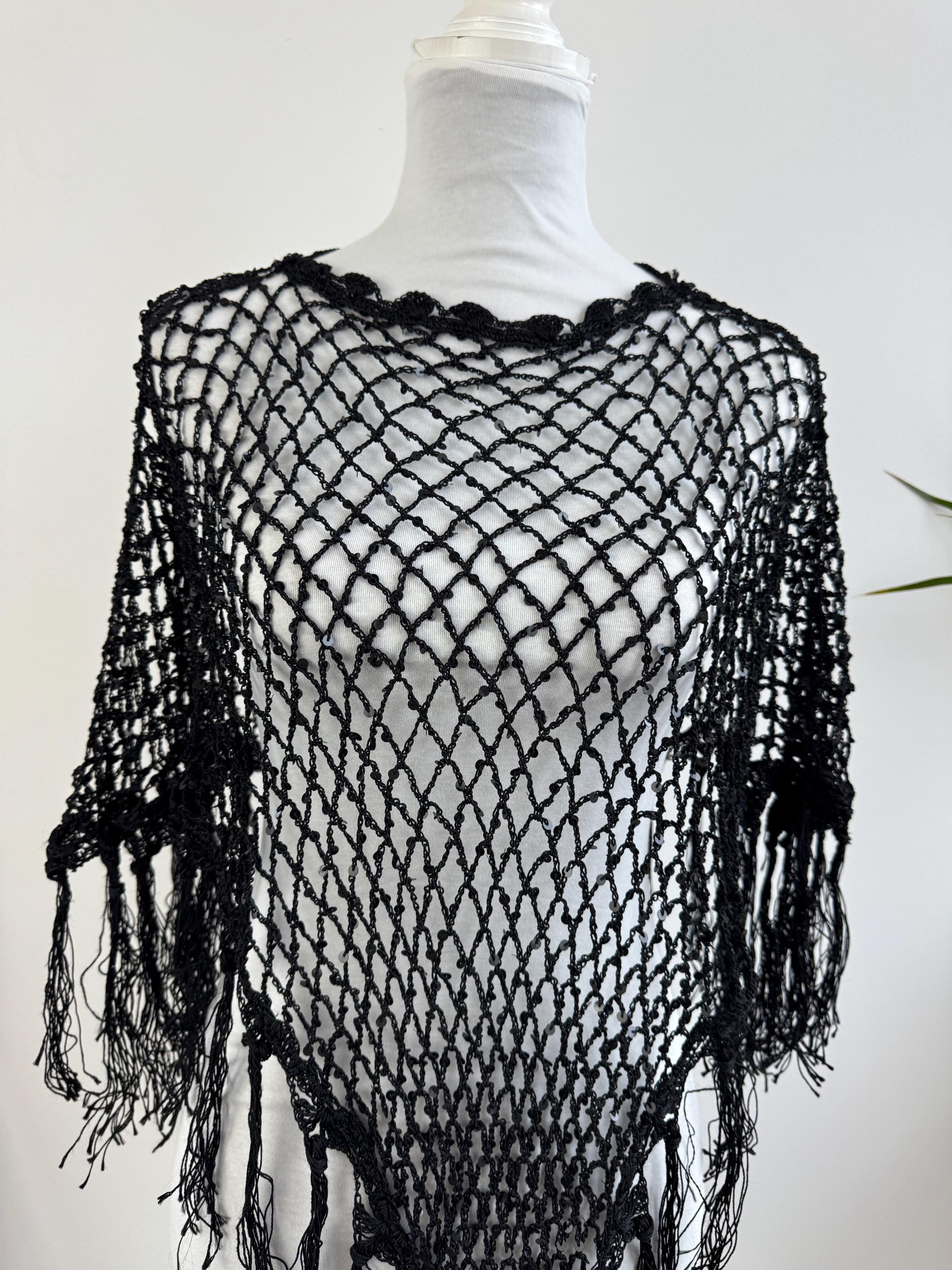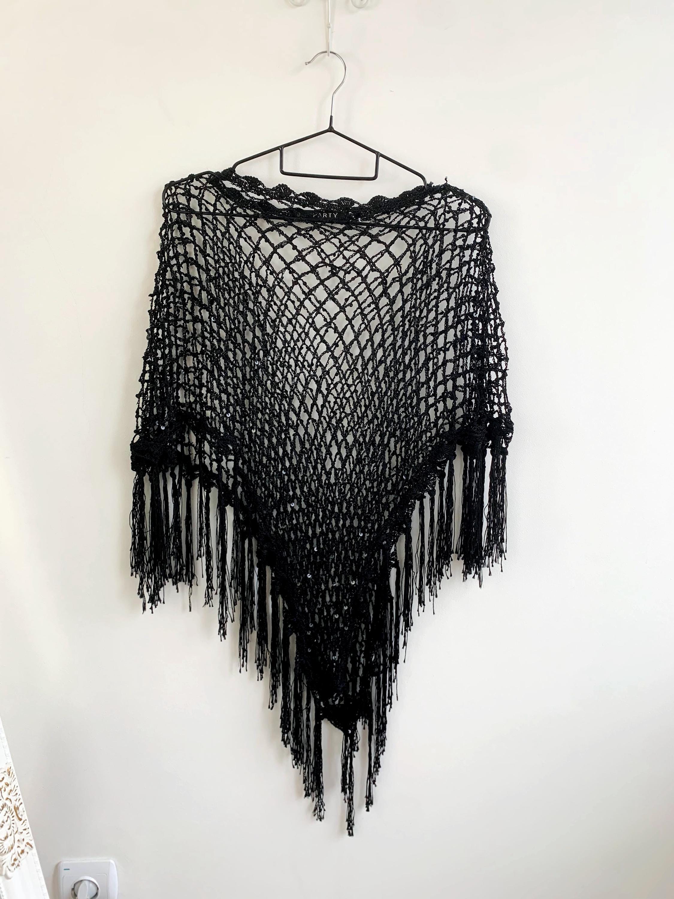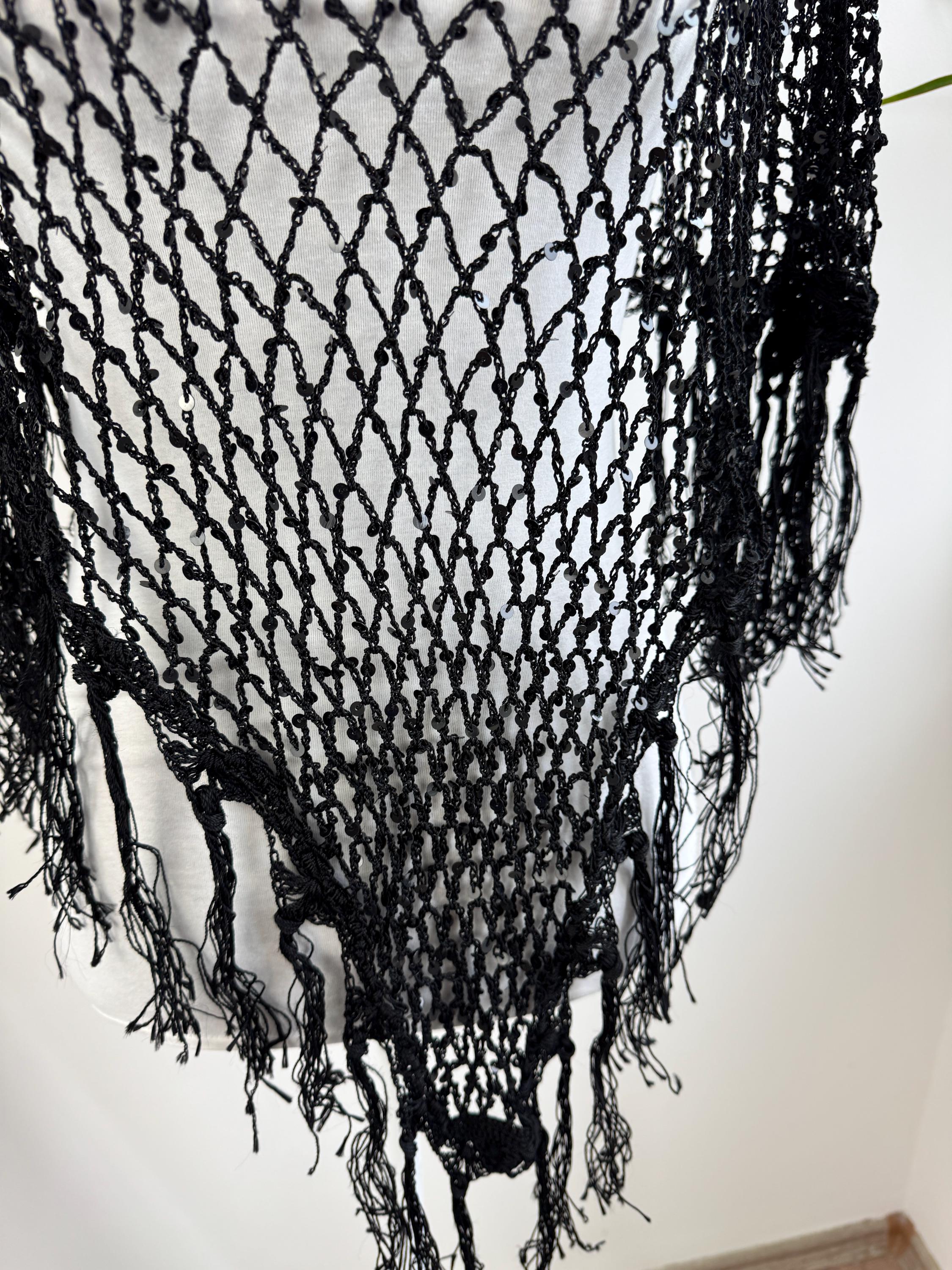 Make a dazzling entrance with this striking vintage sequin crochet poncho shawl. This dramatic black fishnet top is crocheted in a classic diamond pattern and liberally embellished with small shimmering black sequins, catching the light with every movement. Complete with a playful fringe hem, this piece screams 1920s flapper glamour mixed with 90s and Y2K party style. It’s the perfect disco club cover-up or a sensational accessory for festival and rave wear. Drape it over a slip dress for an elegant evening look, or layer it over a bikini for a chic beach/poolside vibe. This unique shawl is designed to fit most and instantly adds a touch of bold, vintage sparkle to any outfit.