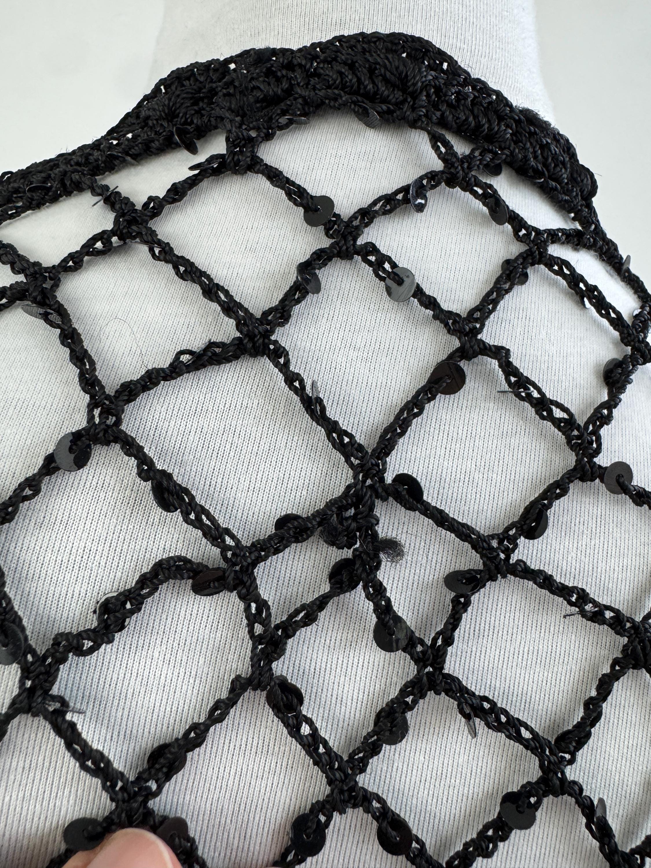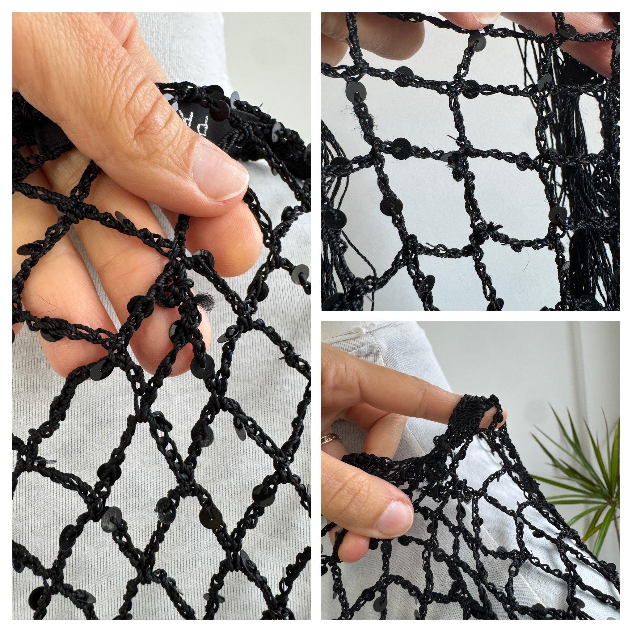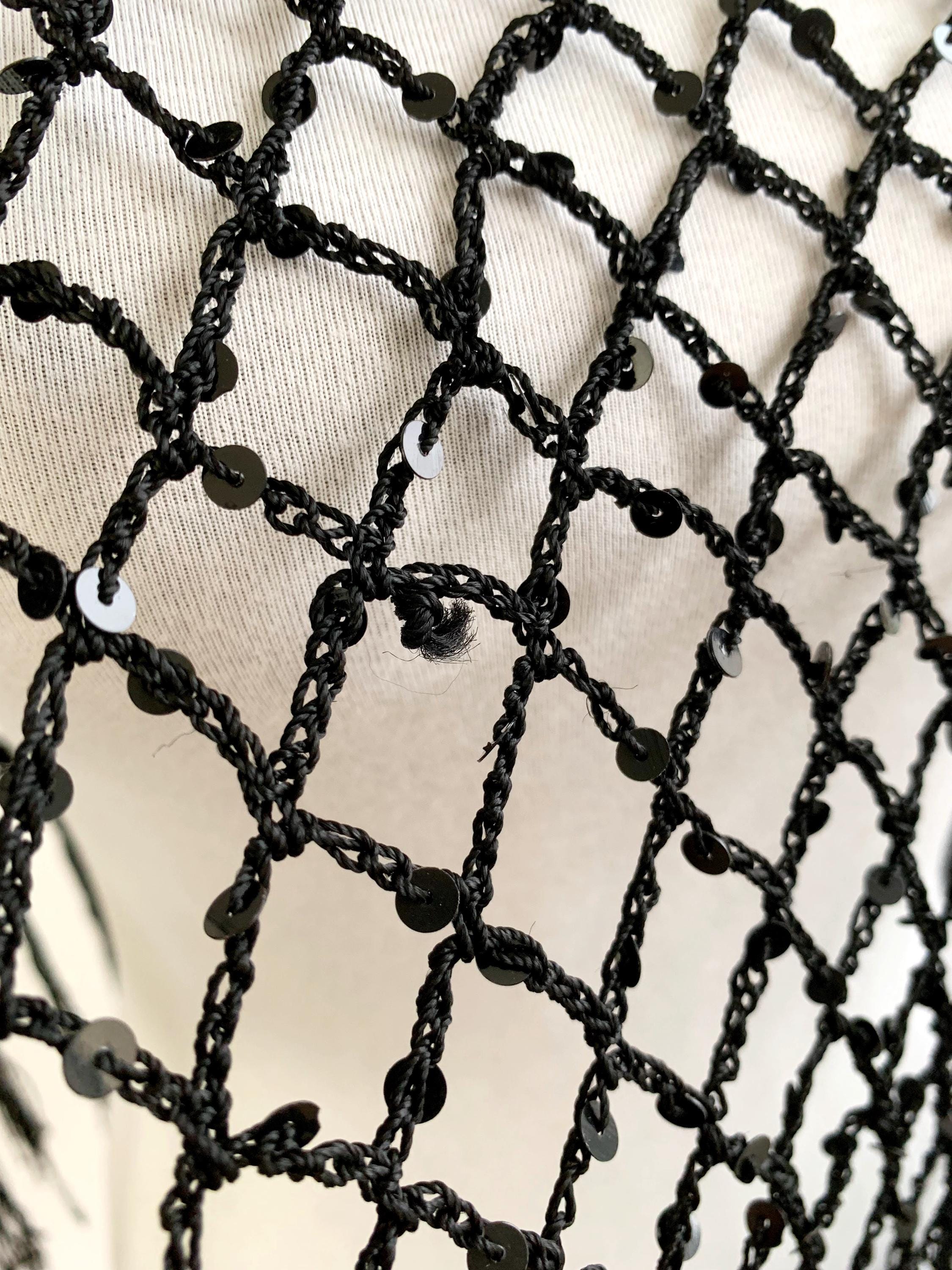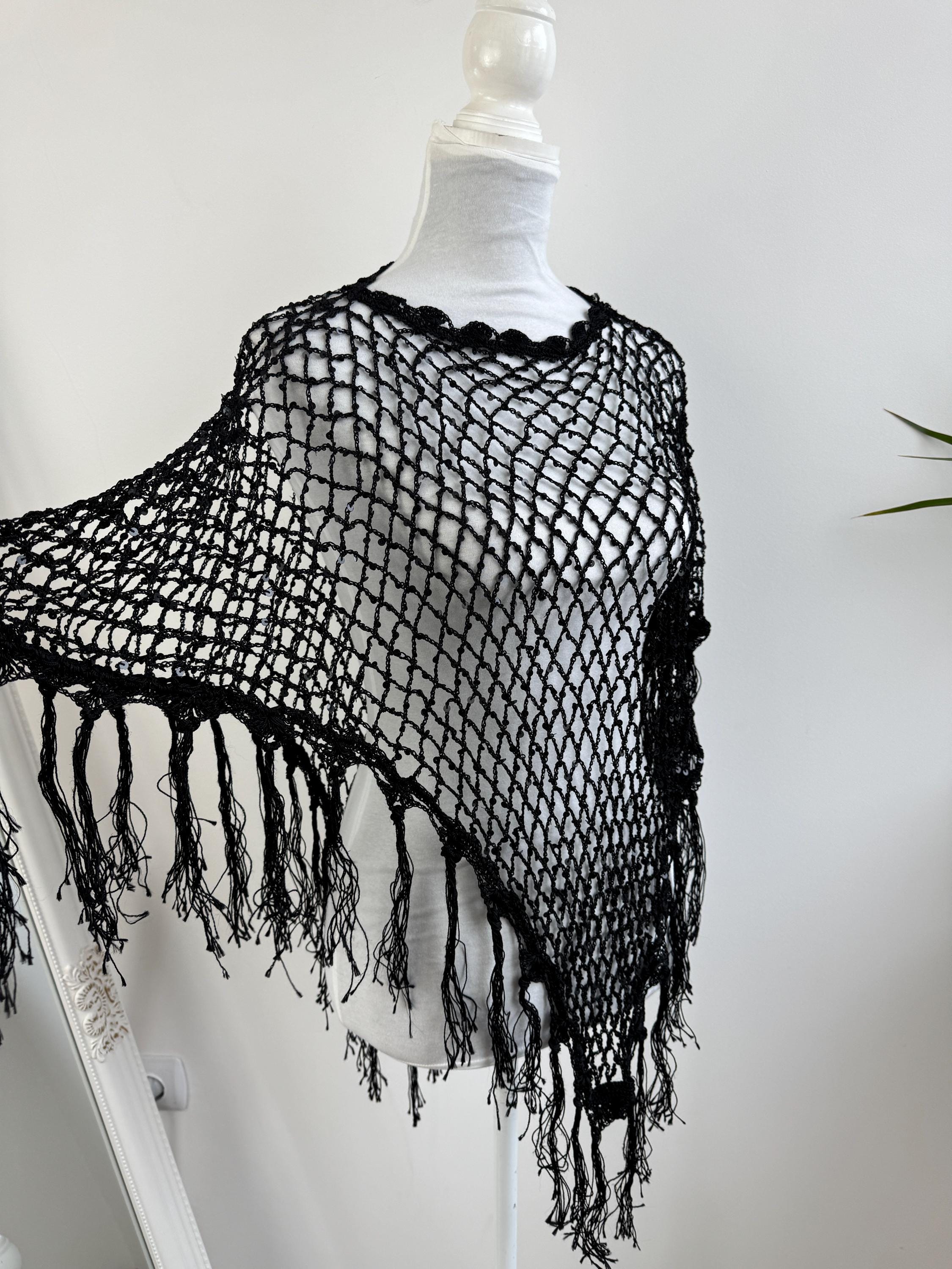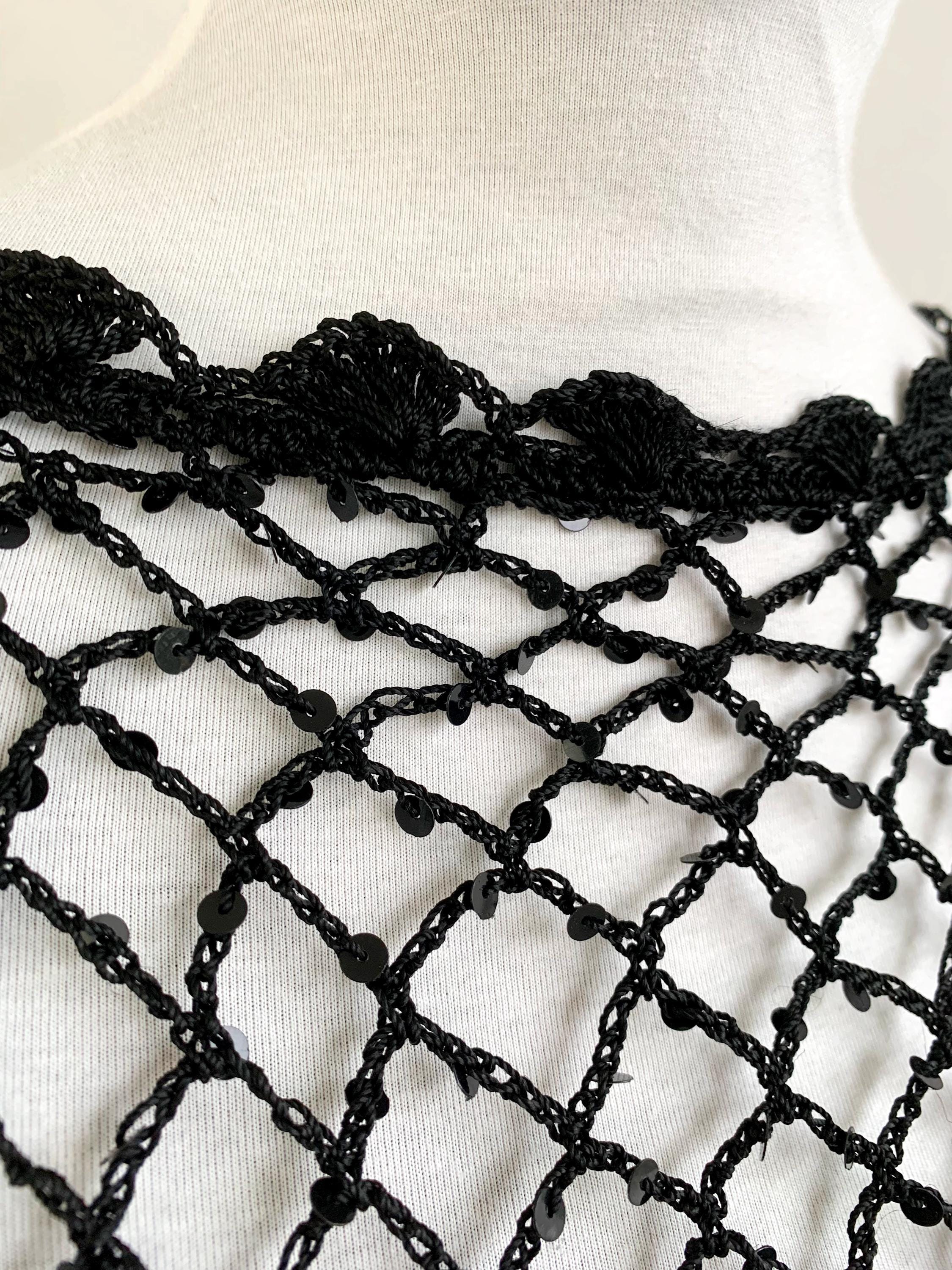 Make a dazzling entrance with this striking vintage sequin crochet poncho shawl. This dramatic black fishnet top is crocheted in a classic diamond pattern and liberally embellished with small shimmering black sequins, catching the light with every movement. Complete with a playful fringe hem, this piece screams 1920s flapper glamour mixed with 90s and Y2K party style. It’s the perfect disco club cover-up or a sensational accessory for festival and rave wear. Drape it over a slip dress for an elegant evening look, or layer it over a bikini for a chic beach/poolside vibe. This unique shawl is designed to fit most and instantly adds a touch of bold, vintage sparkle to any outfit.