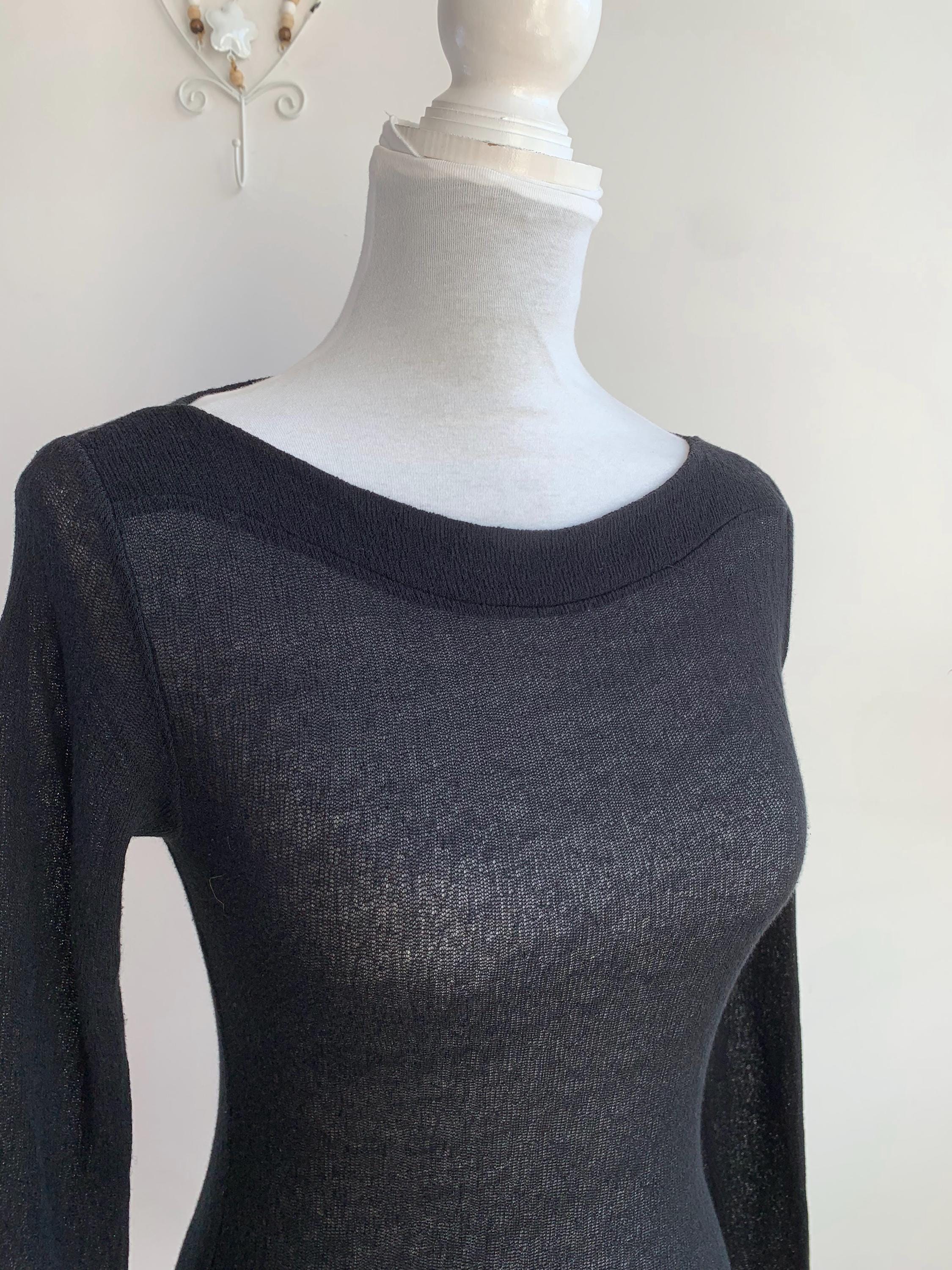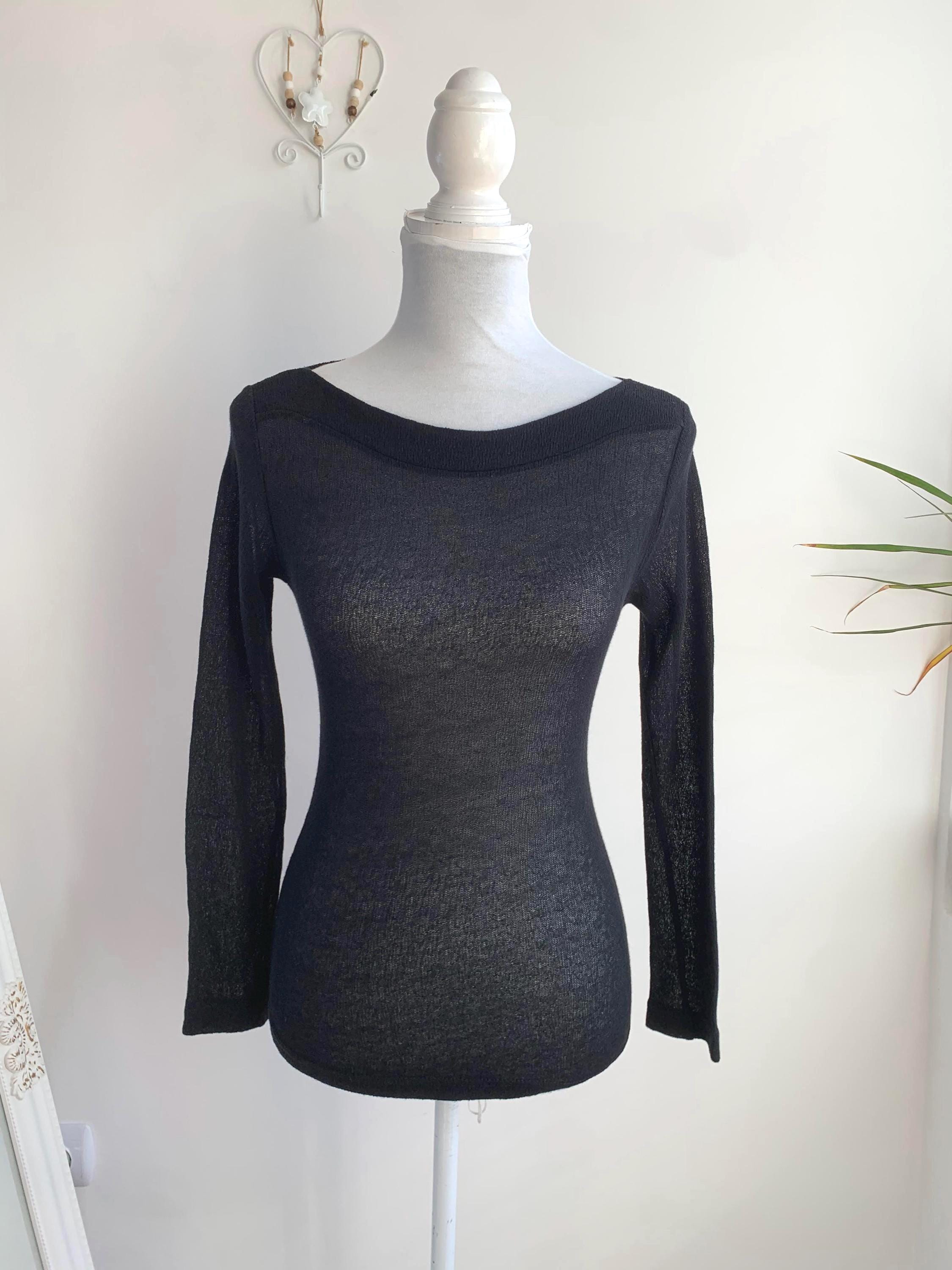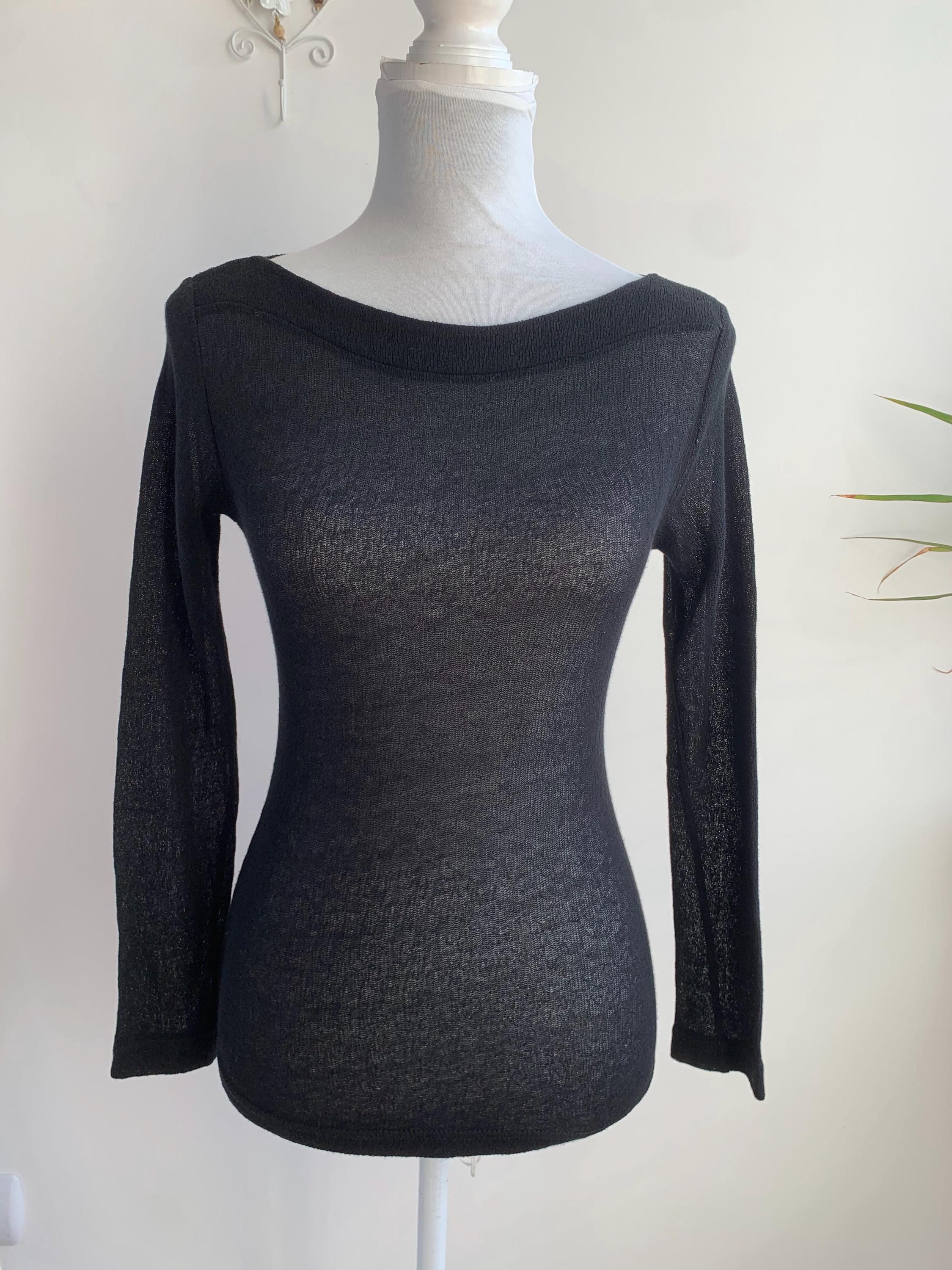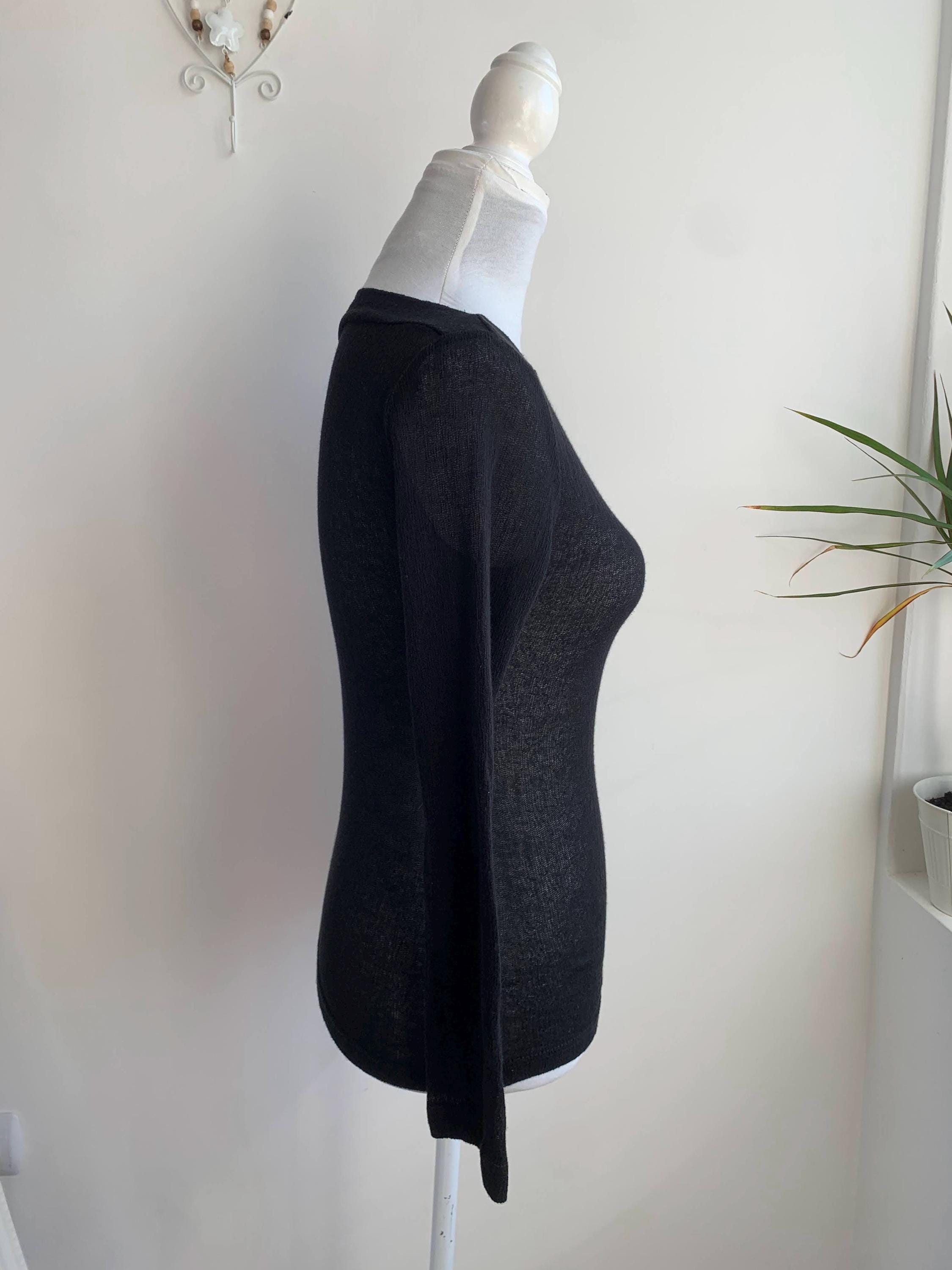 This is a vintage Ter et Bantine sheer black long sleeve sweater with boat neck in size S. This Italian fashion mesh sweater is made of stretchy lightweight synthetic fabric which has a textured finish and a good bit of stretch. This mesh lightweight sweater is perfect for the spring/ fall season. Perfect semi sheer sweater for any occasion to achieve a minimalist look. This see through blouse has size 44 marked on the label. It fits like size S. It was made in Italy. Please check the measurements below.