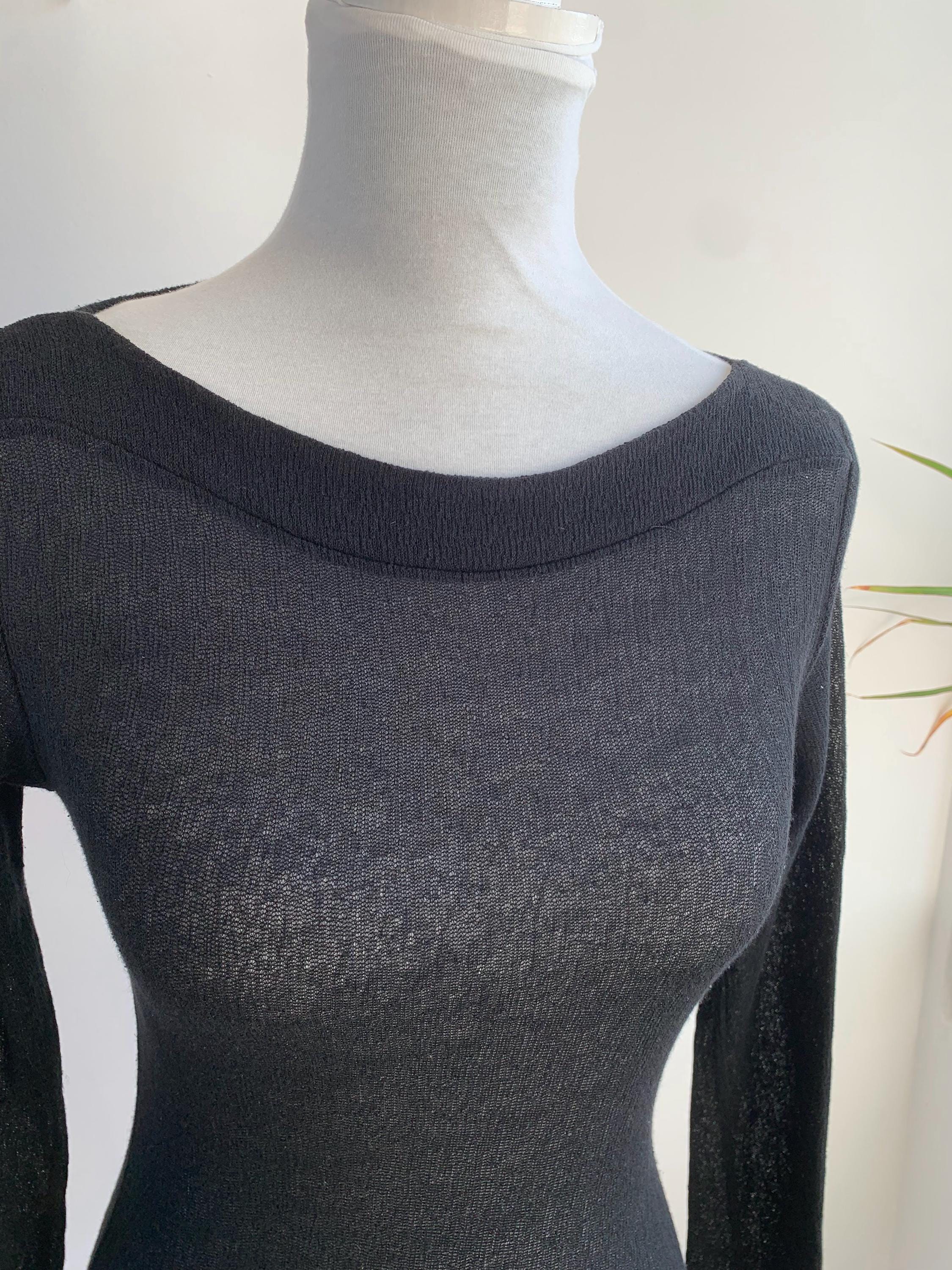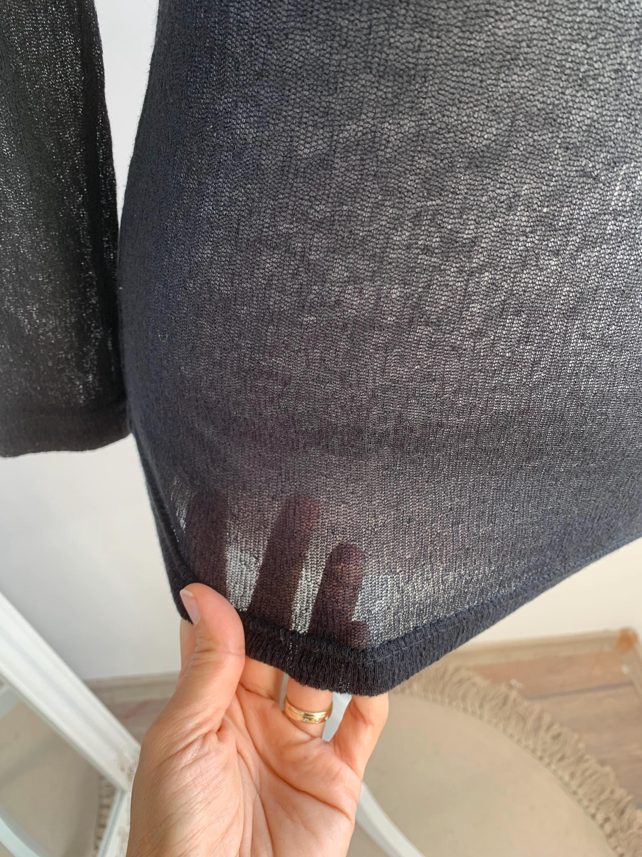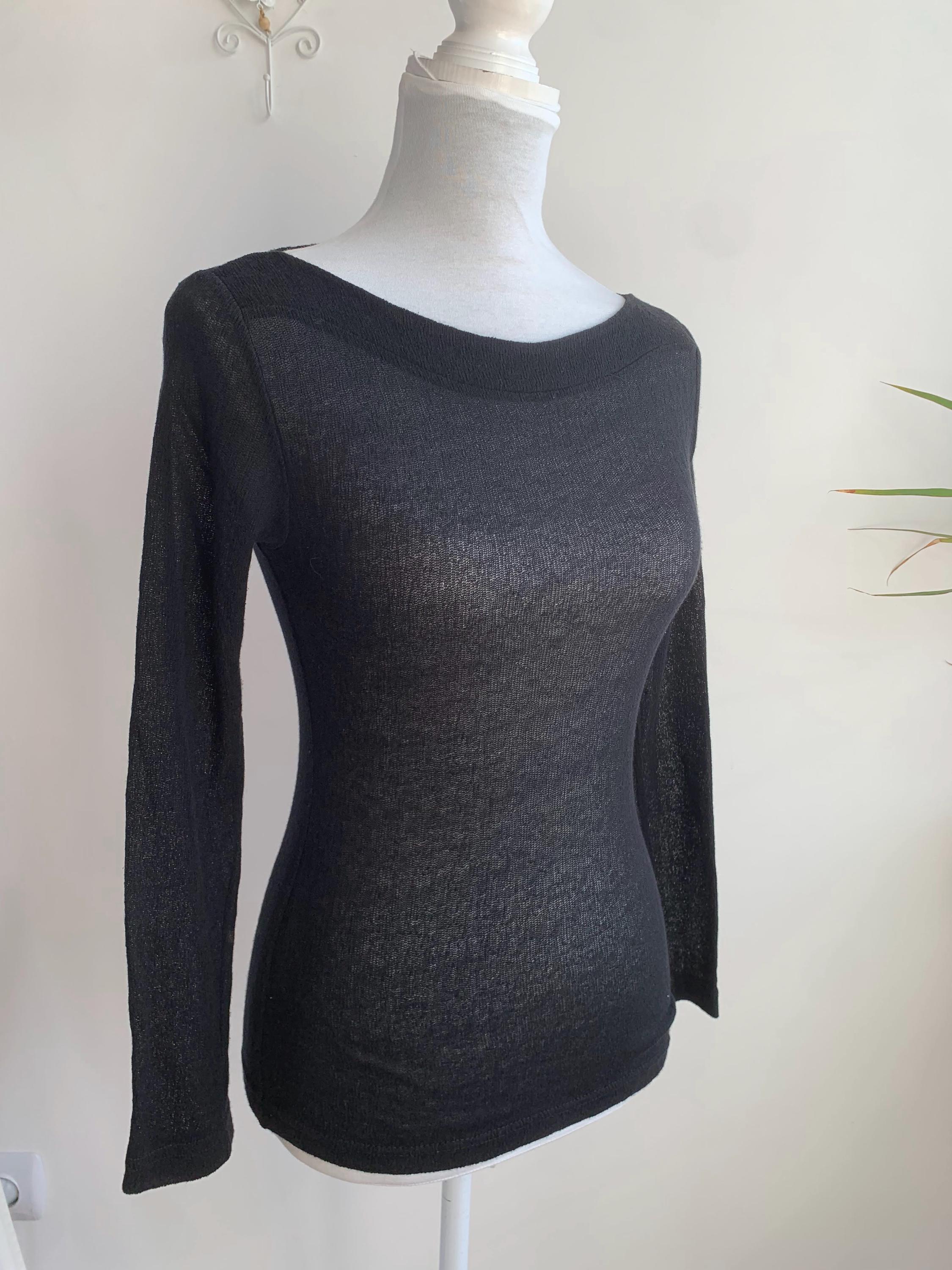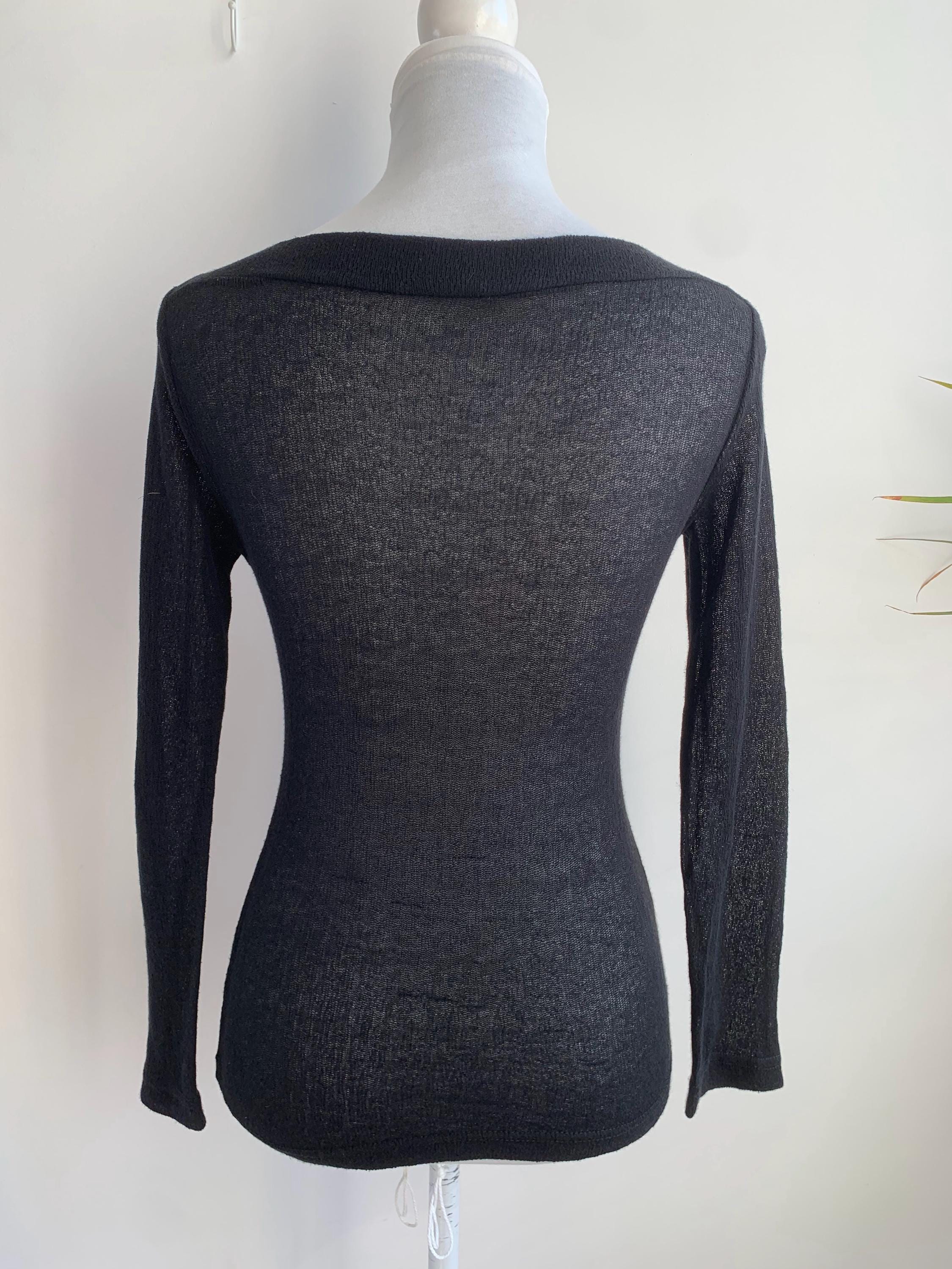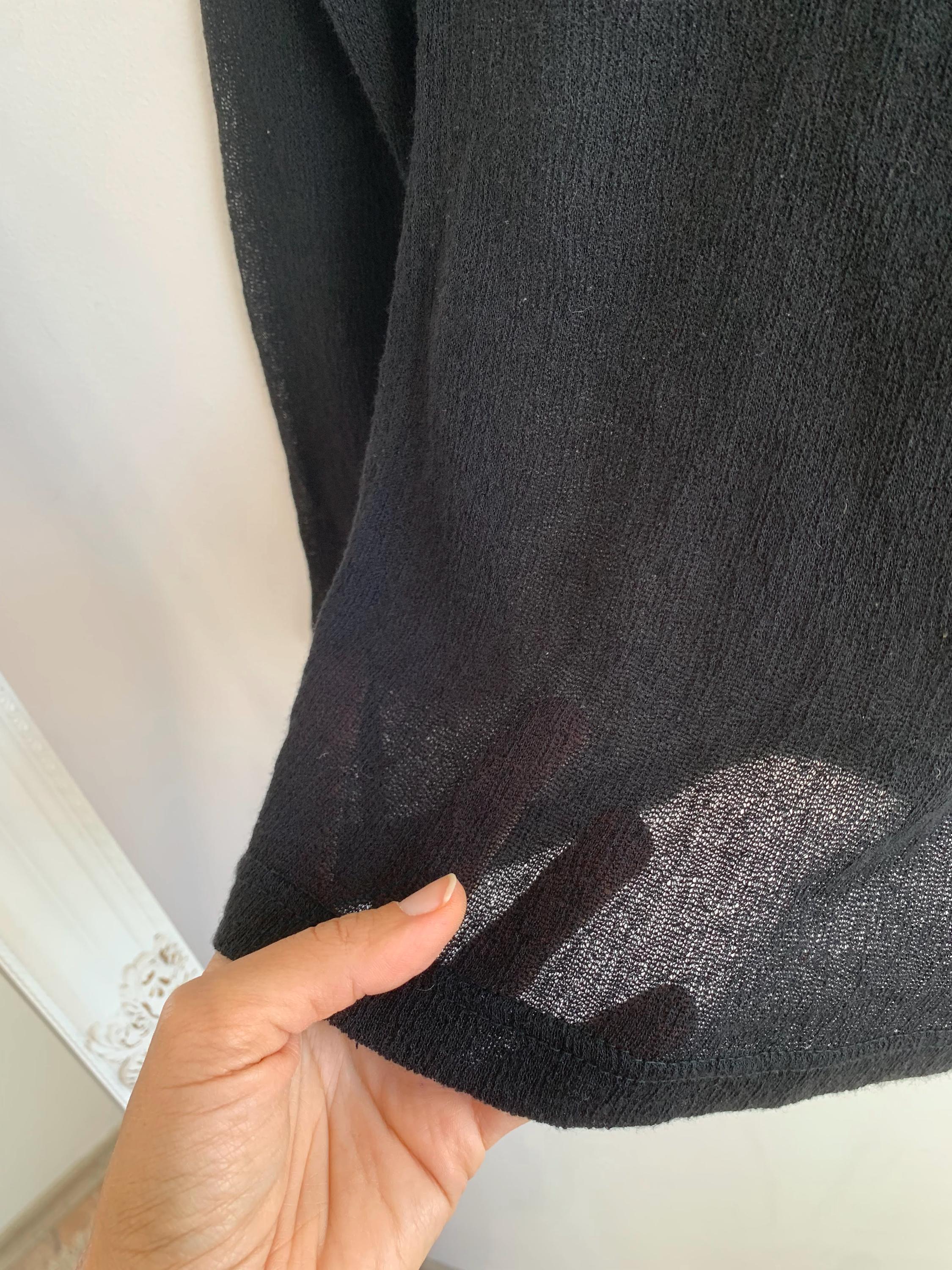 This is a vintage Ter et Bantine sheer black long sleeve sweater with boat neck in size S. This Italian fashion mesh sweater is made of stretchy lightweight synthetic fabric which has a textured finish and a good bit of stretch. This mesh lightweight sweater is perfect for the spring/ fall season. Perfect semi sheer sweater for any occasion to achieve a minimalist look. This see through blouse has size 44 marked on the label. It fits like size S. It was made in Italy. Please check the measurements below.