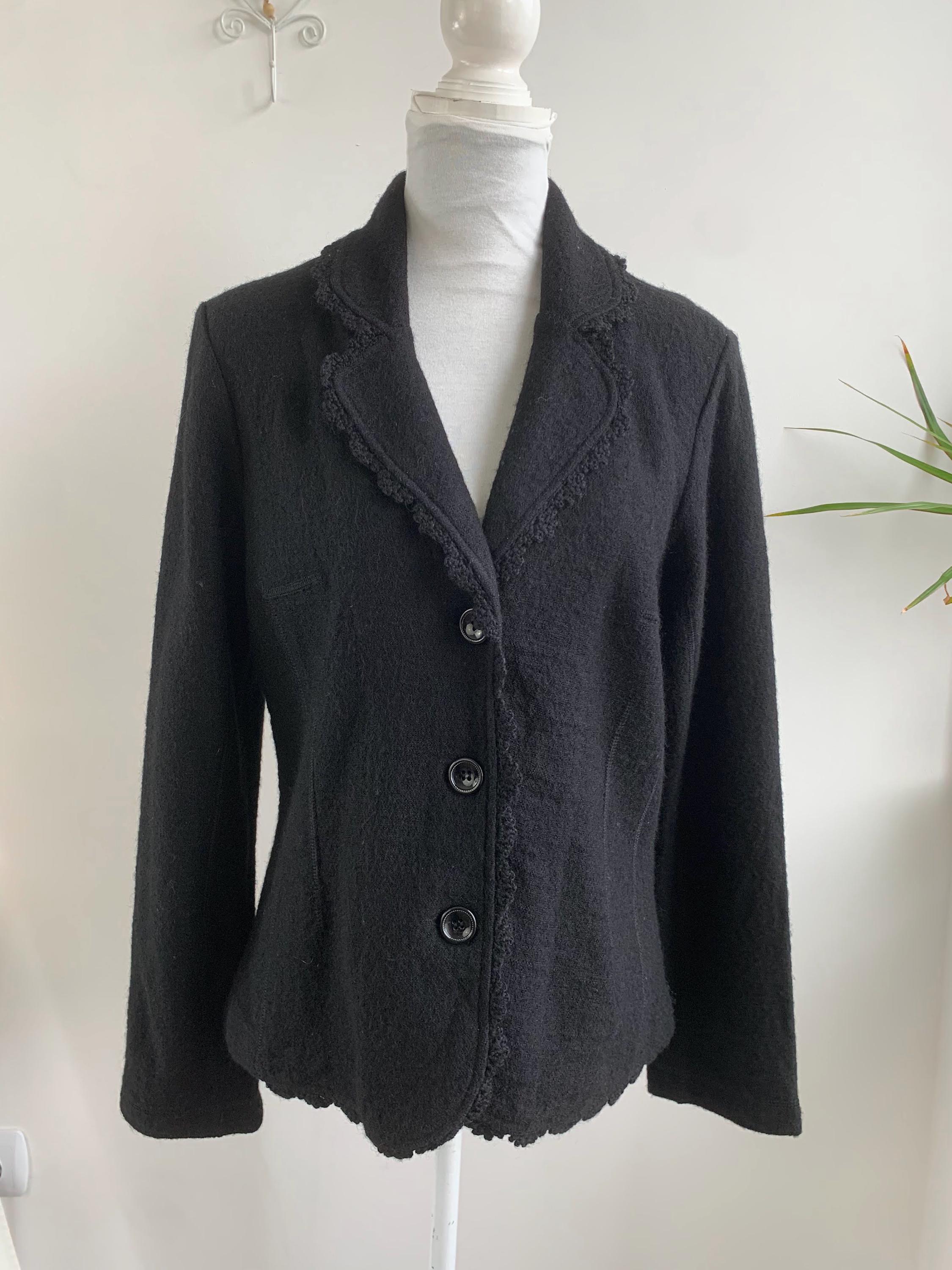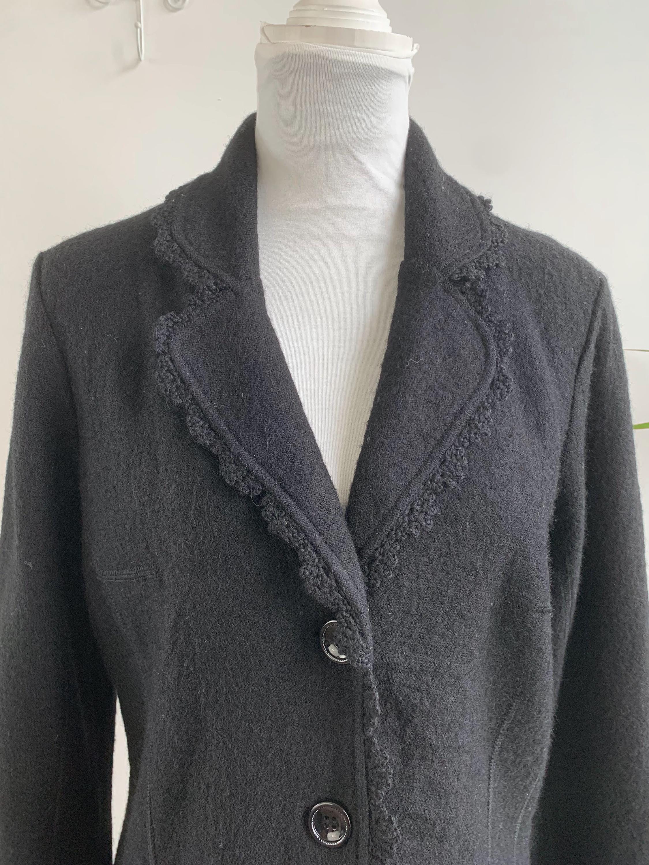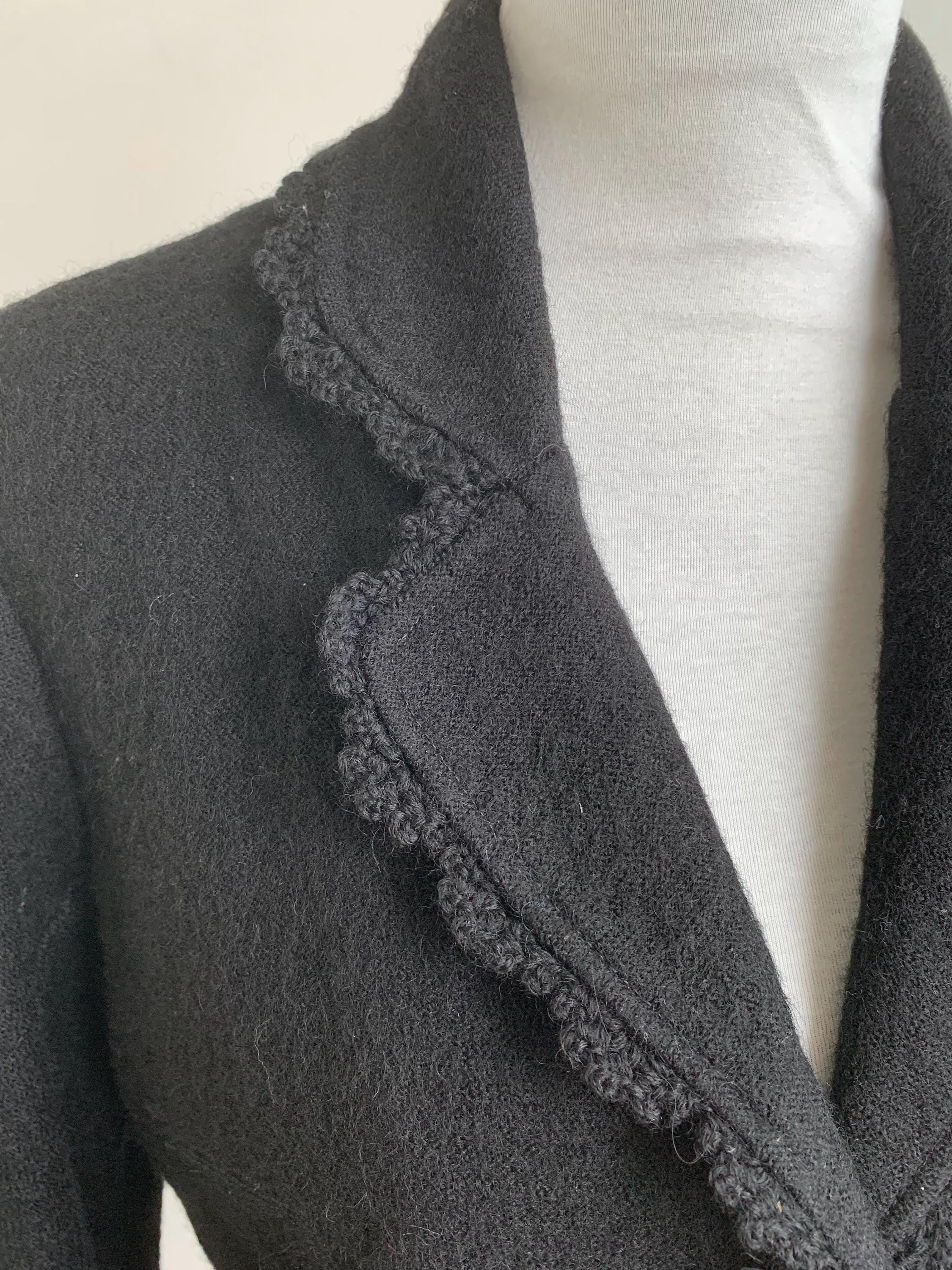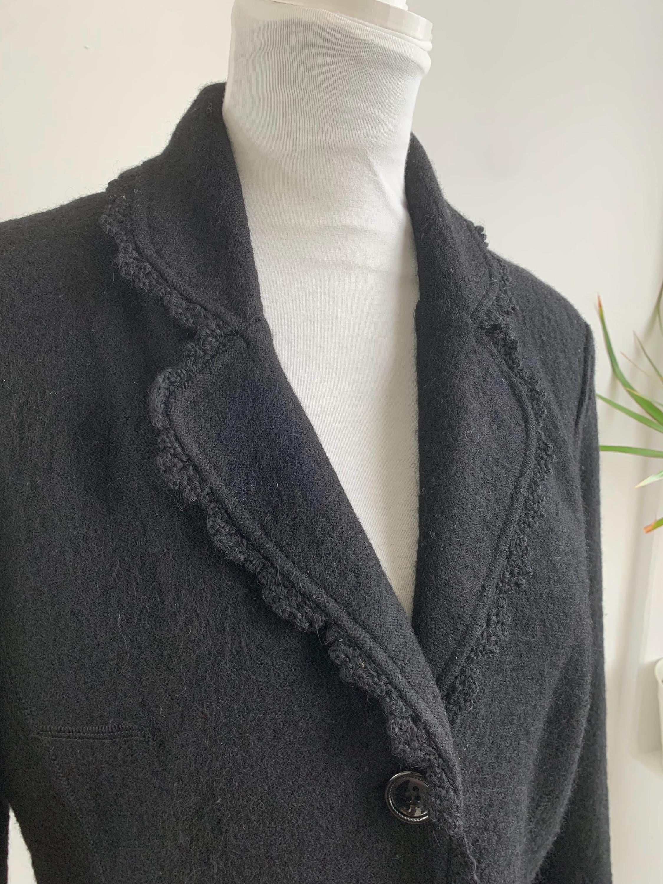 Timeless Elegance: Vintage Tara Collection Black Wool Blend Jacket with Delicate Crochet Trim in size M.