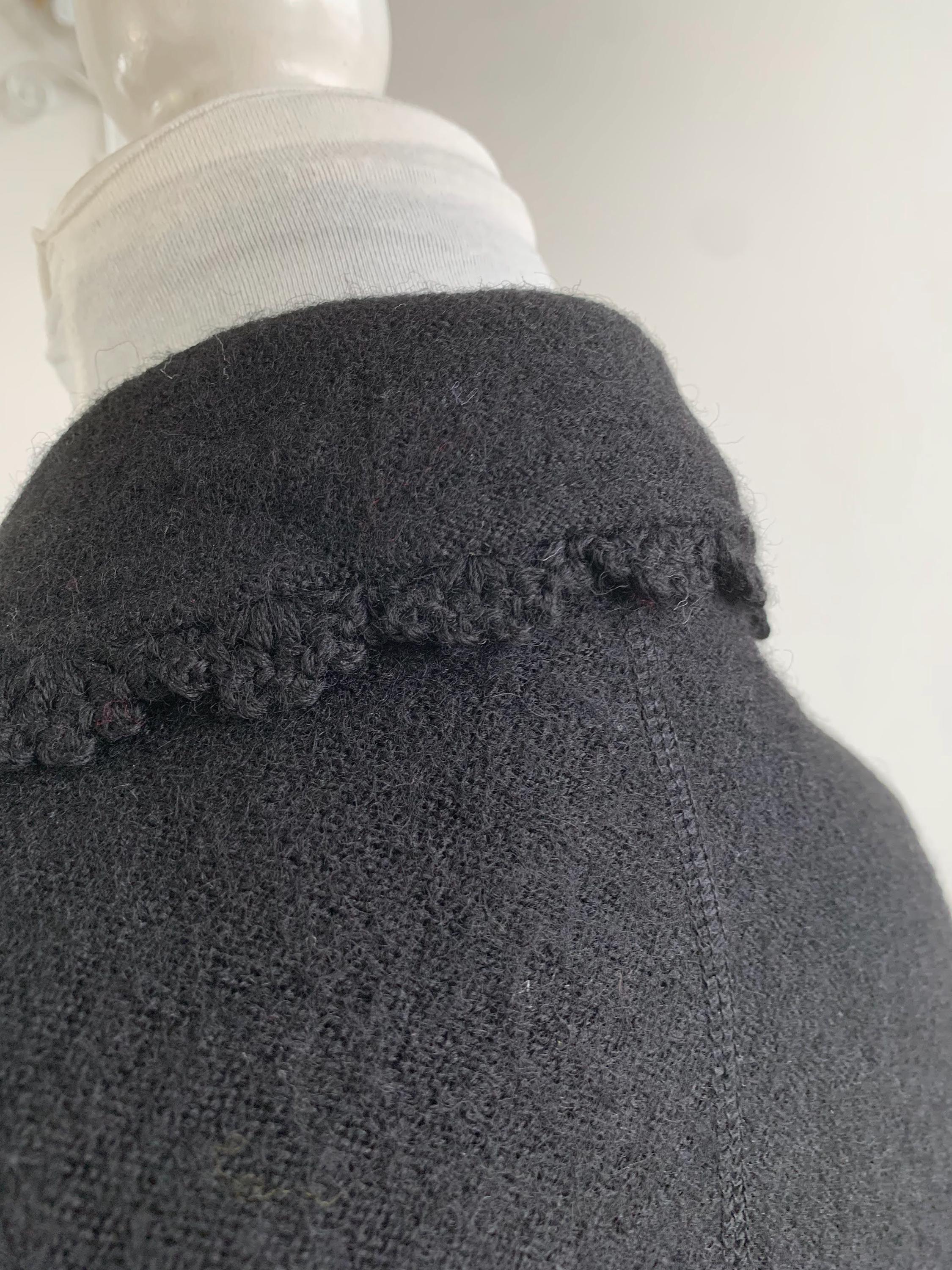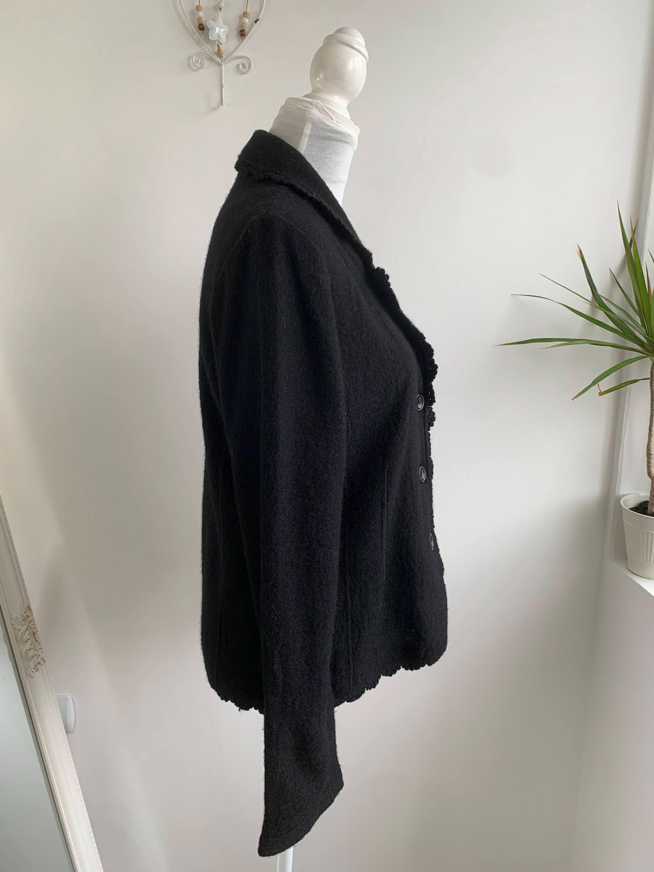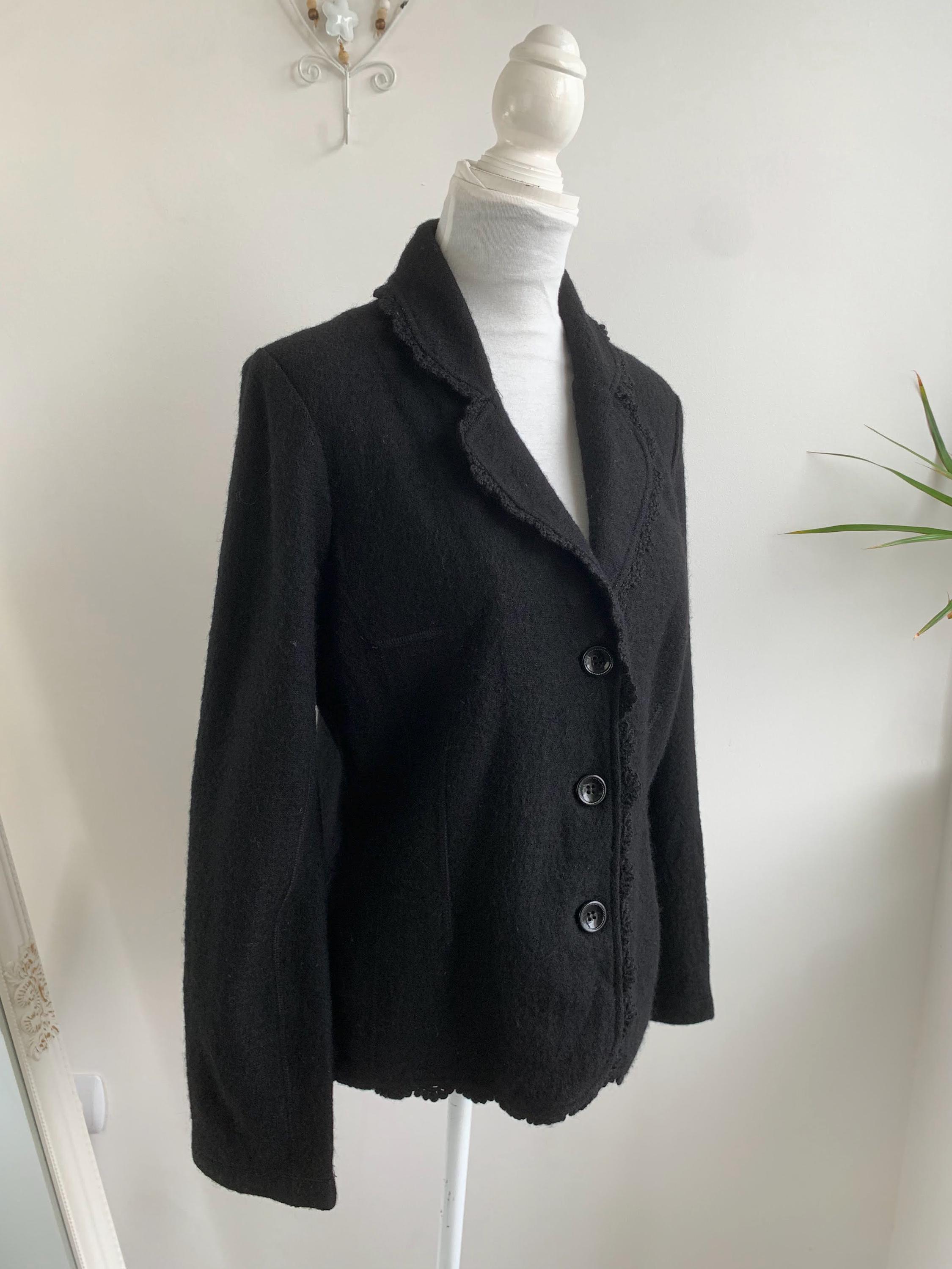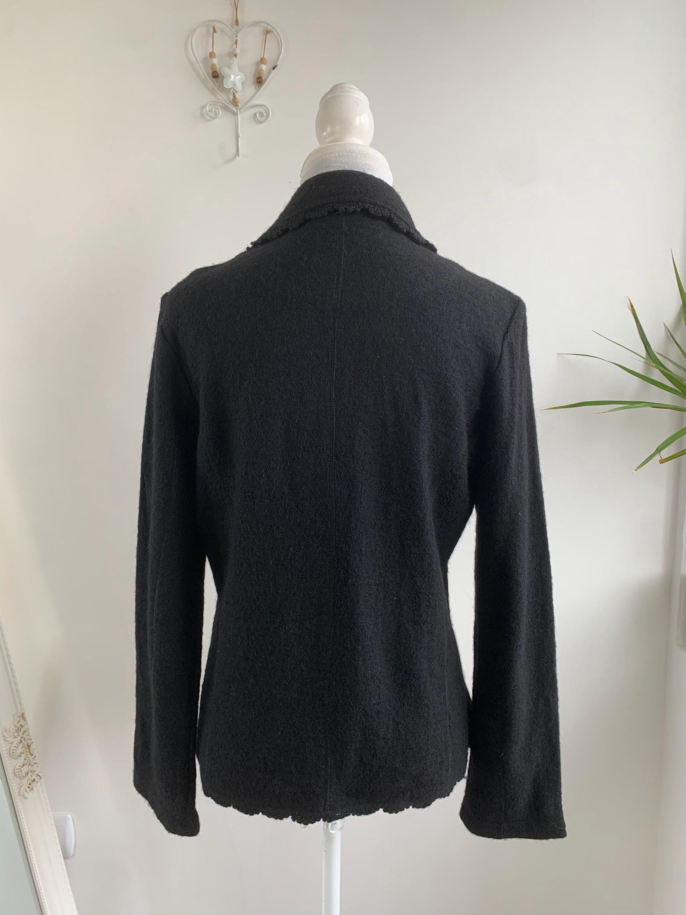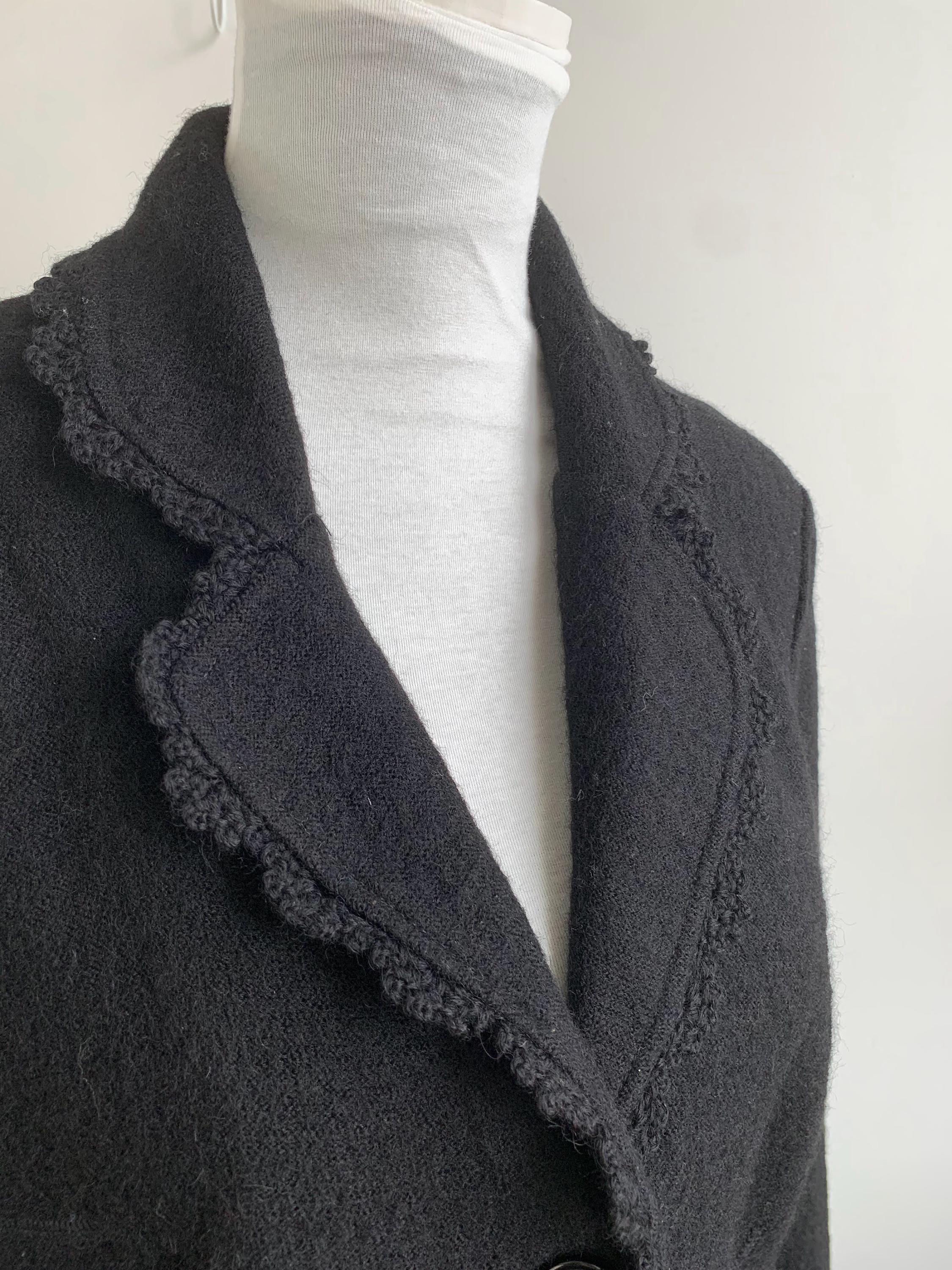Timeless Elegance: Vintage Tara Collection Black Wool Blend Jacket with Delicate Crochet Trim in size M.