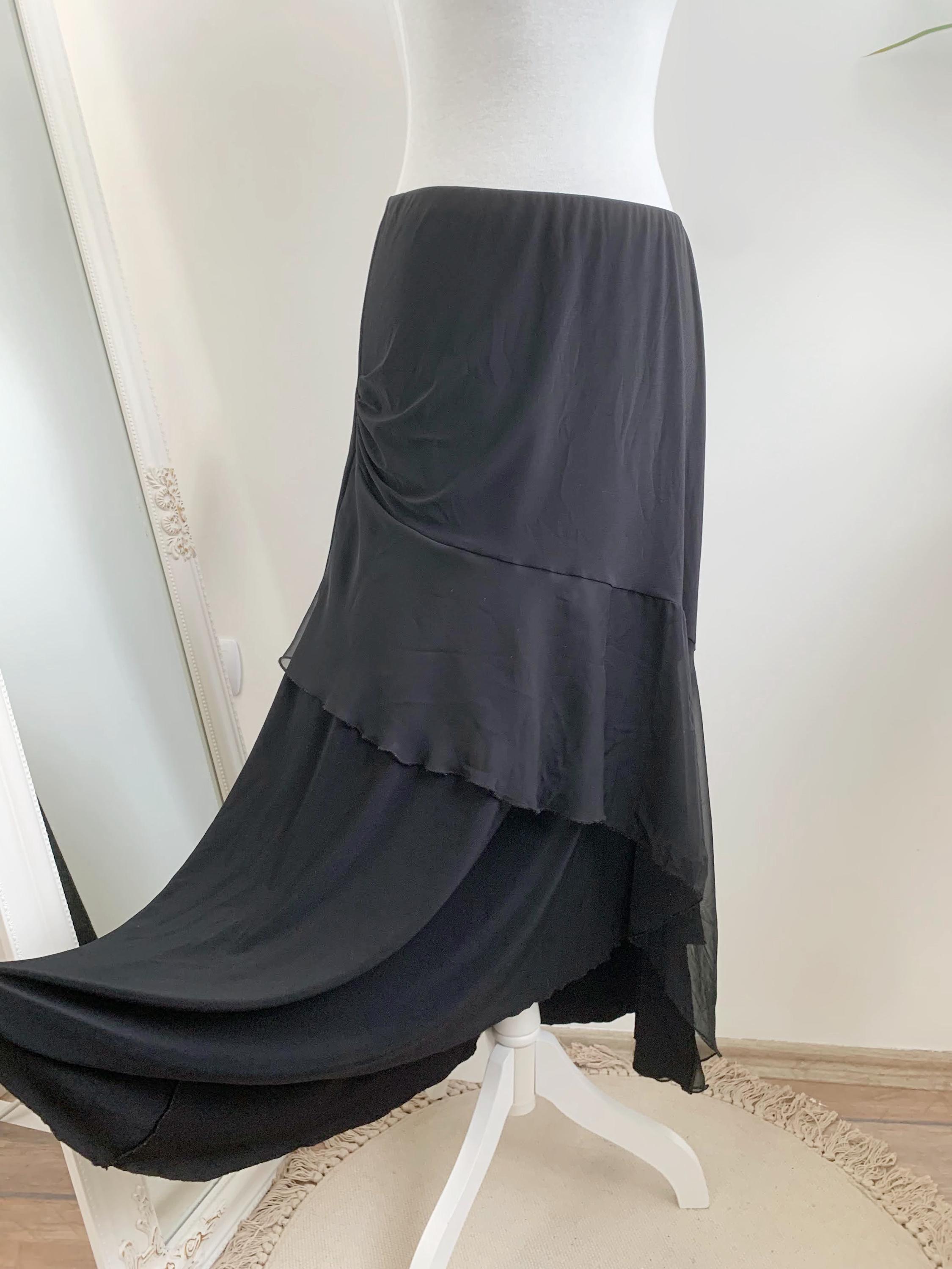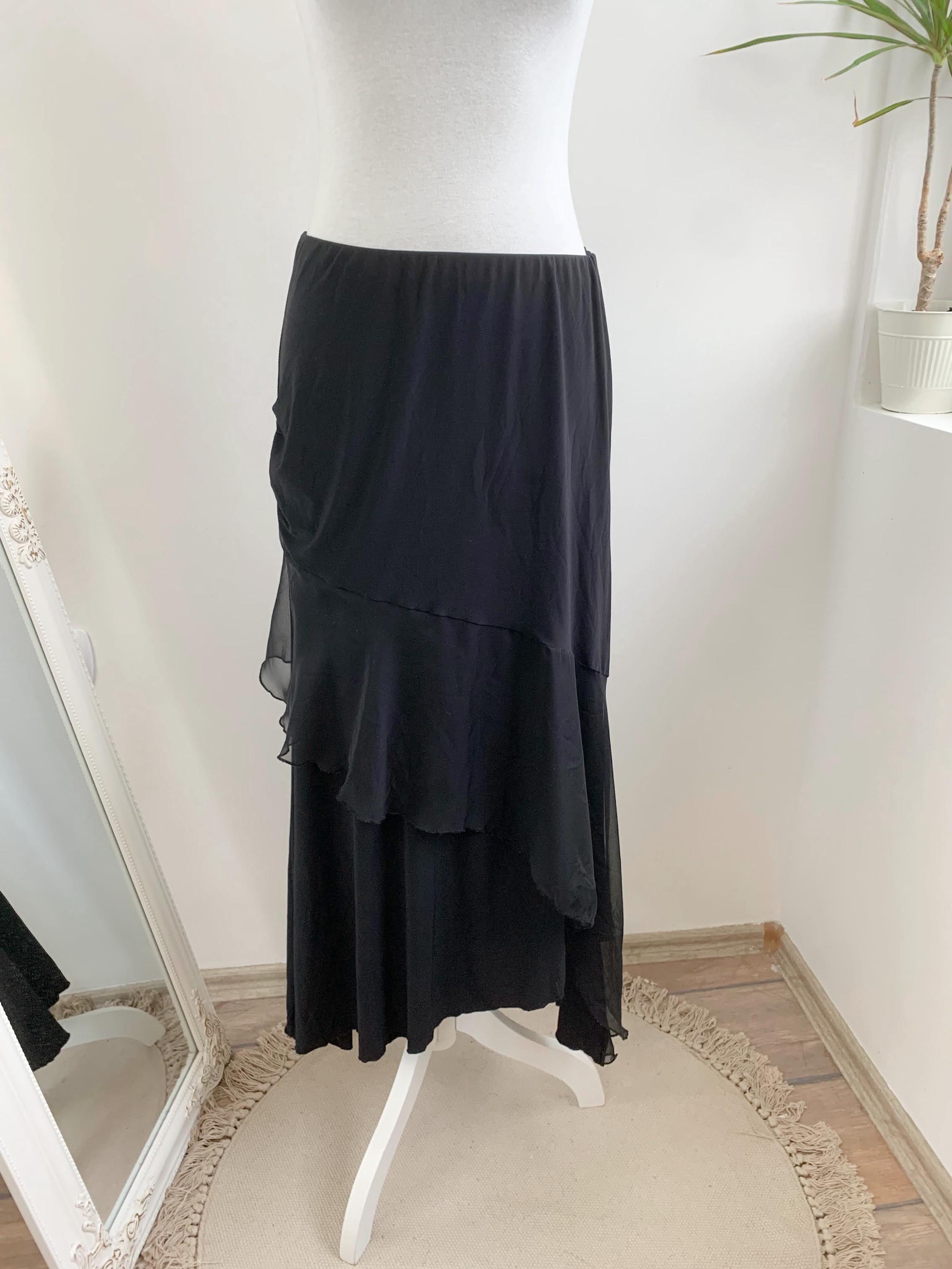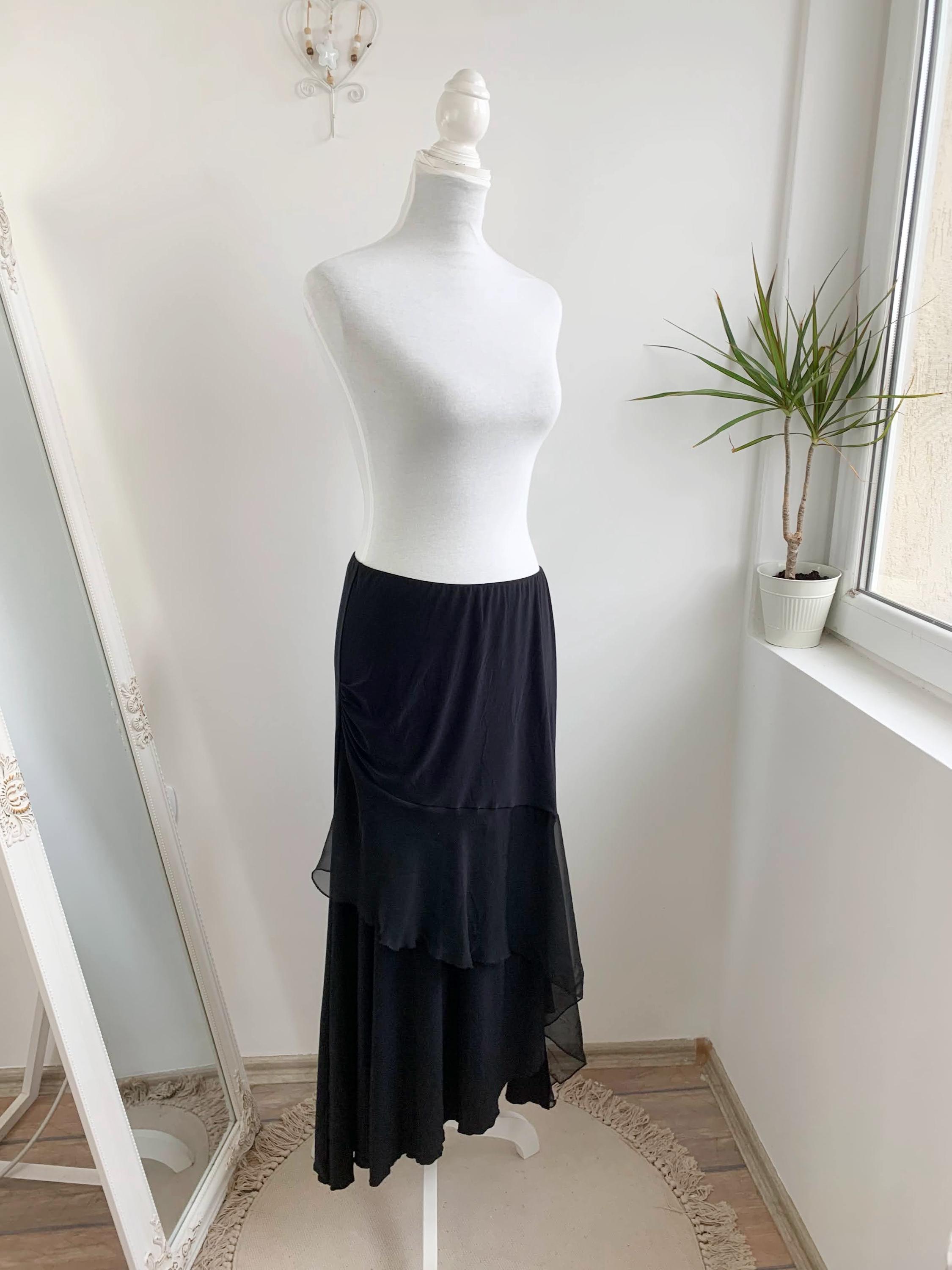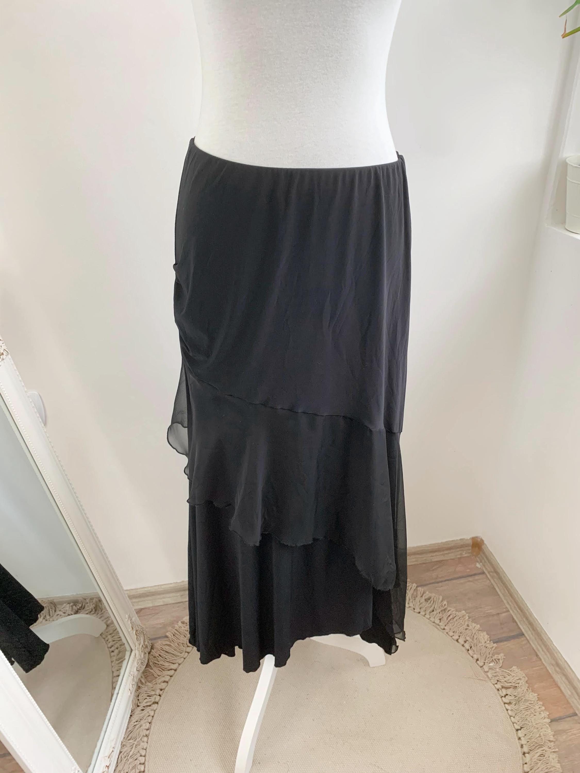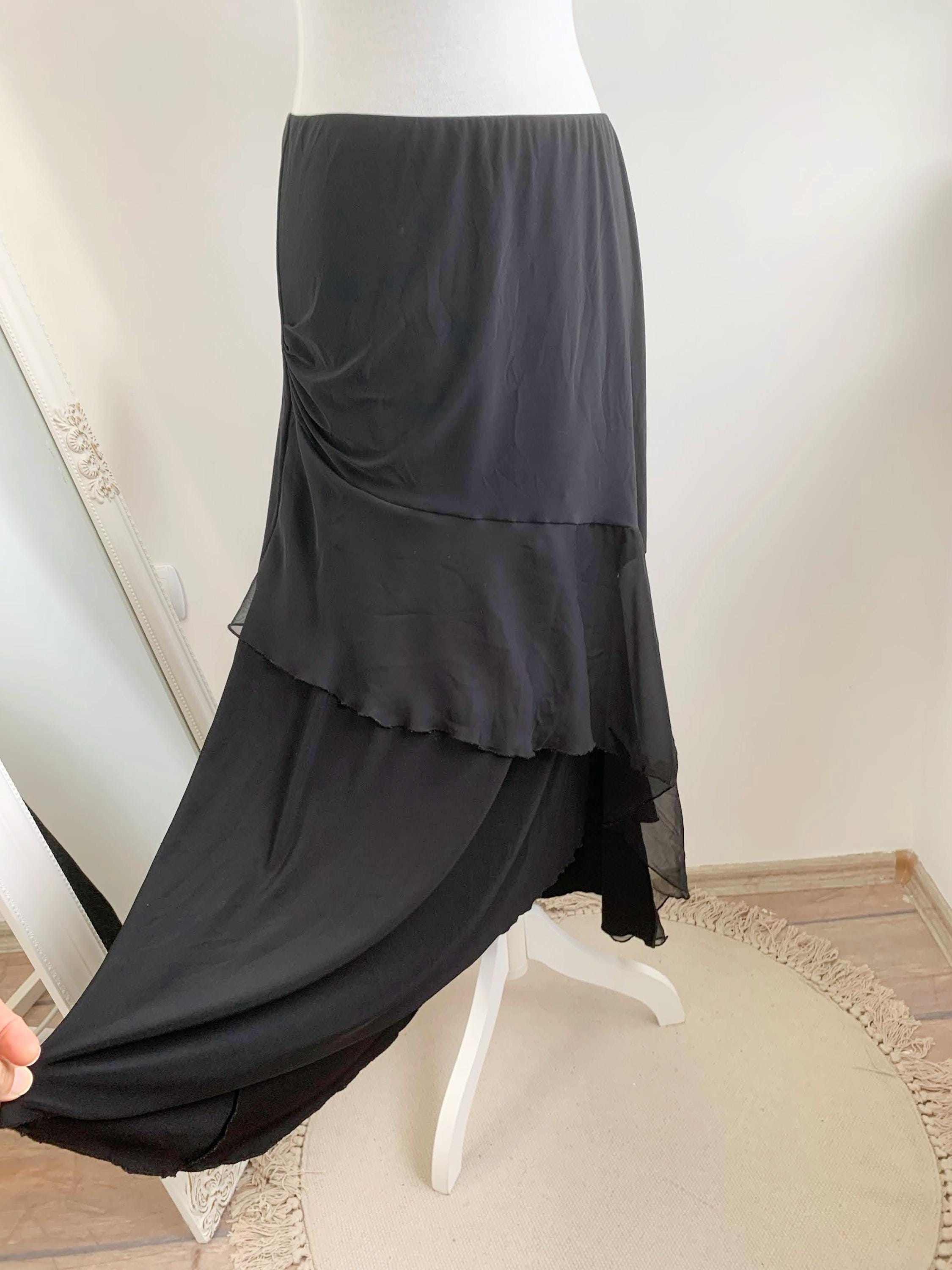 Step out in this stunning vintage black tiered skirt made of stretchy jersey fabric with tulle ruffle accent and elastic waistline in size M. This French vintage black maxi skirt is a true statement piece with fantastic movement . This is the ultimate boho-glam skirt, perfect for festivals, parties, or adding a unique, romantic touch to your everyday wardrobe. The skirt features a comfortable elasticated high-waist and falls into beautiful, flowing tiers, creating a dramatic, flattering silhouette. Whether you're aiming for a bohemian, romantic gothic, or an elevated retro party look, this unique maxi skirt is a versatile, one-of-a-kind find that brings a touch of vintage luxury.