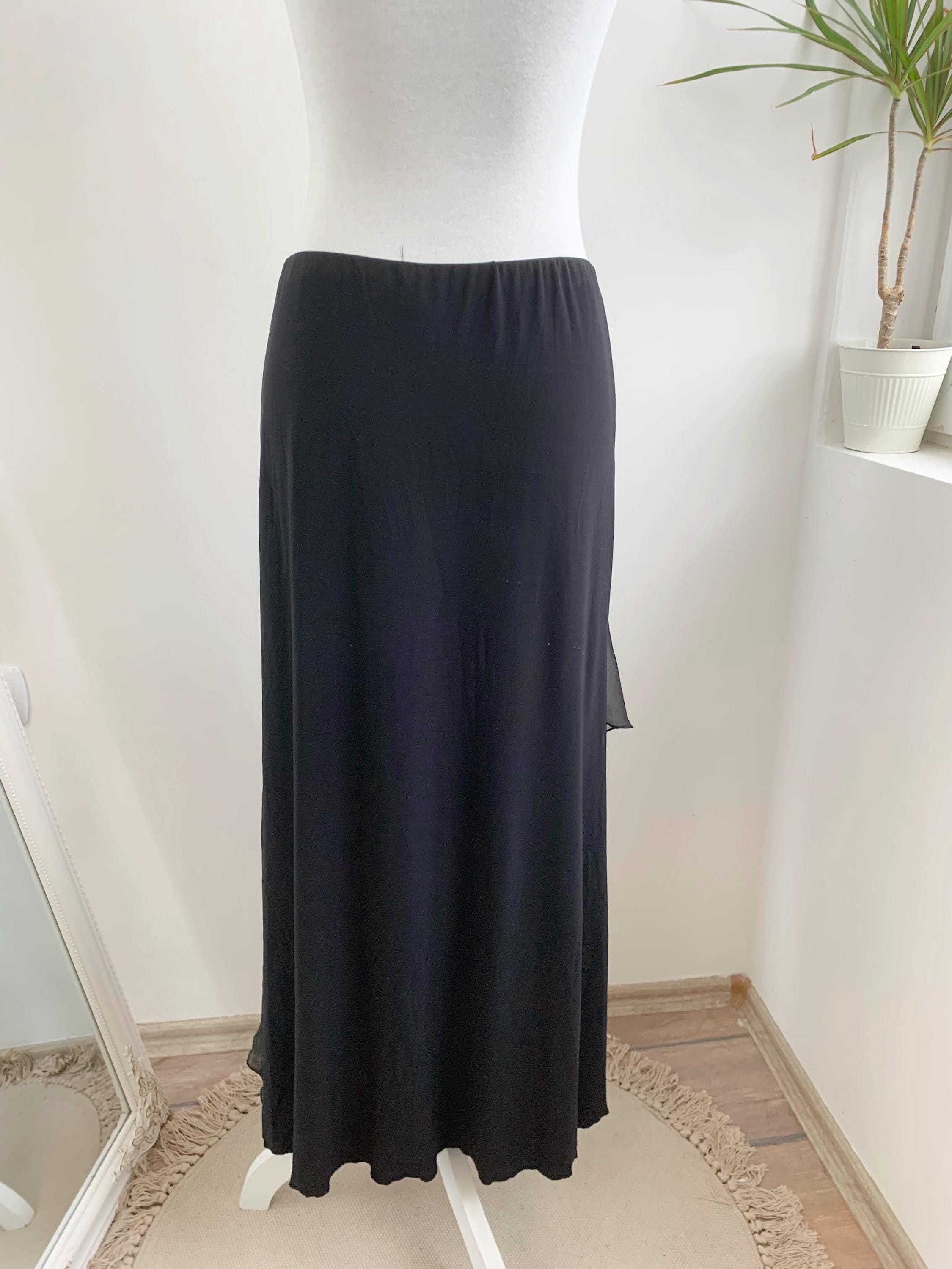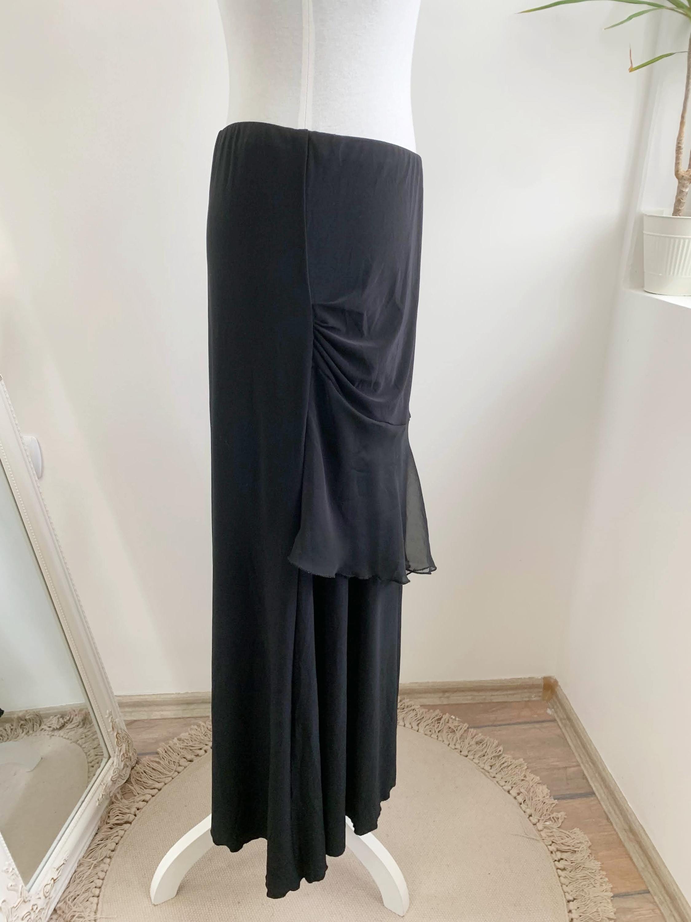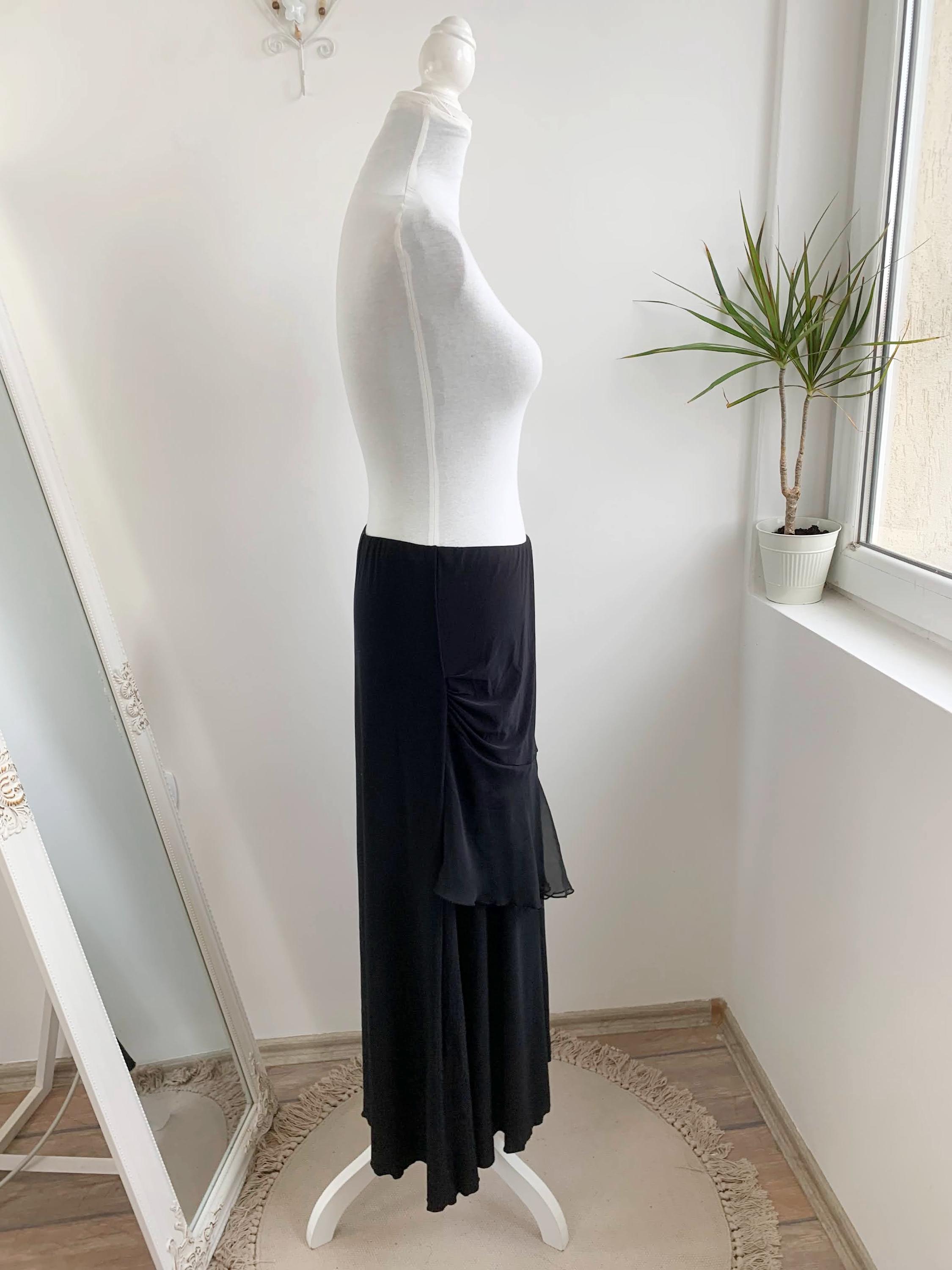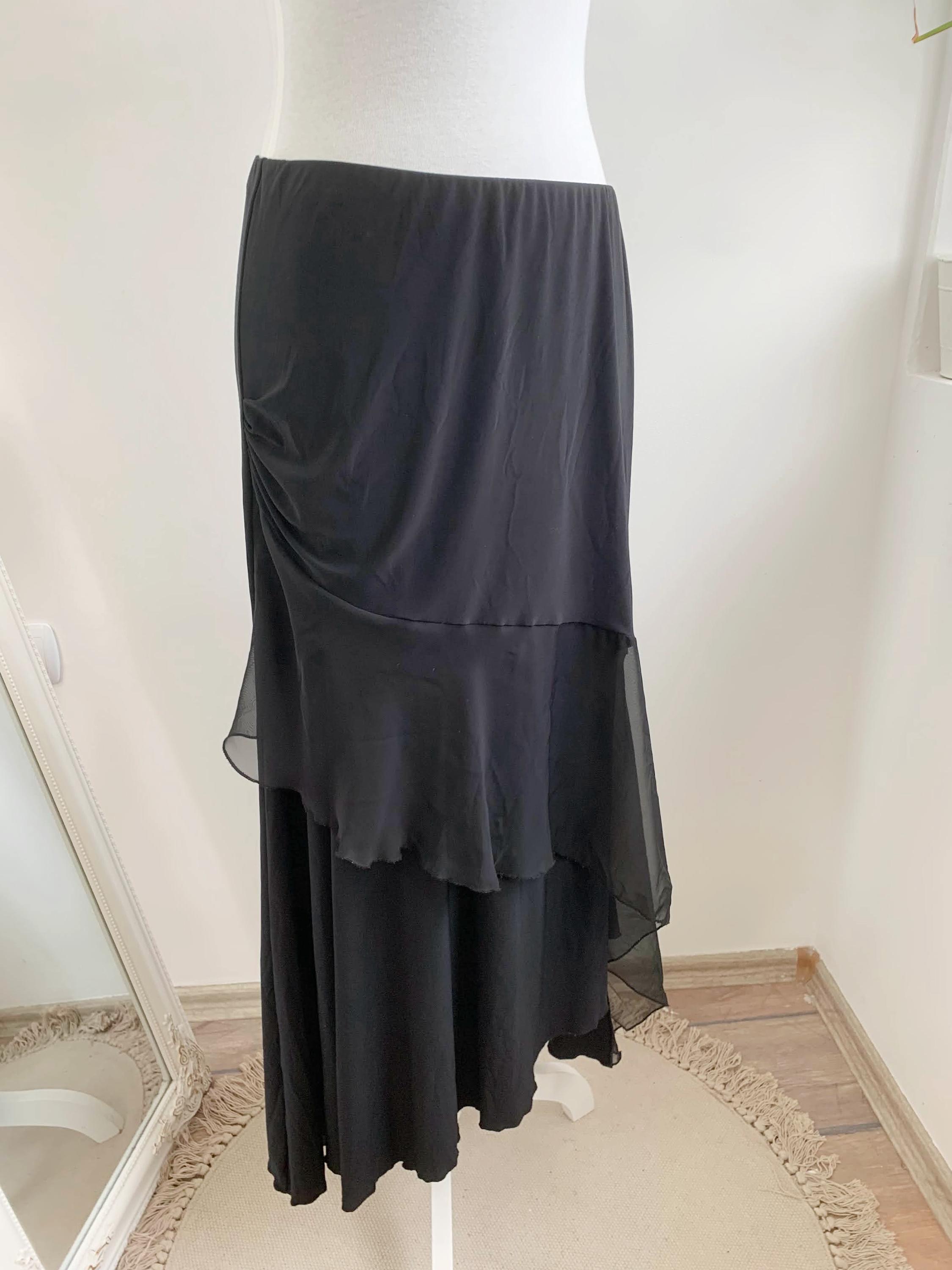 Step out in this stunning vintage black tiered skirt made of stretchy jersey fabric with tulle ruffle accent and elastic waistline in size M. This French vintage black maxi skirt is a true statement piece with fantastic movement . This is the ultimate boho-glam skirt, perfect for festivals, parties, or adding a unique, romantic touch to your everyday wardrobe. The skirt features a comfortable elasticated high-waist and falls into beautiful, flowing tiers, creating a dramatic, flattering silhouette. Whether you're aiming for a bohemian, romantic gothic, or an elevated retro party look, this unique maxi skirt is a versatile, one-of-a-kind find that brings a touch of vintage luxury.