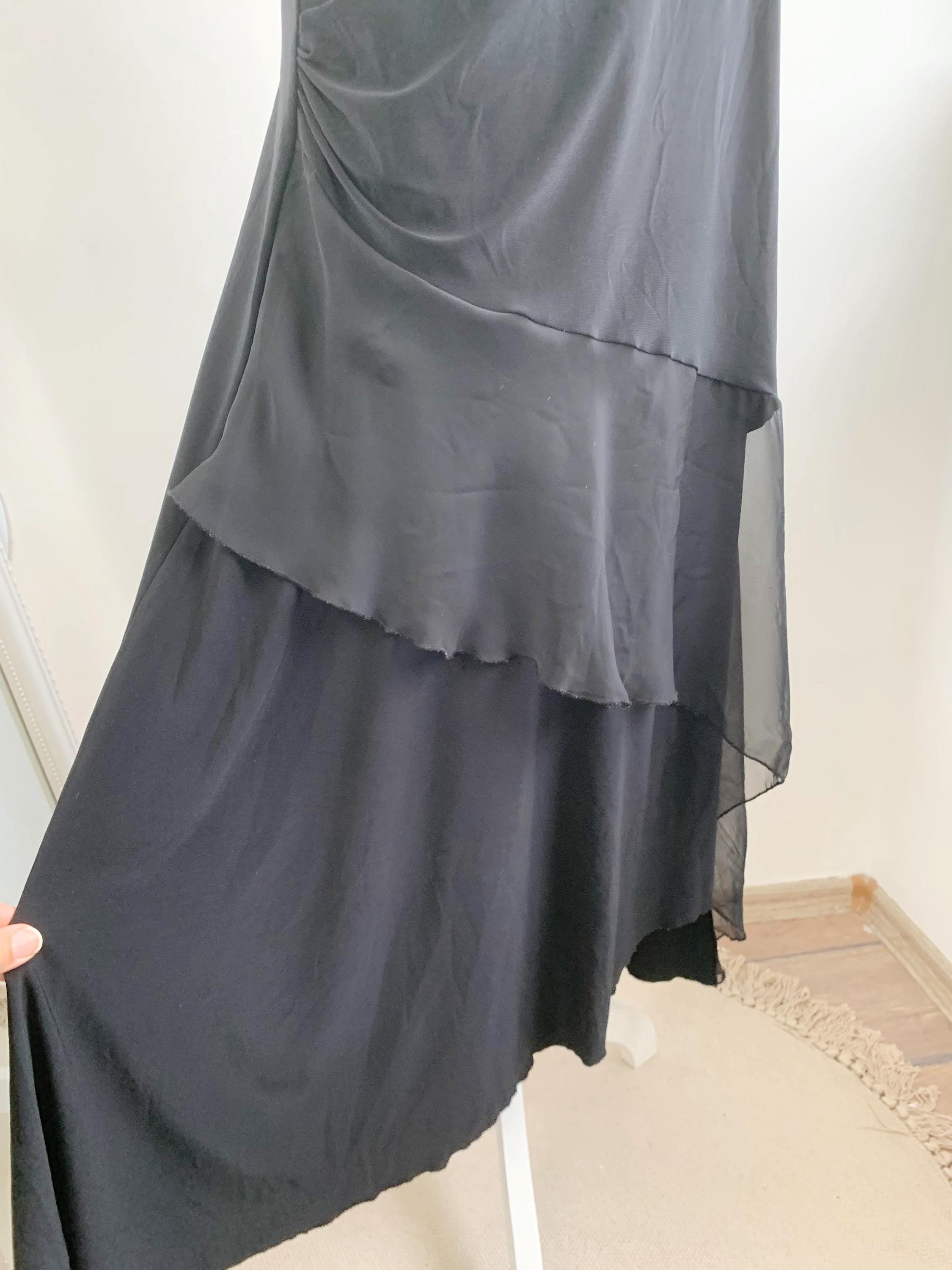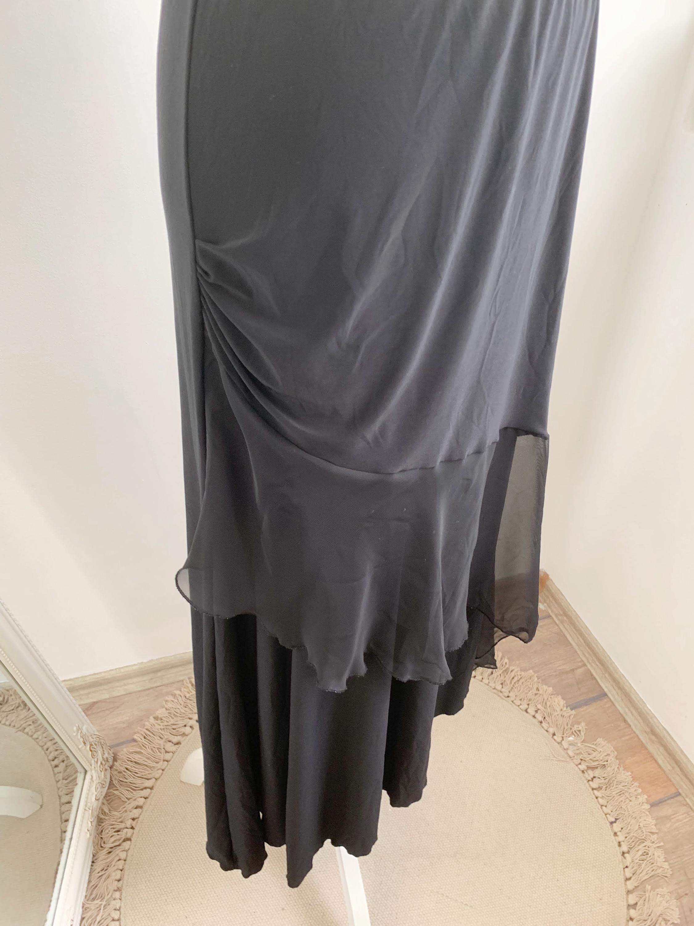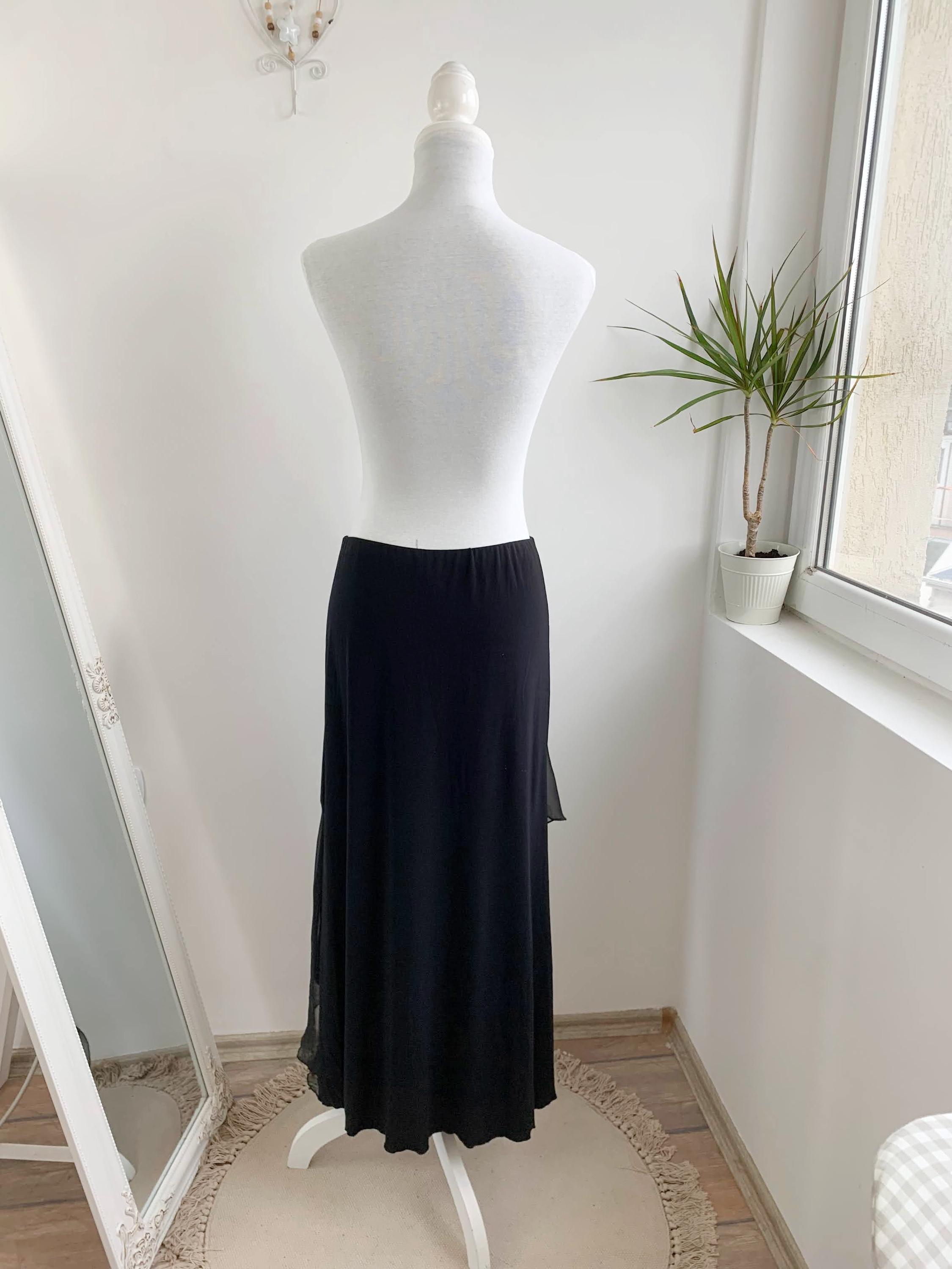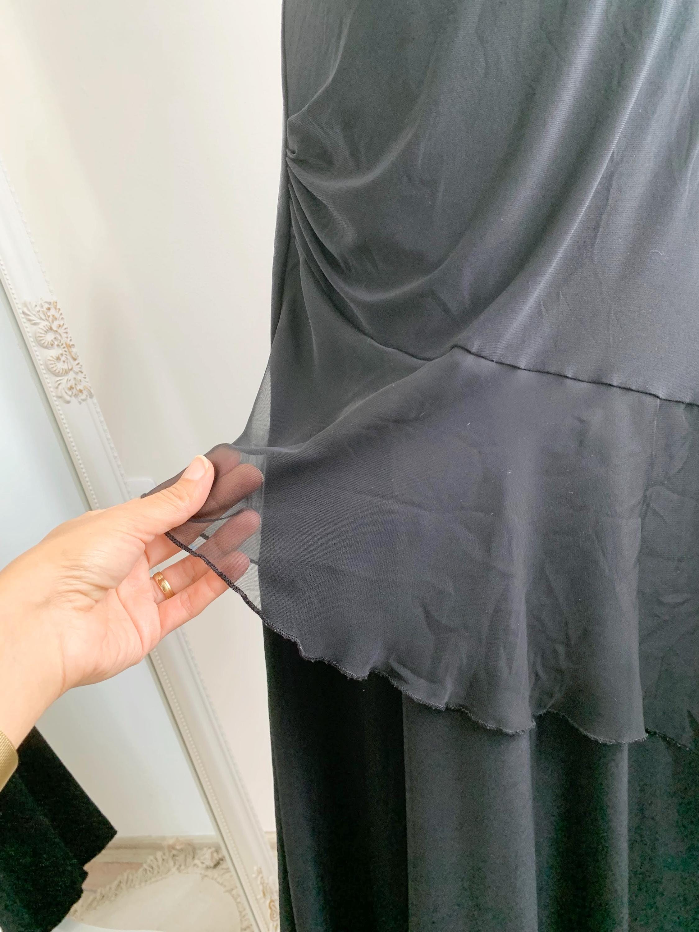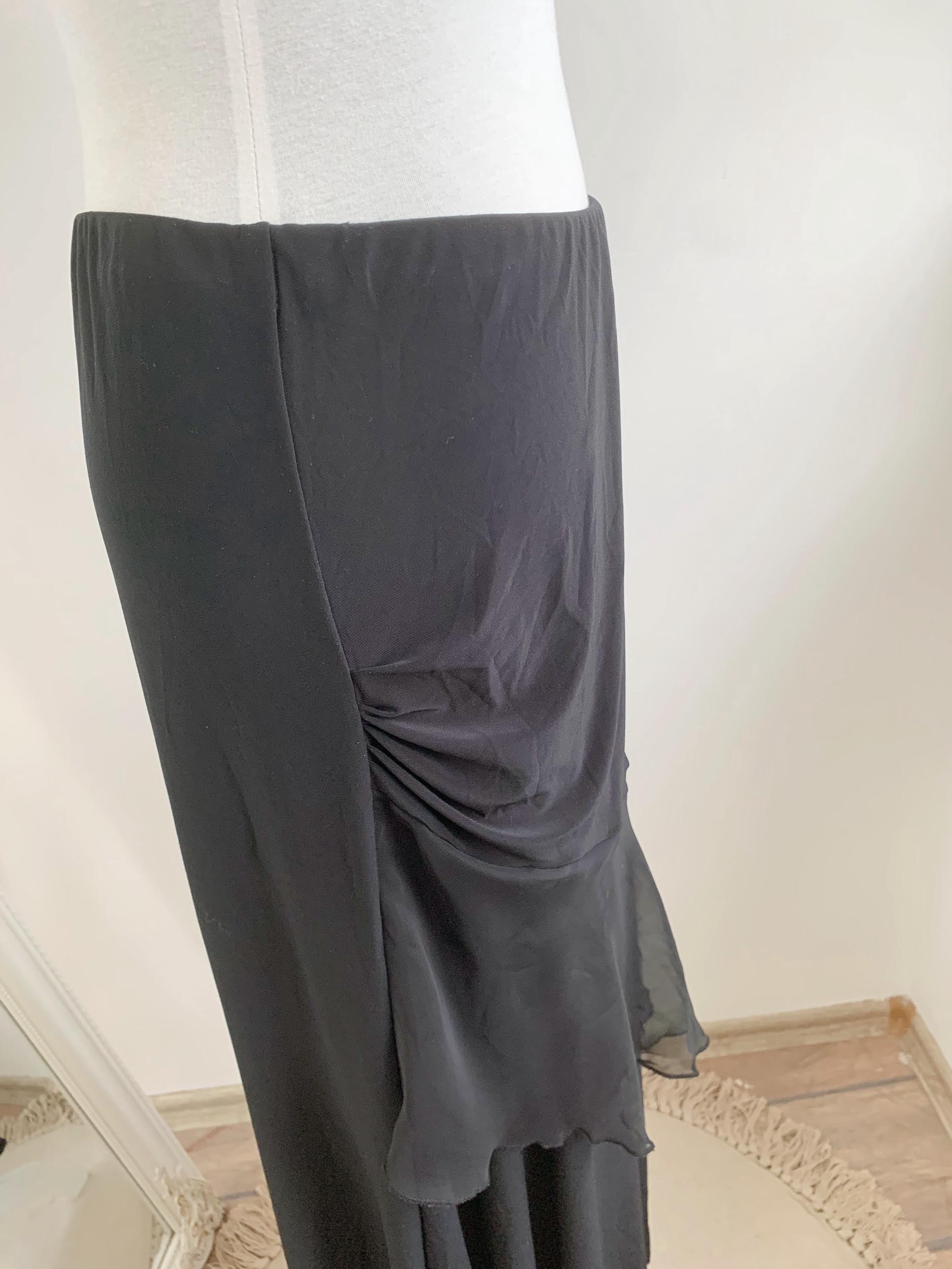 Step out in this stunning vintage black tiered skirt made of stretchy jersey fabric with tulle ruffle accent and elastic waistline in size M. This French vintage black maxi skirt is a true statement piece with fantastic movement . This is the ultimate boho-glam skirt, perfect for festivals, parties, or adding a unique, romantic touch to your everyday wardrobe. The skirt features a comfortable elasticated high-waist and falls into beautiful, flowing tiers, creating a dramatic, flattering silhouette. Whether you're aiming for a bohemian, romantic gothic, or an elevated retro party look, this unique maxi skirt is a versatile, one-of-a-kind find that brings a touch of vintage luxury.
