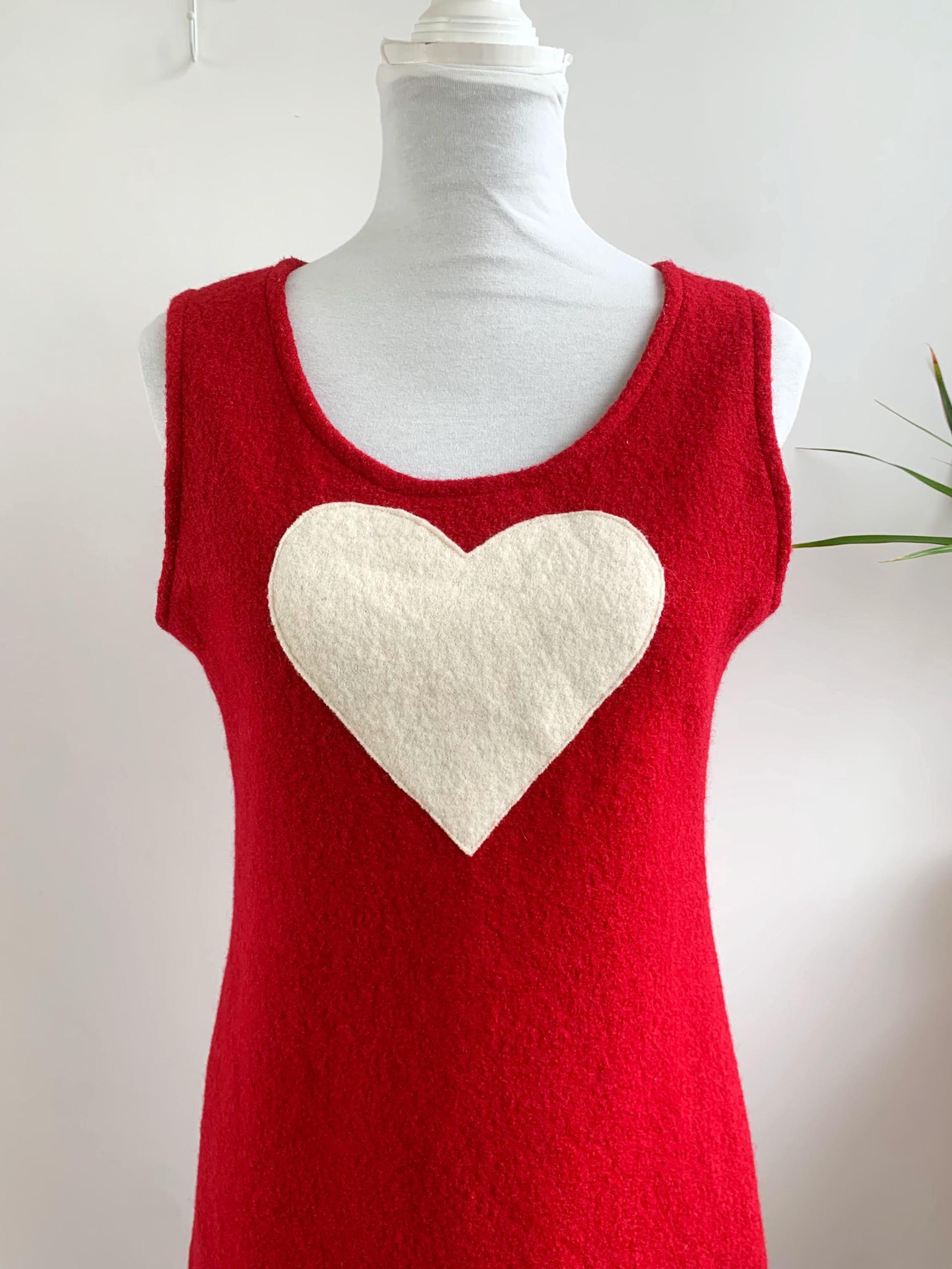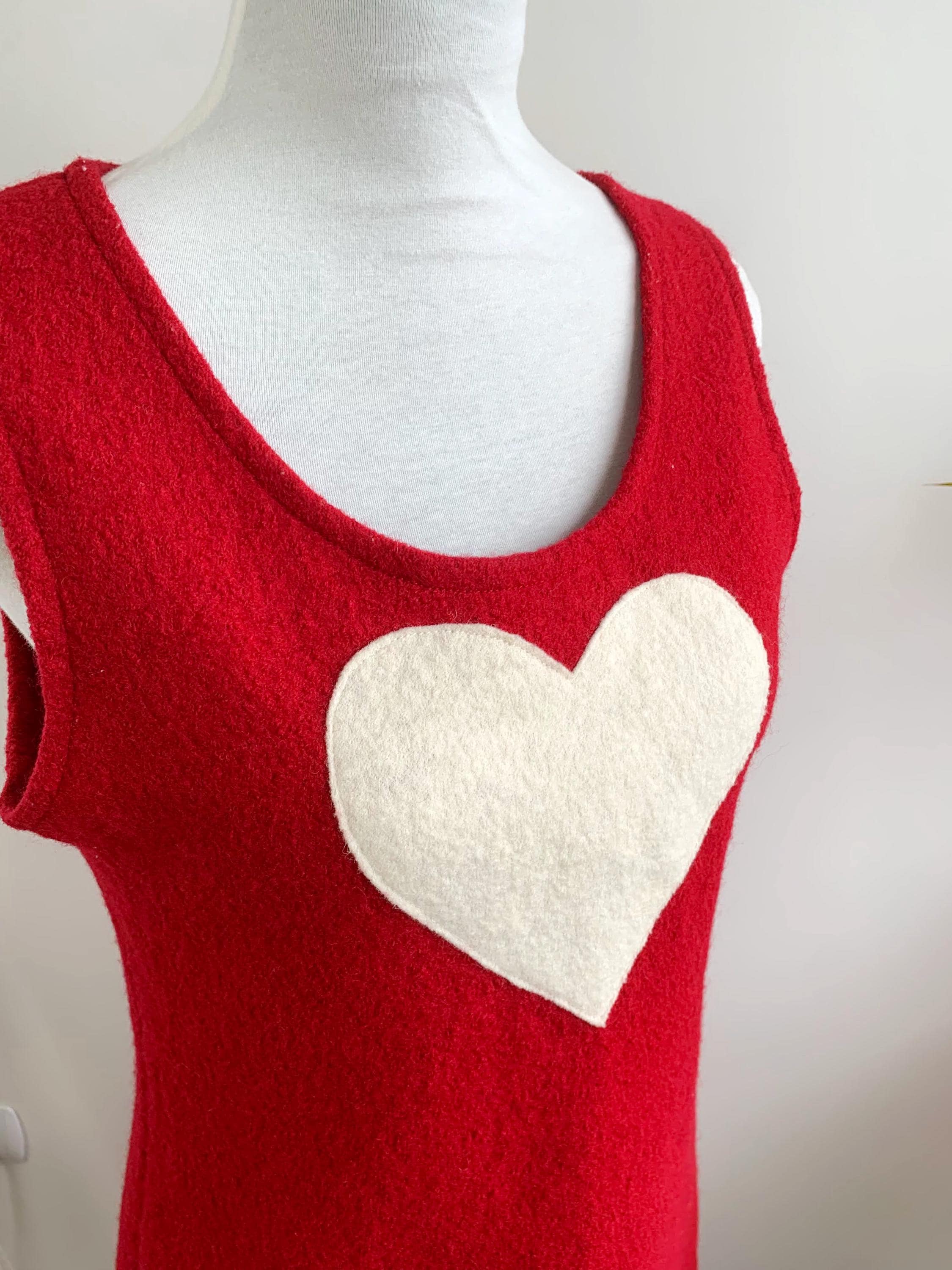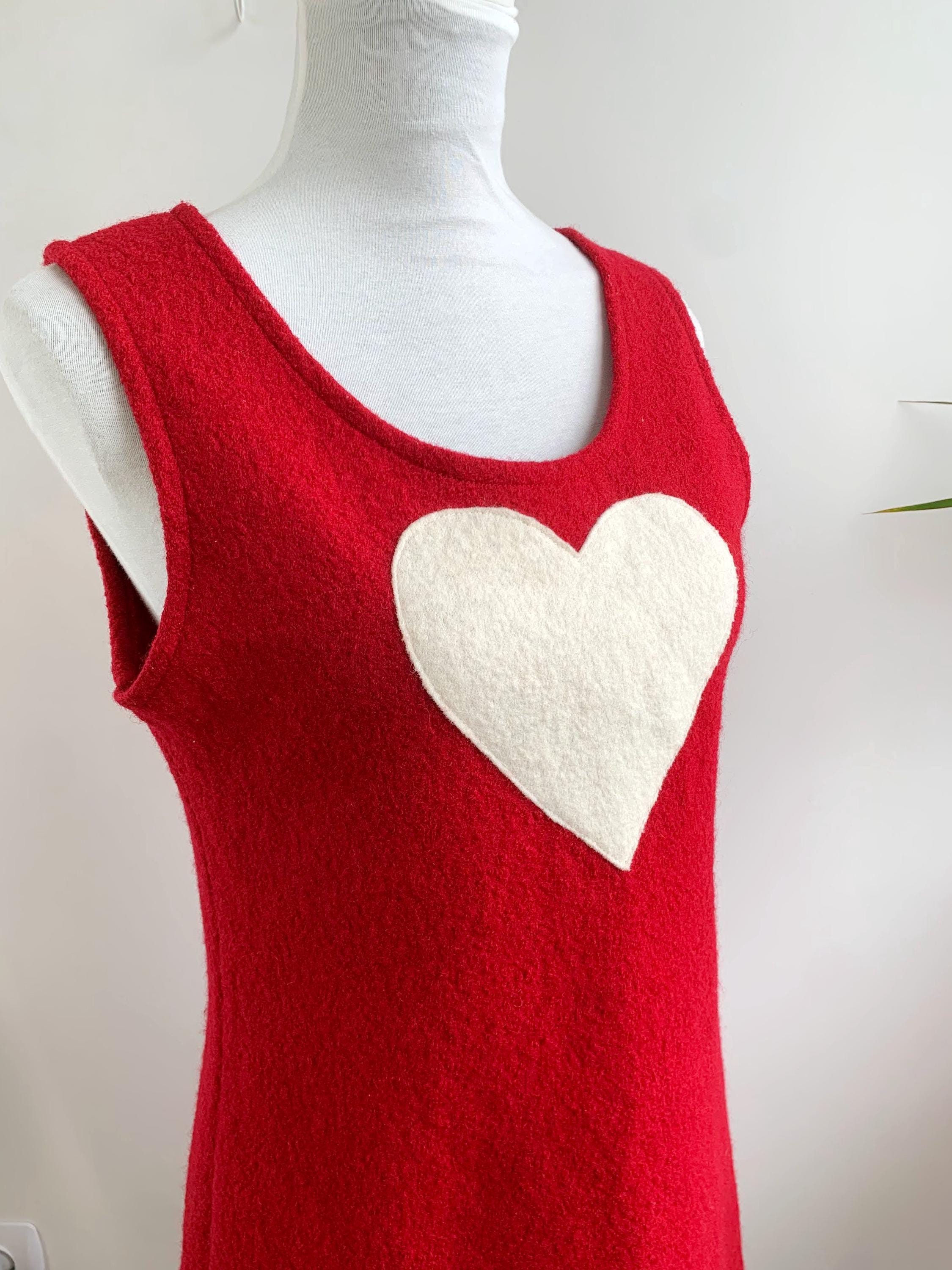 The standout feature is the bold, oversized cream-colored felt heart appliqué placed right on the chest, giving the dress a romantic, slightly Mod 1960s or Folk-Art aesthetic. Its sleeveless, A-line shift silhouette is incredibly versatile—perfect for layering over a turtleneck or long-sleeve blouse in the colder months, or wearing as a simple tunic in warmer weather. The quality is exceptional, indicative of genuine Norwegian craftsmanship often seen in brands that prioritize wool and traditional techniques.