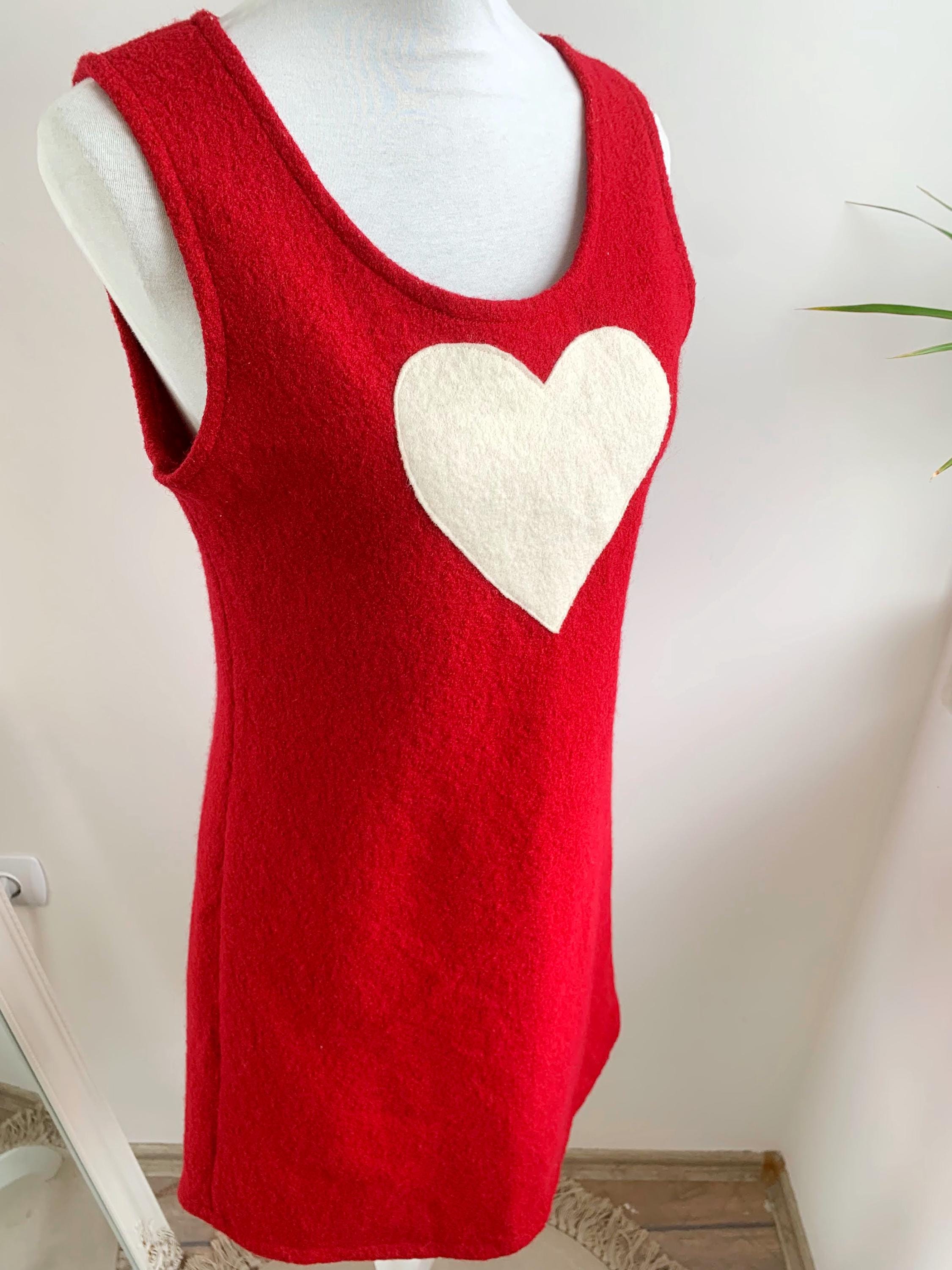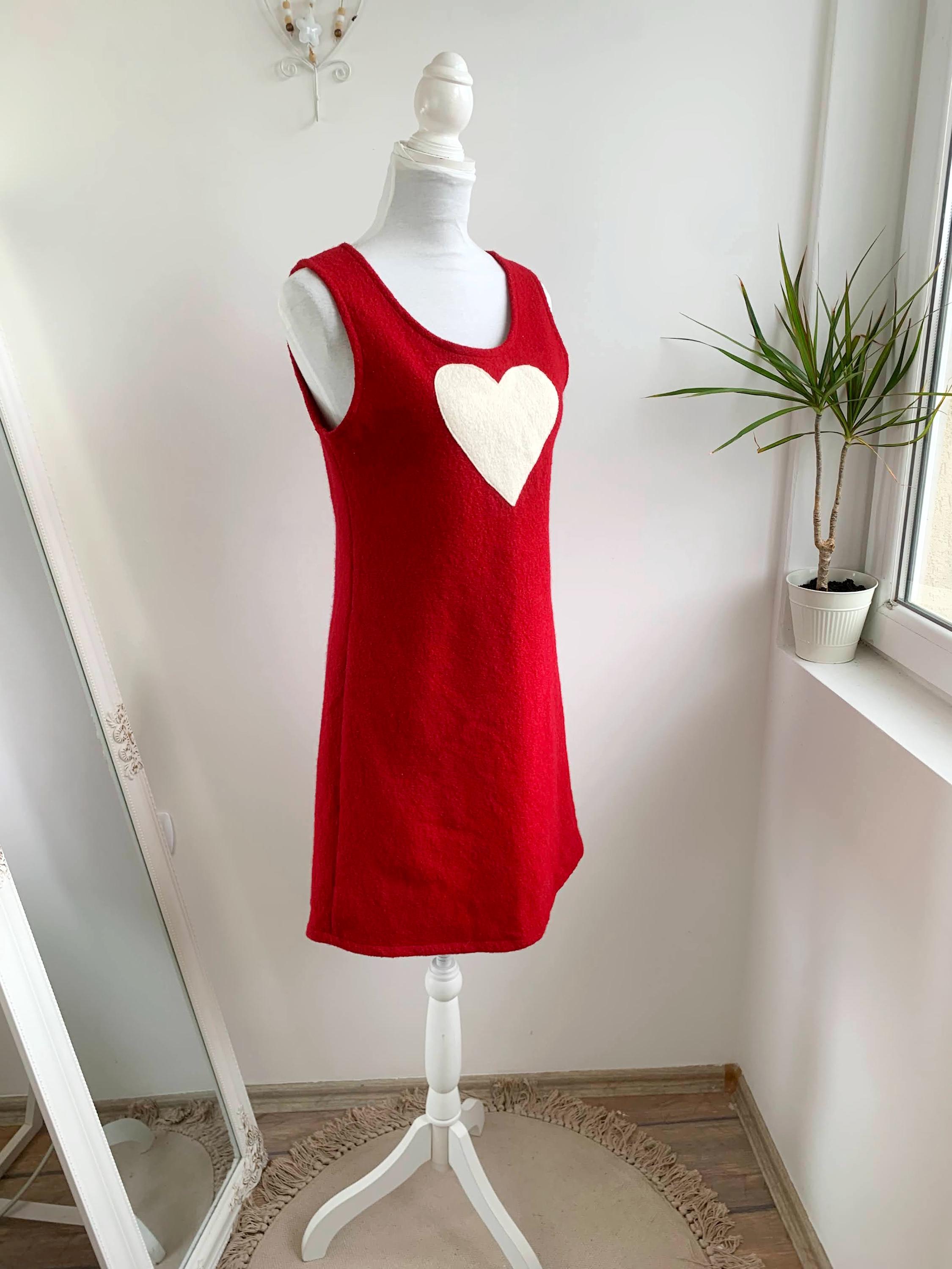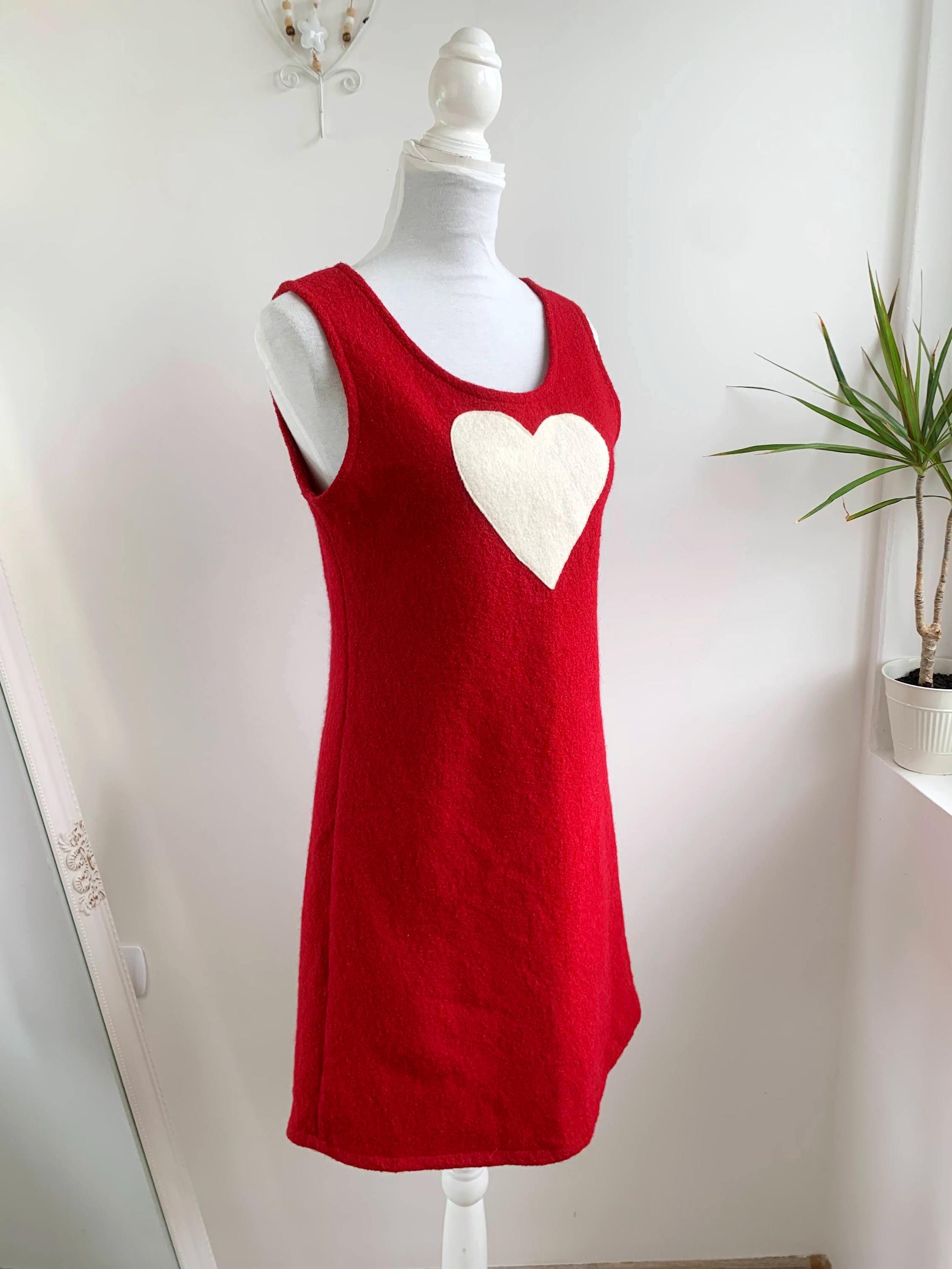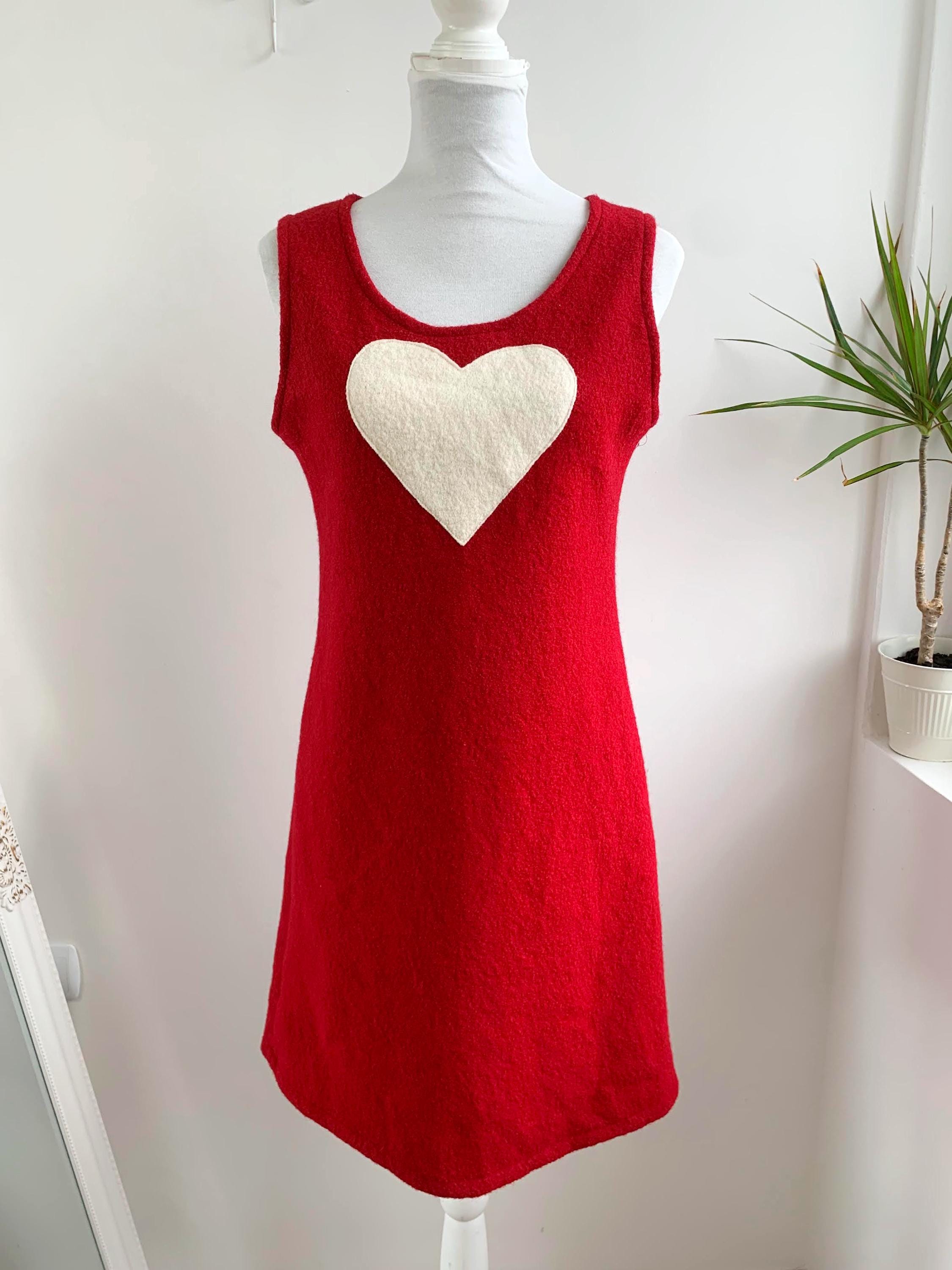 The standout feature is the bold, oversized cream-colored felt heart appliqué placed right on the chest, giving the dress a romantic, slightly Mod 1960s or Folk-Art aesthetic. Its sleeveless, A-line shift silhouette is incredibly versatile—perfect for layering over a turtleneck or long-sleeve blouse in the colder months, or wearing as a simple tunic in warmer weather. The quality is exceptional, indicative of genuine Norwegian craftsmanship often seen in brands that prioritize wool and traditional techniques.
