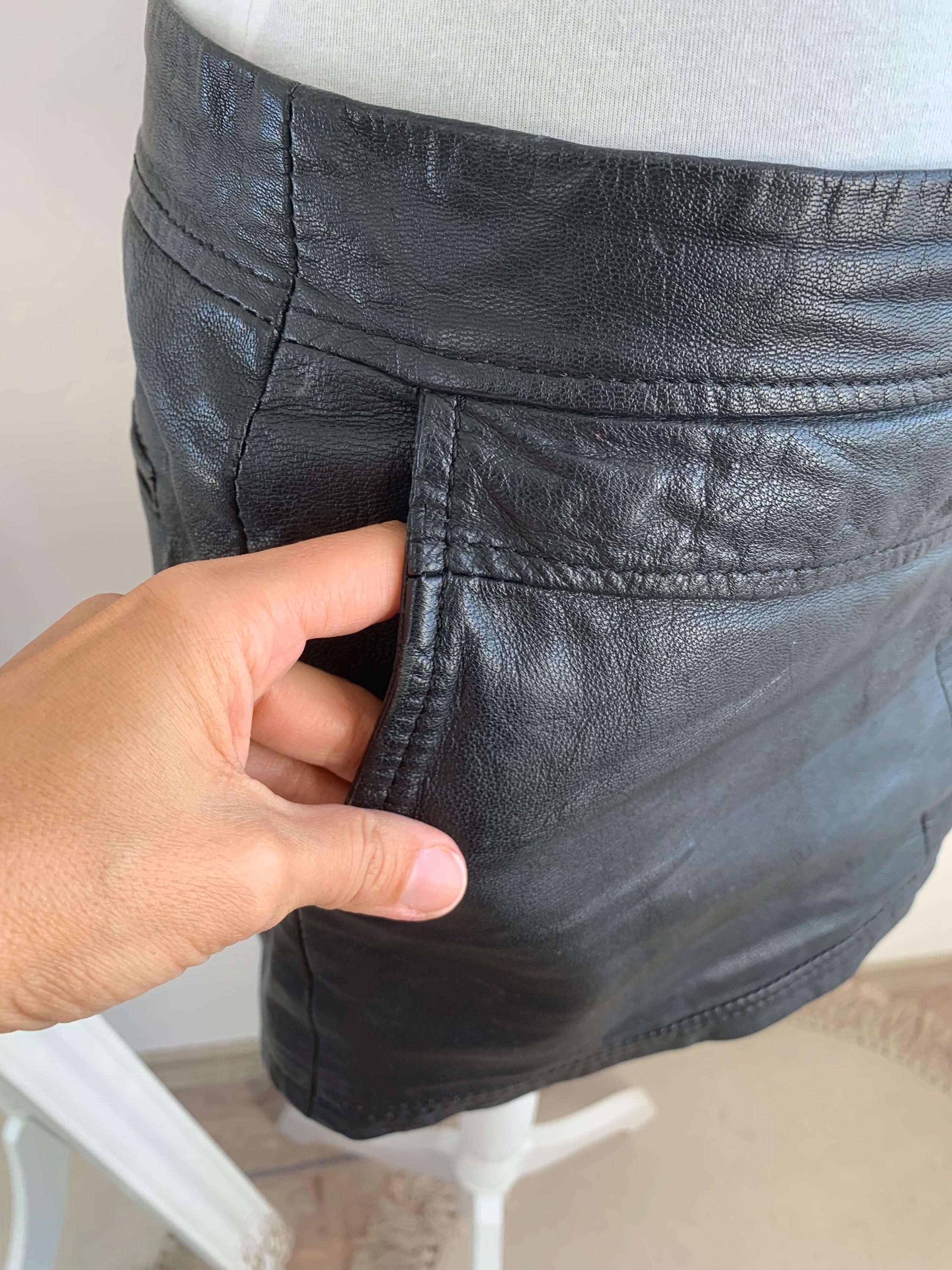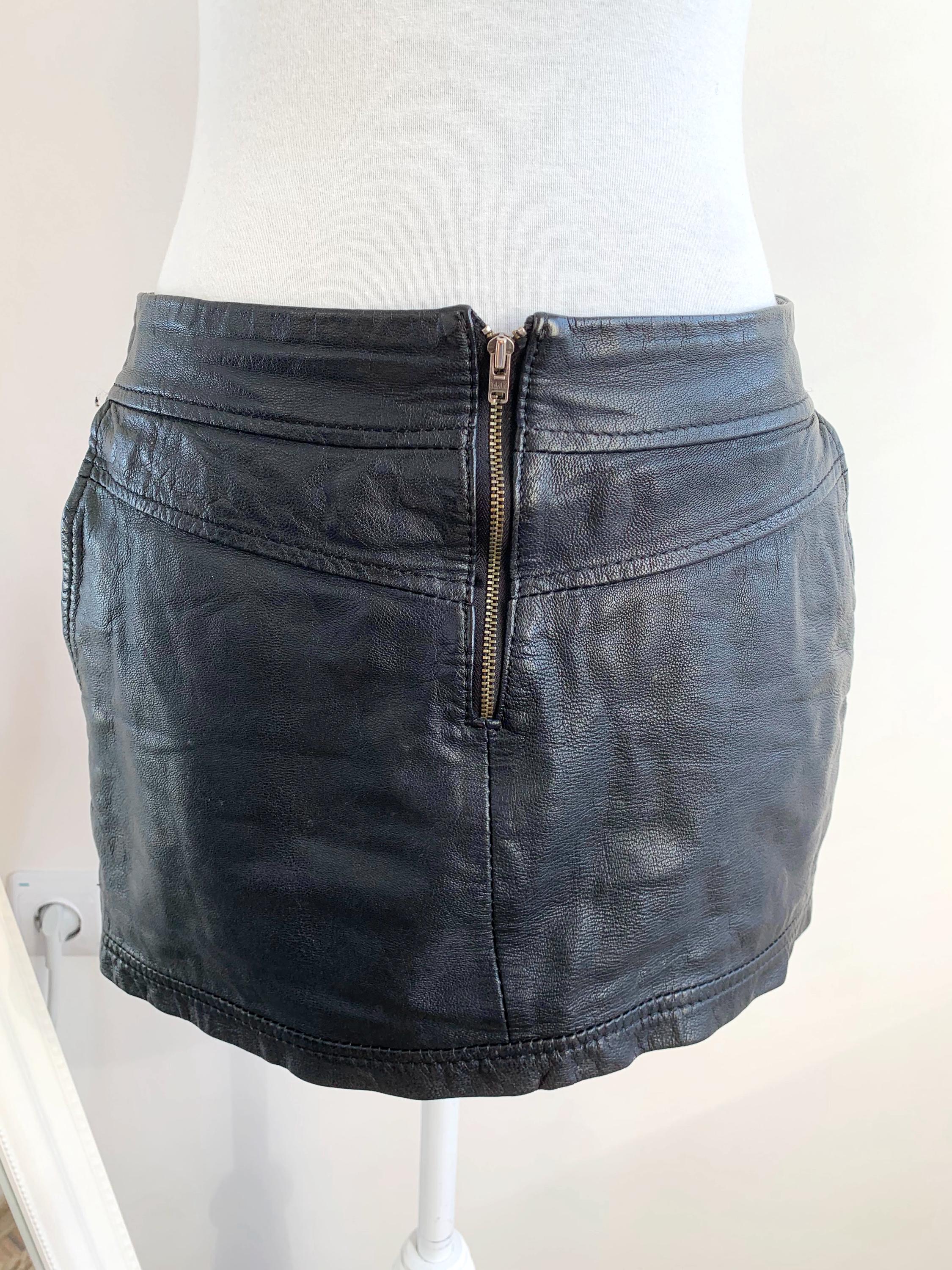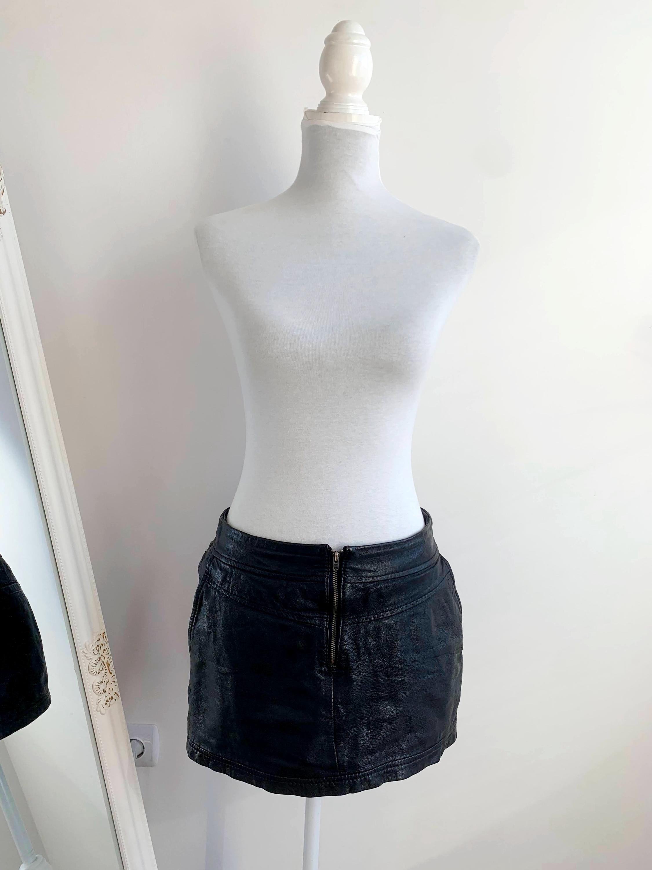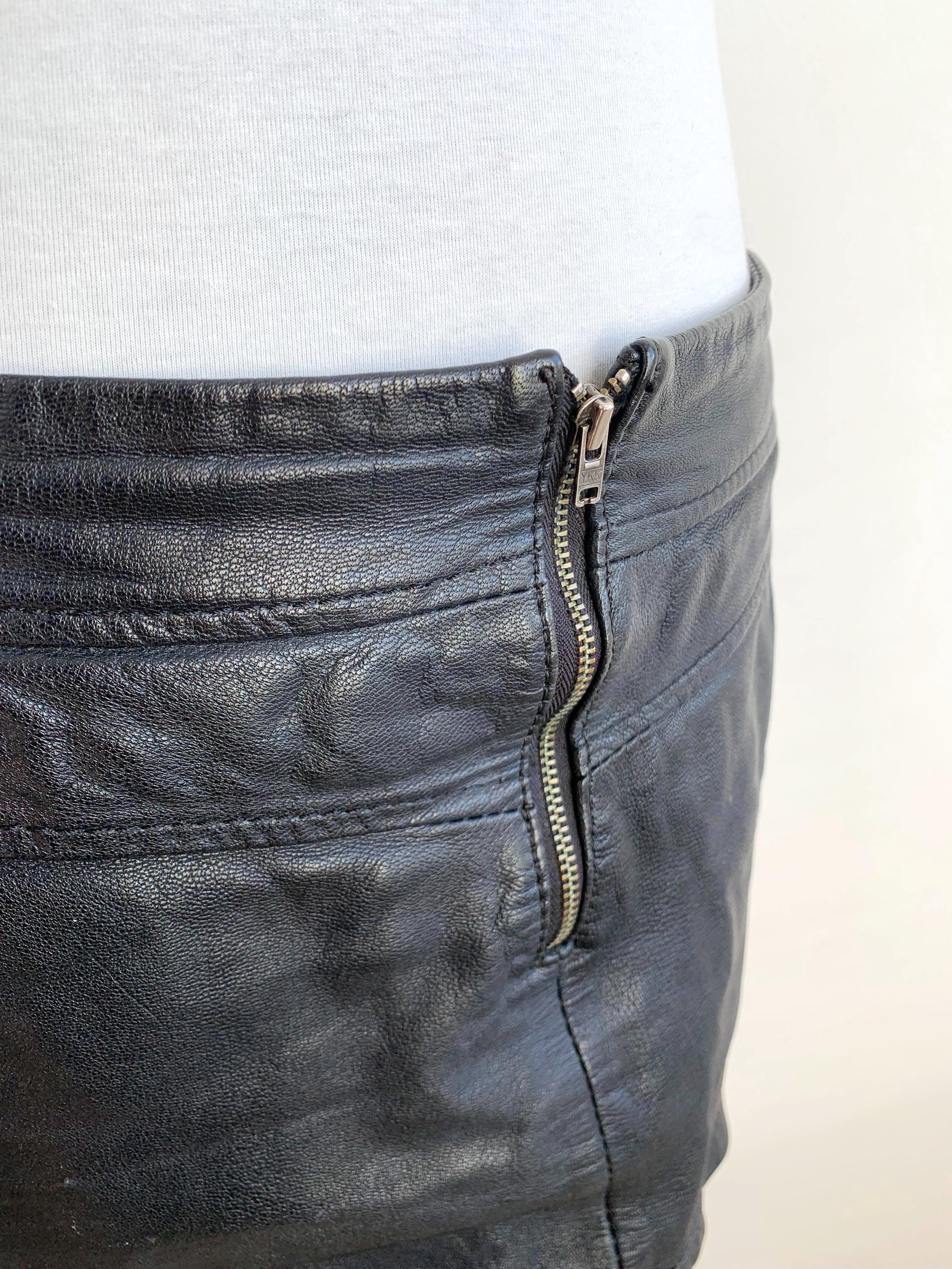 Step out in early 2000s style with this VILA black genuine leather mini skirt in size S! This is a genuine vintage essential that perfectly captures the Y2K fashion and grunge aesthetics. Made from soft, 100% goat leather, this low rise mini skirt is built for a chic, high-impact look, whether you're hitting a festival, a club, or rocking a casual biker grunge vibe. The genuine leather material will only get better with age, making this a true investment piece for your closet. It features a visible front zipper detail and is fully lined for comfort. A great find for any fan of vintage leather clothing and punk rock style!