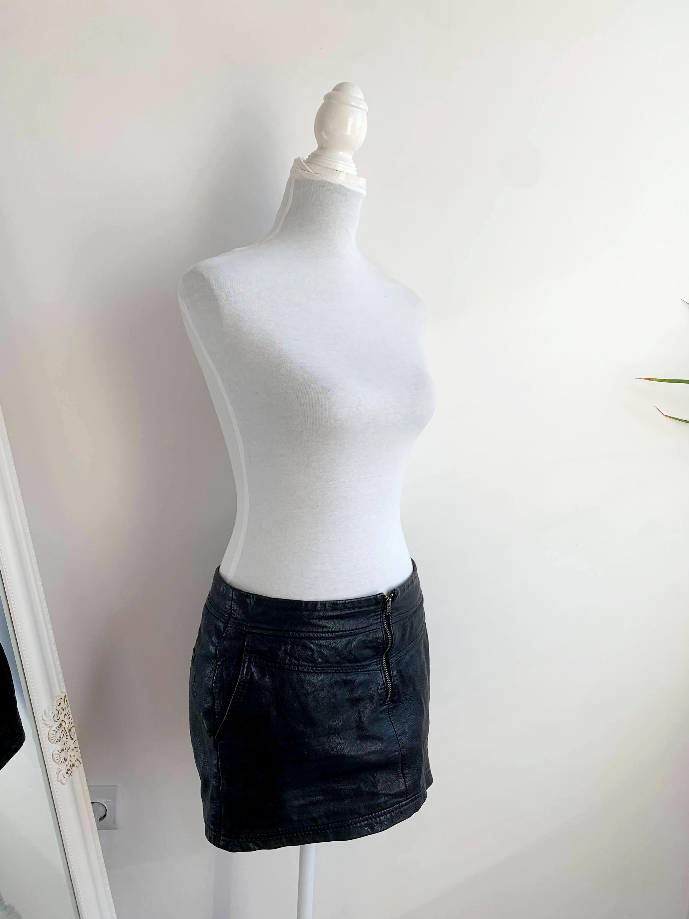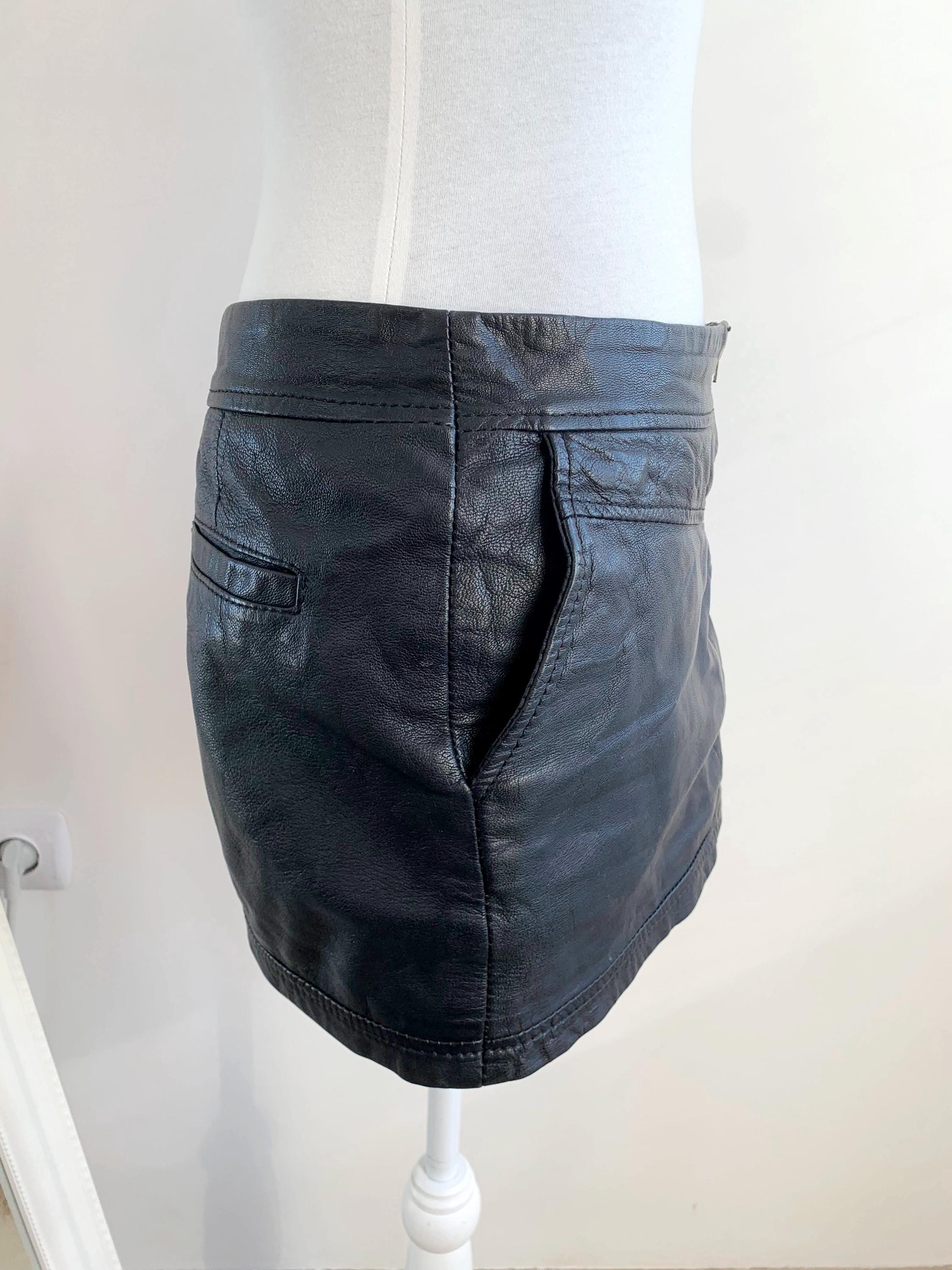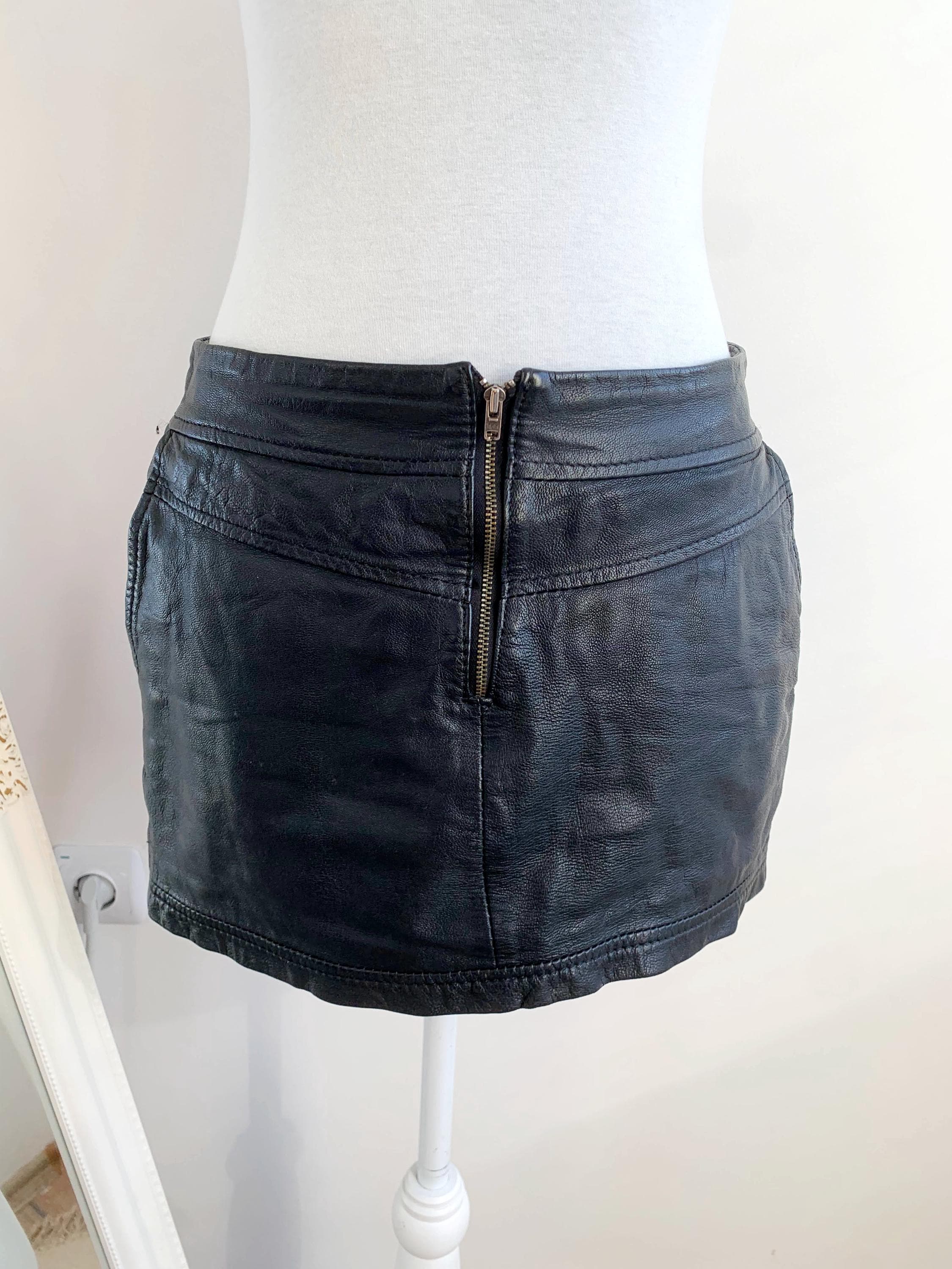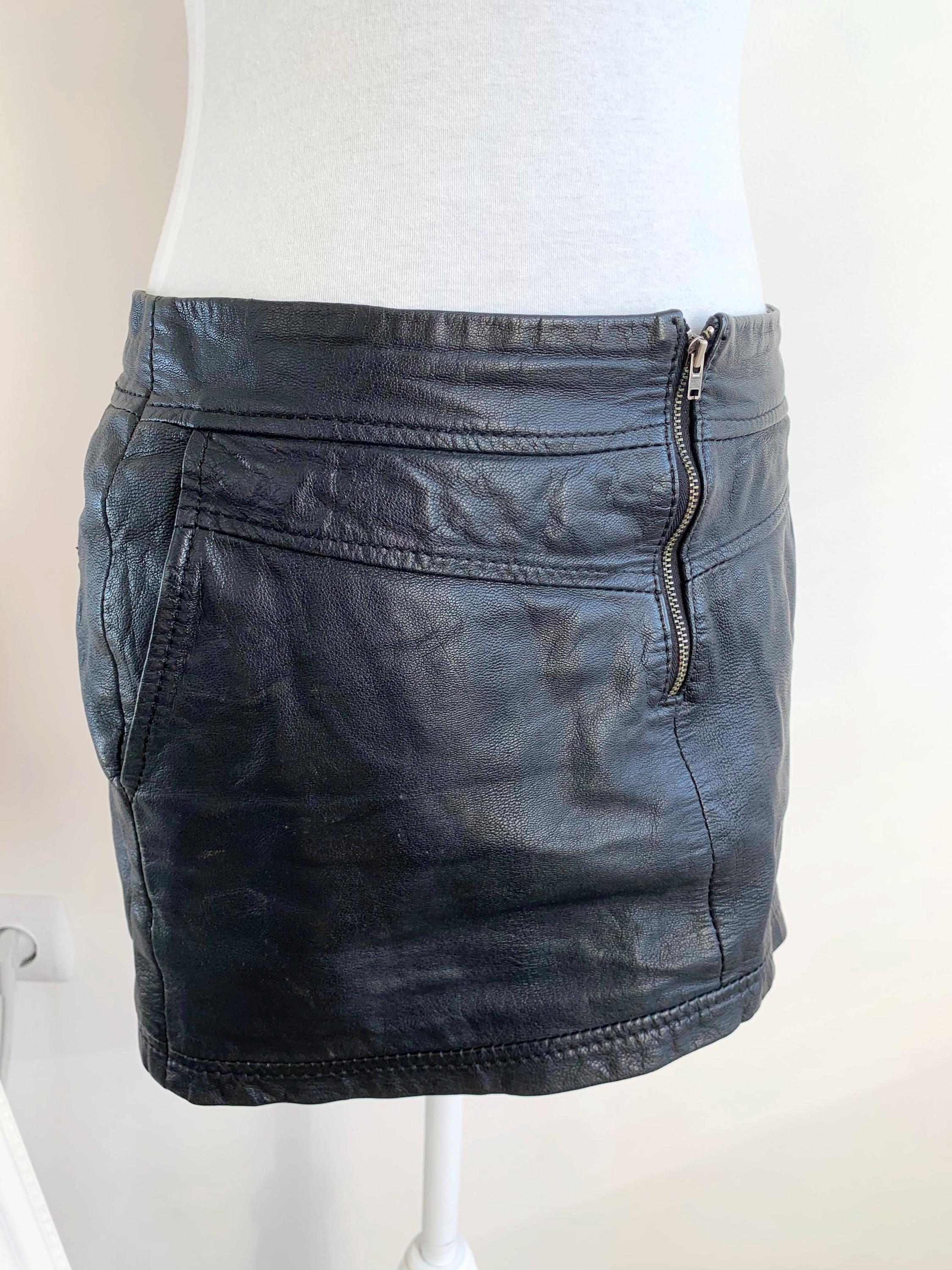 Step out in early 2000s style with this VILA black genuine leather mini skirt in size S! This is a genuine vintage essential that perfectly captures the Y2K fashion and grunge aesthetics. Made from soft, 100% goat leather, this low rise mini skirt is built for a chic, high-impact look, whether you're hitting a festival, a club, or rocking a casual biker grunge vibe. The genuine leather material will only get better with age, making this a true investment piece for your closet. It features a visible front zipper detail and is fully lined for comfort. A great find for any fan of vintage leather clothing and punk rock style!