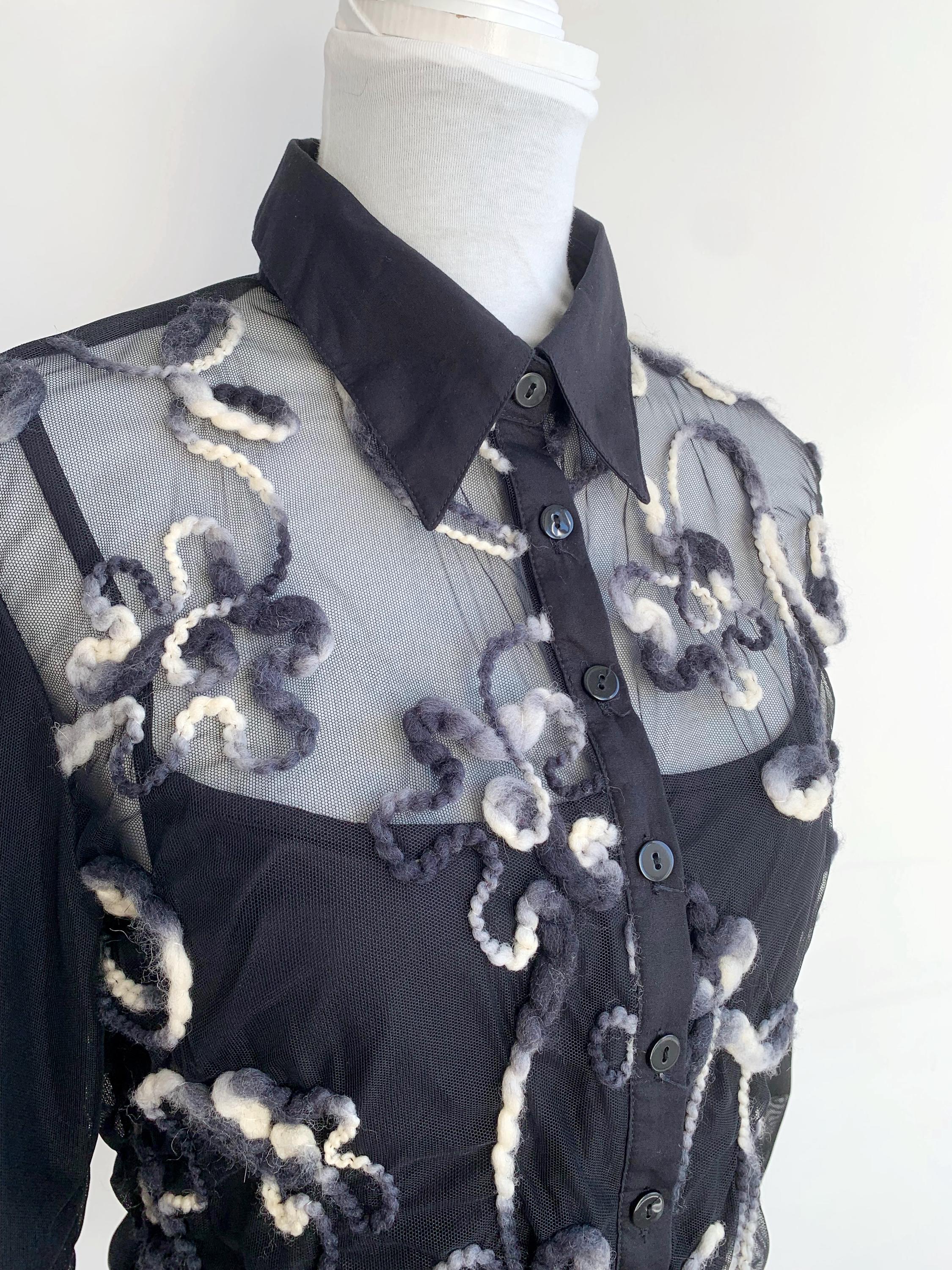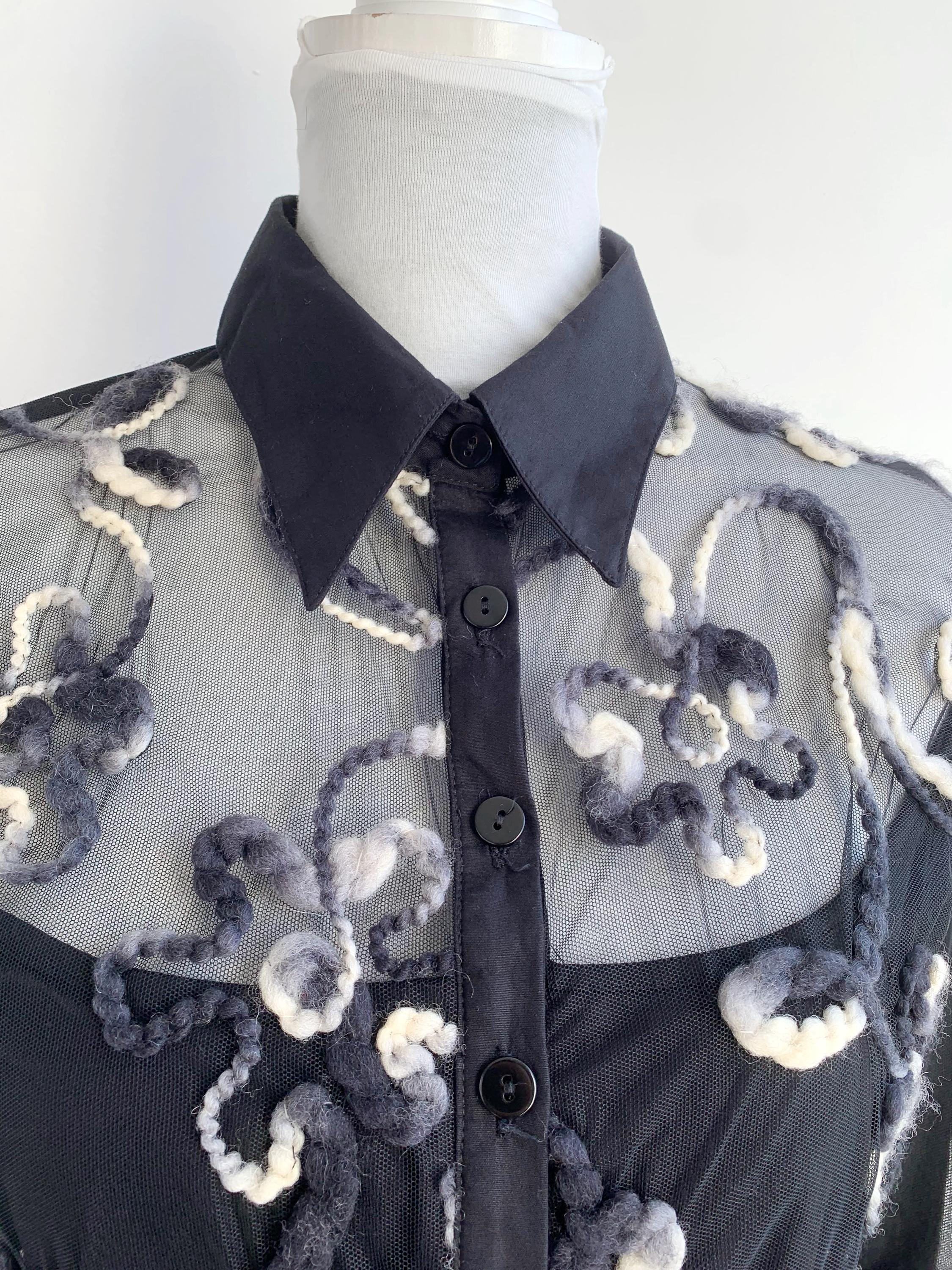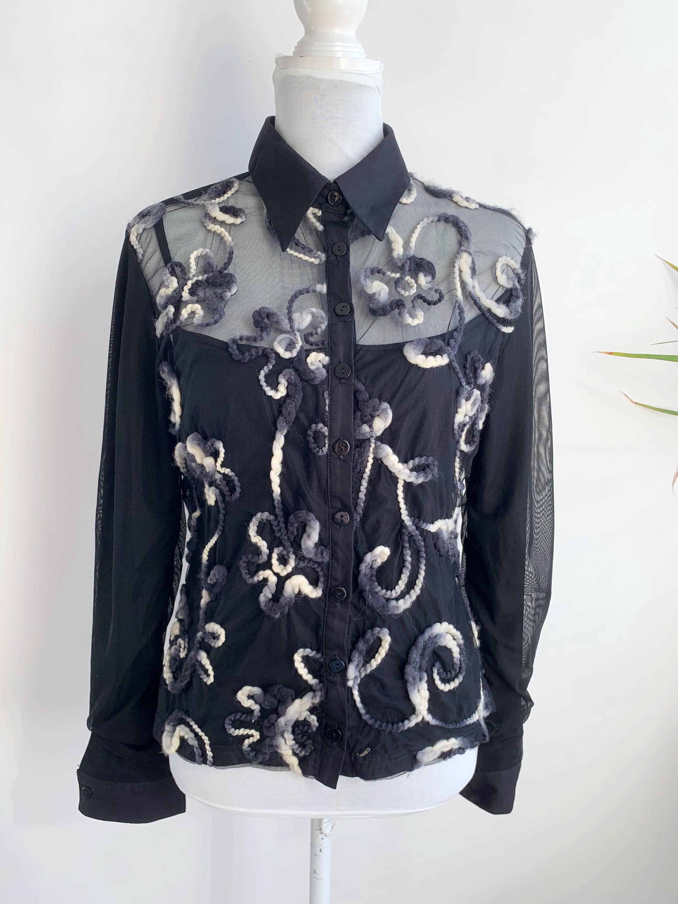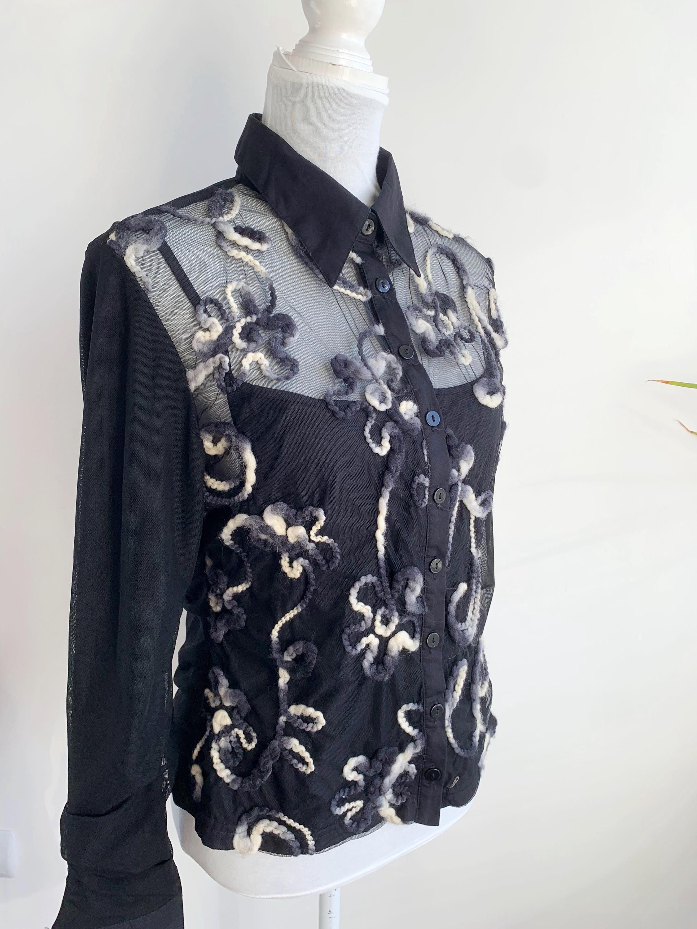 Step into a world of unique, high-end vintage fashion with this incredibly striking sheer black mesh blouse by Antonelle with textured wool applique flower pattern over sheer mesh tulle fabric with solid lining underneath. This vintage French designer shirt is a true statement piece, featuring a collared neckline, a full button-up front, and long sheer sleeves. What sets this top apart is the exquisite textured wool appliqué adorning the front, creating three-dimensional floral or abstract swirl motifs in a beautiful gradient of dark grey, light grey, and cream. The sheer mesh fabric, combined with the substantial wool detailing, offers a captivating contrast that's perfect for a sophisticated, edgy look. Wear it layered over a camisole or bralette for a night out or a chic evening event. This unique mesh collared top is a rare vintage find that will instantly elevate your wardrobe and express your individual style. The fabric composition, including wool, polyamide, and cotton, speaks to its quality and texture. A must-have for lovers of vintage sheer shirts and designer French fashion.