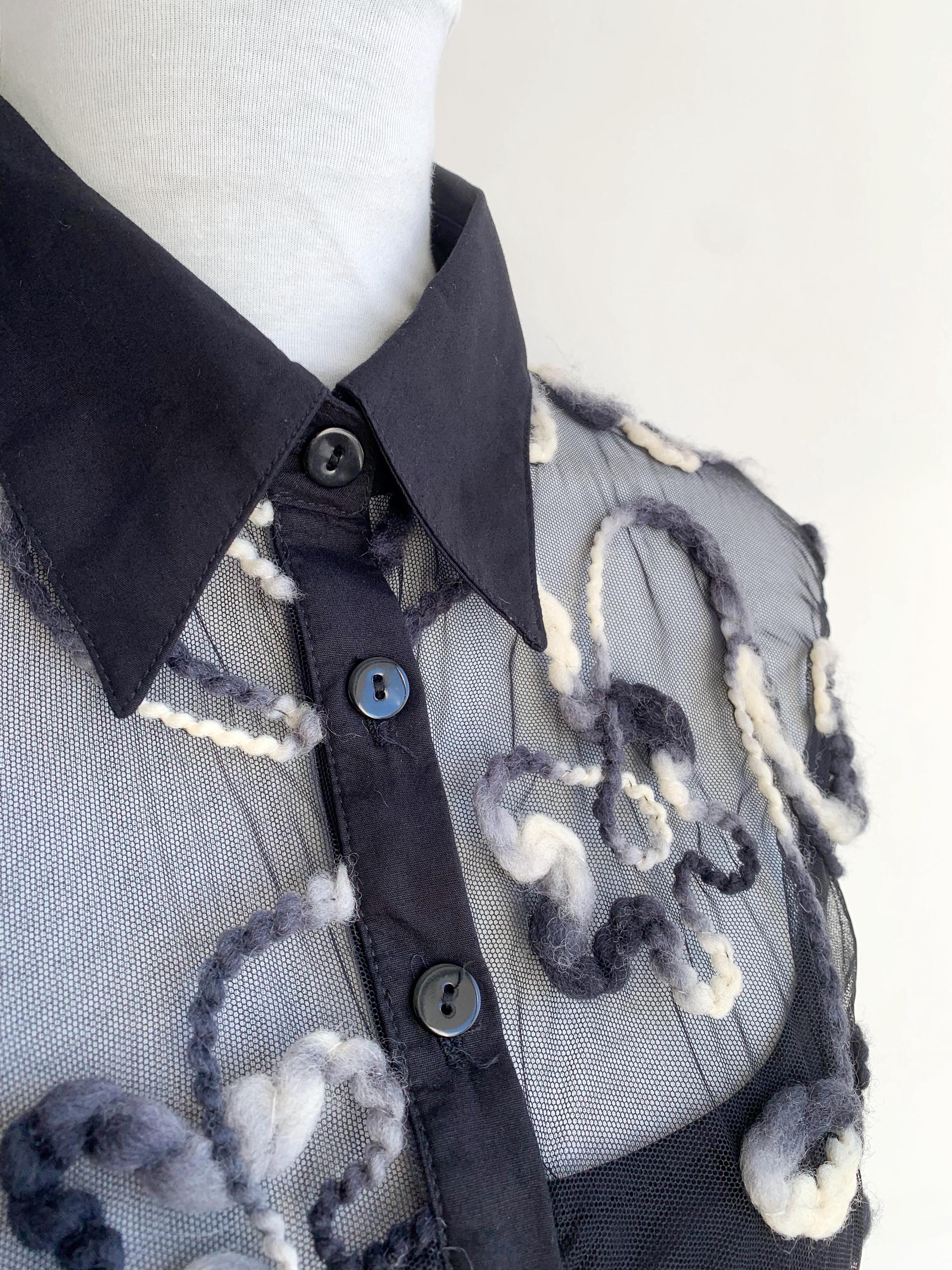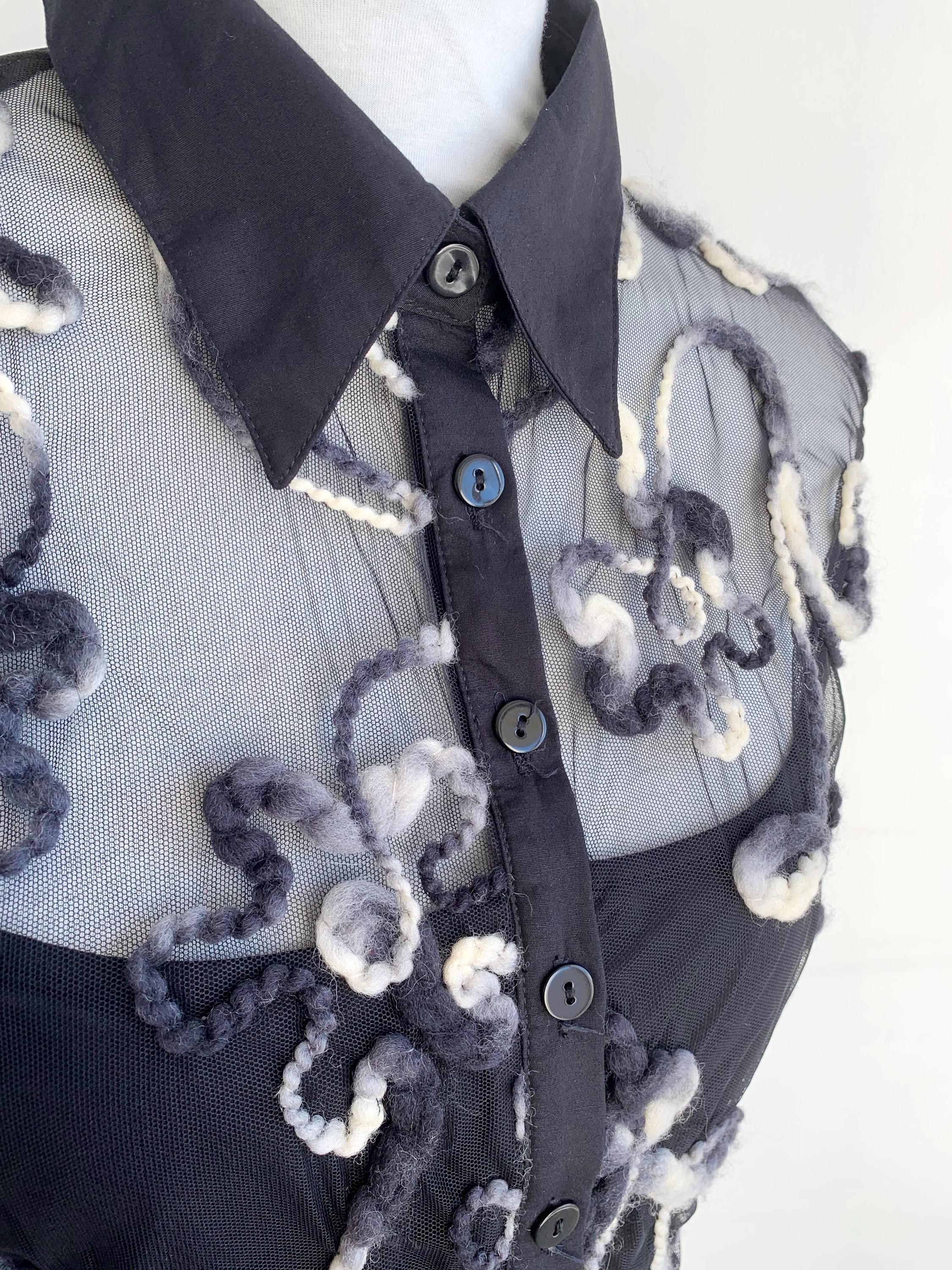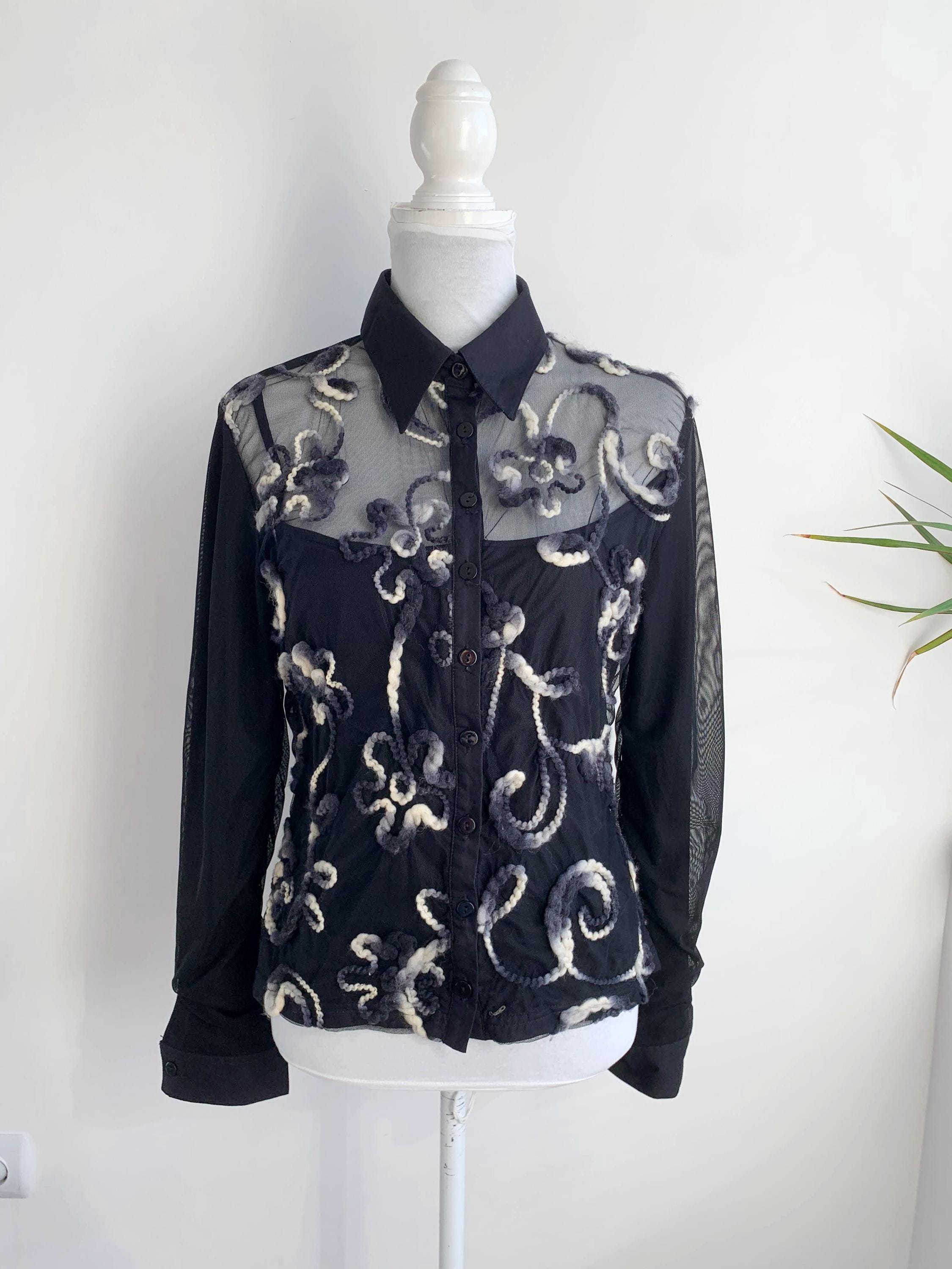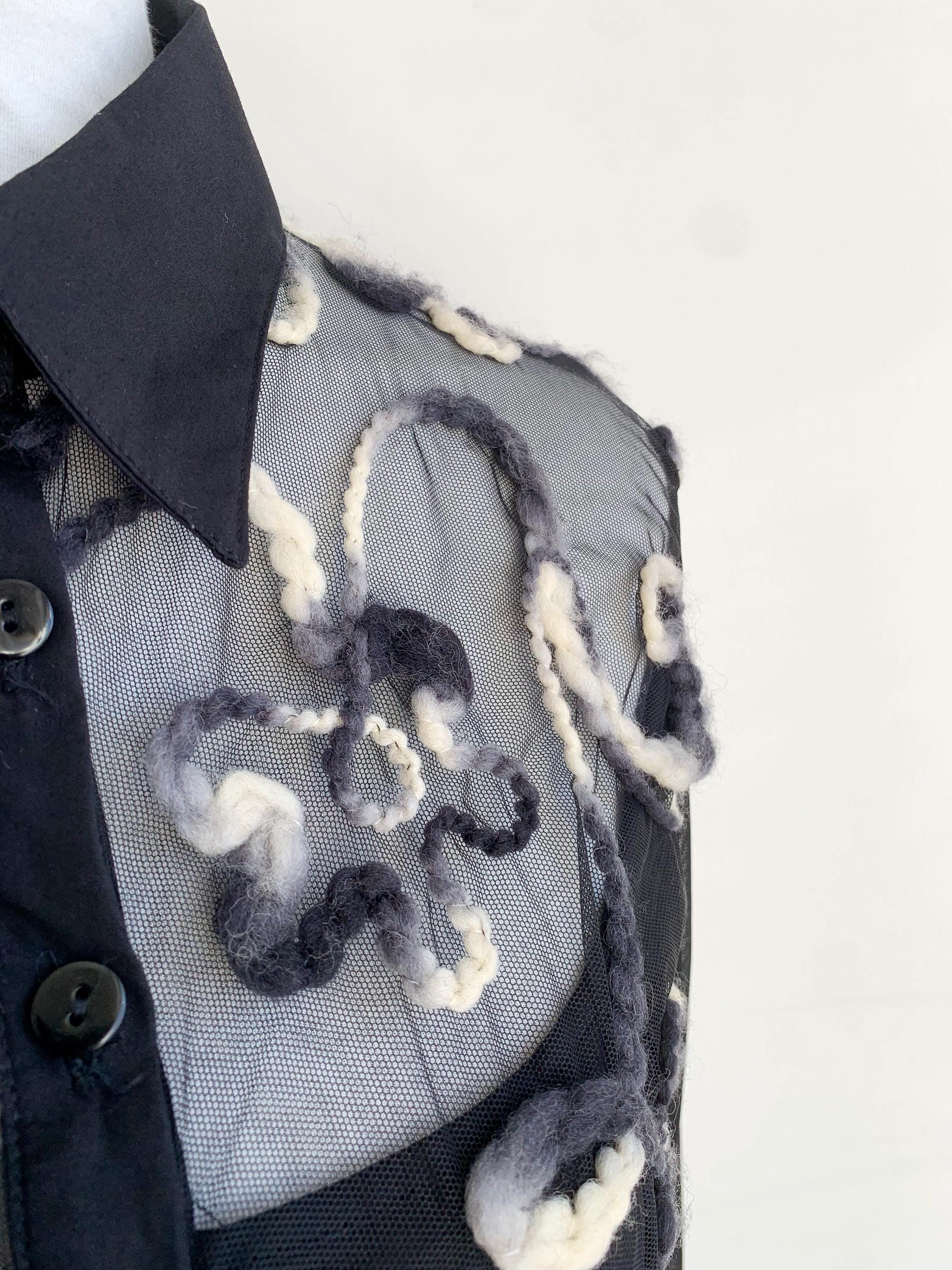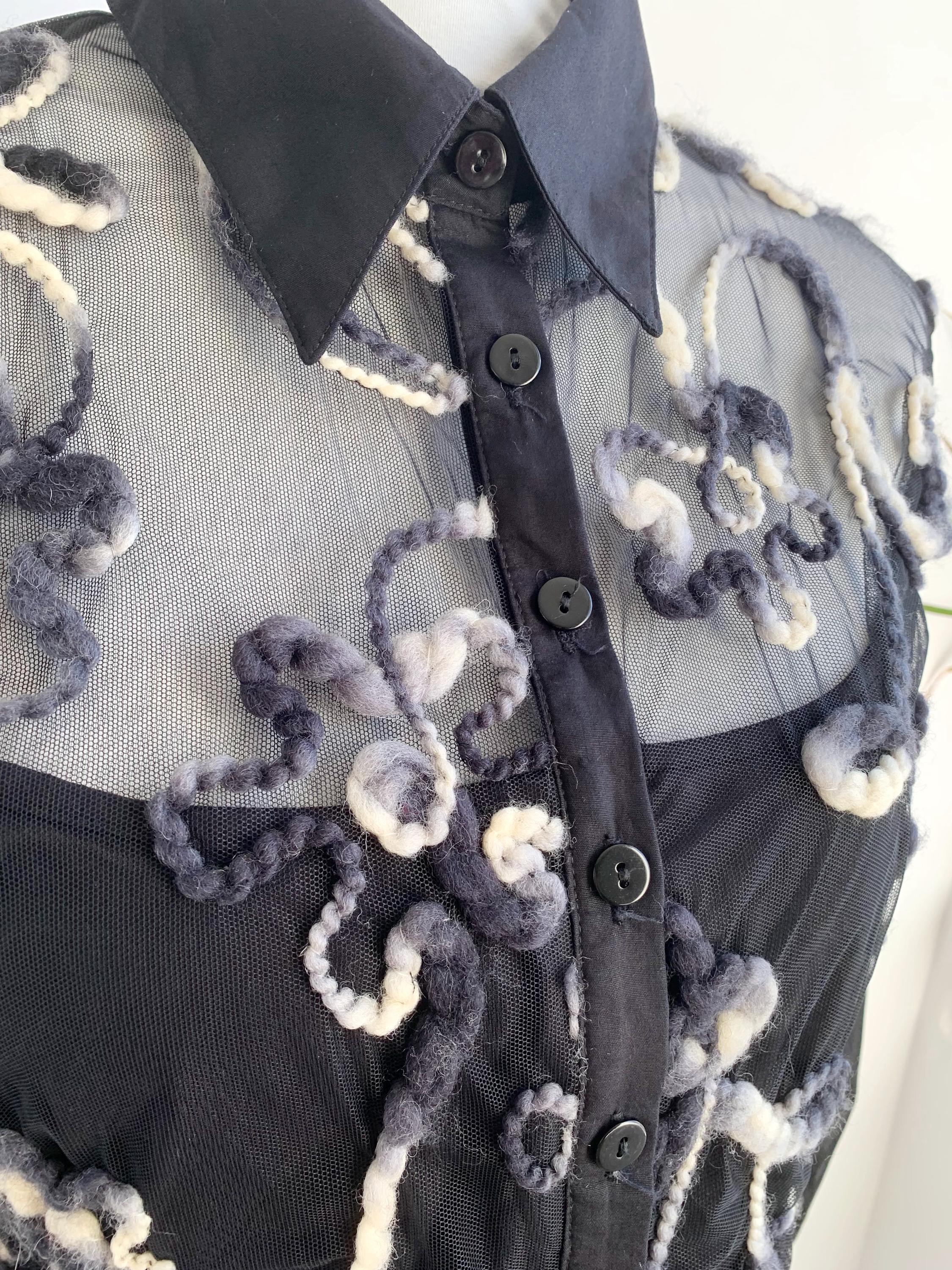Step into a world of unique, high-end vintage fashion with this incredibly striking sheer black mesh blouse by Antonelle with textured wool applique flower pattern over sheer mesh tulle fabric with solid lining underneath. This vintage French designer shirt is a true statement piece, featuring a collared neckline, a full button-up front, and long sheer sleeves. What sets this top apart is the exquisite textured wool appliqué adorning the front, creating three-dimensional floral or abstract swirl motifs in a beautiful gradient of dark grey, light grey, and cream. The sheer mesh fabric, combined with the substantial wool detailing, offers a captivating contrast that's perfect for a sophisticated, edgy look. Wear it layered over a camisole or bralette for a night out or a chic evening event. This unique mesh collared top is a rare vintage find that will instantly elevate your wardrobe and express your individual style. The fabric composition, including wool, polyamide, and cotton, speaks to its quality and texture. A must-have for lovers of vintage sheer shirts and designer French fashion.