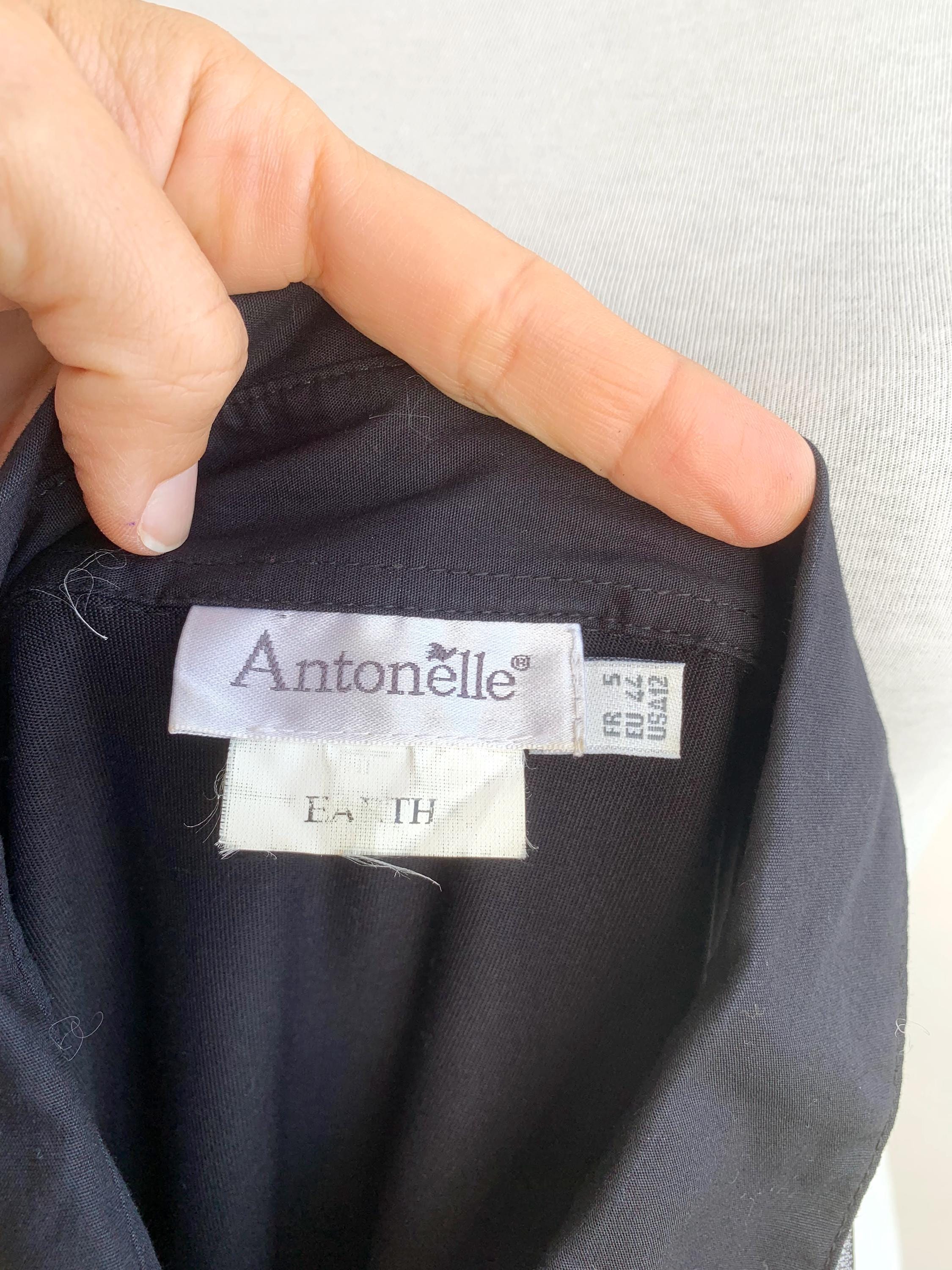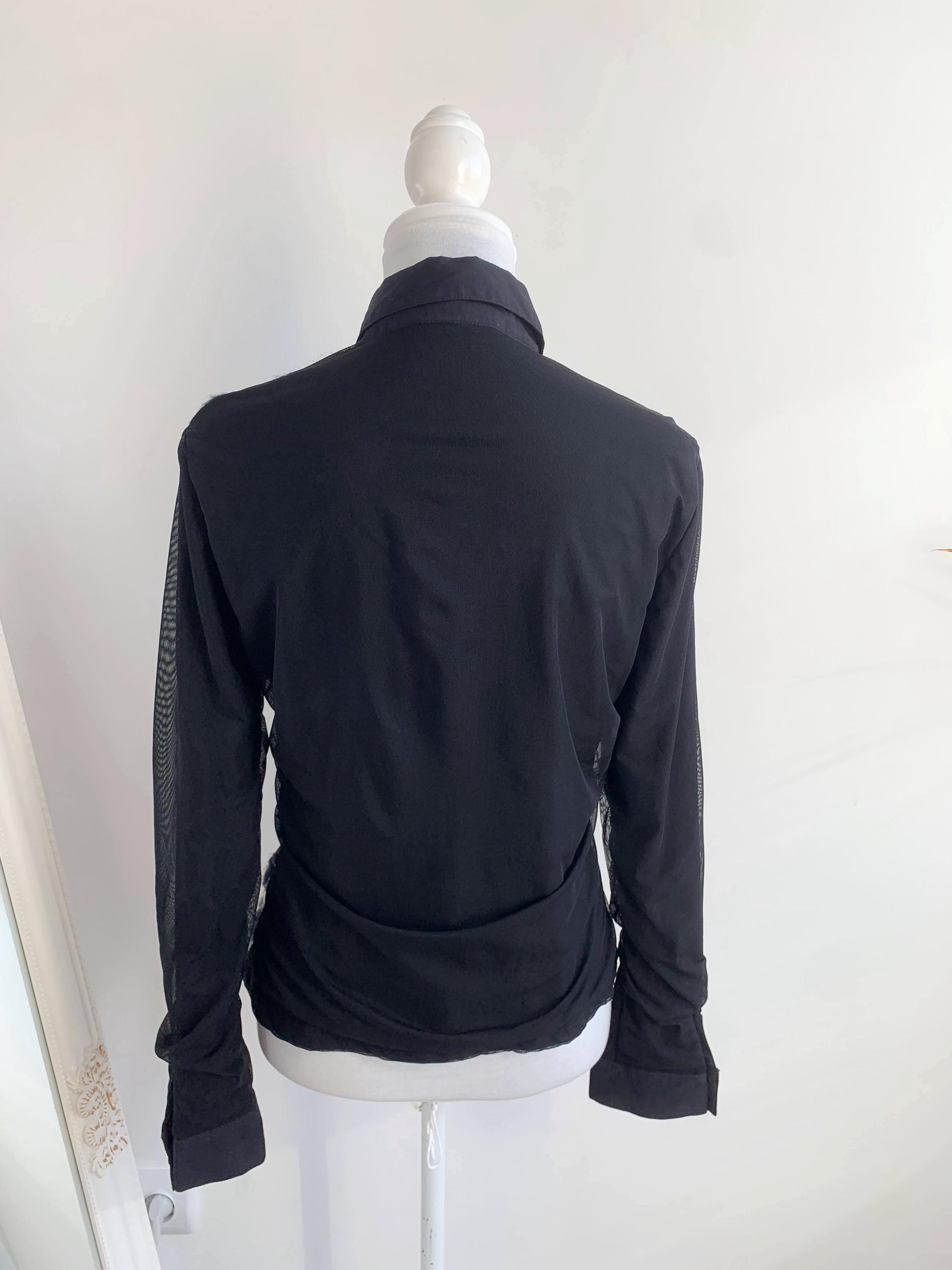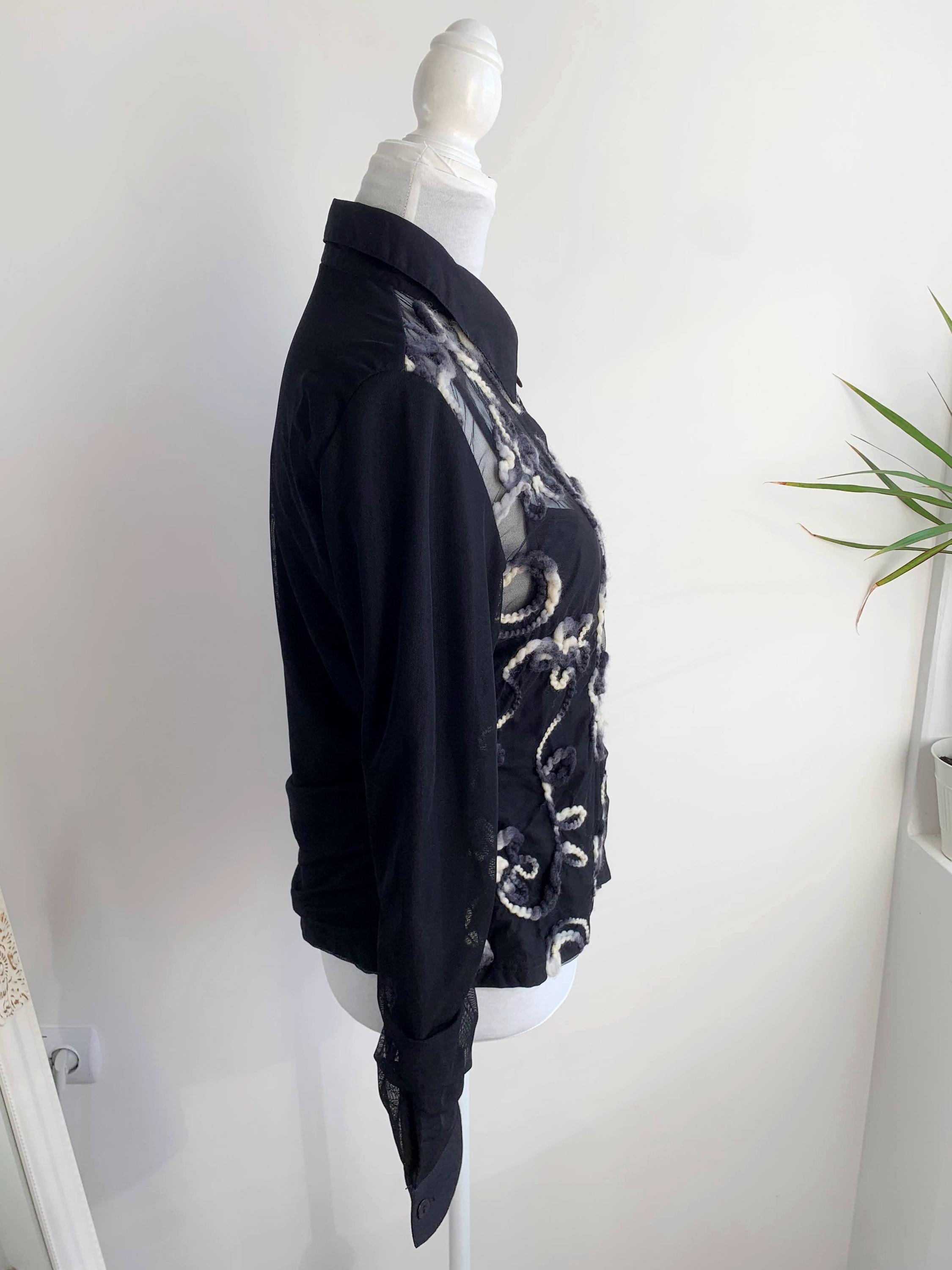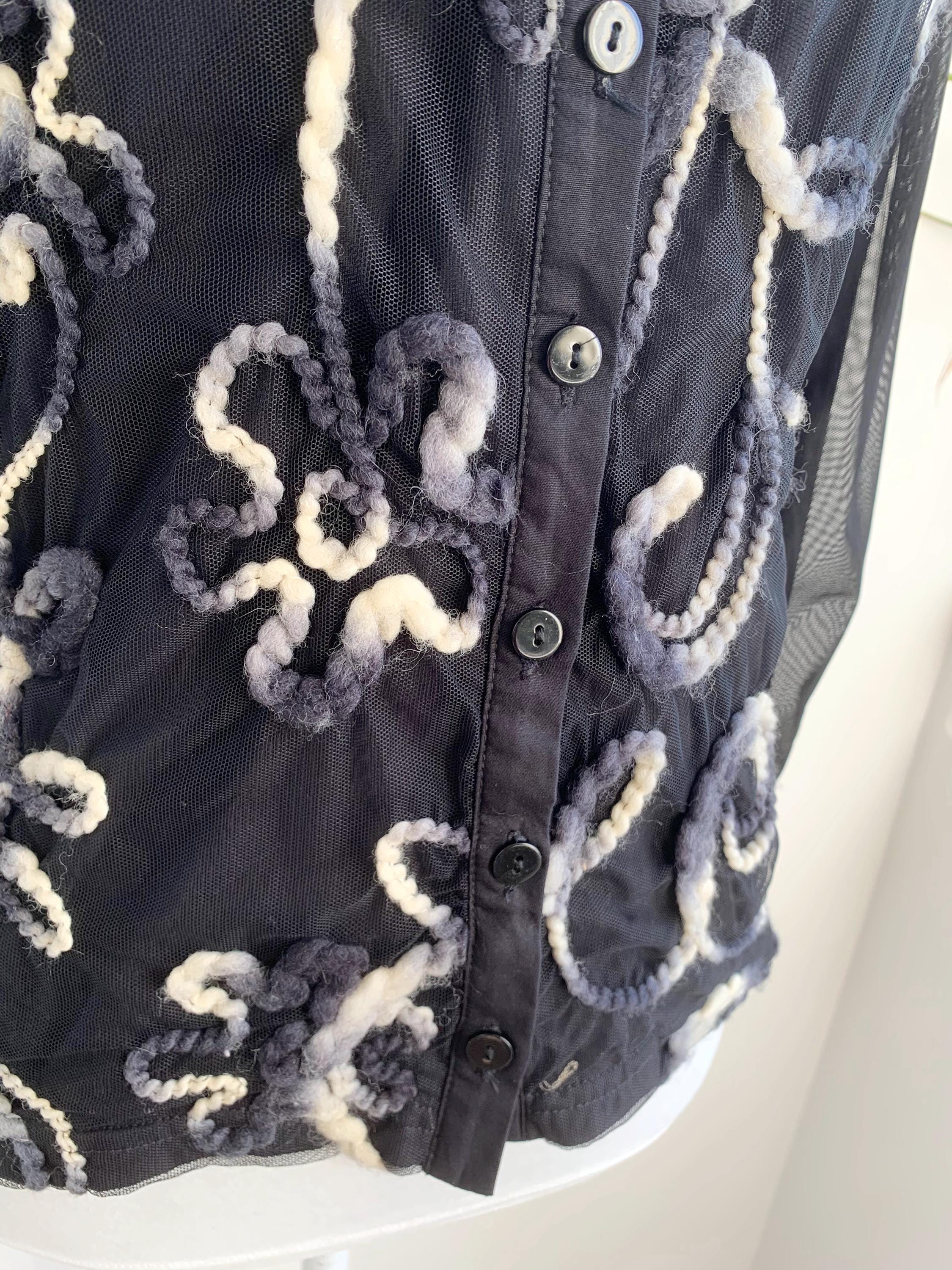 Step into a world of unique, high-end vintage fashion with this incredibly striking sheer black mesh blouse by Antonelle with textured wool applique flower pattern over sheer mesh tulle fabric with solid lining underneath. This vintage French designer shirt is a true statement piece, featuring a collared neckline, a full button-up front, and long sheer sleeves. What sets this top apart is the exquisite textured wool appliqué adorning the front, creating three-dimensional floral or abstract swirl motifs in a beautiful gradient of dark grey, light grey, and cream. The sheer mesh fabric, combined with the substantial wool detailing, offers a captivating contrast that's perfect for a sophisticated, edgy look. Wear it layered over a camisole or bralette for a night out or a chic evening event. This unique mesh collared top is a rare vintage find that will instantly elevate your wardrobe and express your individual style. The fabric composition, including wool, polyamide, and cotton, speaks to its quality and texture. A must-have for lovers of vintage sheer shirts and designer French fashion.